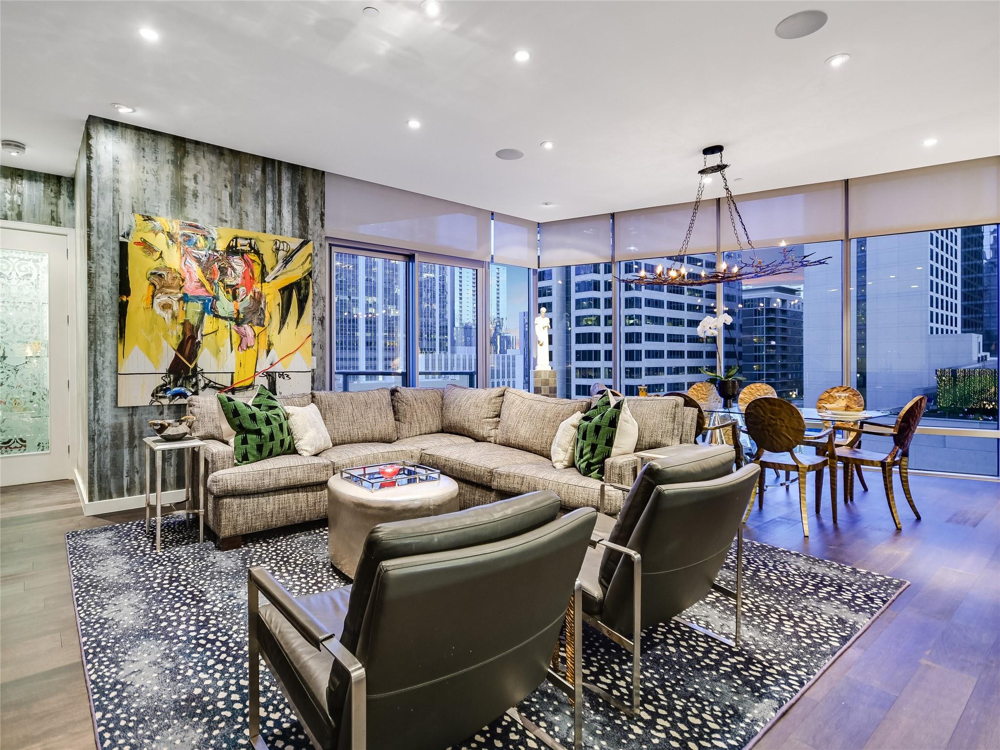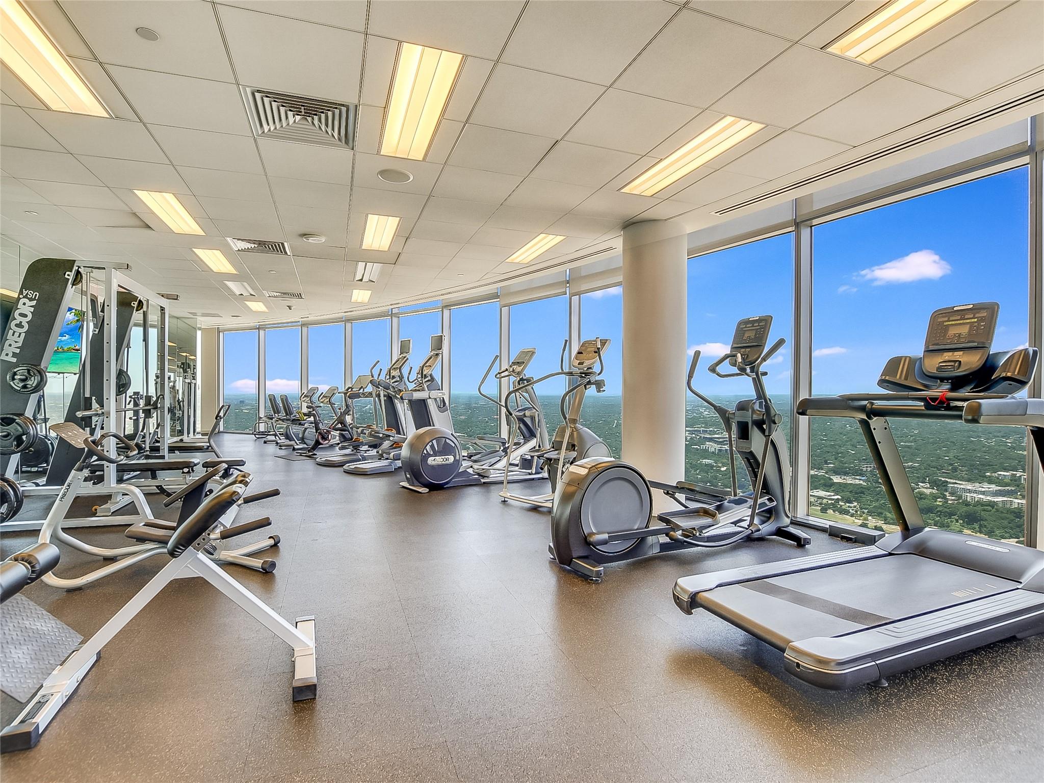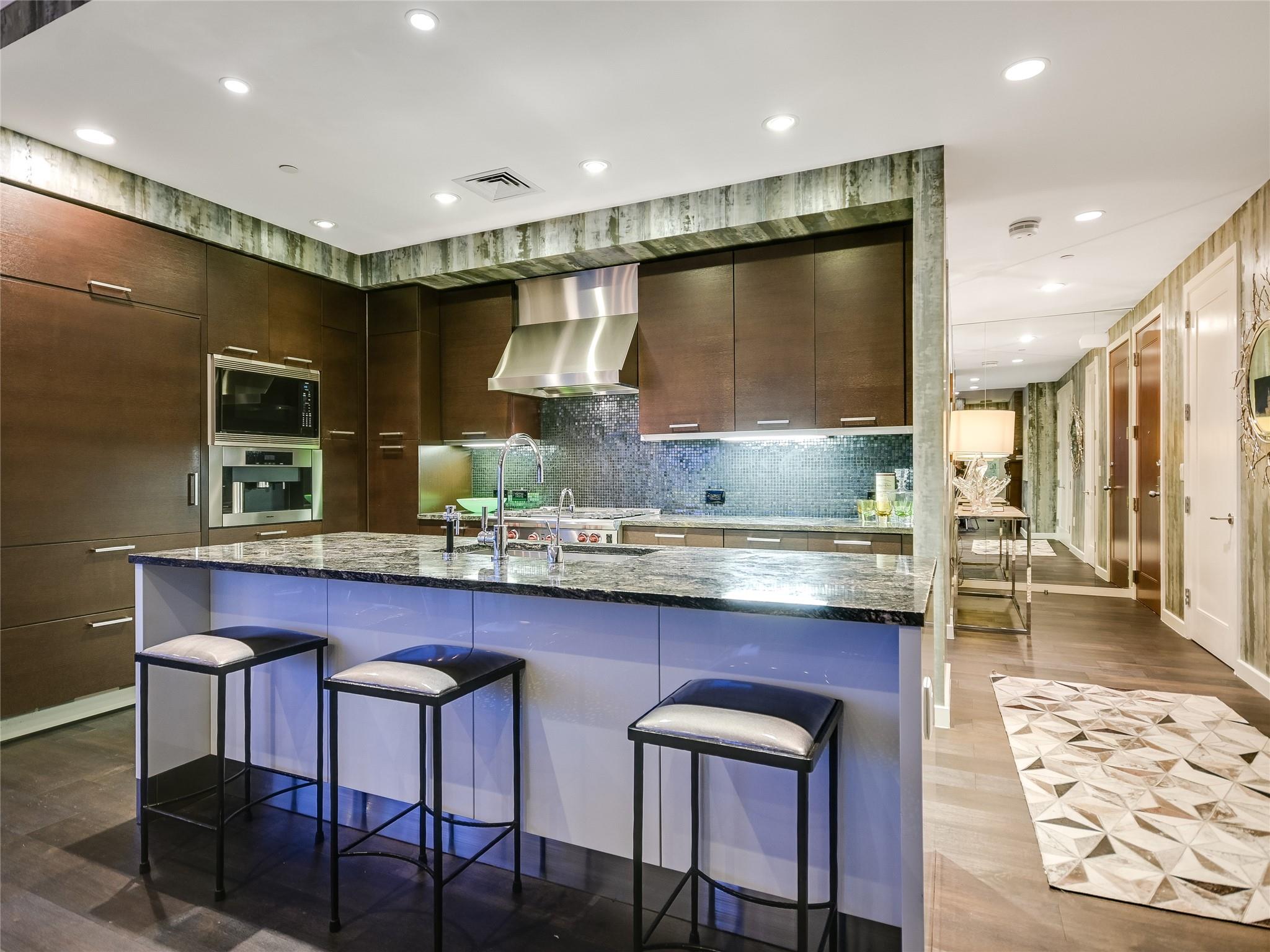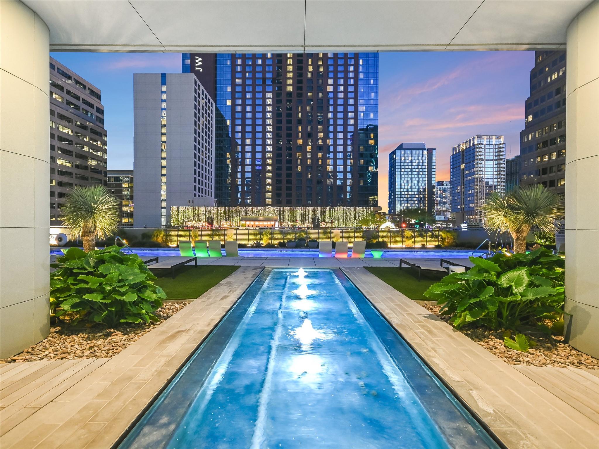 Situated on the 11th floor, NE corner, of the highly sought-after Austonian building, this 2-bedroom, 2-bath residence offers stunning views of the city skyline and the Capitol building. This open-concept living space incorporates floor-to-ceiling windows equipped with shades in the living, kitchen, and dining area. The well-appointed chef's kitchen boasts top-of-the-line stainless steel appliances, granite countertops, tile backsplash, ample cabinetry, and a central island that doubles as a breakfast bar. Throughout the residence, you'll find hardwood floors that enhance its elegance. The primary suite offers sweeping views of downtown and the Capitol. The luxurious primary bath is complete with a soaking tub, dual sinks, and a spacious shower all adorned with exquisite marble. The primary walk-in closet offers custom built-ins for maximum storage. All bedrooms feature custom shades. In addition, this unit offers a storage unit as well as two prime parking spots. The building also offers valet parking. The Austonian is renowned for its resort-style atmosphere and opulent residences, offering a wealth of amenities spanning 40,000 square feet. These amenities include meticulously maintained common areas, a 56th-floor fitness center and pool offering panoramic views, a private spa room, a dog grooming area, a dog park, a theater, a premium wine cellar, and more. Positioned in a prime central location, residents enjoy easy access to Lady Bird Lake, the Hike-and-Bike Trail, the Austin Public Library, exceptional shopping options, and the city's finest dining establishments.