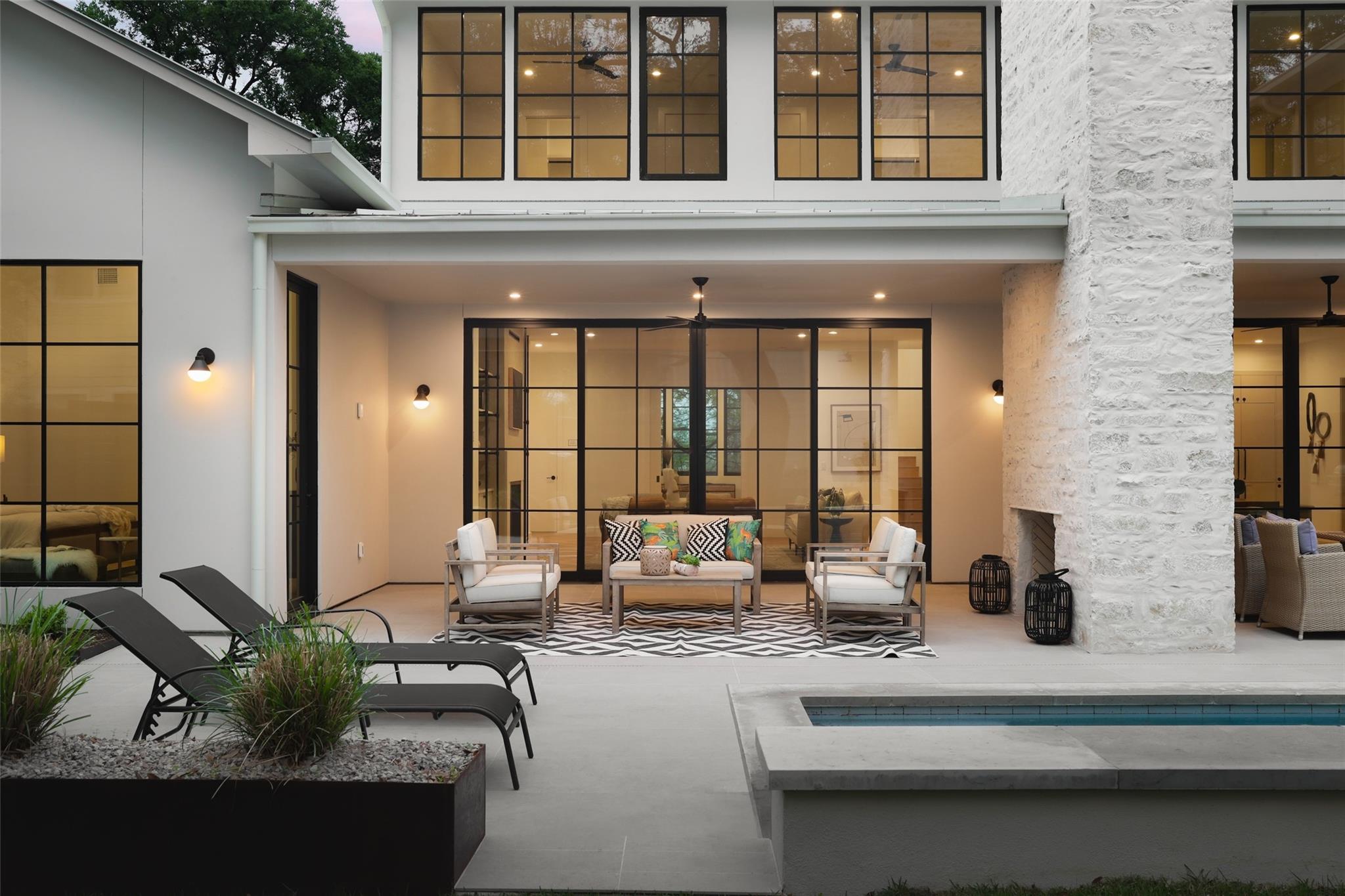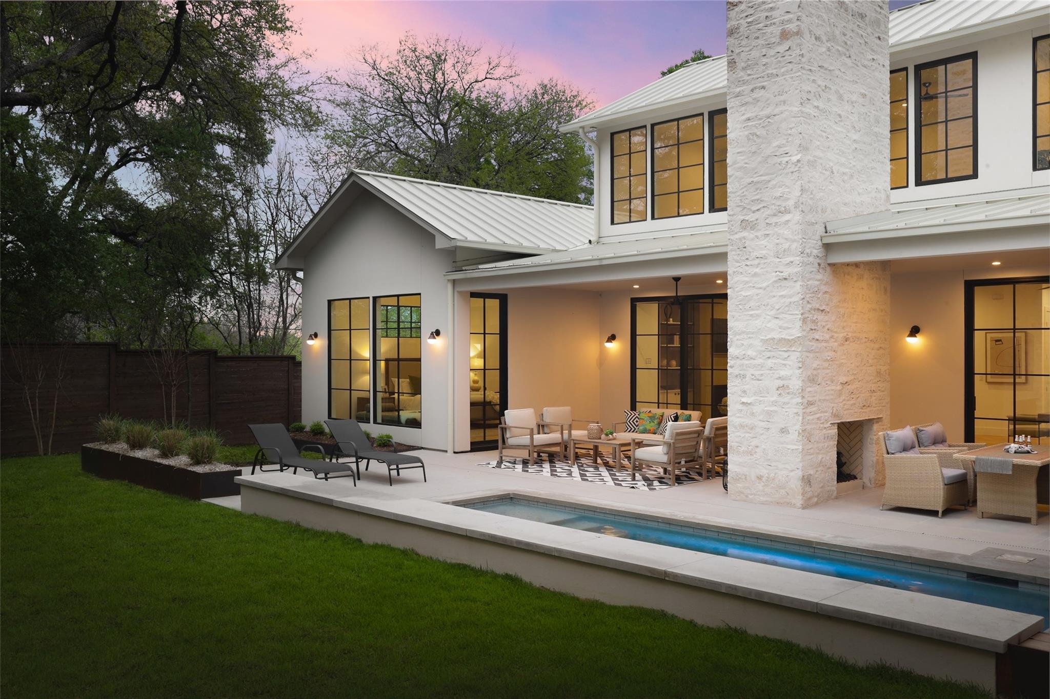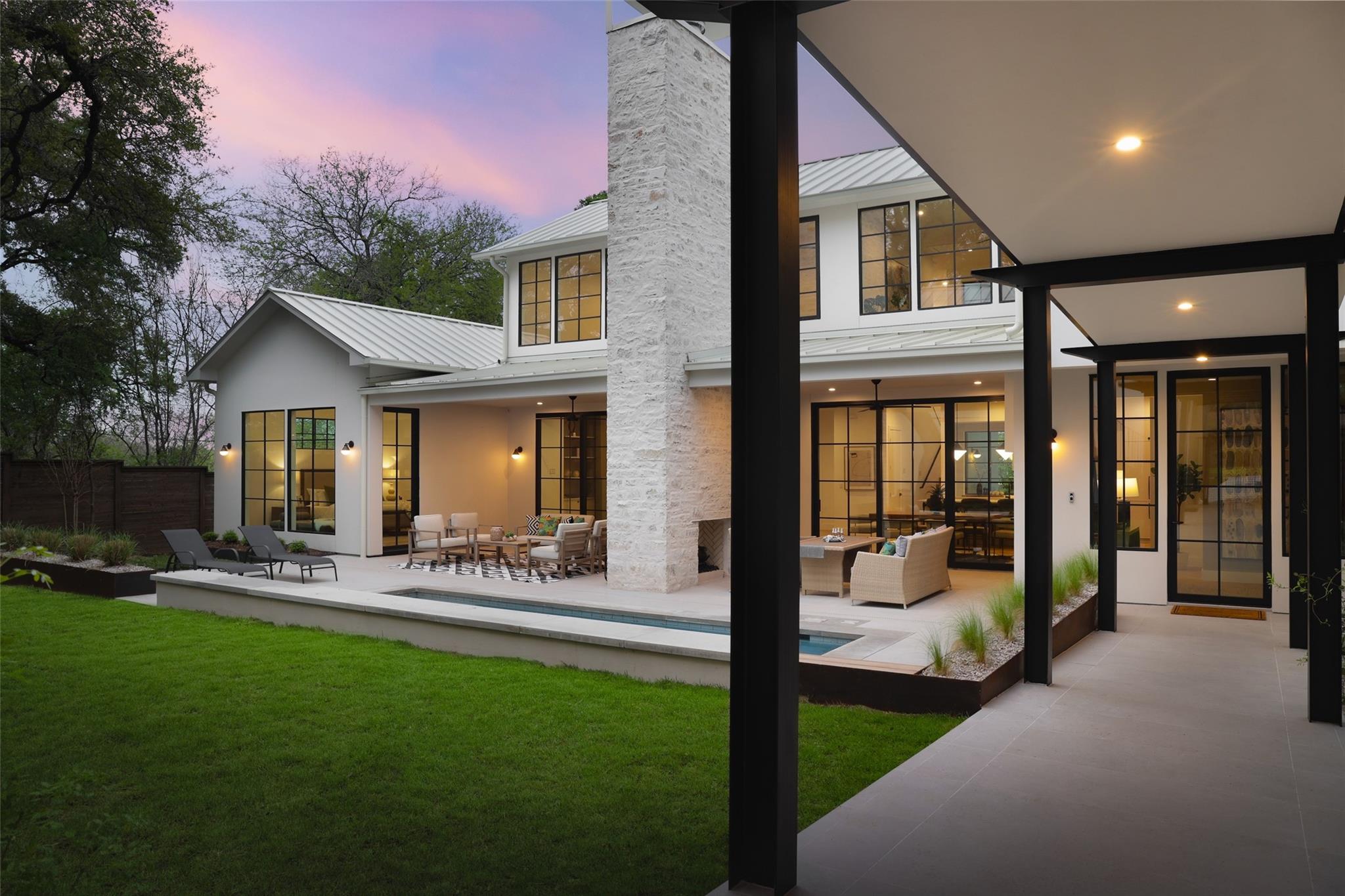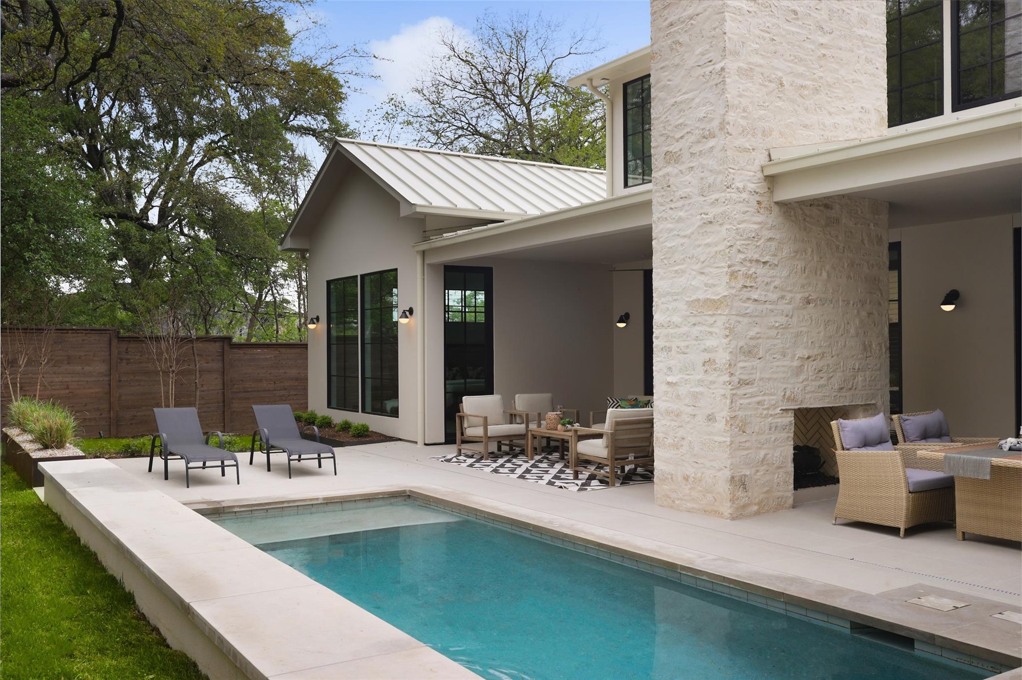 This 4,321 SF compound in the heart of Barton Hills is a masterpiece of luxury by architect Rodenberg Design and expertly built by Tusker Development. Together, they created a unique, timeless, and functional home with 3769 SF in the main house that complements the surrounding heritage oaks. It’s truly a spectacular find in 78704 boasting a guesthouse/flex space/exercise/art/music studio with 552 SF spanning the width of the rare 3-car garage with a full bath and walk-in closet. With thoughtful architectural details, inside and out, and interior selections by SLIC Design, you will be captivated by its curated beauty. Expansive windows and floor-to-ceiling sliding doors flood the home with natural light. They open the Great Room with a fireplace to a large, shaded yard. Enjoy your gas heated shotcrete pool with 3 waterfalls year round and entertain on your deep covered patio. The outdoor kitchen and fireplace create a relaxing and inviting oasis for dining al fresco. Inside, the home features sprawling white oak floors throughout the spacious floor plan and a dedicated office. Off the gourmet kitchen, enjoy a wet bar with wine fridge, large walk-in pantry and butler’s pantry/mud room. Upon entering the first-floor Primary Suite, tucked away for privacy, you will be captivated by the abundance of natural light and sparkle of the pool through your own private door. The spectacular spa-like Primary Bath leads to a huge walk-in closet with its own W&D hookups and loads of built-in storage. The second story houses 3 large guest rooms with walk-in closets, a den/media room, two full bathrooms and a laundry/utility room. This 5 bedroom (1 in guest house), 5 full bathroom (1 in guest house) smart home must be seen in person to appreciate the details. Close to Barton Creek for hiking and swimming and South Lamar for shopping and dining, it is the perfect place to call home. Please ask for the full list of features. There are simply too many to describe in this limited space.