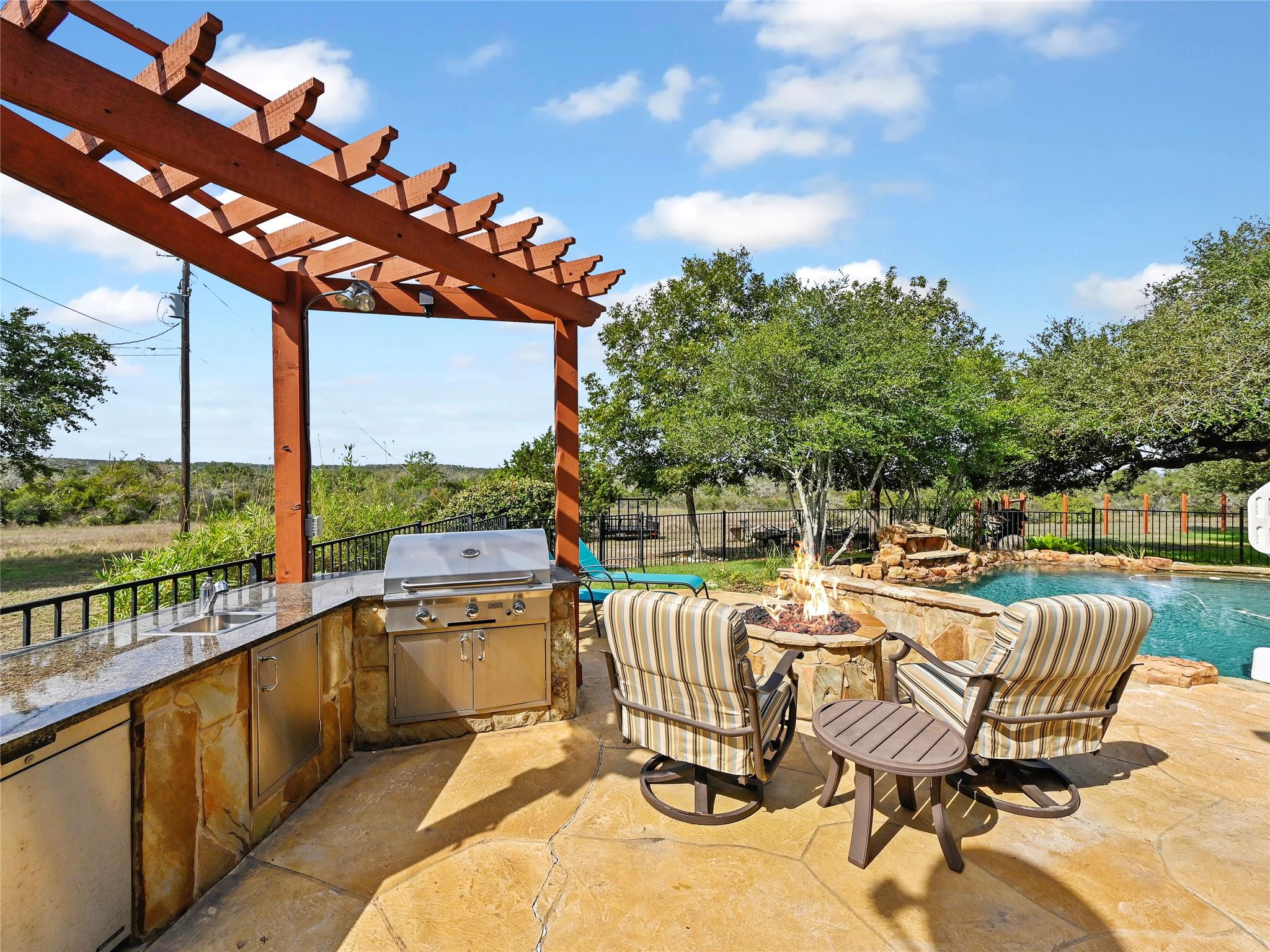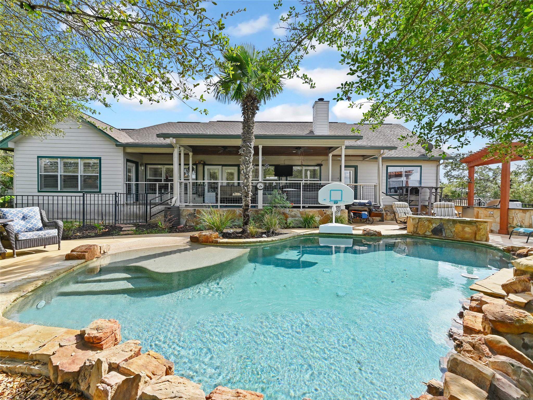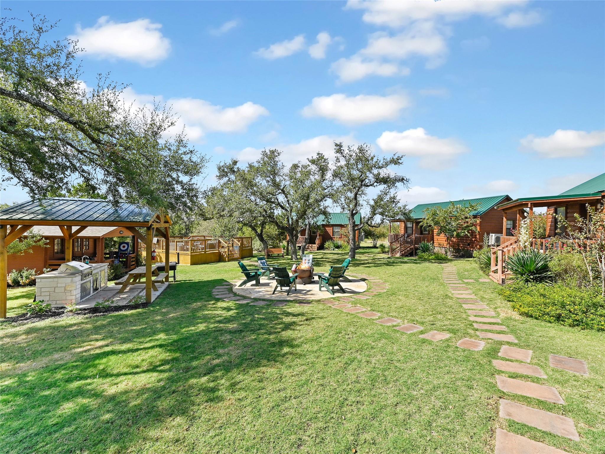 Discover an incredible opportunity in the enchanting Hill Country! Nestled just off Fitzhugh Road, this sprawling 5-acre parcel beckons with its proximity to charming wedding venues, breweries, wineries, and distilleries. The centerpiece of this property is a spacious 2,480 sqft, 3-bedroom, 2-bathroom main home boasting an open floor plan with beamed vaulted ceilings and a grand wood-burning fireplace. The kitchen seamlessly flows into the family room and breakfast area, creating a warm and welcoming atmosphere. The primary bedroom is generously sized, accompanied by a luxurious bath. An office space offers the flexibility of transforming into a fourth bedroom.Step outside, and you'll be greeted by a private pool with a cascading waterfall, providing serene views of the picturesque Hill Country. But that's not all – this property also features four fully furnished 1-bedroom, 1-bathroom, 460 sqft cabins that are in high demand as Airbnb rentals. These cabins encircle a cozy fire pit area and meticulously landscaped grounds, complete with a refreshing pool and swim spa.With the potential to expand the rental offerings by incorporating the main house and adding more cabins, the income-generating possibilities are immense. And best of all, this property is unrestricted, allowing for a wide range of potential uses and developments. Seize this golden opportunity in the heart of the Hill Country!