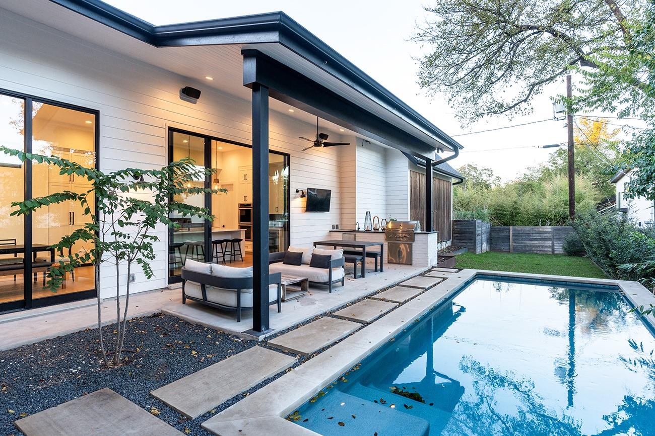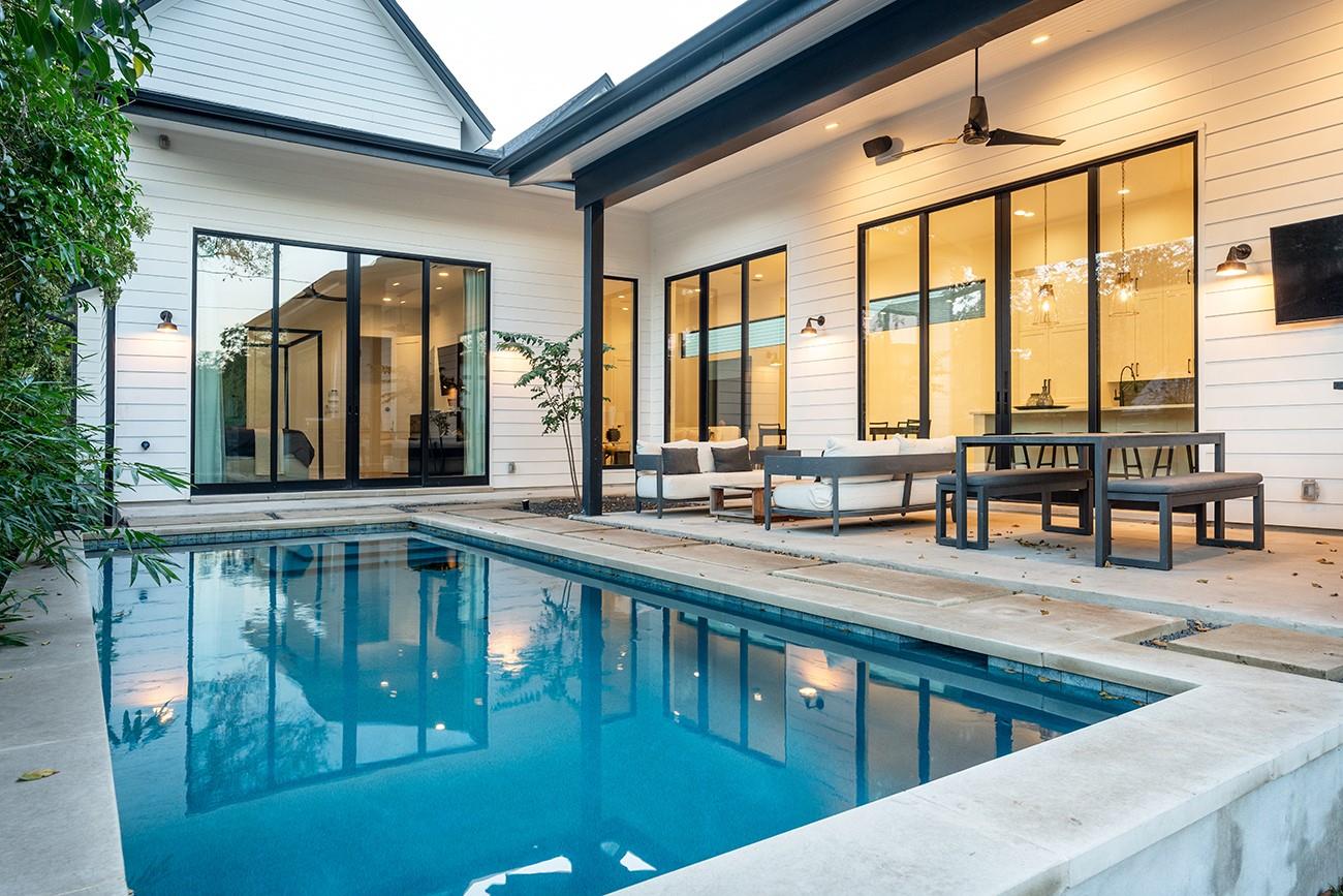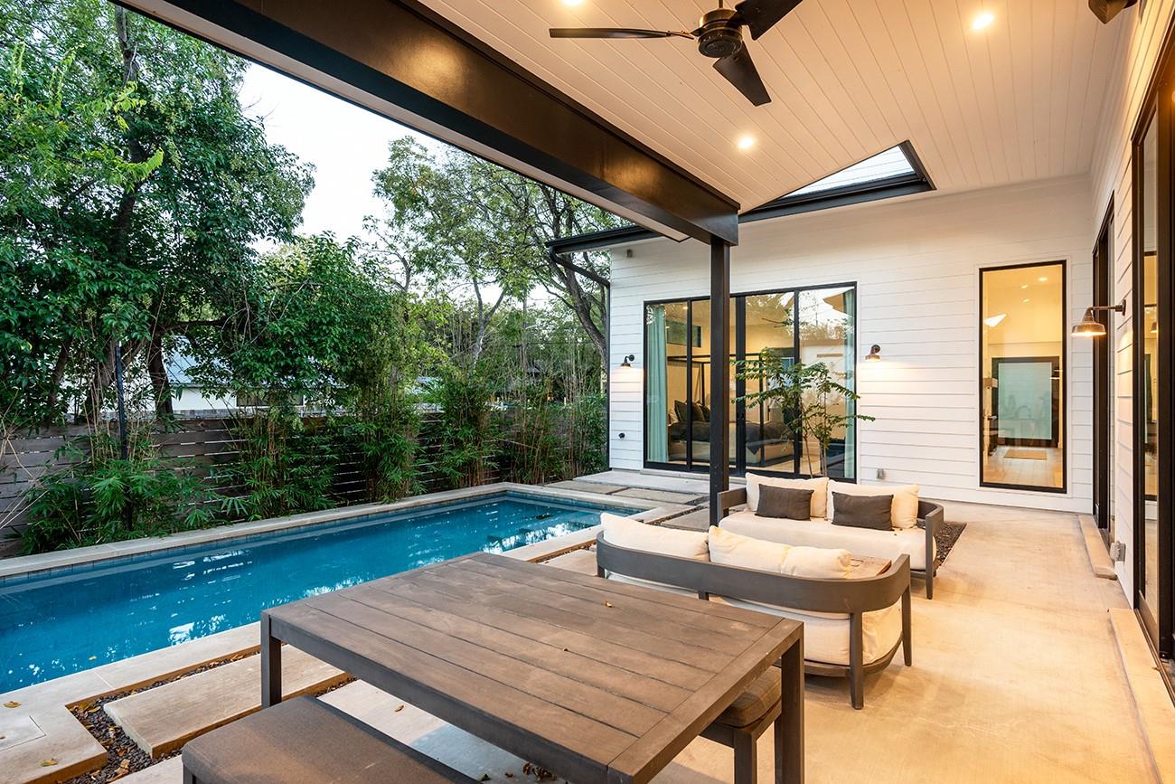 A tasteful, timeless home from Mozami Homes, filled with sophisticated finishes and sitting in an exceptional Bouldin Creek location. The open floor plan allows the chef's kitchen to flow seamlessly into the dining and living rooms, and expansive windows are placed carefully throughout. The modern layout maximizes convenient first-floor living, with a spacious primary suite overlooking the pool, a large walk-in closet, and a stunning spa bath. There is also a first-floor guest room with an ensuite bath, and a large first-floor office. You'll enjoy easy alley access and a two-car carport. Finishes include: Western doors & windows, 5' Western entrance, Thermador appliances, White oak floors, custom cabinetry, quartz counters, matte black finished plumbing, & designer lighting.