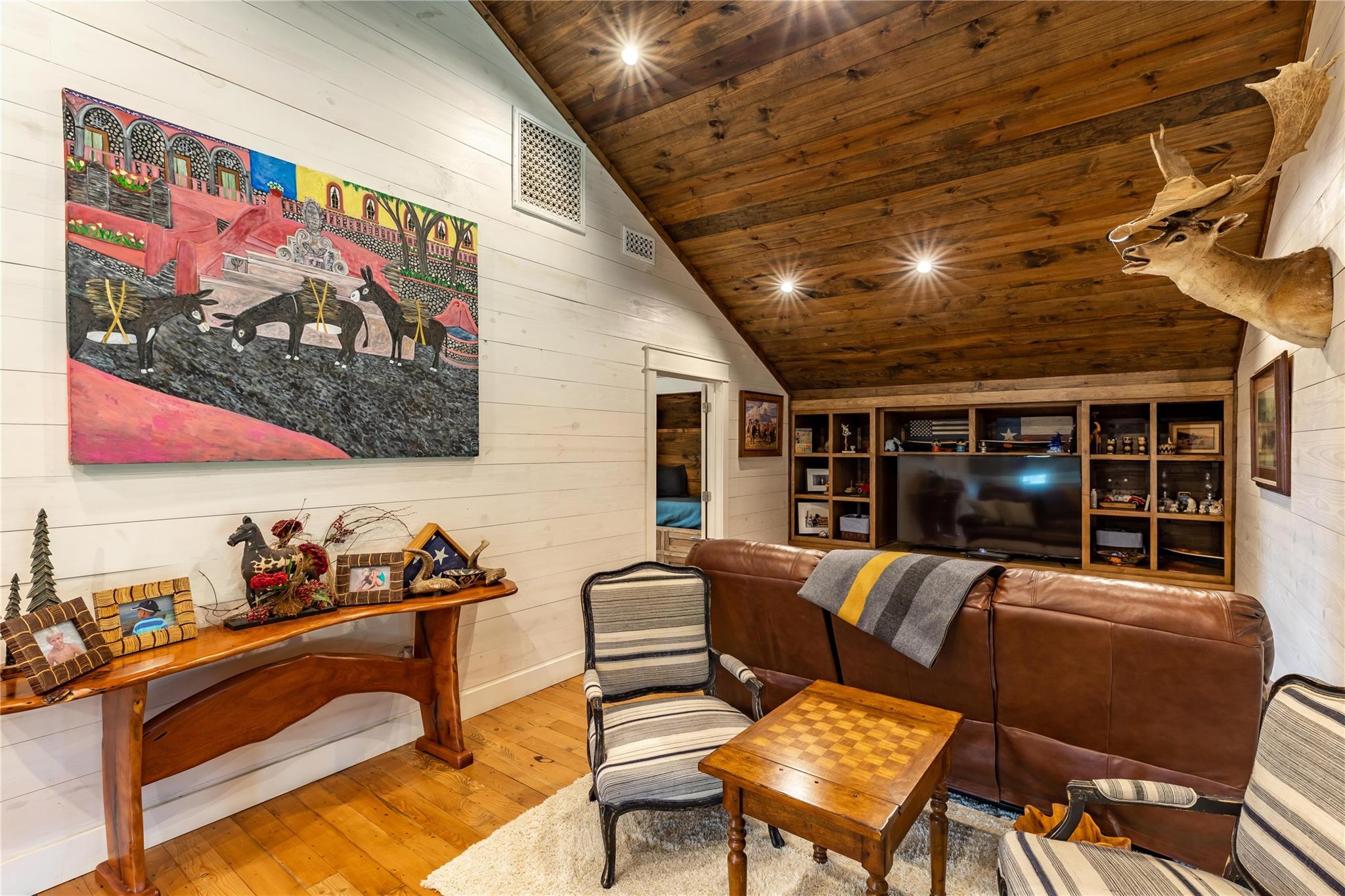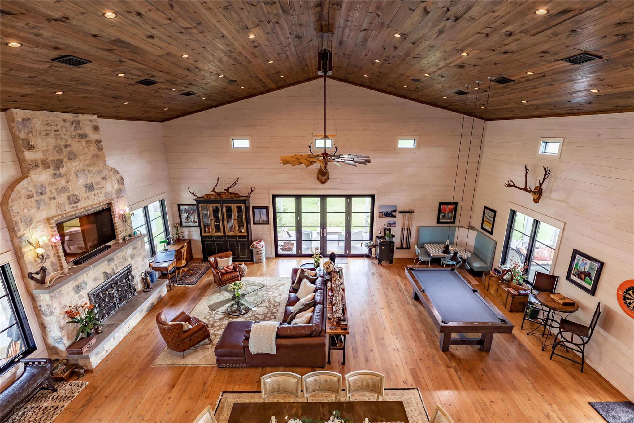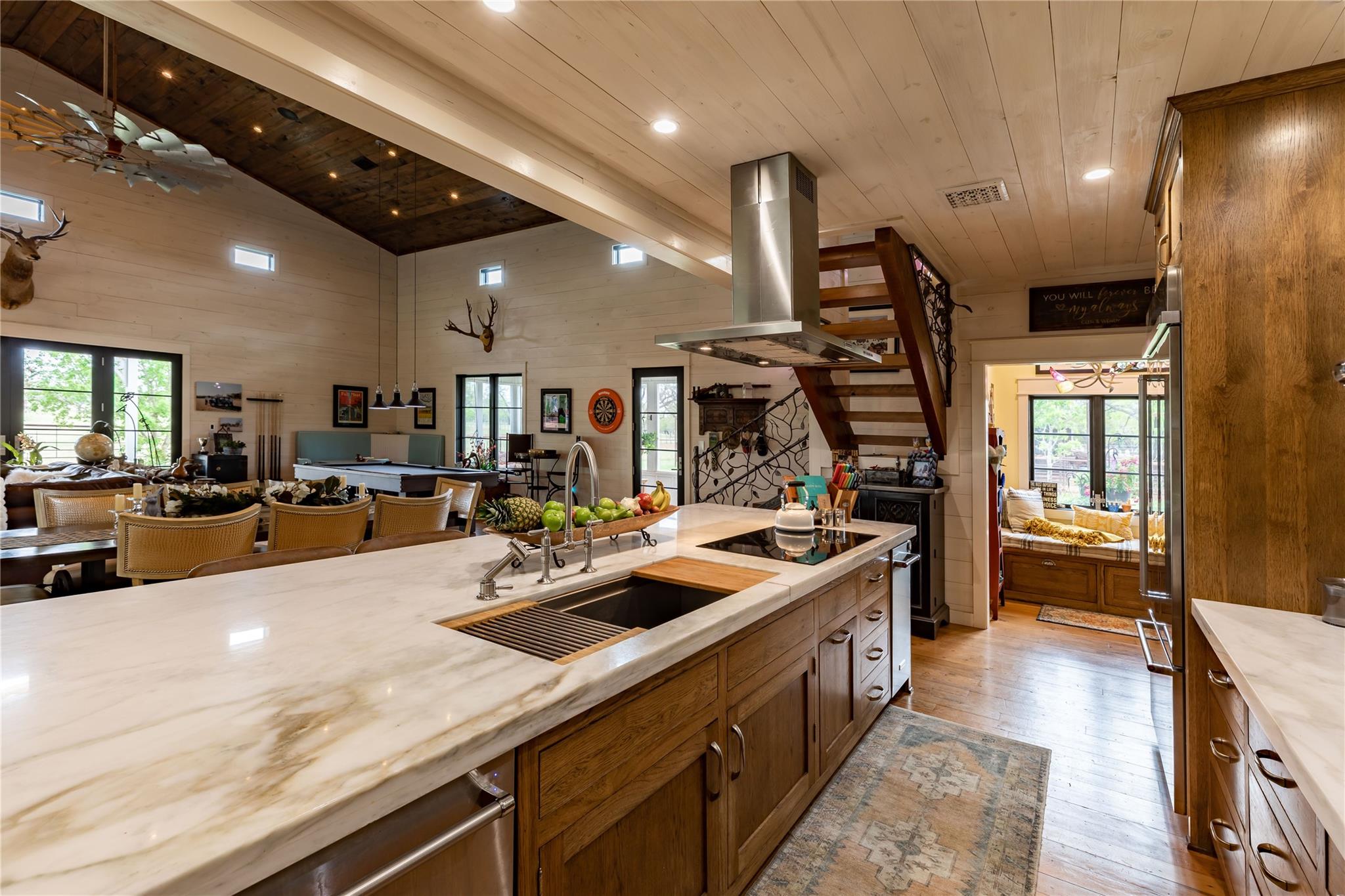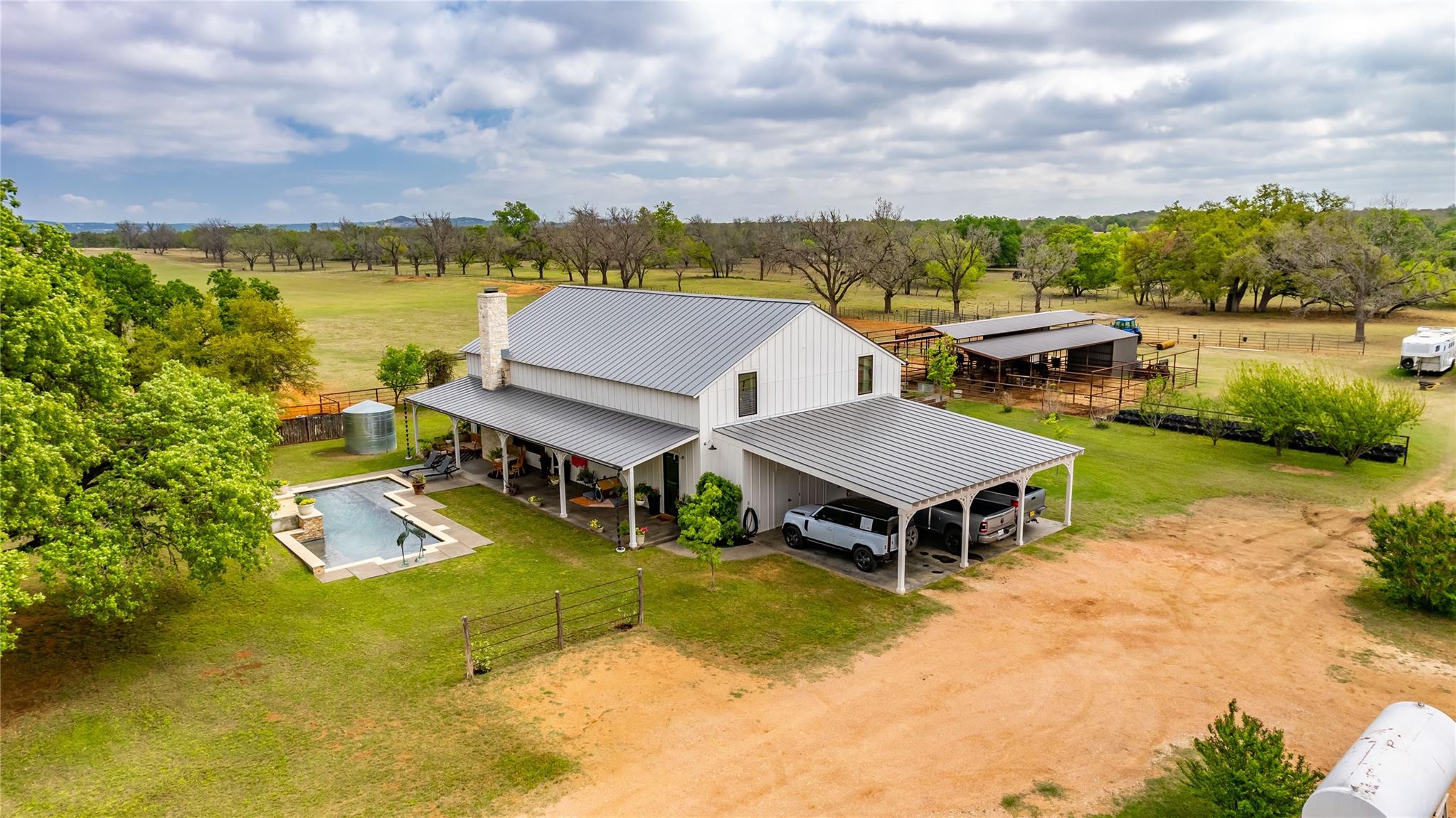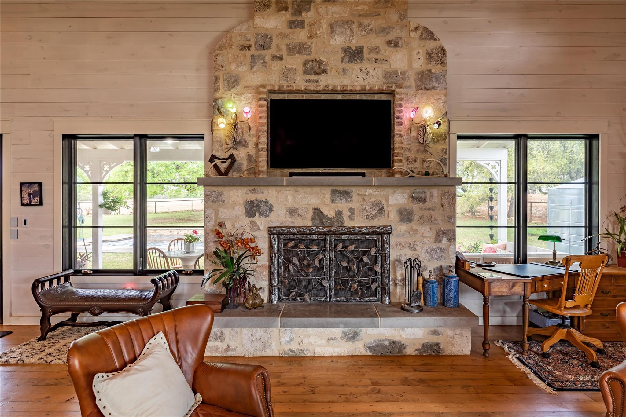 HILL COUNTRY HAVEN! Located on 69+/- acres in Fredericksburg, Texas, at the end of a country road that provides ideal privacy and quiet solitude, yet only a few minutes to town. Bring your horses, your RV, and your love for land and a beautiful home, and settle into your own Hill Country Lifestyle. The open concept home is outfitted with high-quality finishes throughout, including reclaimed pine flooring from an 1800s barn, Murano glass fixtures, Rocky Mountain Hardware, custom marble backsplash, custom iron railing, and a beautiful rock fireplace with a custom forged screen. The kitchen has custom walnut cabinetry, an ice maker, a workstation sink, and a large pantry. Next to the kitchen is a cozy nook, perfect for your morning coffee or reading. The primary is located on the main floor and has a large walk-in closet. The ensuite has a dual vanity and walk-in shower. Two guest bedrooms share a bathroom and double vanity, tub/shower combo, and are adjacent to a second living area. This property includes 8 horse stalls and a barn, with RV storage. Perimeter and cross fencing. 420 feet of Palo Alto Creek runs through. The land is sandy loam and has an Ag Valuation.