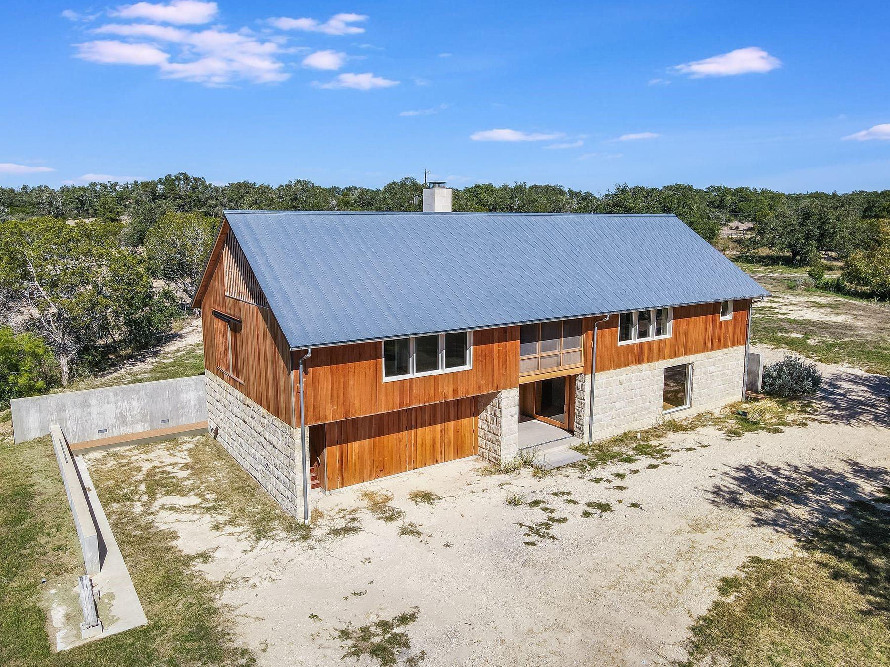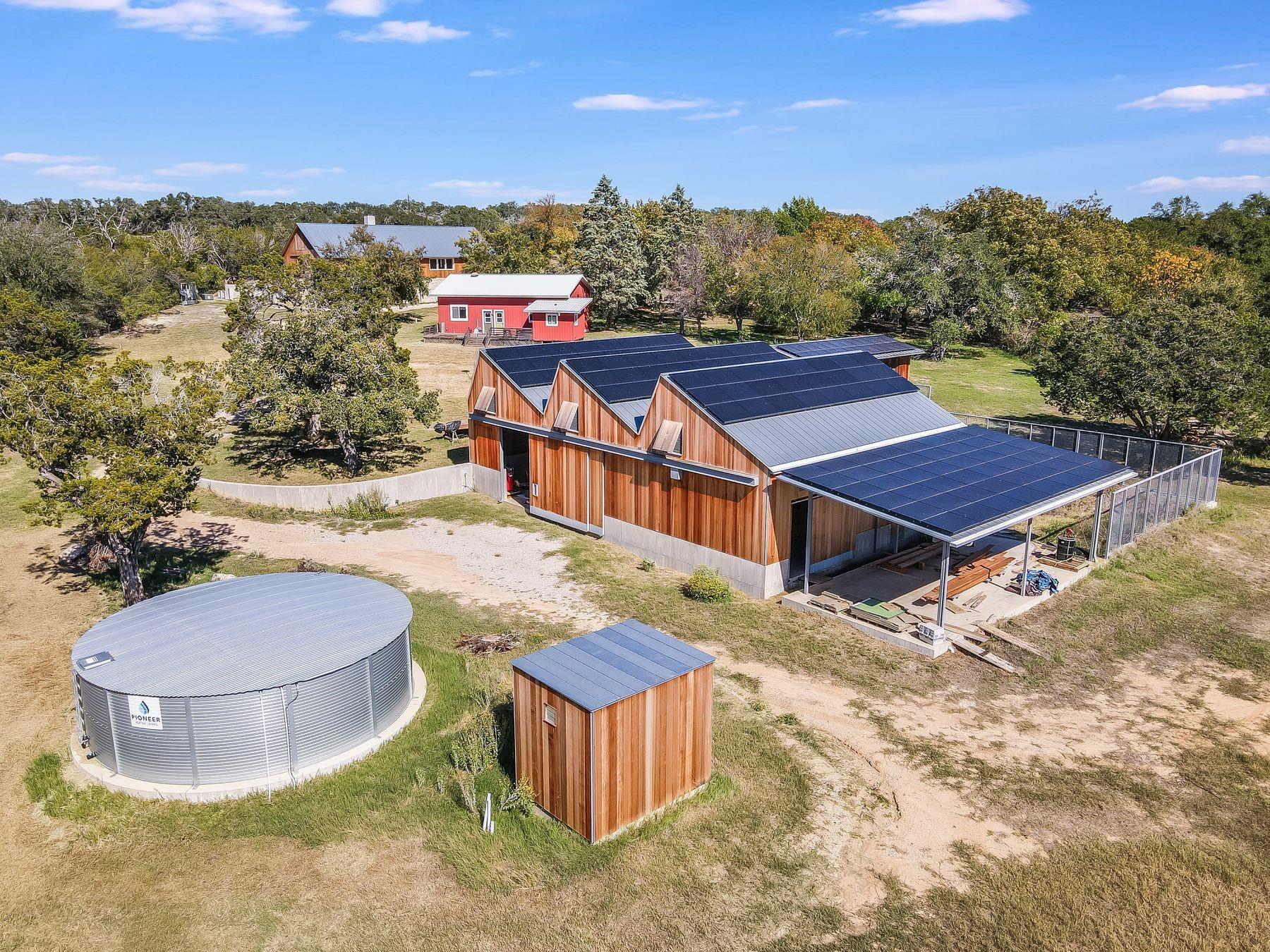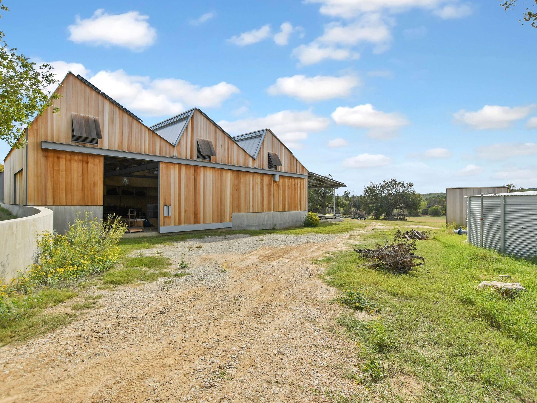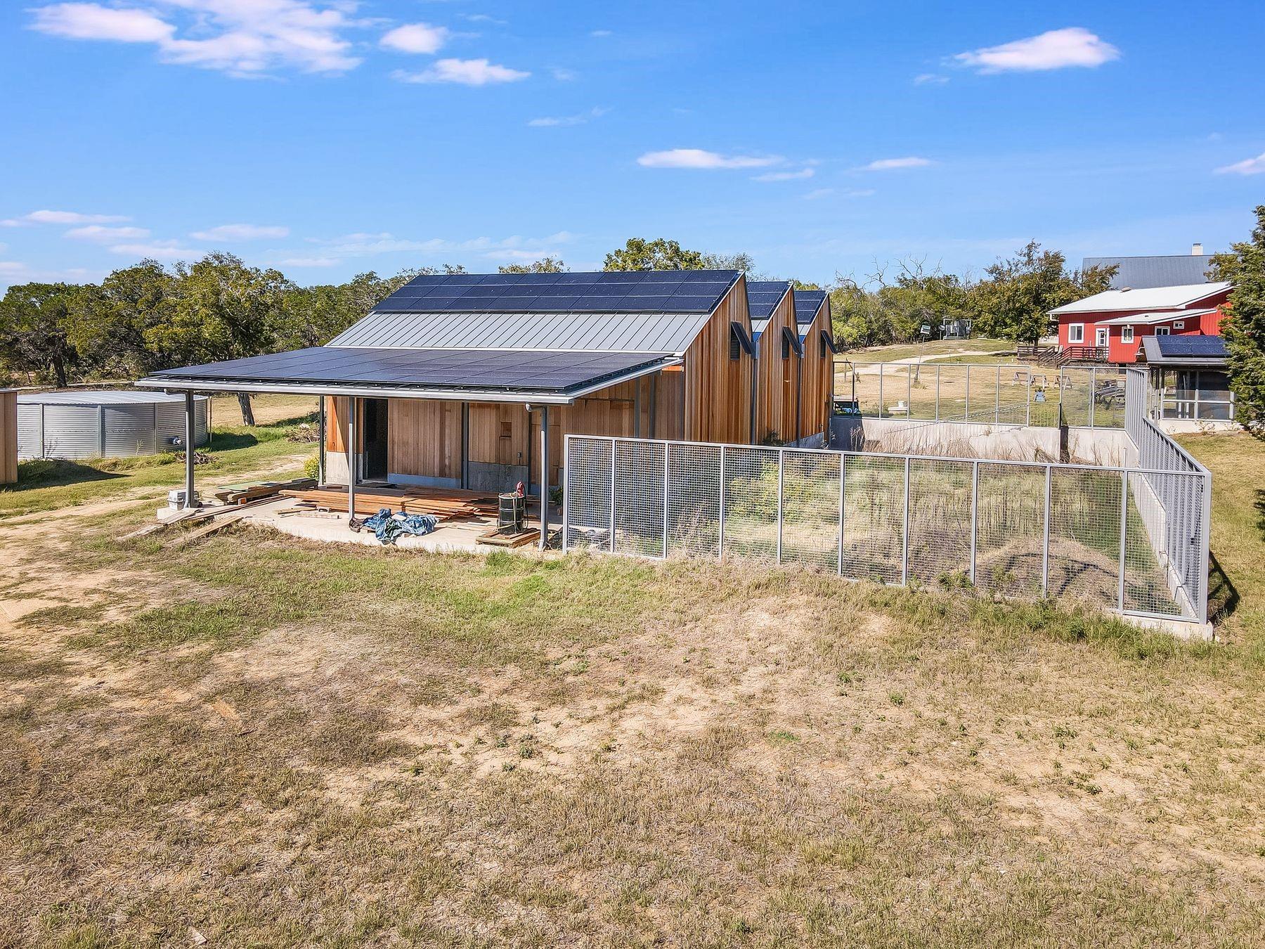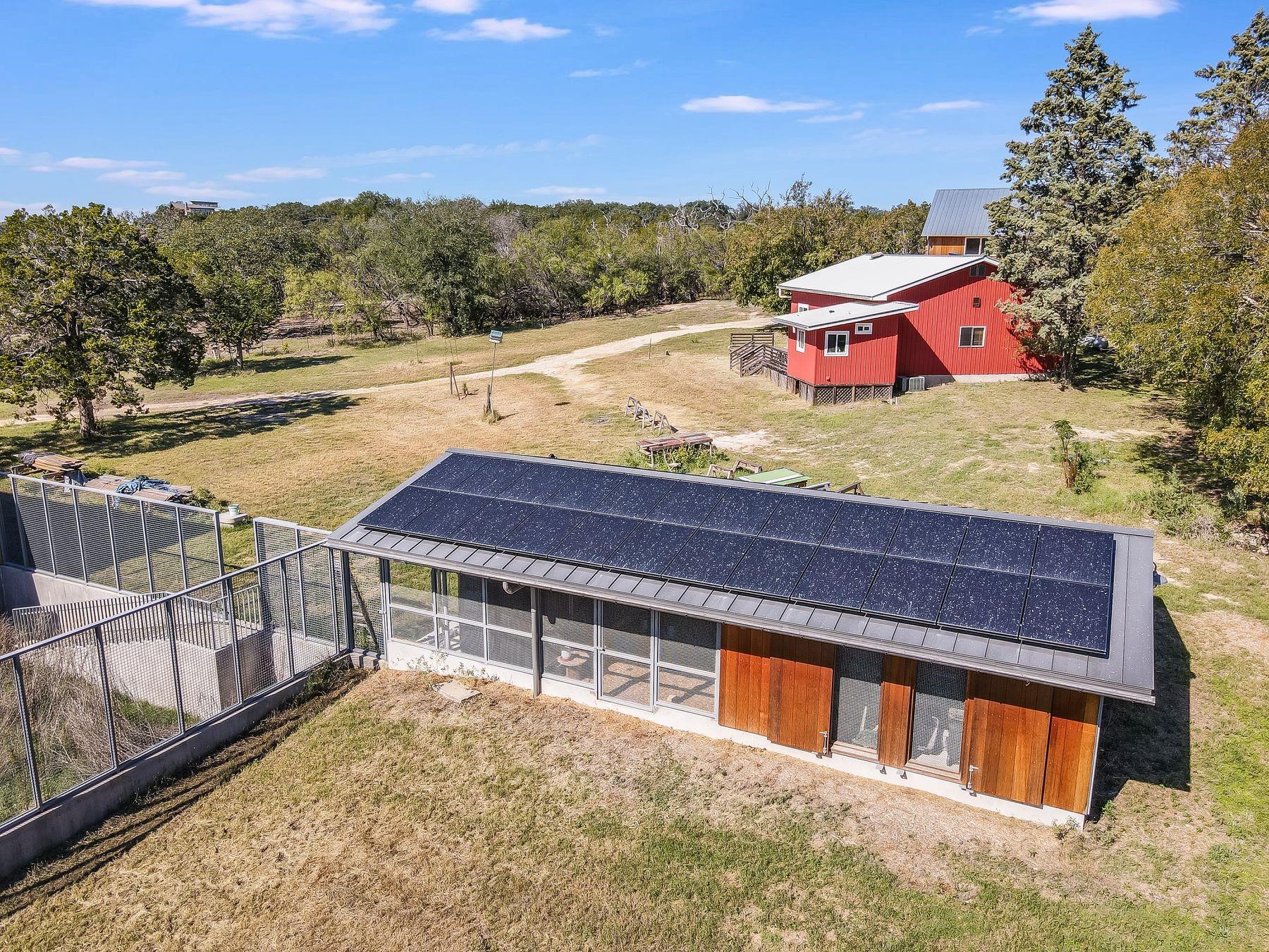 Private, sustainable, and unique are all words that describe this Texas Hill Country property located 45 minutes west of Austin on 9 acres. Three new construction includes an artist's studio with 3 bedrooms and 3 baths and beautiful gourmet kitchen plus a screened porch with fireplace that provides the perfect space for dining al fresco. The property is solar powered by 144 solar panels and 10 Tesla Power Wall batteries. Two water systems provide abundant water. The rain water collection system has a 30,000 gallon storage tank and is primarily for the residence. The well has a 40,000 gallon storage tank and is primarily for irrigation. Both storage tanks have a 4 inch valve compatible with local fire departments. Water is filtered and treated with UV light. The state of the art chicken coop has its own rain water collection system with filtration and UV treatment system and provides the perfect setting for fresh eggs.. There is also storage for eggs and a sink for washing eggs. Built with clear grain cedar siding and a standing seam metal roof, the hen house has everything a chicken could ask. A fenced garden space is adjacent. The huge workshop designed for ventilation and light with large skylights and high ceilings. All new structures designed by nationally know architect, Arthur Anderson. The "red house" has a basic kitchen and one bedroom and one bath. The original farmhouse is still on the property. Plenty of room on this 9 acres to add the house of your dreams. Truly a special property.