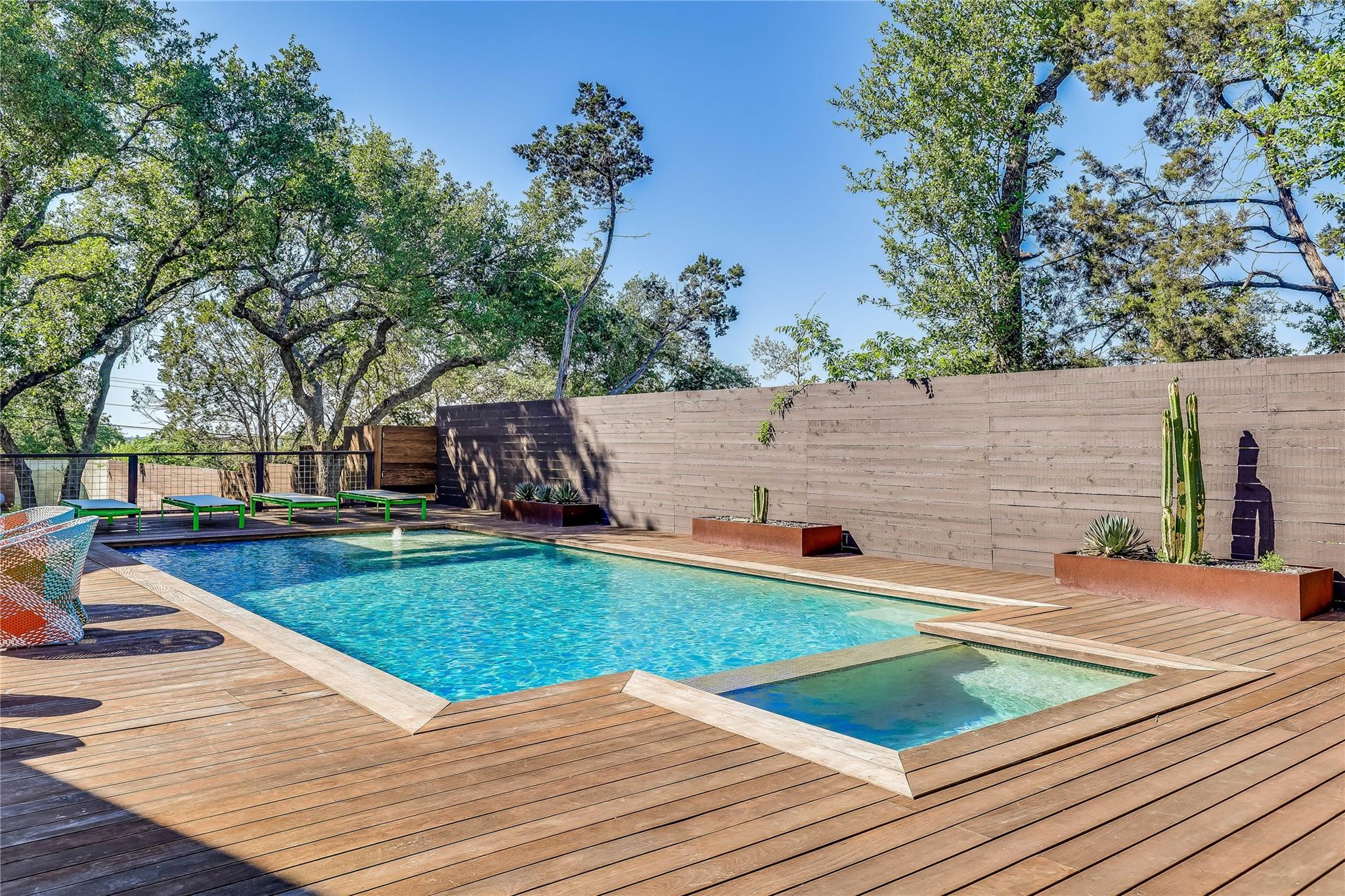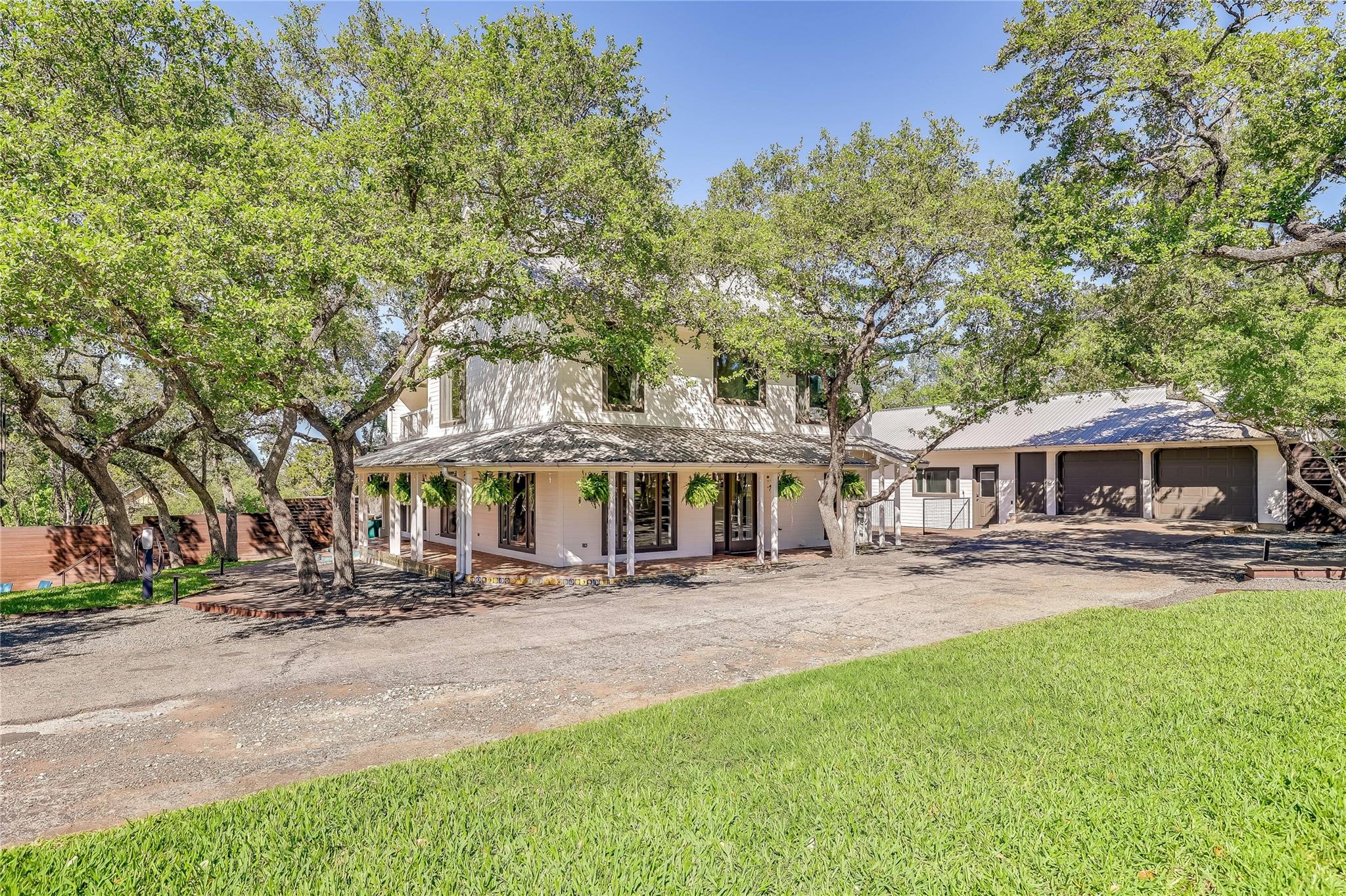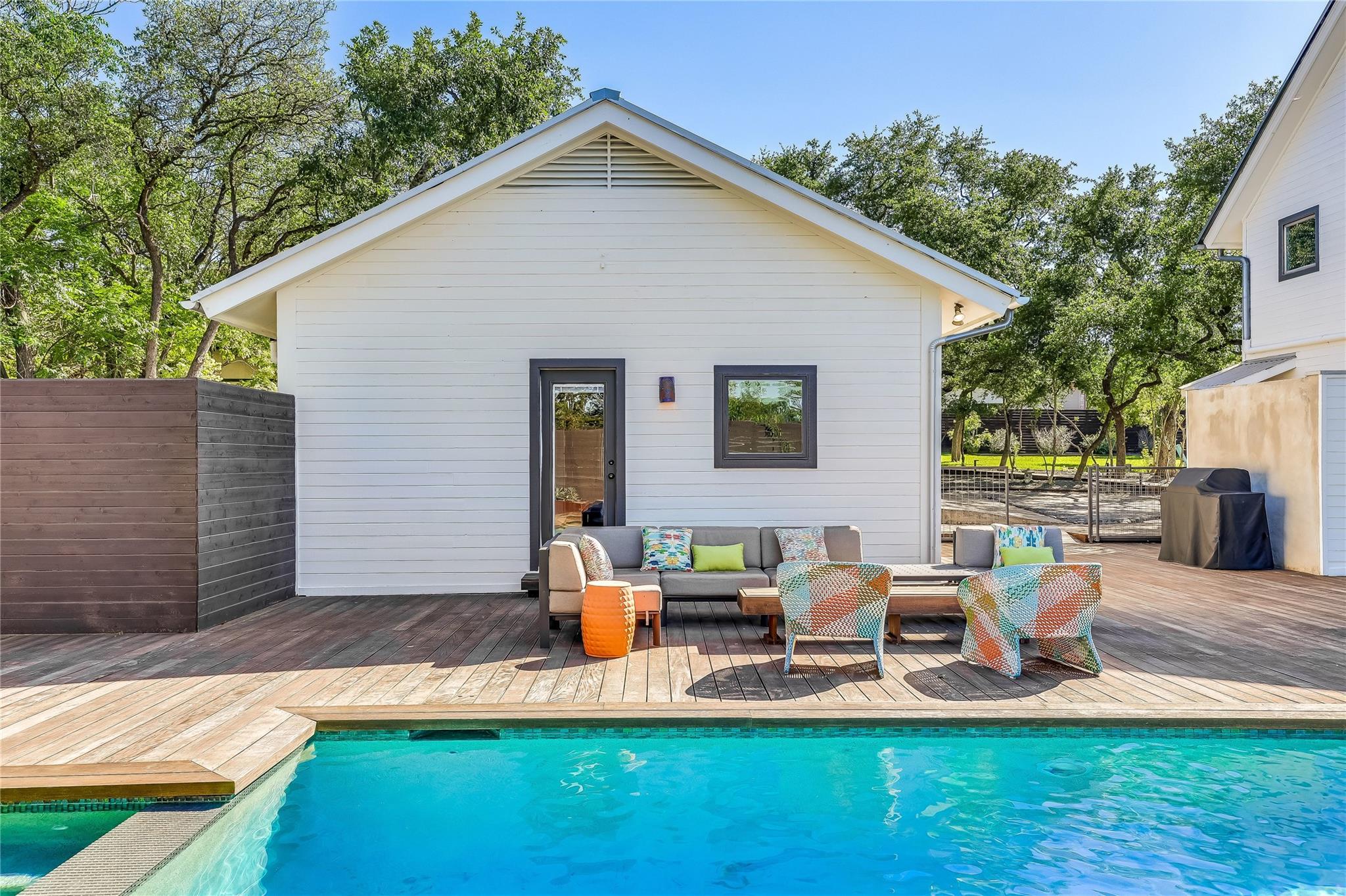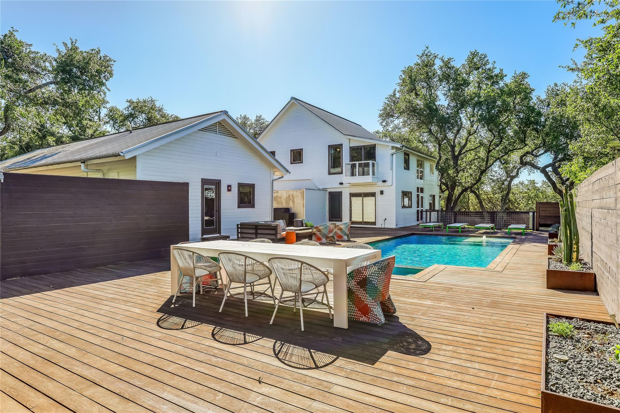 Nestled in the hills of West Austin, this exceptional property offers a serene retreat and refined living. Spanning 0.89 acres across two meticulous lots, this estate presents an unparalleled offering, including separate guest accommodations. The home, a masterpiece of thoughtful design, marries mid-century modern interiors with the charm and warmth of a farmhouse. Mesquite flooring seamlessly merges with custom wood cabinetry, creating an ambiance of organic warmth highlighted by a glass and steel accented staircase. Expansive windows provide an abundance of natural light throughout. The well-appointed kitchen features a professional-grade Wolf range, Thermador oven, Miele dishwasher, and Sub-Zero refrigerator. The kitchen island and breakfast bar open to the living area and dining space, creating a perfect gathering spot. The home's functional elegance extends to a downstairs office, ideal for the discerning professional. Two large covered patios offer additional outdoor living areas, with the primary bedroom boasting its own second-level patio. Both patios could easily be enclosed to add additional square footage. The estate's grounds are a testament to meticulous care and design. A path of Ipe wood decking leads to four raised garden beds, a charming garden shed, and a flat, manicured lawn. Nestled into an amphitheater-like pocket of the property, a fire pit adds a touch of enchantment to the evenings. The highlight of the property’s outdoor space is the crystal-clear pool and heated spa, complemented by an Ipe wood deck and a discreet outdoor shower. The detached guest accommodations provide the perfect space for long-term guests, multi-generational living, a home office, studio, or a pool house ideal for entertaining. This sanctuary is located within the coveted EANES ISD, adding to its desirability. Its proximity to downtown and Lake Austin offers both convenience and a connection to nature's beauty.