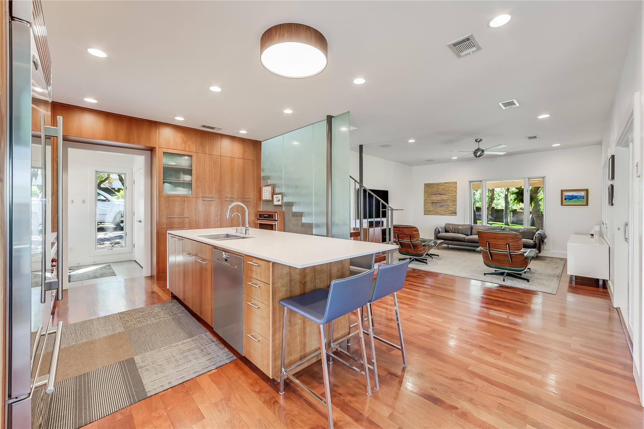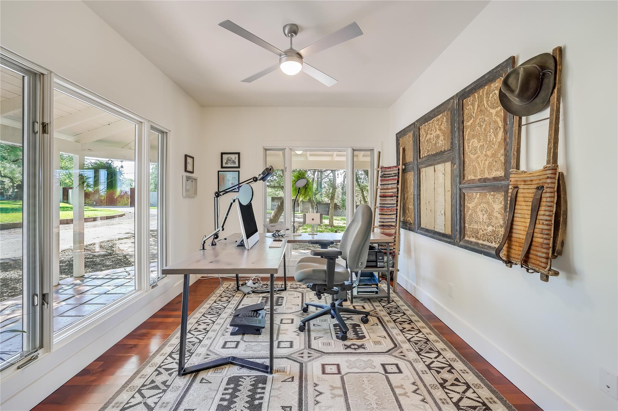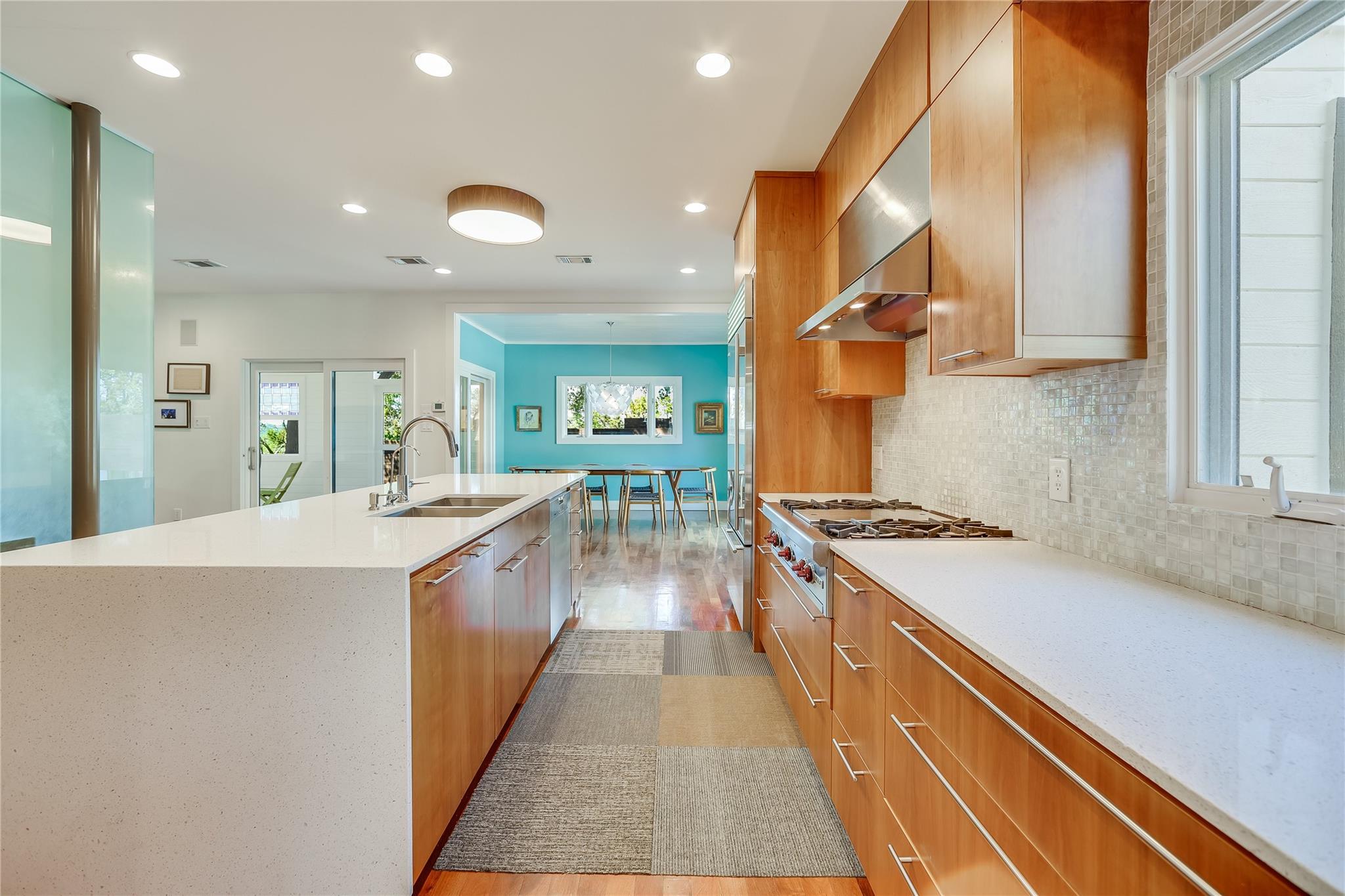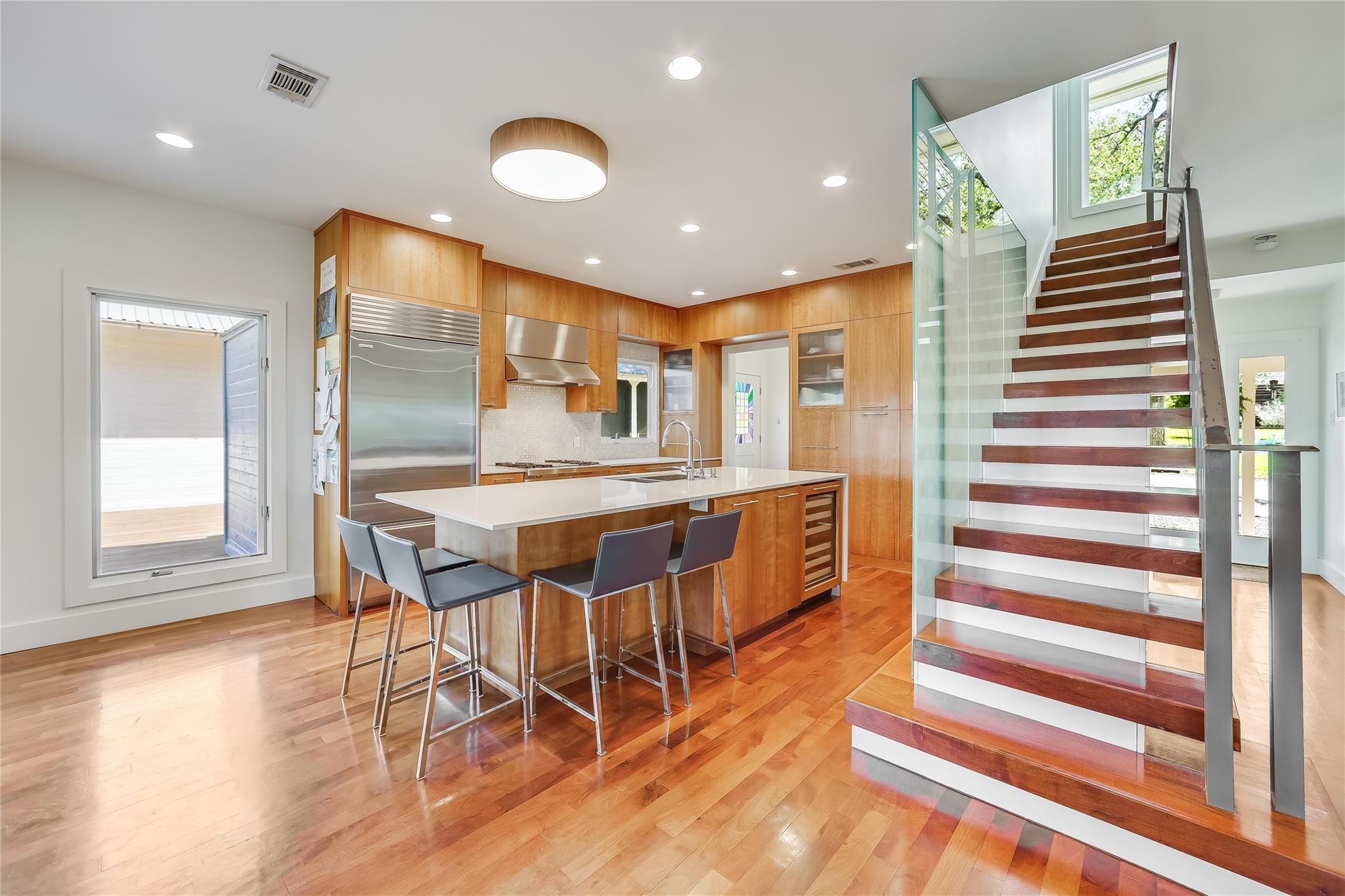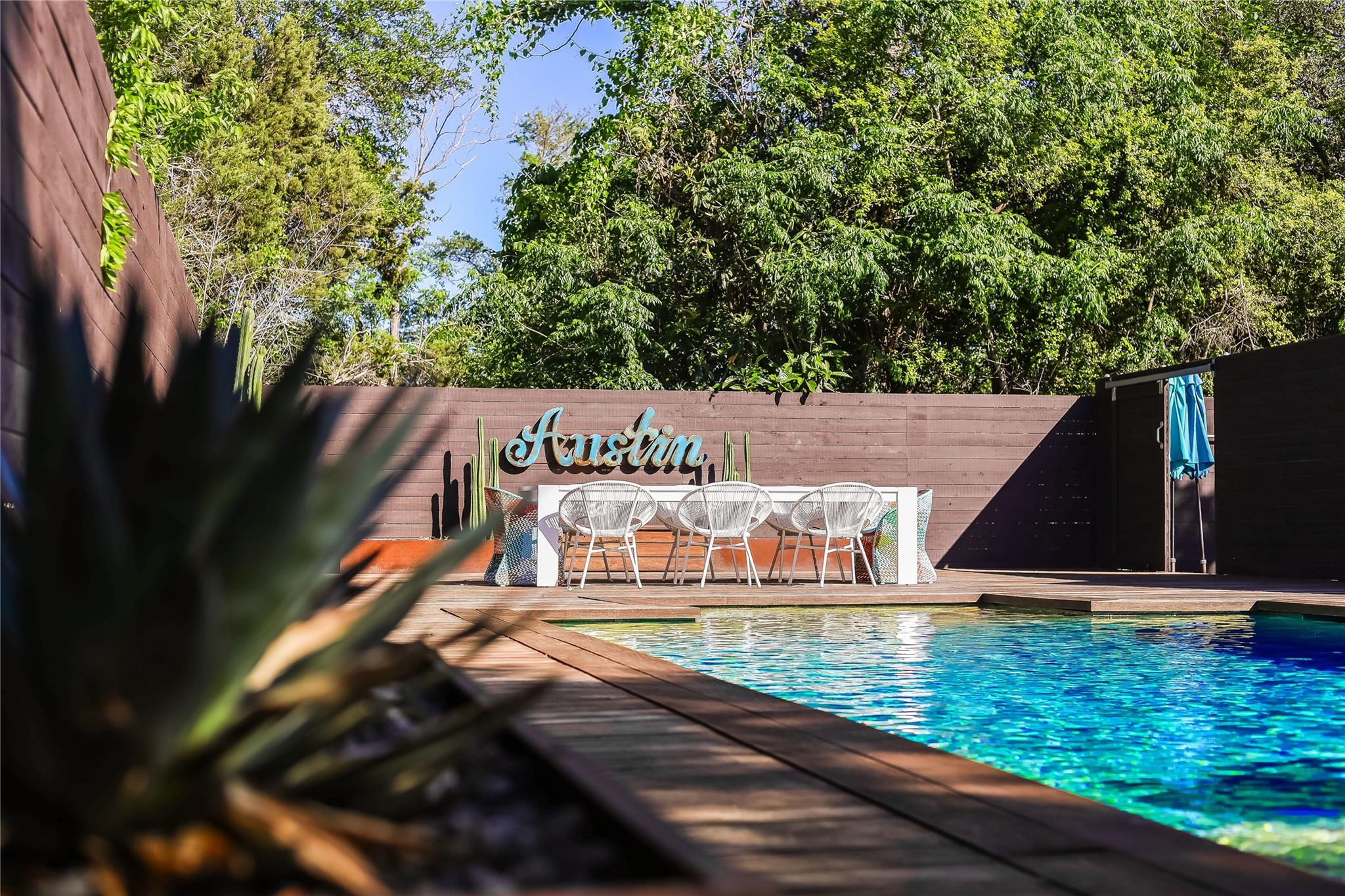 Nestled in the hills of West Austin, this exceptional property offers a serene retreat and refined living. Spanning 0.89 acres across two meticulous lots, this estate presents an unparalleled offering, including separate guest accommodations. The home, a masterpiece of thoughtful design, marries mid-century modern interiors with the charm and warmth of a farmhouse. Mesquite flooring seamlessly merges with custom wood cabinetry, creating an ambiance of organic warmth highlighted by a glass and steel accented staircase. Expansive windows provide an abundance of natural light throughout. The well-appointed kitchen features a professional-grade Wolf range, Thermador oven, Miele dishwasher, and Sub-Zero refrigerator. The kitchen island and breakfast bar open to the living area and dining space, creating a perfect gathering spot. The home's functional elegance extends to a downstairs office, ideal for the discerning professional. Two large covered patios offer additional outdoor living areas, with the primary bedroom boasting its own second-level patio. Both patios could easily be enclosed to add additional square footage. The estate's grounds are a testament to meticulous care and design. A path of Ipe wood decking leads to four raised garden beds, a charming garden shed, and a flat, manicured lawn. Nestled into an amphitheater-like pocket of the property, a fire pit adds a touch of enchantment to the evenings. The highlight of the property’s outdoor space is the crystal-clear pool and heated spa, complemented by an Ipe wood deck and a discreet outdoor shower. The detached guest accommodations provide the perfect space for long-term guests, multi-generational living, a home office, studio, or a pool house ideal for entertaining. This sanctuary is located within the coveted EANES ISD, adding to its desirability. Its proximity to downtown and Lake Austin offers both convenience and a connection to nature's beauty.