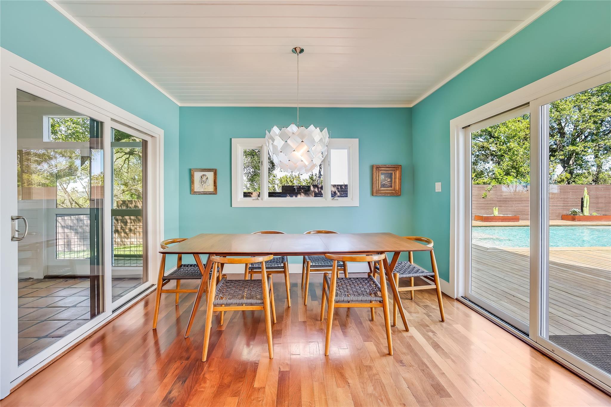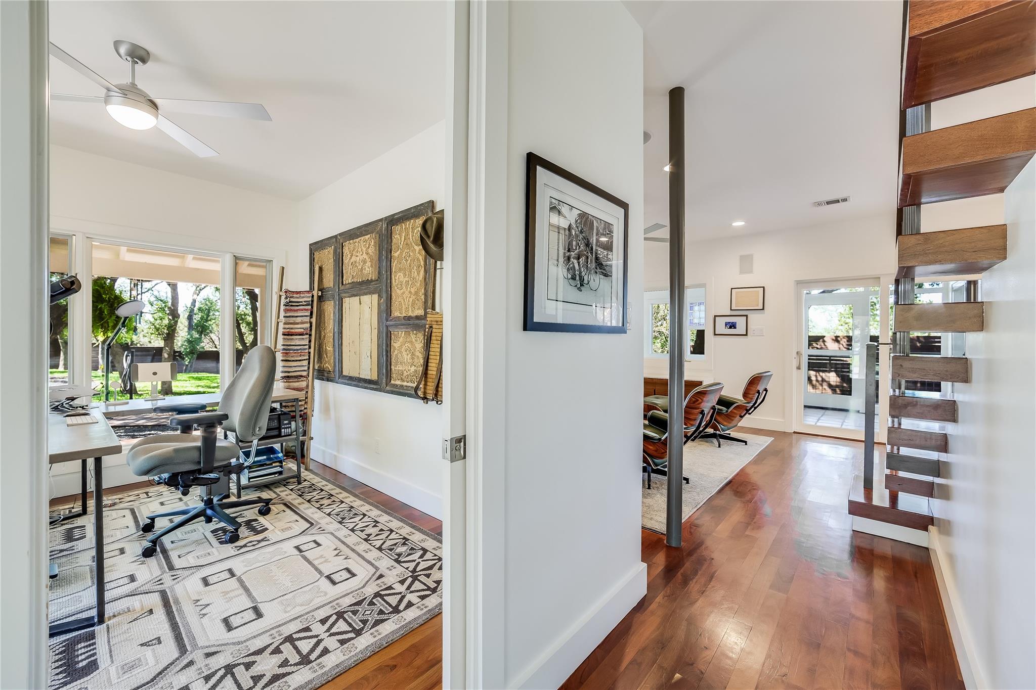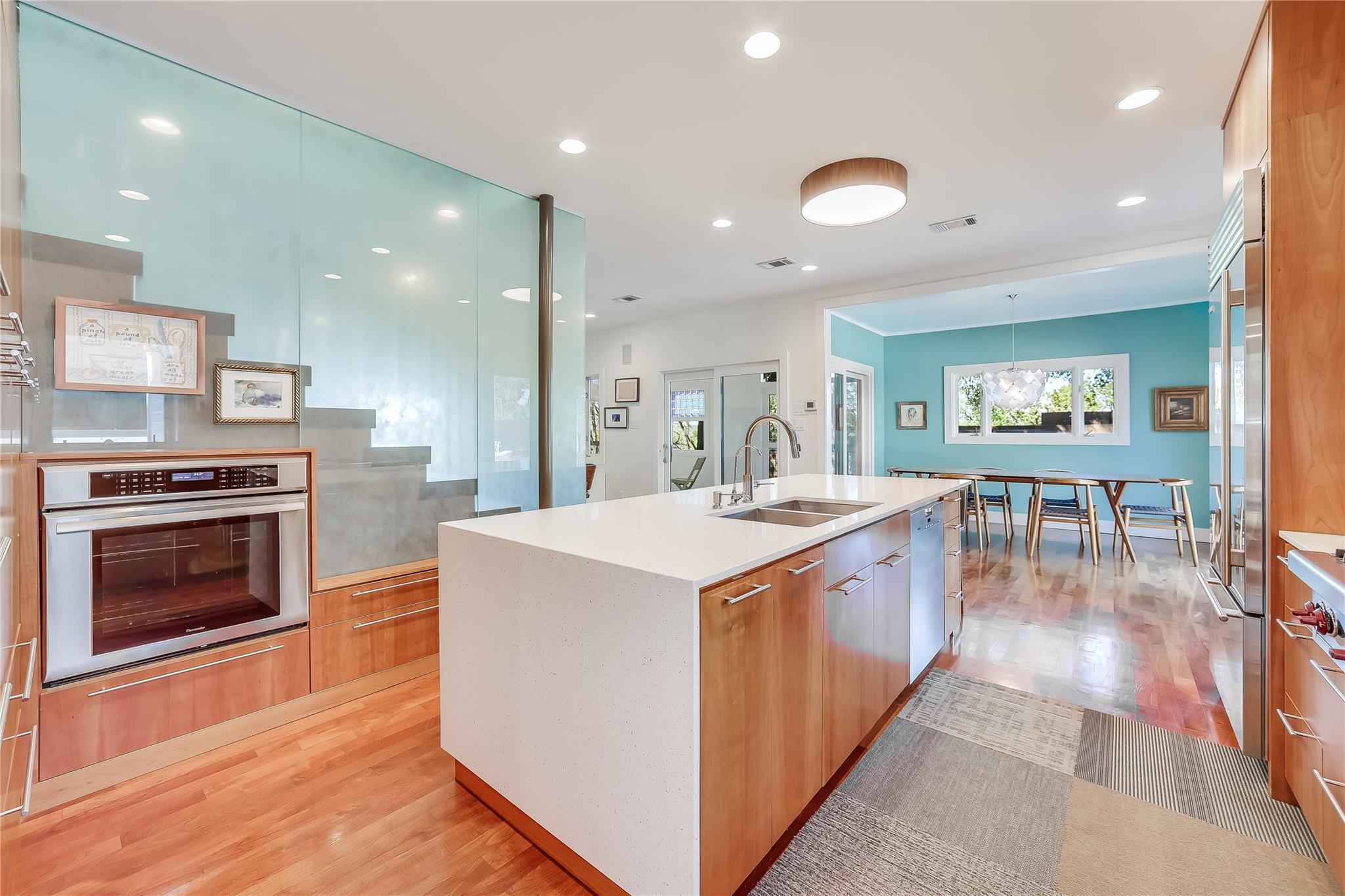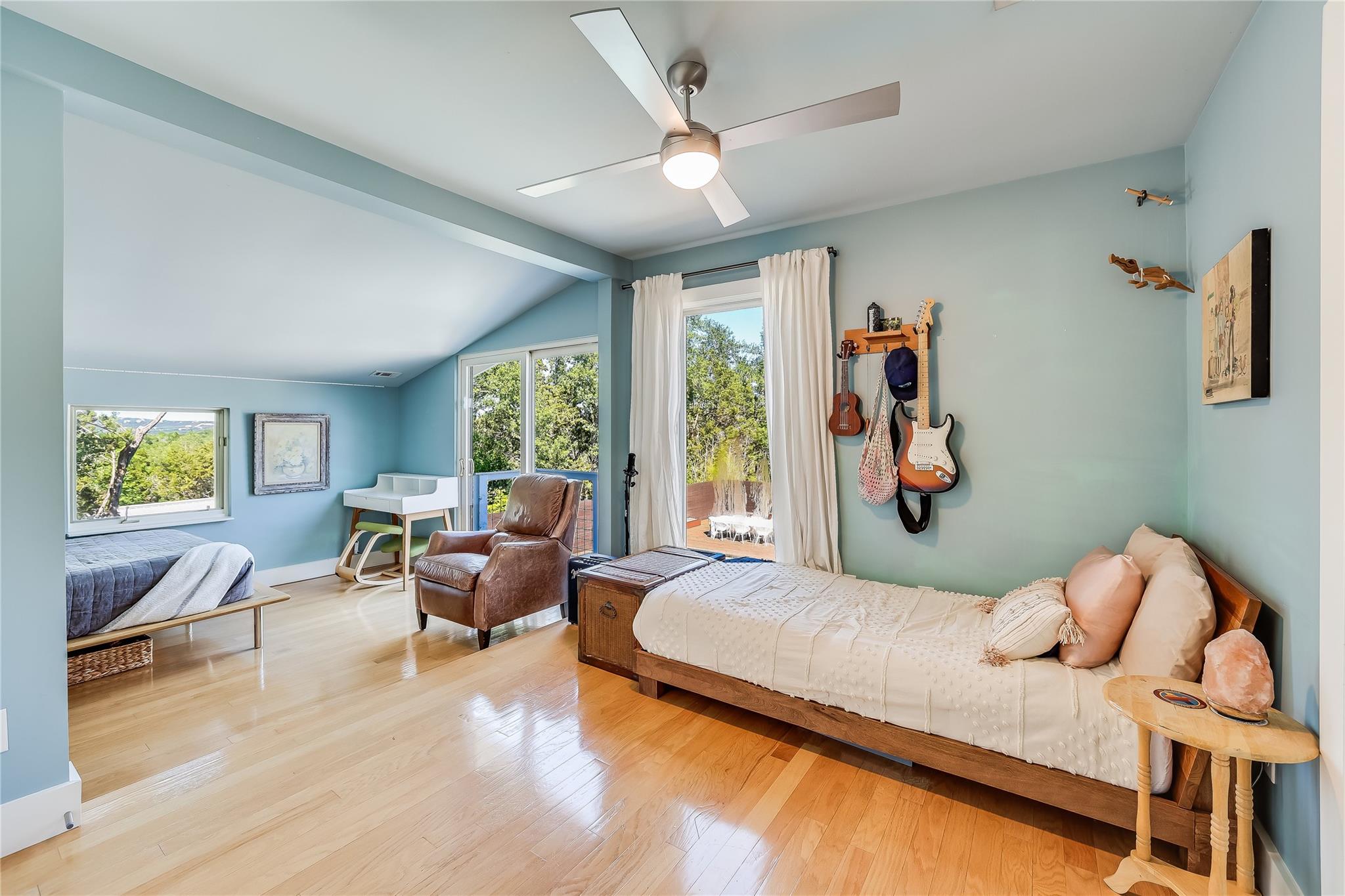 Nestled in the hills of West Austin, this exceptional property offers a serene retreat and refined living. Spanning 0.89 acres across two meticulous lots, this estate presents an unparalleled offering, including separate guest accommodations. The home, a masterpiece of thoughtful design, marries mid-century modern interiors with the charm and warmth of a farmhouse. Mesquite flooring seamlessly merges with custom wood cabinetry, creating an ambiance of organic warmth highlighted by a glass and steel accented staircase. Expansive windows provide an abundance of natural light throughout. The well-appointed kitchen features a professional-grade Wolf range, Thermador oven, Miele dishwasher, and Sub-Zero refrigerator. The kitchen island and breakfast bar open to the living area and dining space, creating a perfect gathering spot. The home's functional elegance extends to a downstairs office, ideal for the discerning professional. Two large covered patios offer additional outdoor living areas, with the primary bedroom boasting its own second-level patio. Both patios could easily be enclosed to add additional square footage. The estate's grounds are a testament to meticulous care and design. A path of Ipe wood decking leads to four raised garden beds, a charming garden shed, and a flat, manicured lawn. Nestled into an amphitheater-like pocket of the property, a fire pit adds a touch of enchantment to the evenings. The highlight of the property’s outdoor space is the crystal-clear pool and heated spa, complemented by an Ipe wood deck and a discreet outdoor shower. The detached guest accommodations provide the perfect space for long-term guests, multi-generational living, a home office, studio, or a pool house ideal for entertaining. This sanctuary is located within the coveted EANES ISD, adding to its desirability. Its proximity to downtown and Lake Austin offers both convenience and a connection to nature's beauty.
