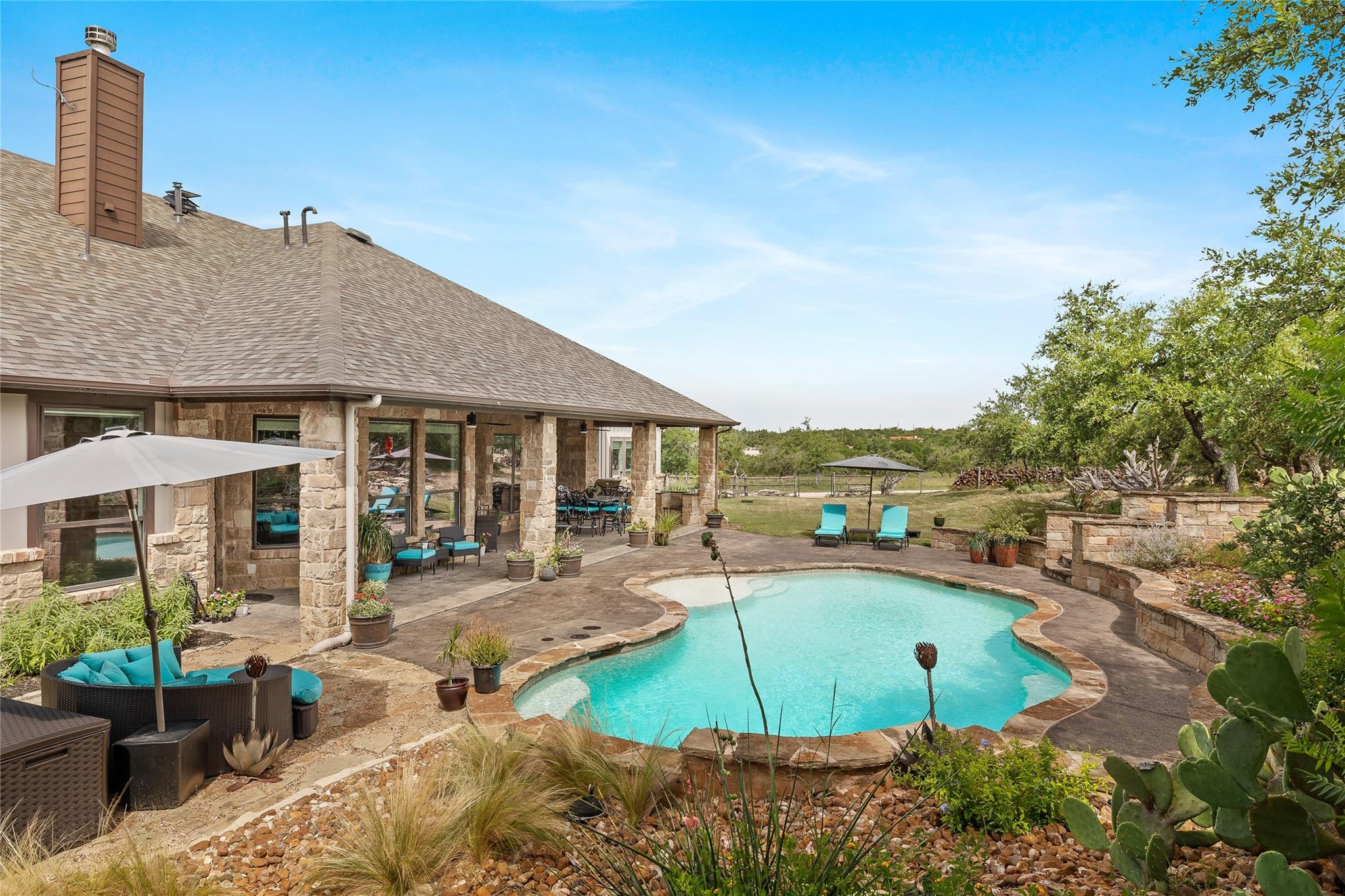 Experience the ultimate in Hill Country living with this luxurious estate situated on a sprawling 16.84-acre property that has everything a horse enthusiast could want. Boasting an upgraded sandstone exterior and a grand entrance with an oversized wrought iron front door, this property is a true showstopper. The interior of this 4BD/4BA home is equally impressive, with an enormous kitchen island and numerous upgrades throughout the spacious 4,044 SF living space. Relax in the comfort of your own backyard oasis, complete with a sparkling pool, covered patio, and stunning landscape. The property features a modern gourmet kitchen, a wine bar, a large primary suite with a spa-like retreat, a separate office, a children's retreat, and a mother-in-law suite, making it the ideal home for any family. In addition to the luxurious home, this property includes top-of-the-line horse facilities, including a 5-stall barn, a tack/hay room, an open-air arena, and a jump field. With three pastures totaling nine acres, there is plenty of room for rotation, and ample space for additional pastures. The property slopes to a wet-weather creek and is covered by large oaks, providing refreshing shade for you and your horses. Be sure to watch the attached property video. Enjoy the benefits of a 30K gallon rainwater collection system and a low 1.8% tax rate on this Ag Exempt Property. This incredible hill country property is conveniently located just 25 miles southwest of Austin and 14 minutes from main street Dripping Springs. Centrally located within miles of the Wedding Venues, Wineries, Breweries, and Distilleries, of the Hill Country, making this a very attractive location for a AirBB. This is a unique opportunity to own a truly exceptional property that has it all. New roof completed 6/23