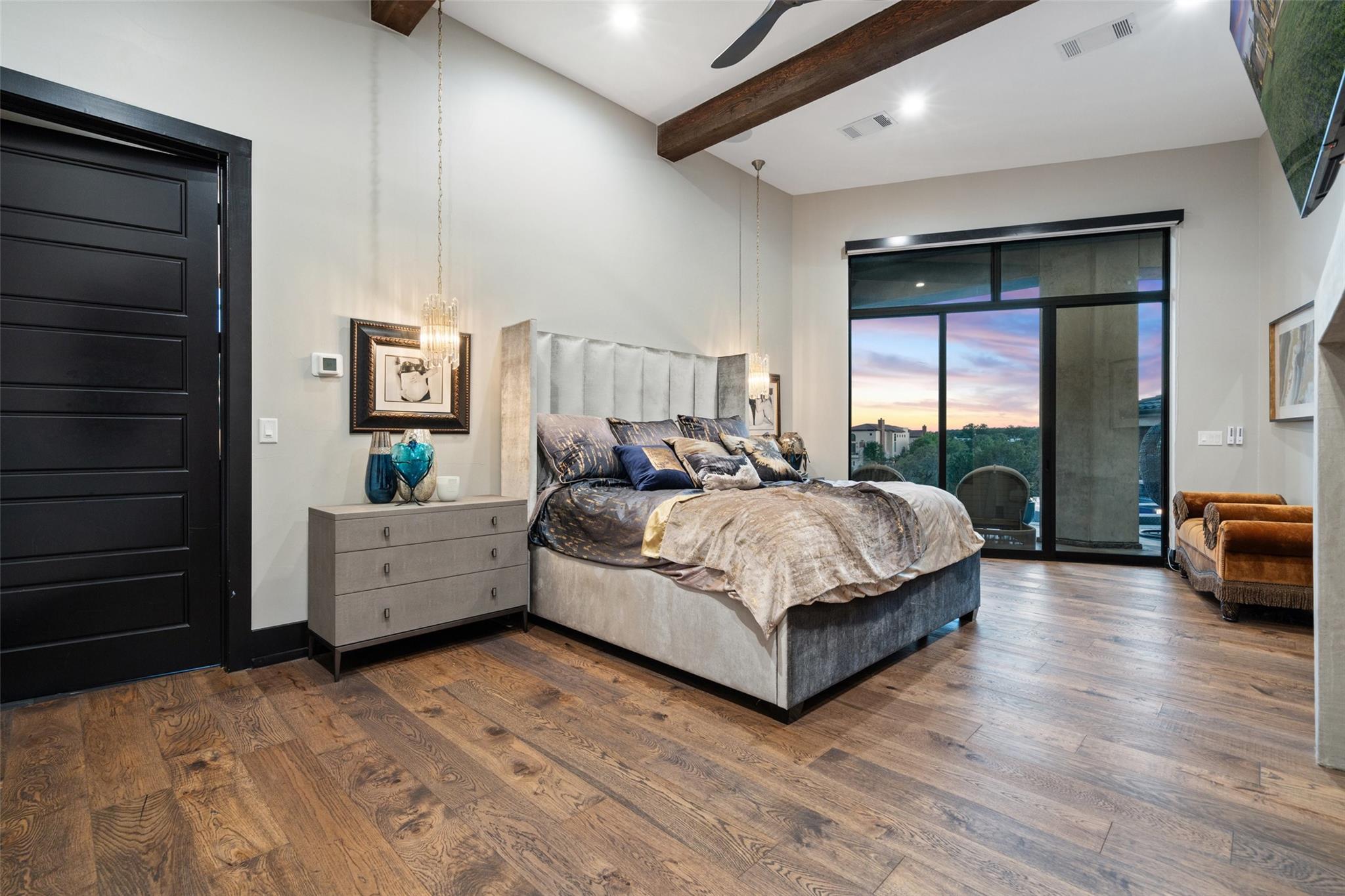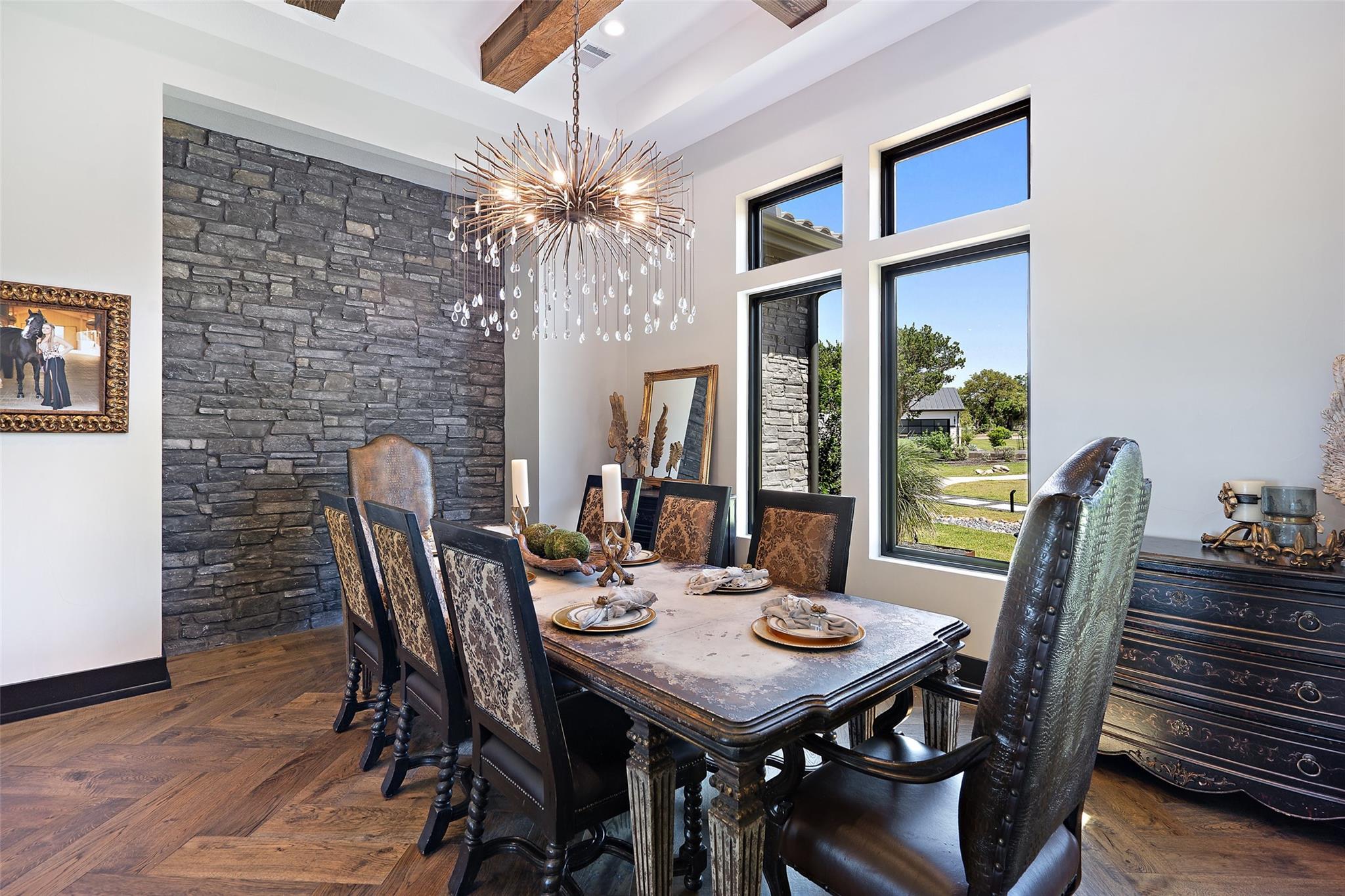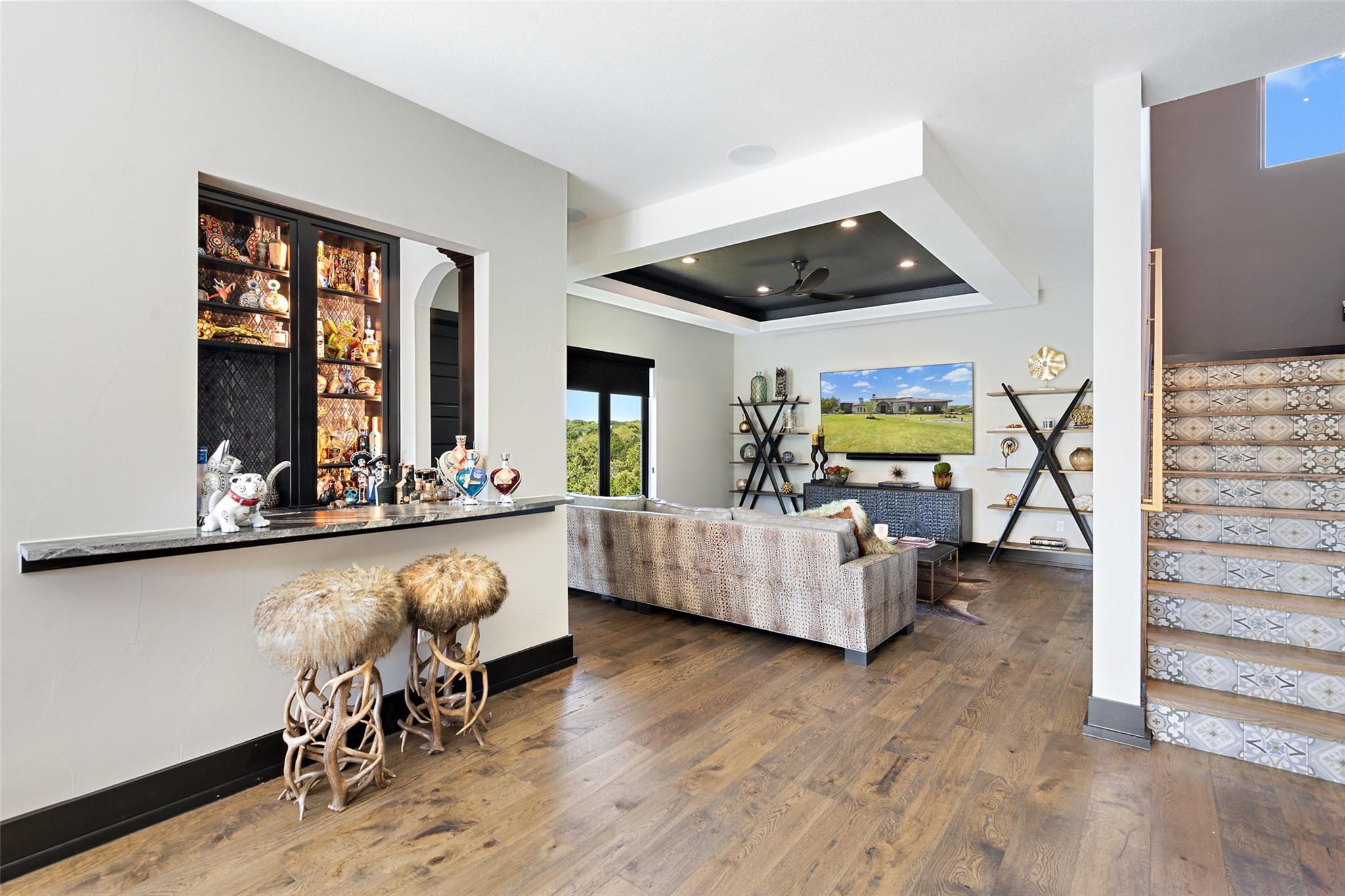 | Interior Features | Bar, Breakfast Bar, Built-in Features, Ceiling Fan(s), Beamed Ceilings, Cathedral Ceiling(s), Coffered Ceiling(s), High Ceilings, Central Vacuum, Quartz Counters, Double Vanity, Interior Steps, Kitchen Island, Multiple Dining Areas, Multiple Living Areas, Natural Woodwork, Open Floorplan, Pantry, Primary Bedroom on Main, Recessed Lighting, Smart Home, Smart Thermostat, Walk-In Closet(s), Wet Bar | |