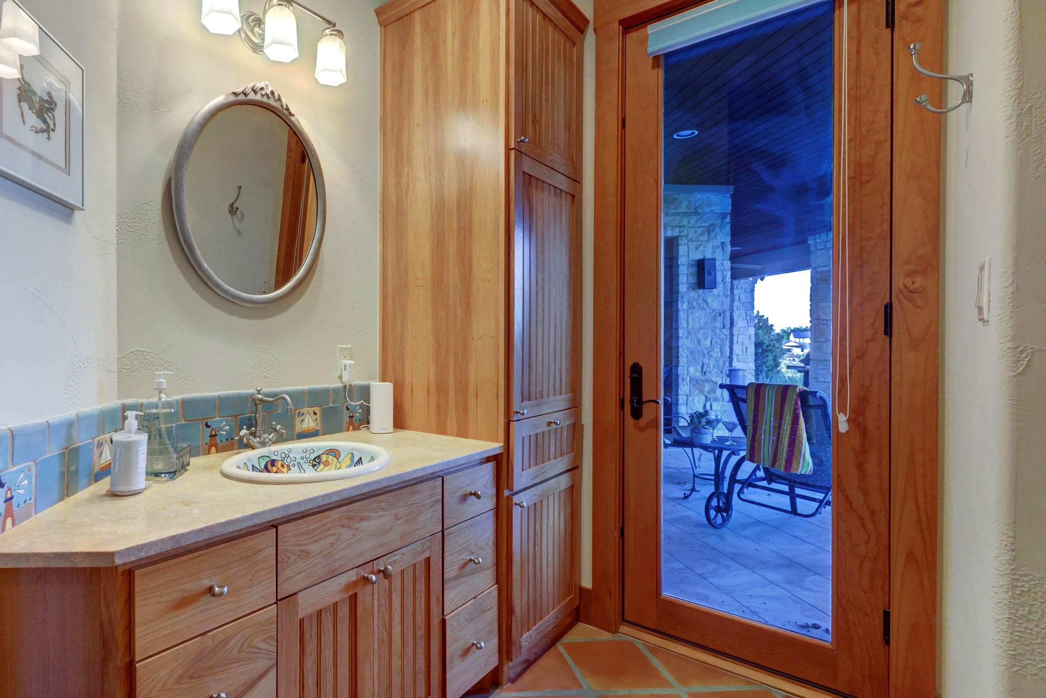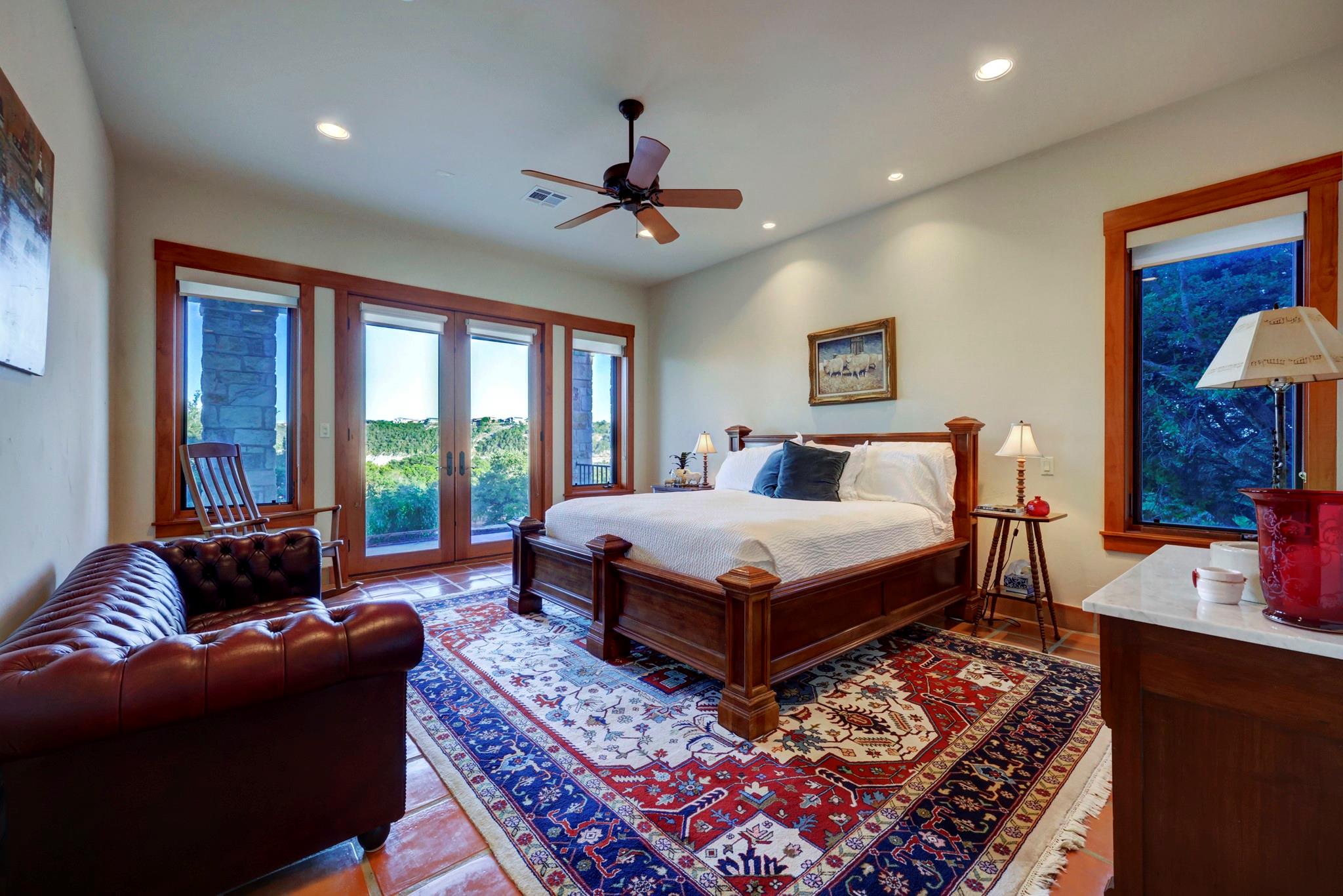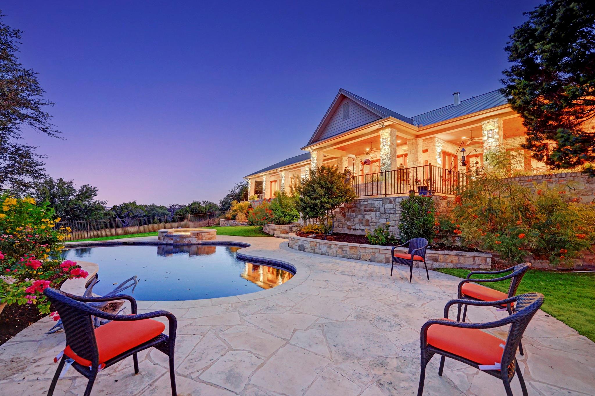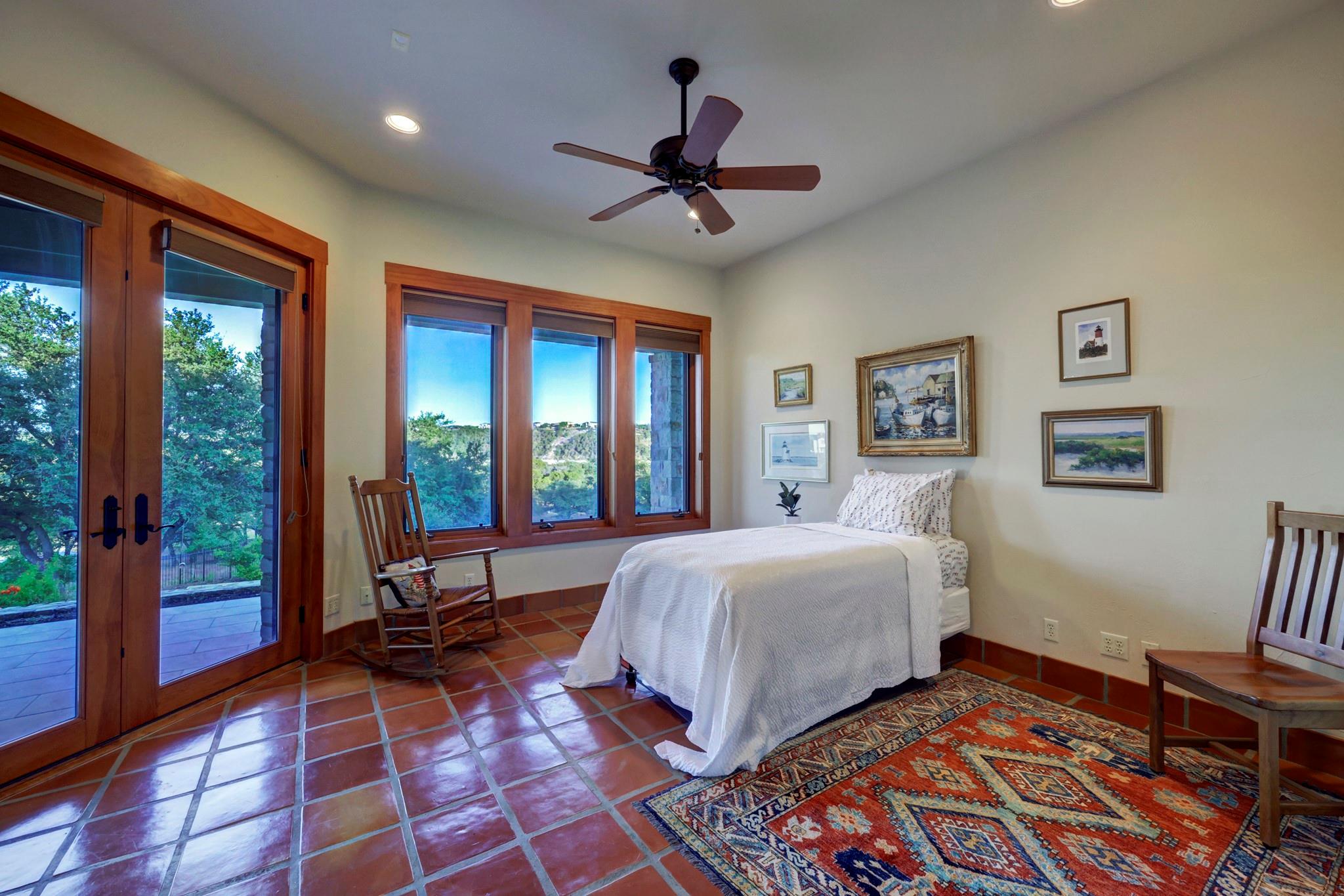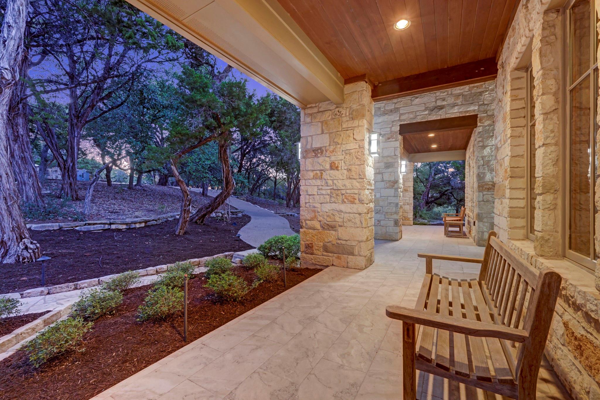 Escape to this striking one owner, single level, custom built waterfront estate located in the Texas Hill Country. This well appointed home is peacefully situated on 6+ acres. Breathtaking views overlook deep water Lake Travis, as well as vistas of tranquil spaces studded with oak trees. The 15+ acre community park and marina are located next to and below this estate, offering undeveloped neighboring land for your enjoyment at this once in a lifetime restful residential resort. The Hill Country Ranch architecture has been constructed with the finest in design and materials. The covered front porch allows one to enjoy wooded landscapes and wildlife. The spacious family room is adorned with a floor to ceiling fireplace, wet bar, wood-beamed ceiling, and access outdoors. The open floor has a nearby gourmet kitchen featuring top of the line appliances, 2 islands, butler’s pantry, wine refrigerator, and more for the avid cook. There is a lovely primary suite with fireplace, verandah access, soaking tub, separate shower, and 2 walk in closets. A second primary suite and 2 additional en-suite bedrooms are located on the opposite side of the home. There is a handsome library with built in bookshelves and fireplace, and an office with built ins. Ease of indoor/outdoor living and entertaining! The rear yard includes a verandah of approx. 1,600 square feet, outdoor kitchen, sparkling pool and spa, and expansive grounds. Other features include pecan cabinetry and built ins, cherry wood millwork, Italian limestone, quartz, Saltillo tile, granite, mesquite flooring, custom tiles, triple-zoned HVAC, security system, well insulated construction, metal roof, and huge garage with storage room. The estate has access to a community water supply, private well, and access to Lake Travis water. There is a community tennis and pickleball court, a gazebo and barbecue area, and marina with 18 slips. Lake Travis ISD. A boat slip is available for separate negotiation. A must see estate!
