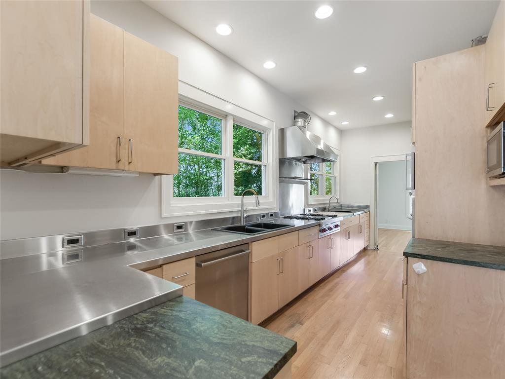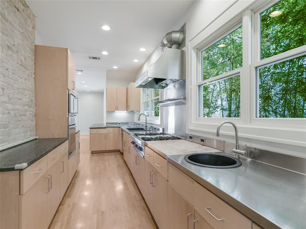 custom cabinetry, large walk-in pantry, & stone, stainless, & butcher block counters.