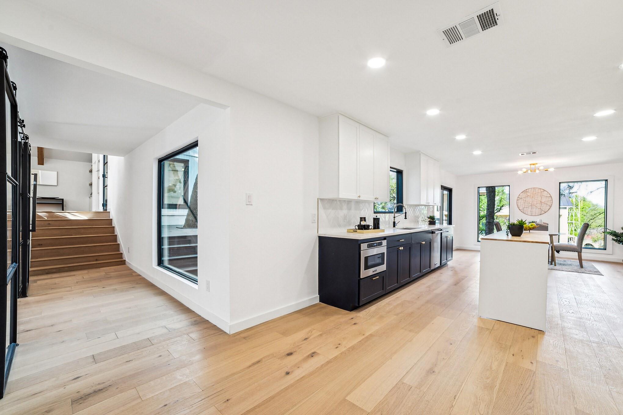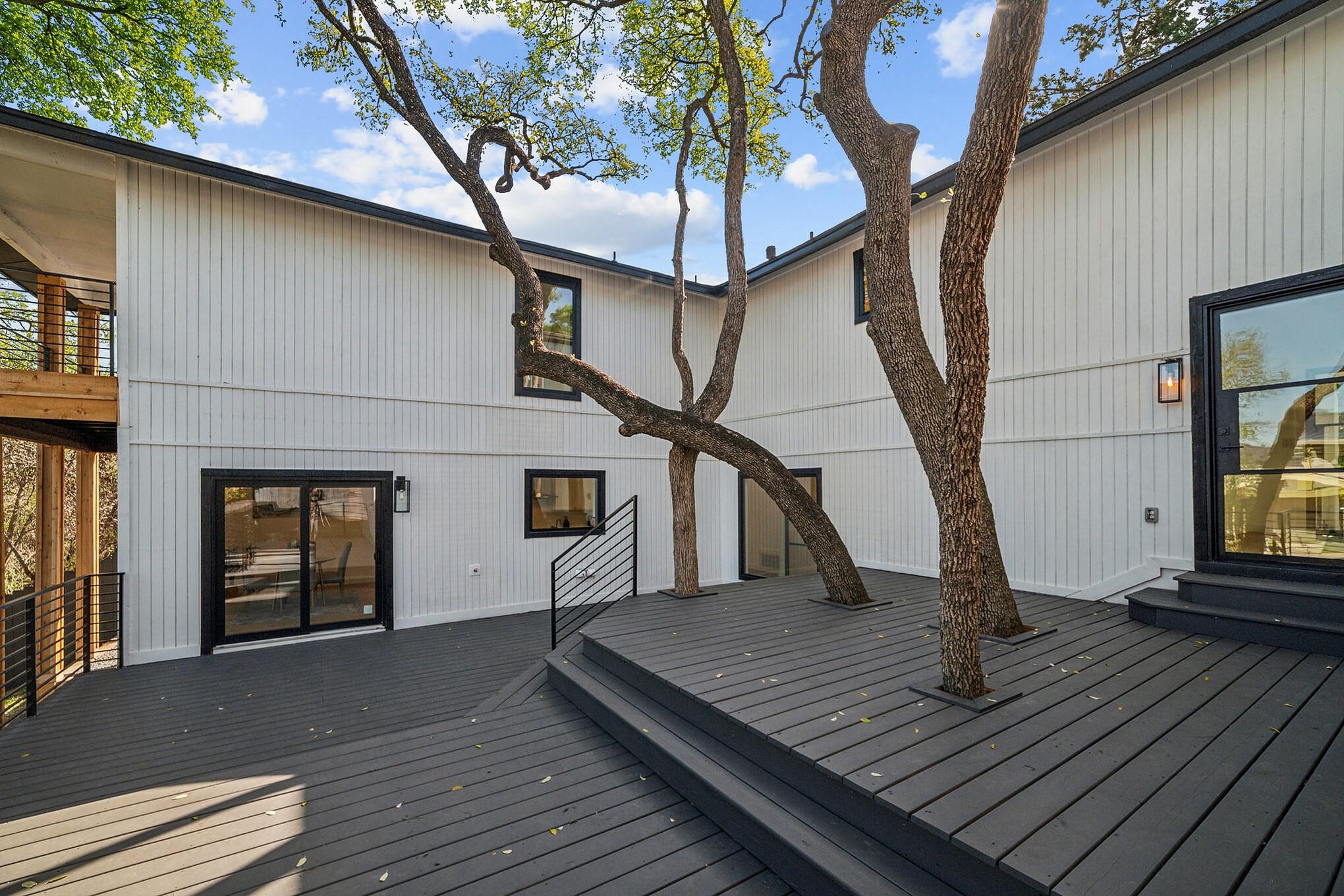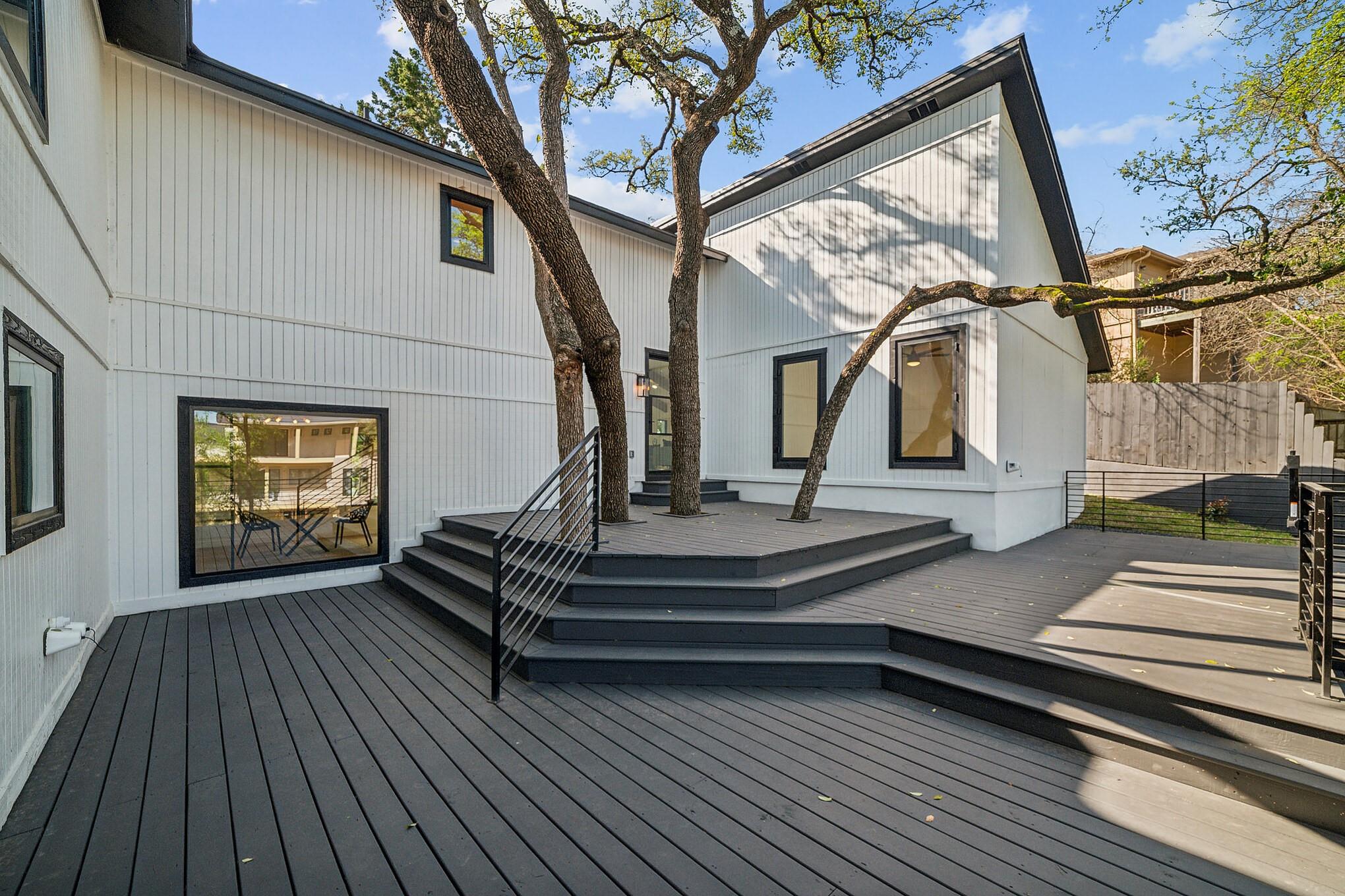 Generous .27-acre lot in close-in Eanes, this split-level home is a standout for modern living with its custom upgrades and 4 bedrooms +office and 3 bathrooms spread across 3,485 sqft.Close to Downtown,coffee shops,dining,farmers market,and walking distance to acclaimed Eanes ISD schools.Recent upgrades have transformed the home,including:new roof,windows,water heater,and 3 new HVAC systems,all new doors,all new White Oak plank flooring,all trim,deck,bathrooms,cabinets,appliances,a black marble fireplace,cedar wrapped beams,new,modern office with metal and glass wall system,built-in shelving and visually striking dual color kitchen cabinets.The exterior limestone finish has been revitalized with a mortar wash and has been freshly painted.
