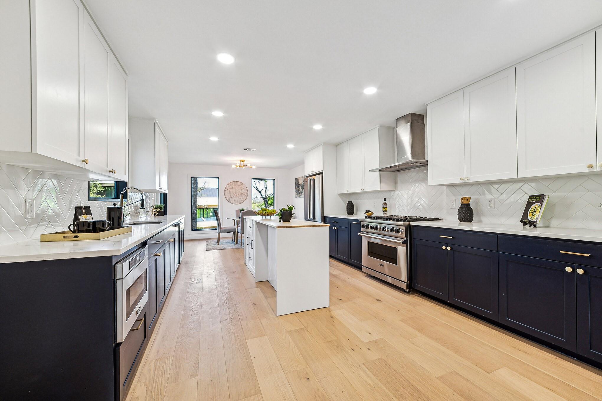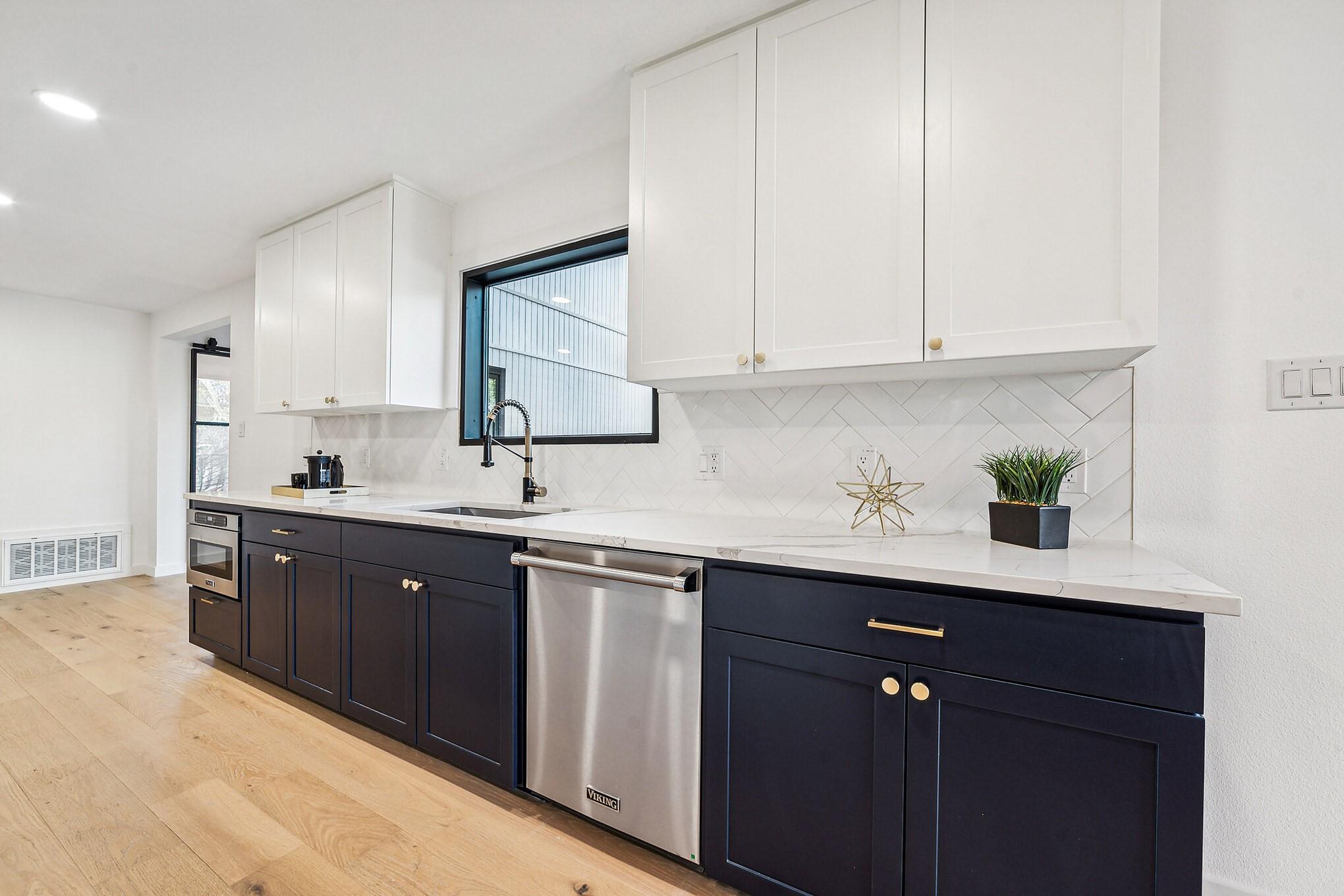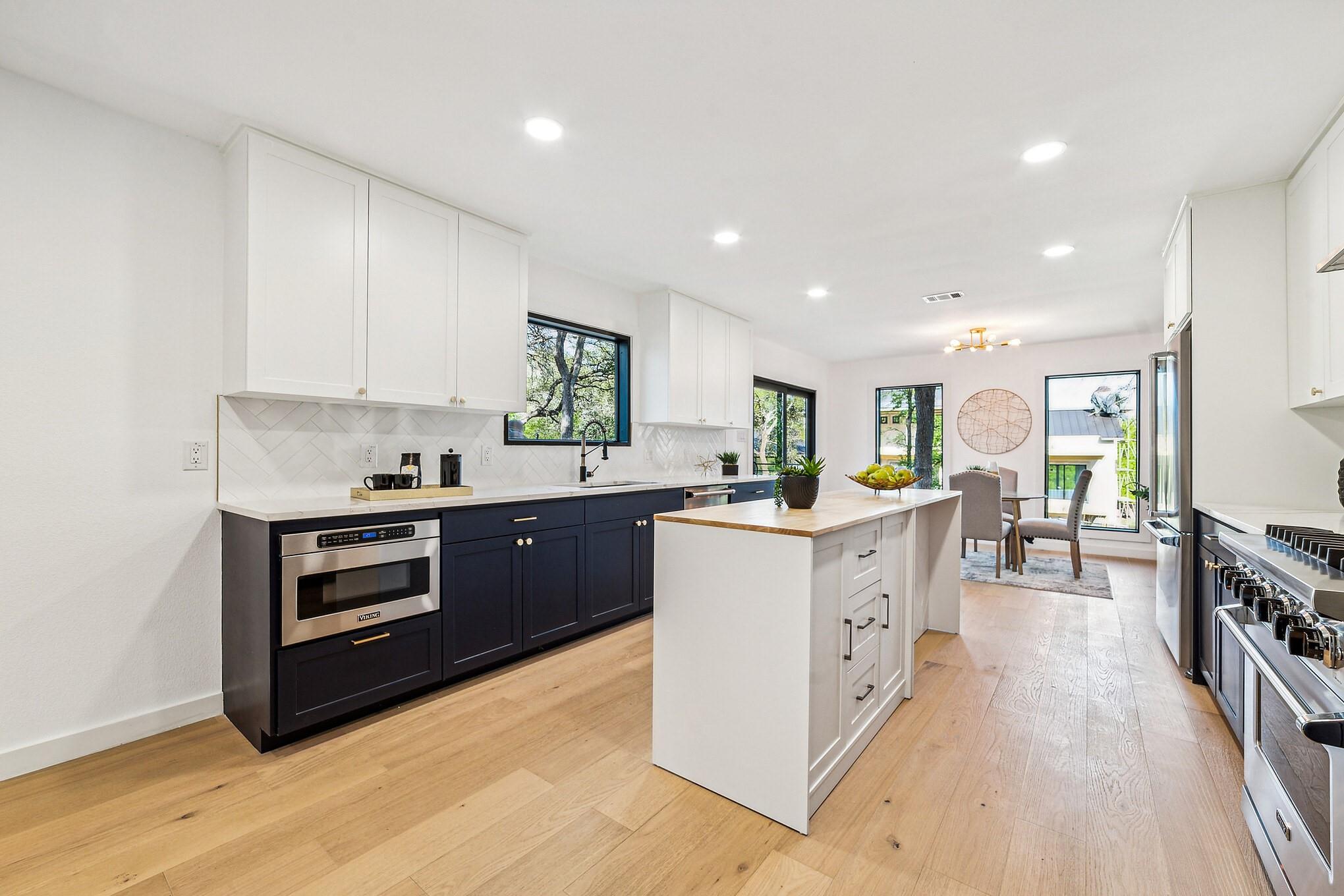 Interior is filled with light,highlighting the highly functional floor plan.Main-level guest room with updated ensuite bathroom and walk-in shower.Spacious Chef's kitchen showcases high end Viking appliances,stunning Quartz countertops,Herringbone pattern subway tile backsplash,breakfast area and center island.