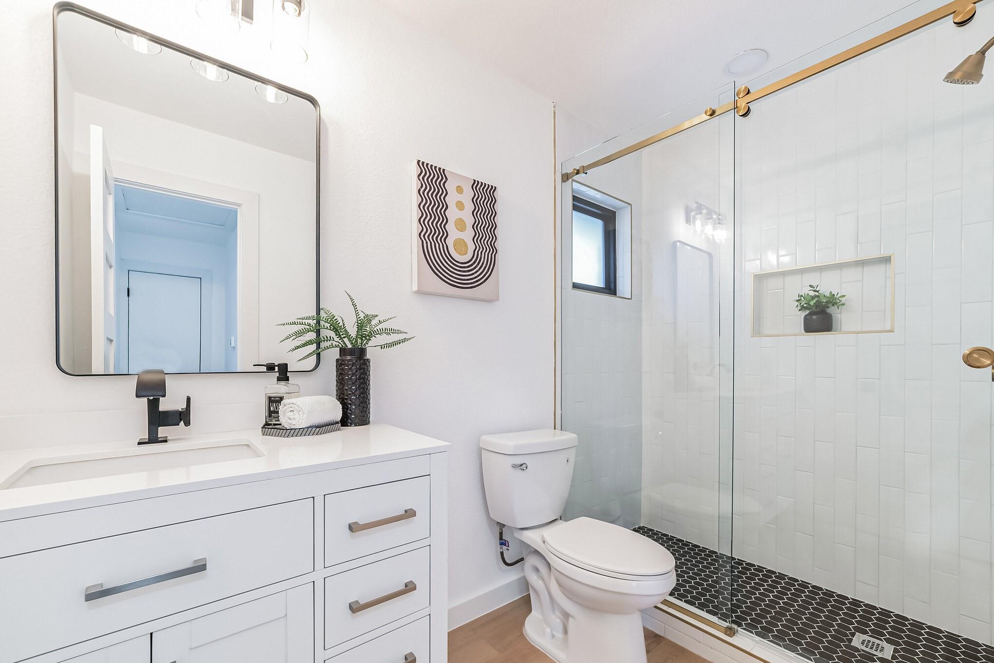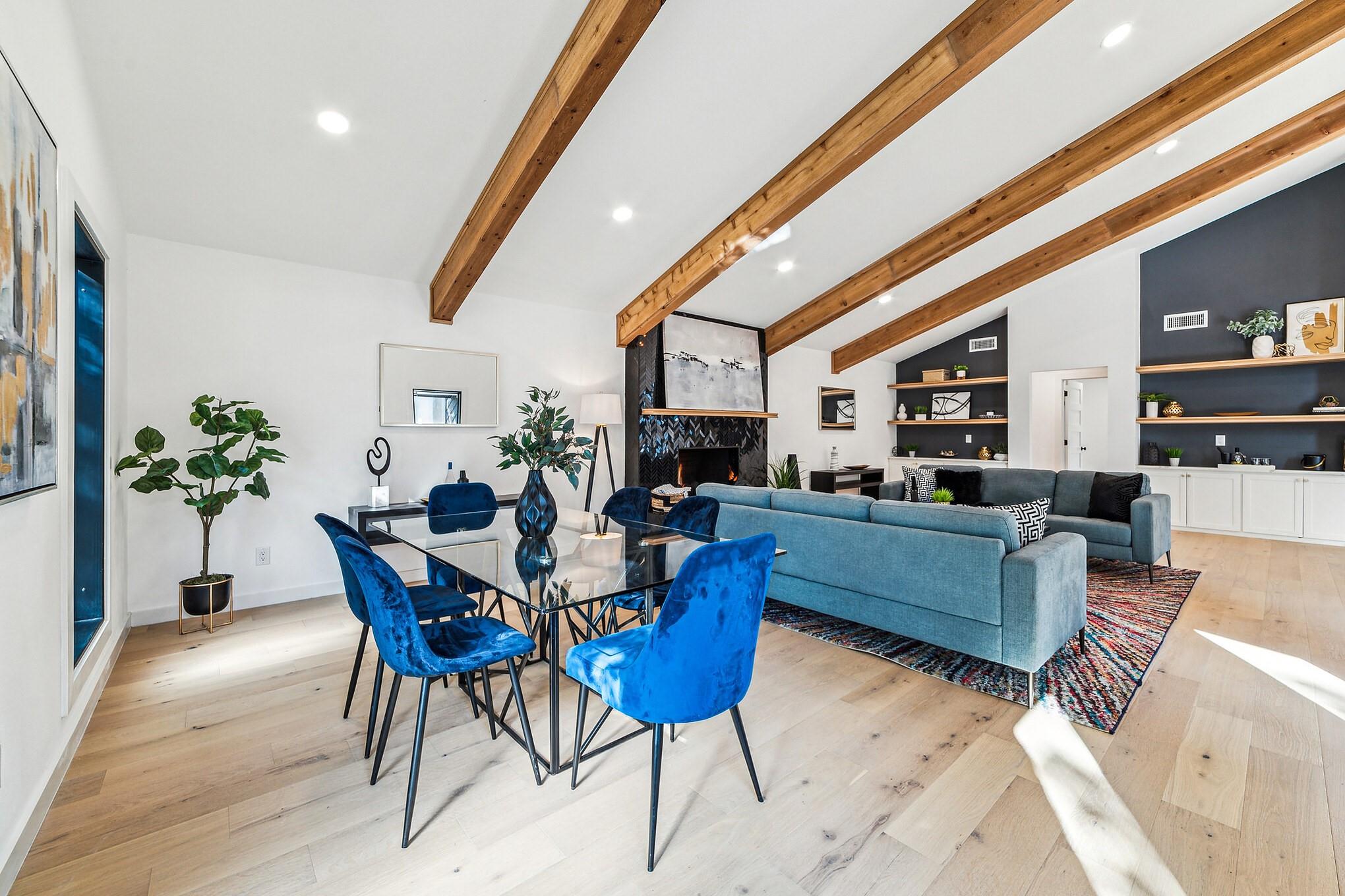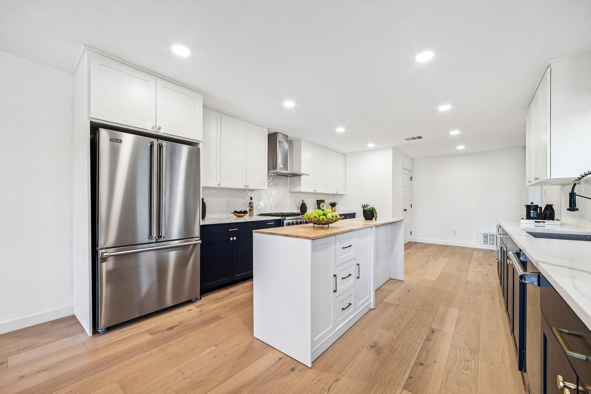 Interior is filled with light,highlighting the highly functional floor plan.Main-level guest room with updated ensuite bathroom and walk-in shower.Spacious Chef's kitchen showcases high end Viking appliances,stunning Quartz countertops,Herringbone pattern subway tile backsplash,breakfast area and center island.