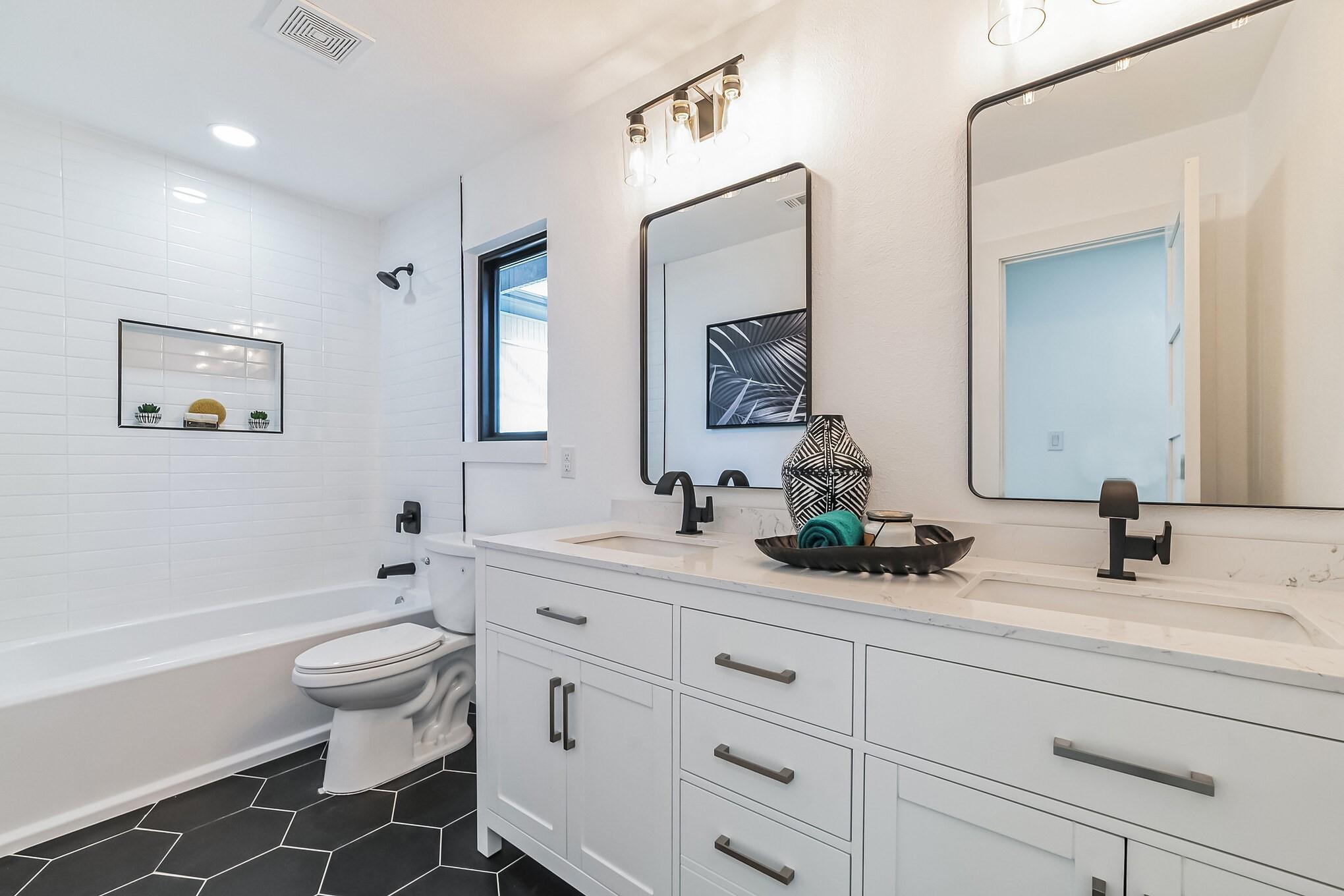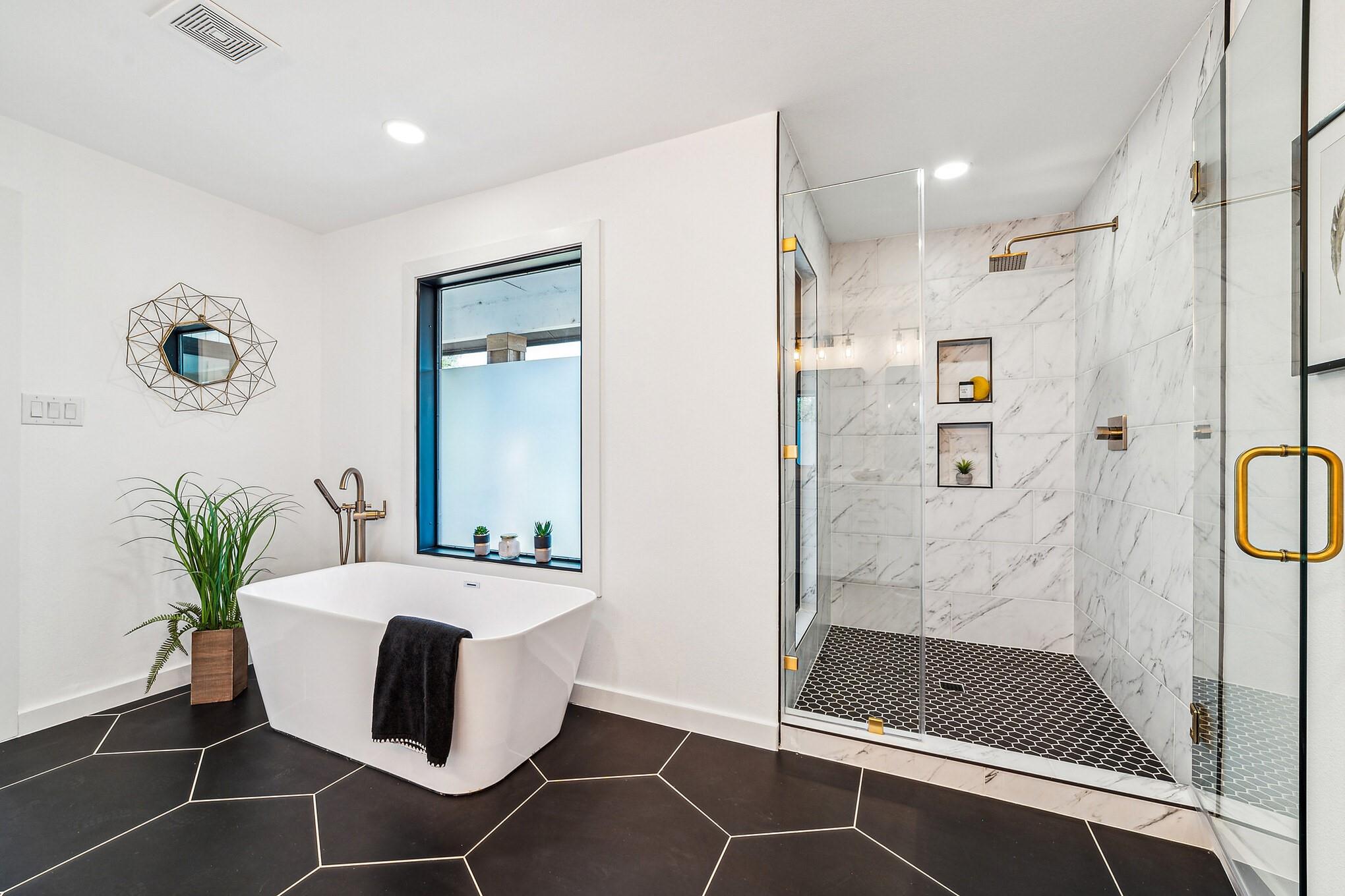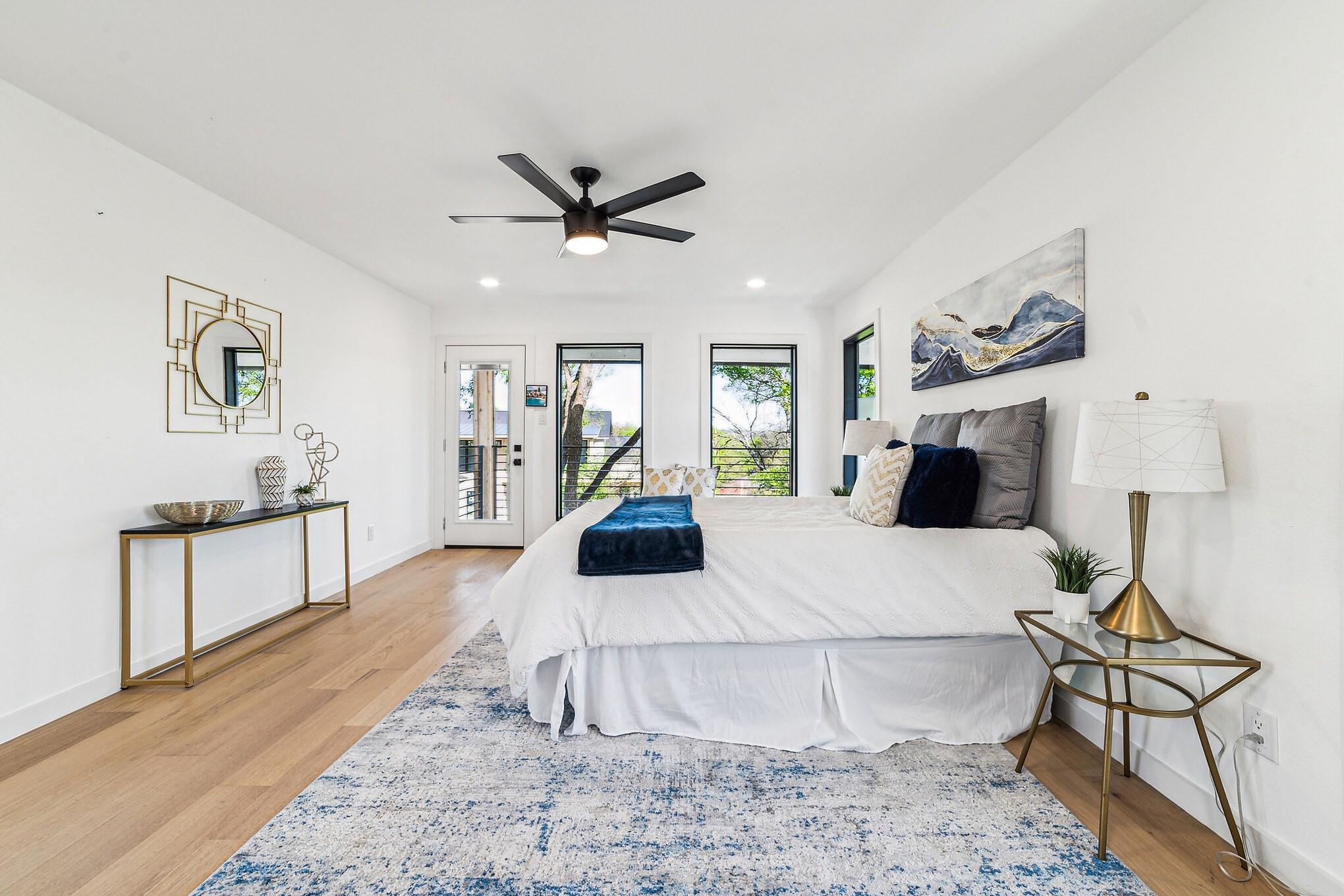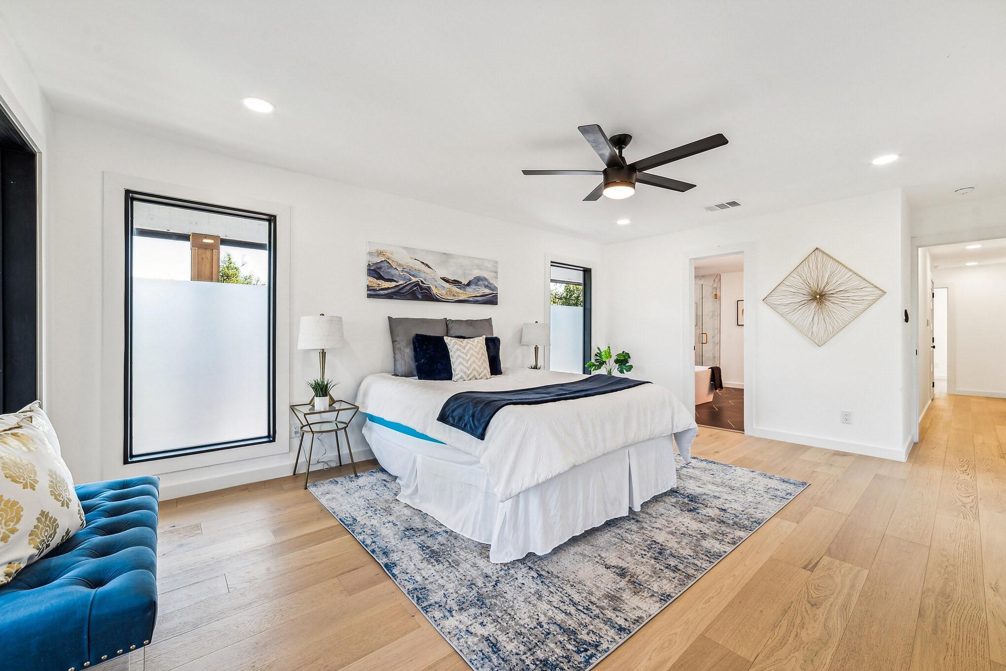 Second story houses two more secondary bedrooms,a full bathroom,and private primary suite.This suite features a soaking tub,walk-in shower,dual vanities,a large closet,and a balcony overlooking the backyard,offering a peaceful retreat.