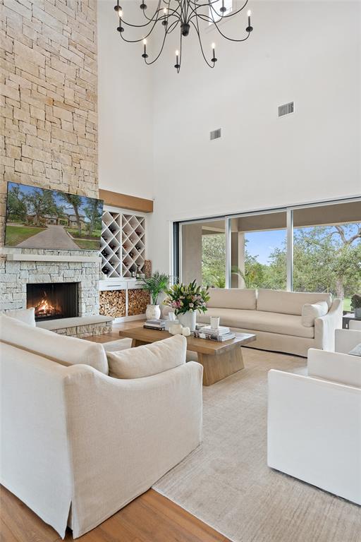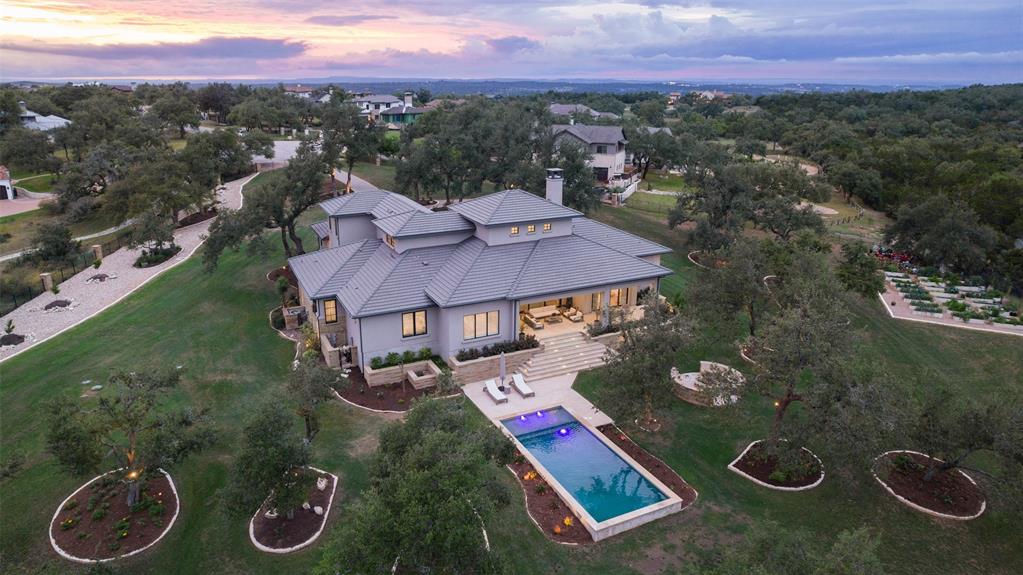 Welcome to 18001 Glenville Cove. The epitome of Texas Hill Country living. This magnificent custom built is remarkable in every detail. In this peaceful setting, this home sits on 2.33 acres on one of the best lots in Belvedere with HOA green space on one side and High game fence acreage to the rear of the homesite. When you enter this secluded 5026 sqft sprawling estate you will find a captivating open floor plan with soaring ceilings and floor to ceiling sliding doors that fill the home with natural light. The gourmet kitchen has custom Tuscany Viking edition oven. The private primary bedroom has incredible views and accessibility to the gardens and lush landscaped backyard. The primary bathroom is a spa like retreat with an inviting and spacious layout, dual vanities, a stand alone tub, walk in shower and two bright and extra spacious primary closets. On the main floor south wing of the home you will find 3 sizable guest bedrooms each with its own beautiful private bathroom. Upstairs you will find a retreat for relaxing with a media room, beverage fridge, along with a 5th full bath. Bring the outdoors in and open up the massive sliding glass door to the expansive patio. Enjoy the abundance of mature oak tree lined backyard view with a gorgeous pool, custom built bbq/fire pit area, and lavish fruitful gardens. Bring your prized cars side by side, or water toys for this spacious 5 car, air conditioned garages. This fully fenced and gated property is perfectly secured for families and pets along with a water filter system, CCTV security system, full irrigation, control 4 system with sound system throughout the home, patio and gym as well as full house plantation shutters. Belvedere is an award winning community with 80 acres of nature preserves, fishing ponds and a community center with lazy river pool, splash pad, and sports court. Convenient to shopping and dining in Bee Cave, Lakeway, Dripping Springs. Low tax rates and sought after Lake Travis ISD.