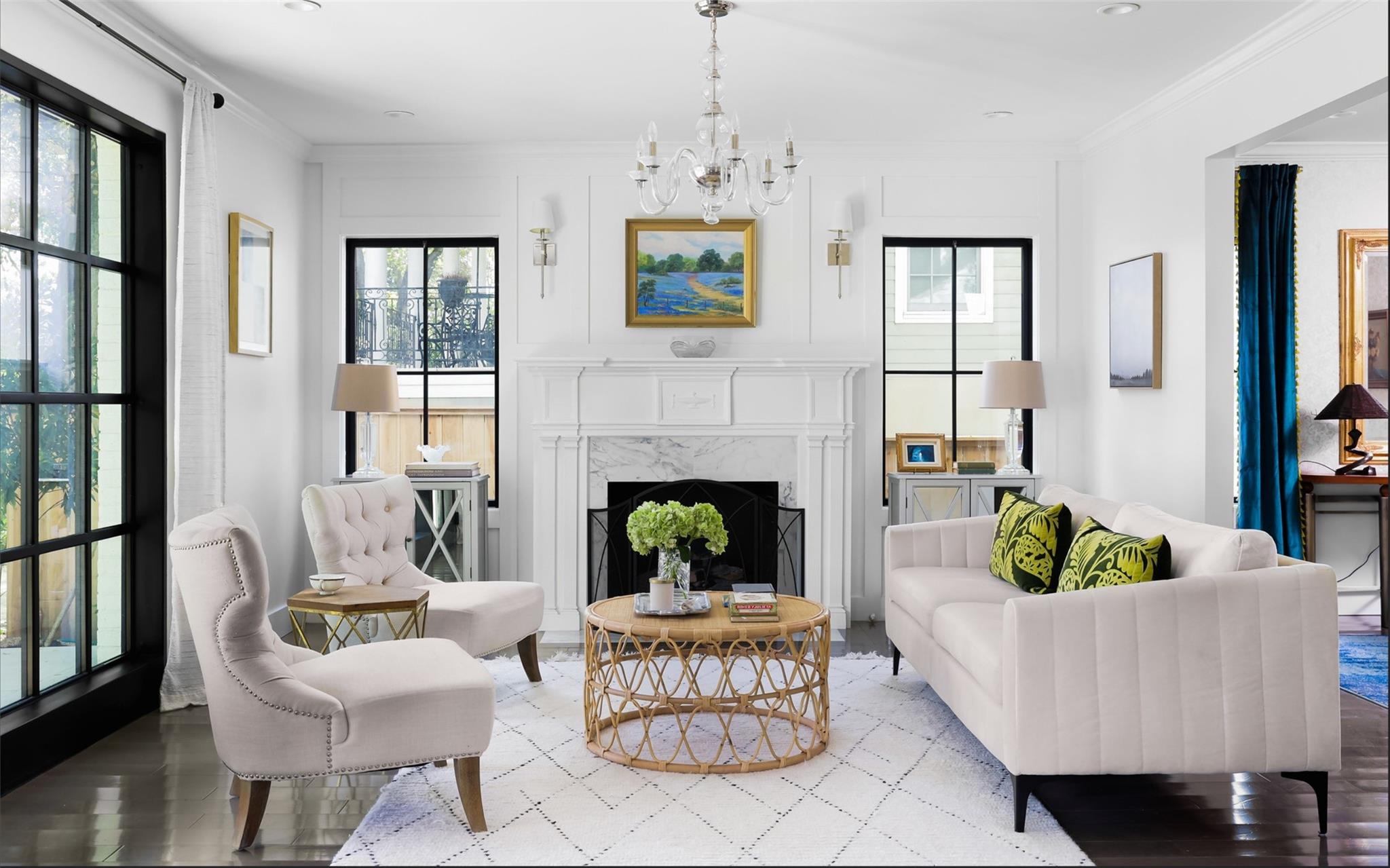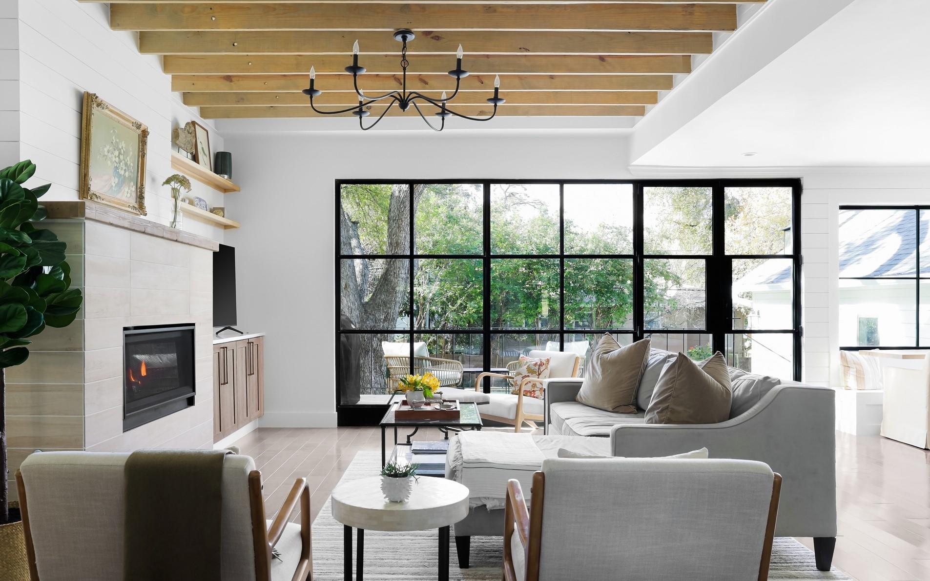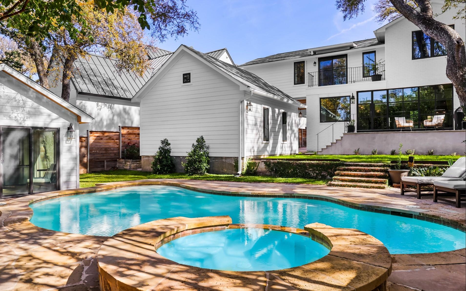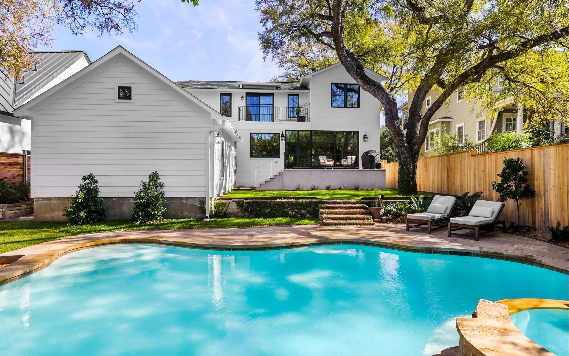 Generously set back on a distinguished tree-lined street, this elegant home offers quiet luxury in the heart of Tarrytown. Beautifully remodeled and added onto in 2021, it features updated plumbing, electrical and mechanical systems, as well as all-new interior and exterior finishes. Expansive steel windows and doors and an open floor plan create a light-filled and abundant space for entertaining and everyday living. Guests are greeted in the gracious foyer entry, with grand staircase and formal living and dining areas. The stylish kitchen features marble backsplash and countertops, Thermador appliances, dining banquette, butler's pantry and mudroom. The adjoining living room features exposed beams, gas fireplace, an elegant bar area and glass doors leading out to a limestone patio overlooking the pool. Upstairs are four bedrooms, each with en-suite bathrooms, including a fantastic primary suite, with vaulted ceiling, living area and a spa-like primary bath with white marble, double shower, and freestanding soaking tub. The lush backyard features a pool, spa, and a heated and cooled detached pool house, which can be used as an office, guest space, studio or entertaining.
