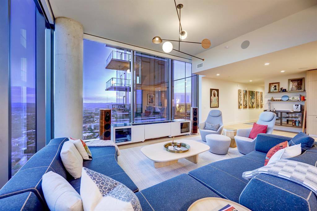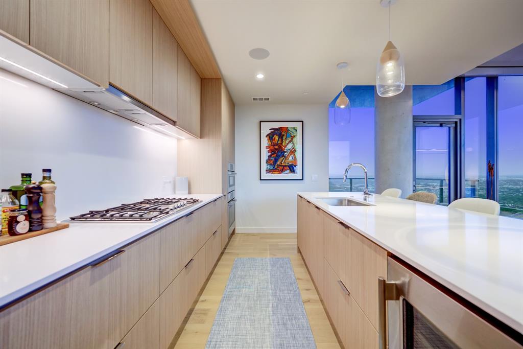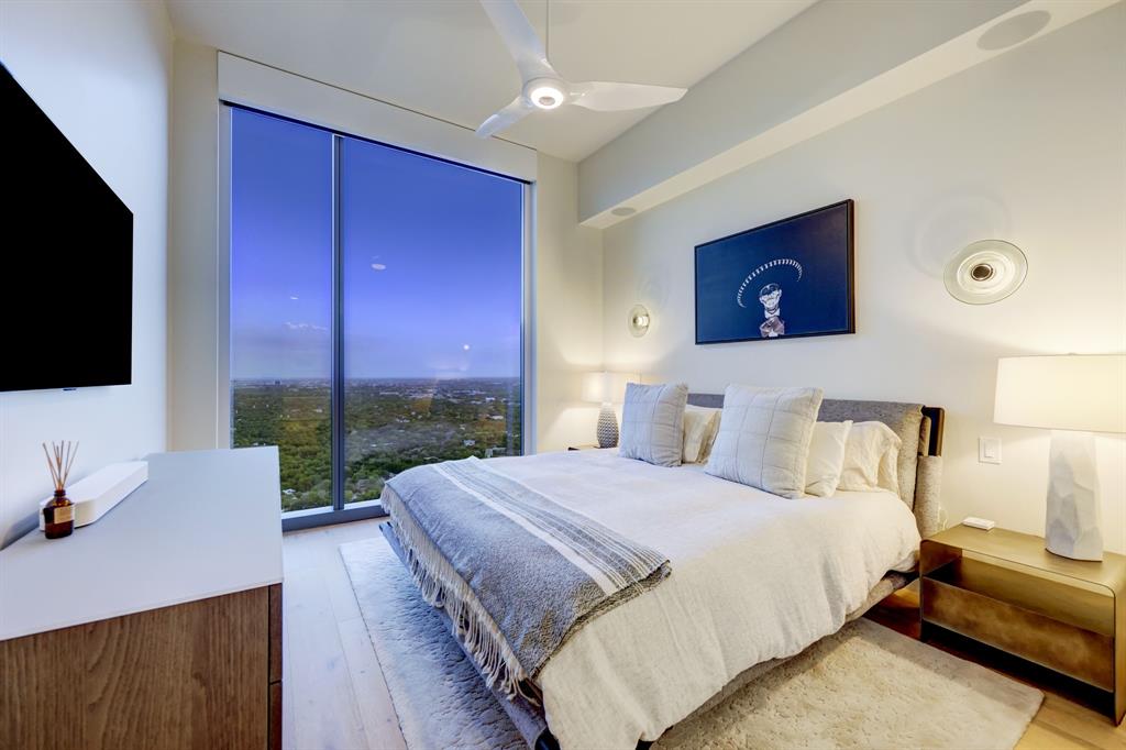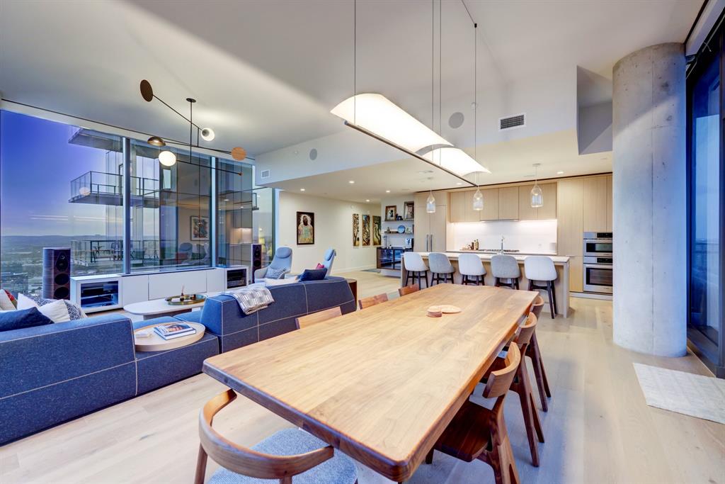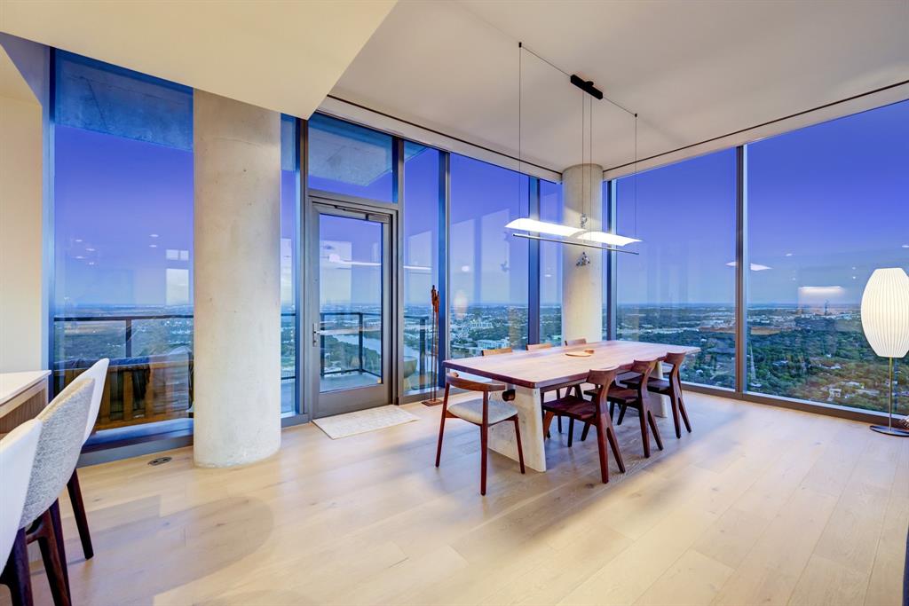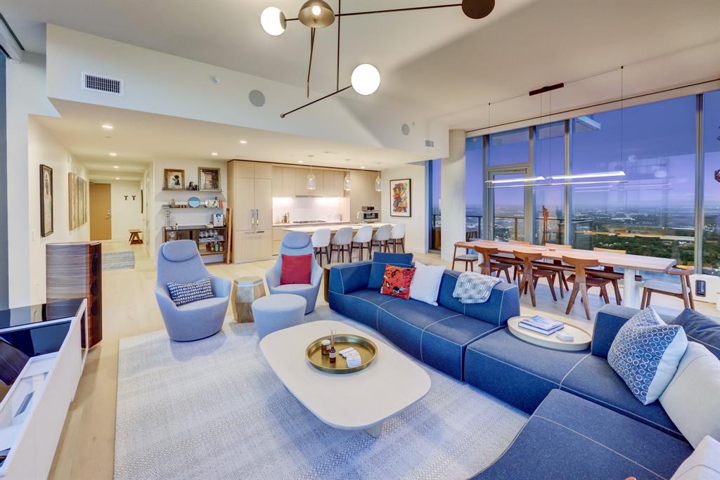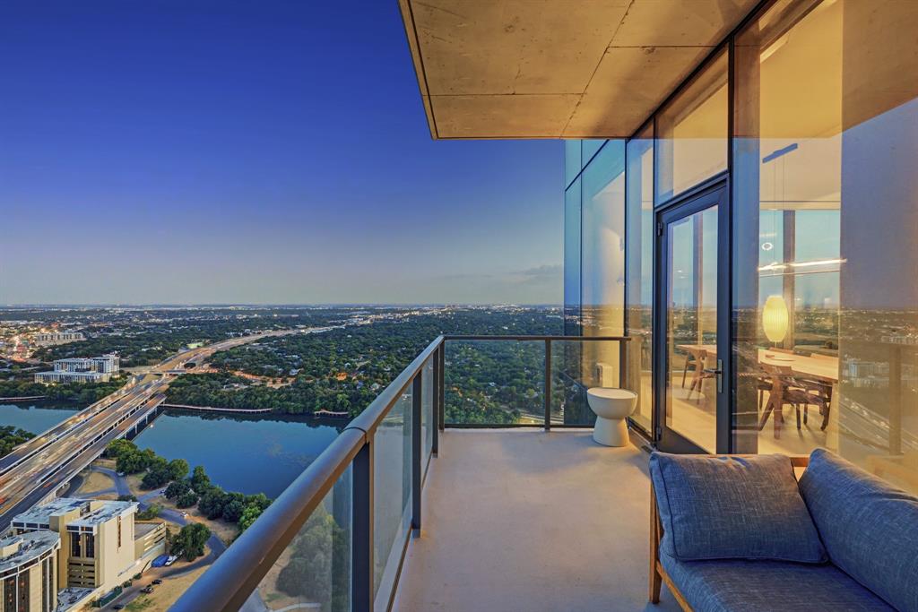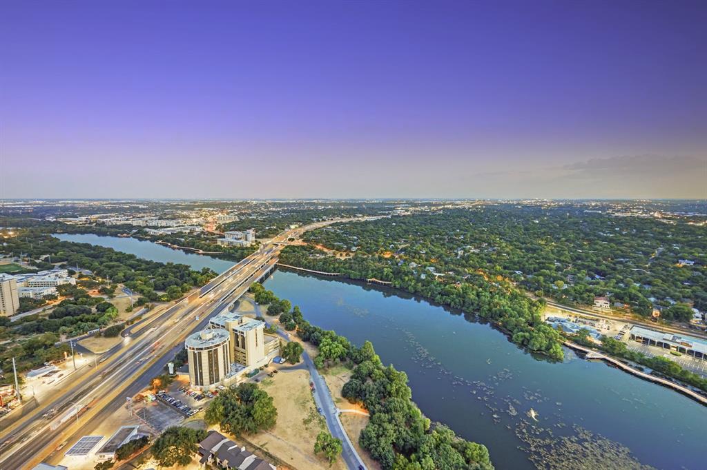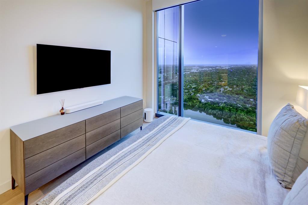 Luxurious urban living meets the vibrant heart of Austin in this exquisite 3 bedroom condo at 44 East Ave. Nestled at the quieter end of Rainey St on the shores of Lady Bird Lake, this prime location steps away from the city's renowned hike and bike trail. Filled with natural light from three sides of impressive 11-foot floor-to-ceiling windows, the living room offers a stunning 180-degree panorama of Lady Bird Lake's glistening waters. The kitchen seamlessly merges with the living area, showcasing the elegant design that revolves around an expansive kitchen island. This culinary haven boasts Italian cabinetry with soft-close cabinets, sleek quartz countertops, top-of-the-line Bosch appliances, including a paneled dishwasher & a built-in refrigerator, and an under-counter Thermador wine fridge. The spacious primary suite features a custom walk-in closet adorned with custom lighting and the adjoining bathroom exudes luxury with dual vanity sinks, a free-standing soaking tub, and a frameless glass shower. Other high-end finishes include white oak hardwood floors, custom designer wallpaper, Italian custom closet upgrades, built-ins and more. Smart full home technology including automated solar shades, lighting, door locks, video door bell, and integrated Sonos audio system in every room. Perched on the 44th floor, this residence affords the rare privilege of relishing both breathtaking sunrises and awe-inspiring sunsets over Lady Bird Lake. Residence 4406 includes 2 parking spaces with a rare EV charger. The building offers an array of exceptional amenities that encompass 13,000 square feet of communal spaces on the 11th and 37th floors. Amenities include a 24-hour concierge, cenote-style pool, an inviting outdoor lounge complete with gas grills, an outdoor dog park and a dog lounge with a spa, a state-of-the-art fitness center, a yoga studio, conference rooms, a great room adorned with TVs, a caterer's kitchen, and two well-appointed guest suites.