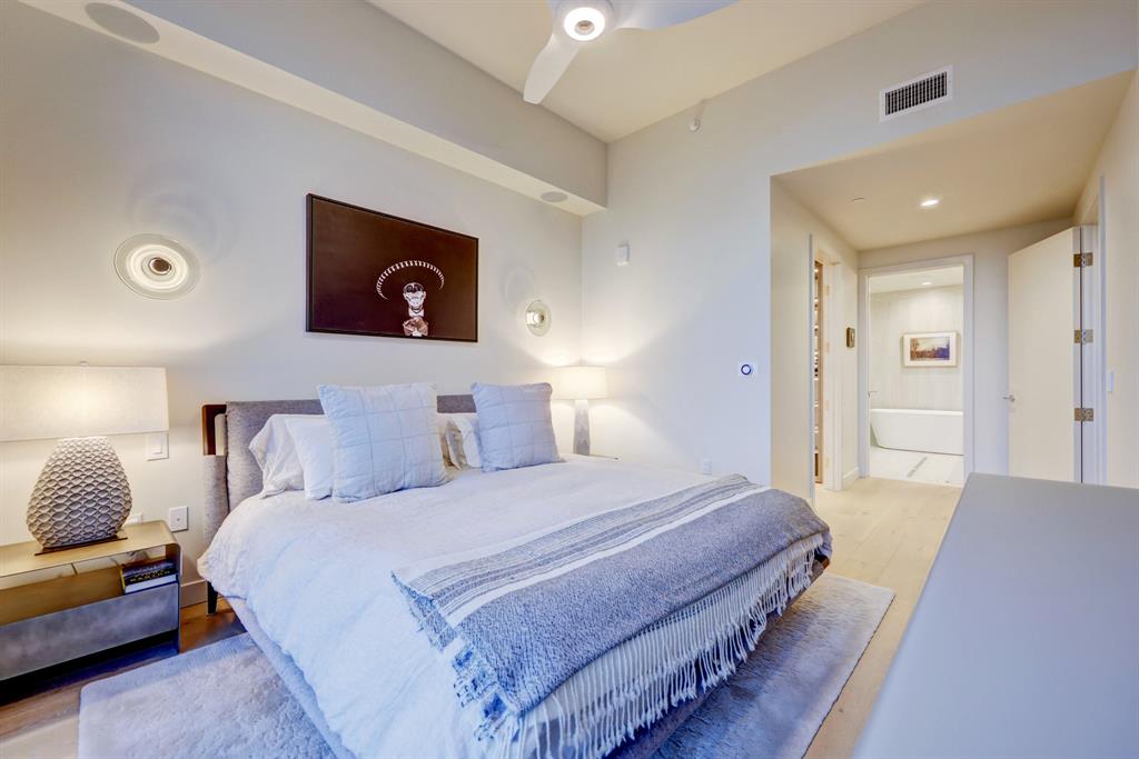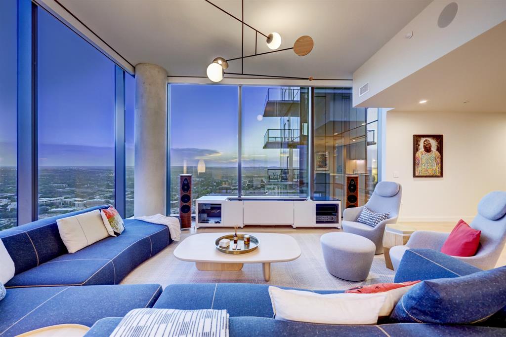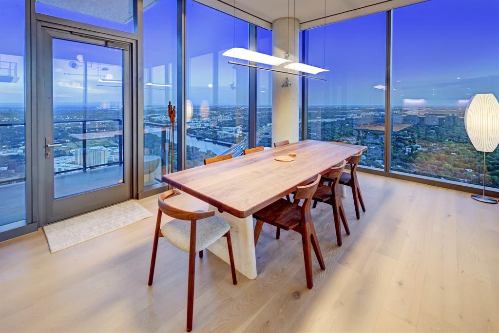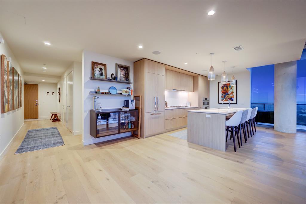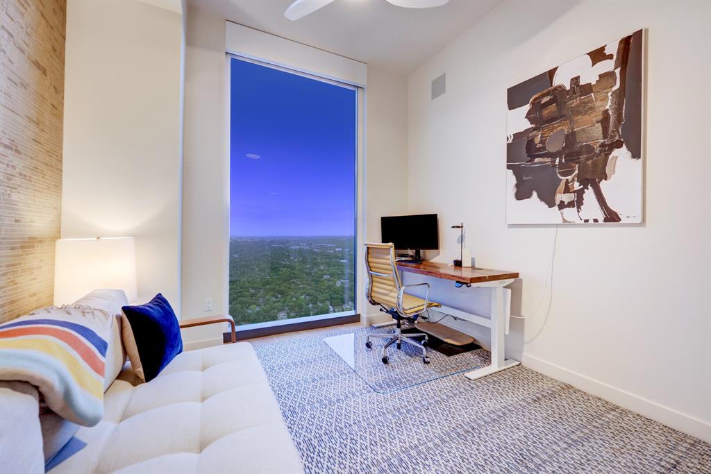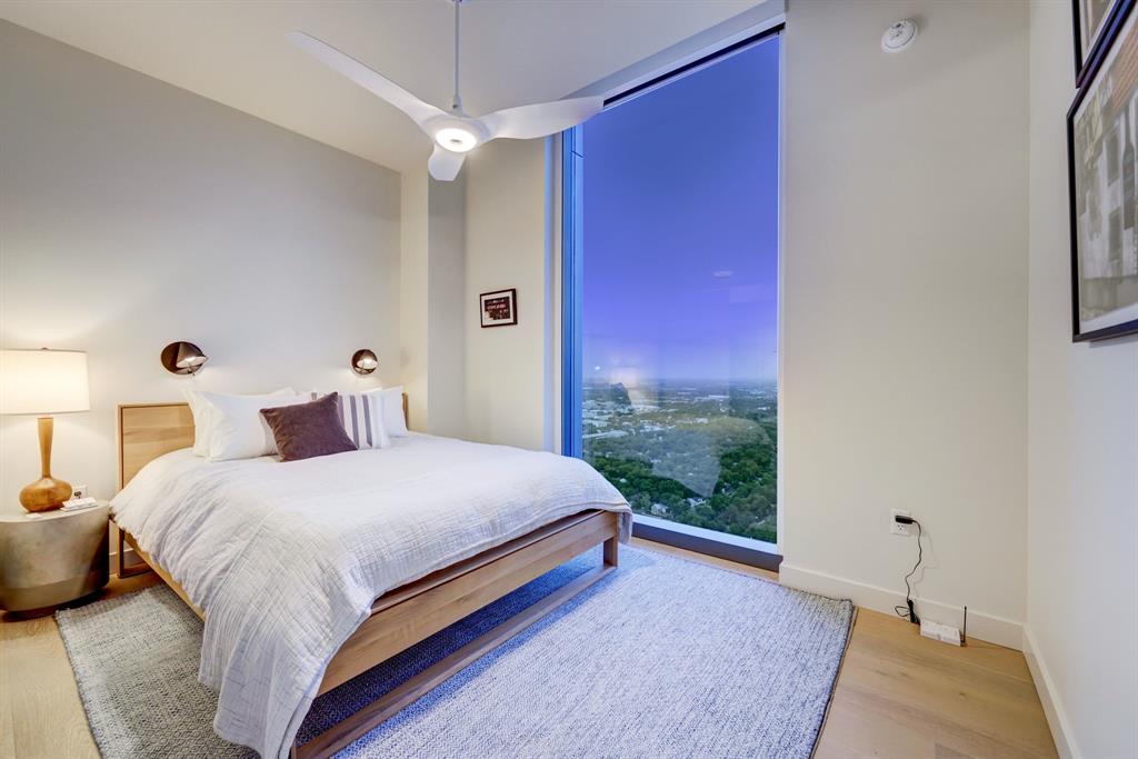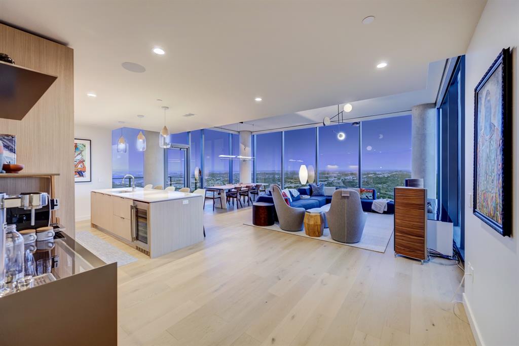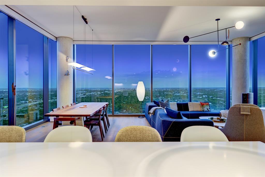 Luxurious urban living meets the vibrant heart of Austin in this exquisite 3 bedroom condo at 44 East Ave. Nestled at the quieter end of Rainey St on the shores of Lady Bird Lake, this prime location steps away from the city's renowned hike and bike trail. Filled with natural light from three sides of impressive 11-foot floor-to-ceiling windows, the living room offers a stunning 180-degree panorama of Lady Bird Lake's glistening waters. The kitchen seamlessly merges with the living area, showcasing the elegant design that revolves around an expansive kitchen island. This culinary haven boasts Italian cabinetry with soft-close cabinets, sleek quartz countertops, top-of-the-line Bosch appliances, including a paneled dishwasher & a built-in refrigerator, and an under-counter Thermador wine fridge. The spacious primary suite features a custom walk-in closet adorned with custom lighting and the adjoining bathroom exudes luxury with dual vanity sinks, a free-standing soaking tub, and a frameless glass shower. Other high-end finishes include white oak hardwood floors, custom designer wallpaper, Italian custom closet upgrades, built-ins and more. Smart full home technology including automated solar shades, lighting, door locks, video door bell, and integrated Sonos audio system in every room. Perched on the 44th floor, this residence affords the rare privilege of relishing both breathtaking sunrises and awe-inspiring sunsets over Lady Bird Lake. Residence 4406 includes 2 parking spaces with a rare EV charger. The building offers an array of exceptional amenities that encompass 13,000 square feet of communal spaces on the 11th and 37th floors. Amenities include a 24-hour concierge, cenote-style pool, an inviting outdoor lounge complete with gas grills, an outdoor dog park and a dog lounge with a spa, a state-of-the-art fitness center, a yoga studio, conference rooms, a great room adorned with TVs, a caterer's kitchen, and two well-appointed guest suites.