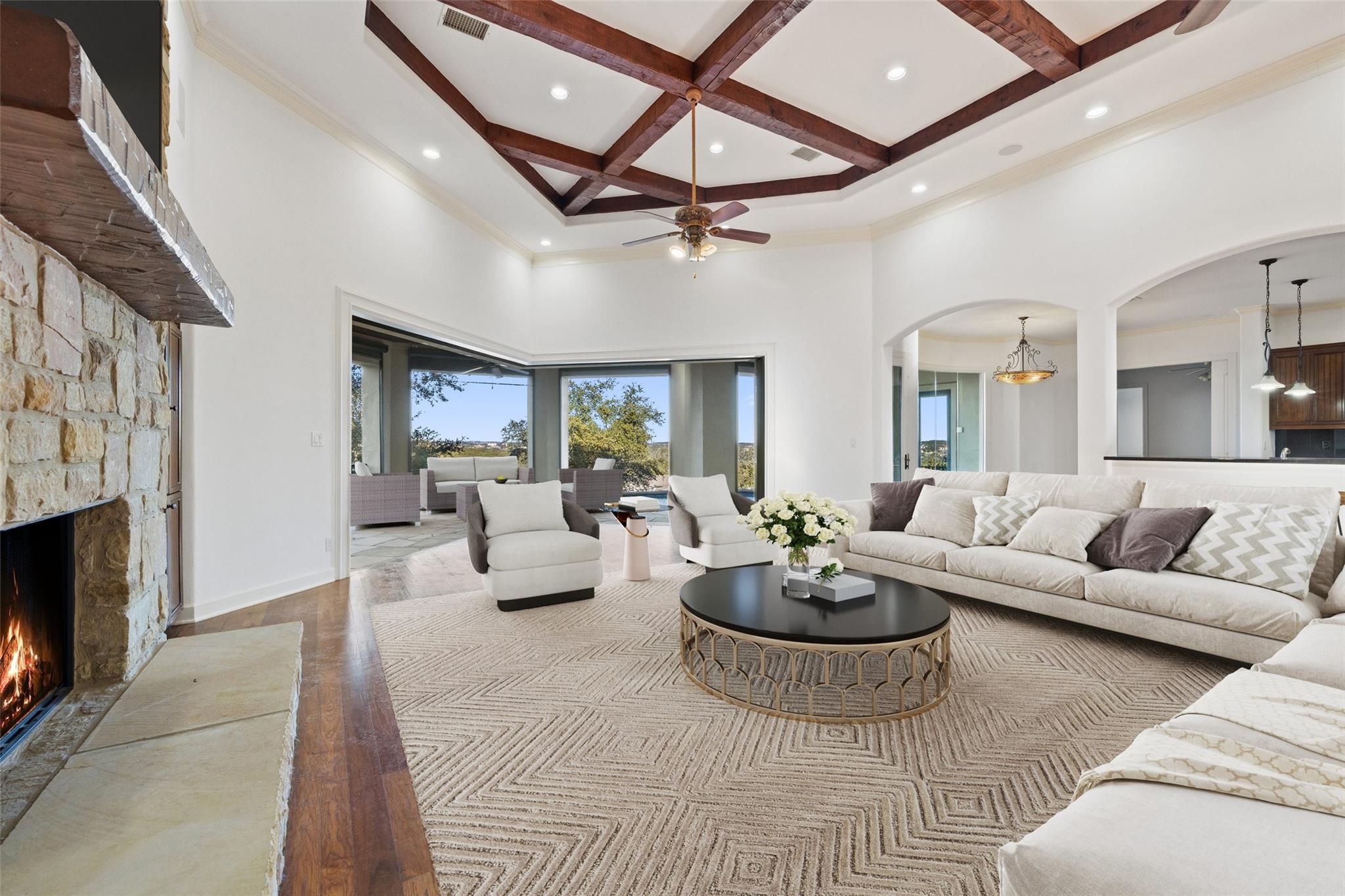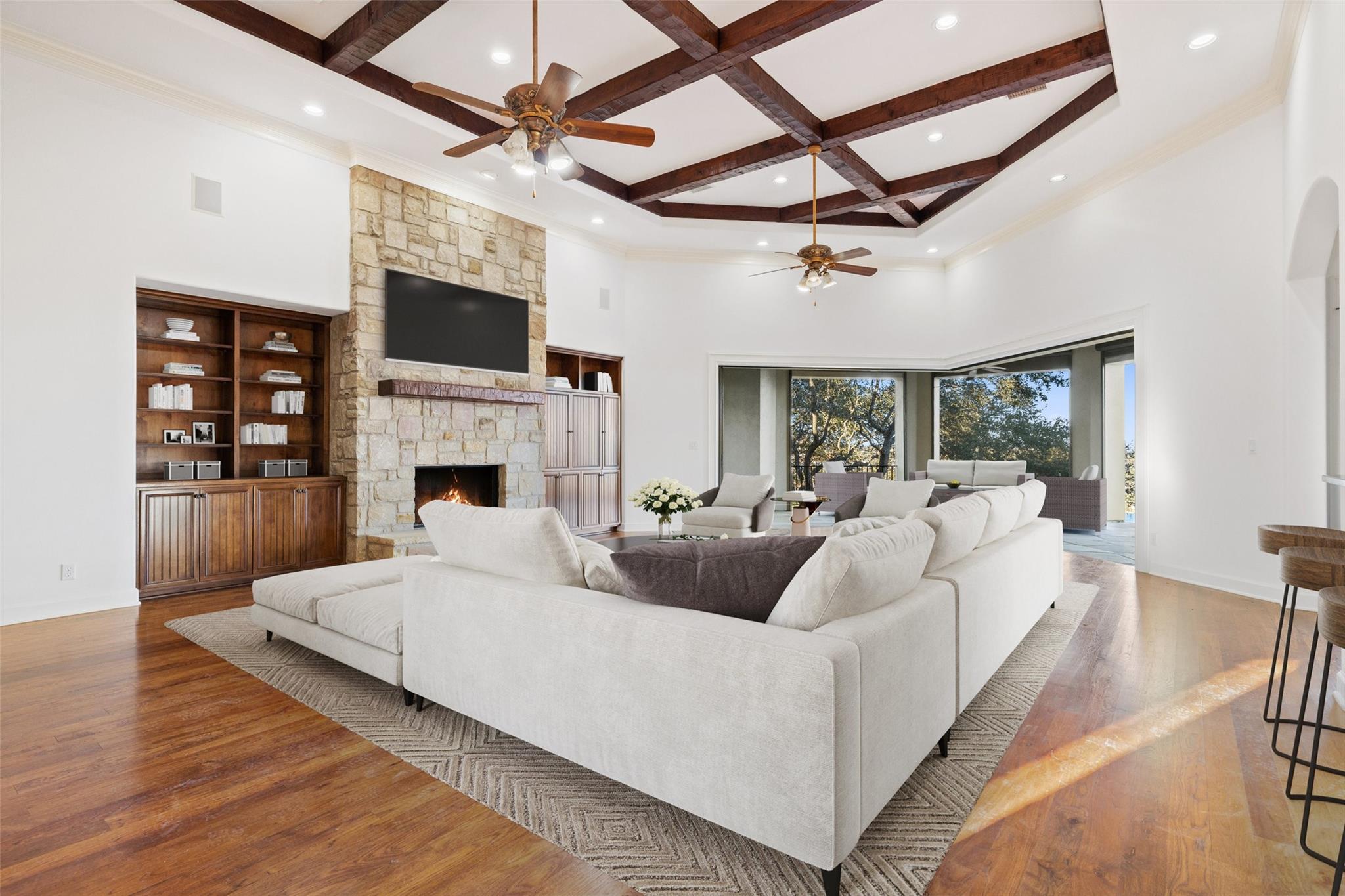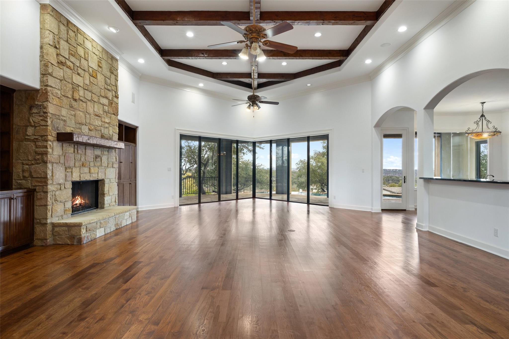 Charming one story home sitting on 0.59 acres offers Hill Country views in sought after Spanish Oaks. Upon entering the home you are met with soaring ceilings, 24 feet of glass doors, and abundant natural light. The homes open floorplan includes 4 bedrooms, 4 full bathrooms, an oversized study, flex space/gameroom, covered back patio with a pool and spa that provides some of the views that Spanish Oaks is known for. The Spanish Oaks neighborhood offers 24/7 manned gate Security, Private Spanish Oaks Golf Club/Course, Miles of Hike and Bike Trails, a fully stocked Fish Camp and Community Pool Pavilion. In addition to community amenities, Spanish Oaks is located in the Lake Travis ISD. Several private school options are within 10 miles of the community gates, as well.