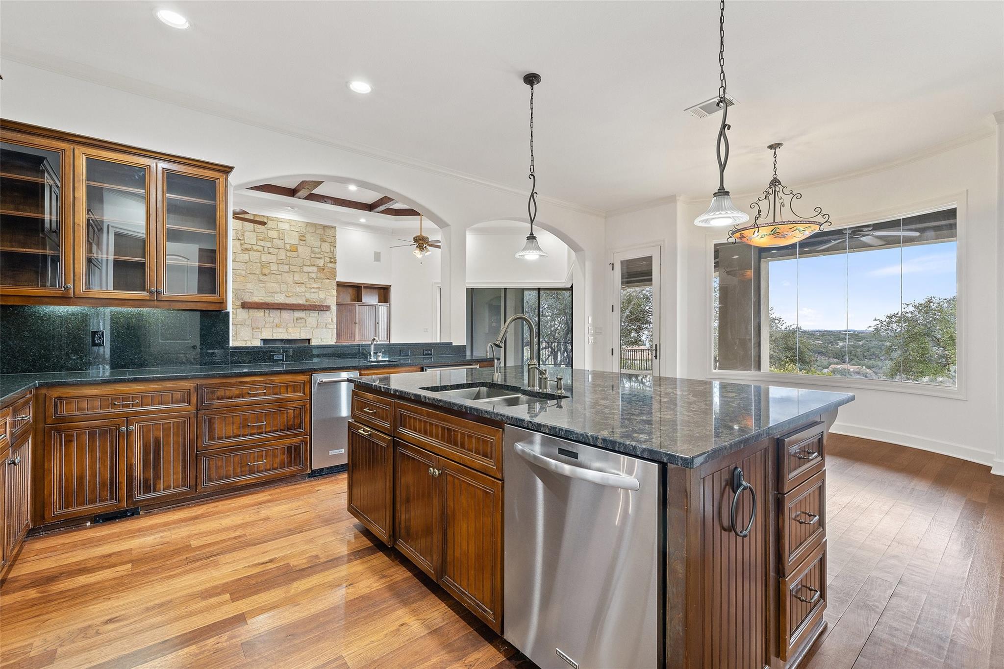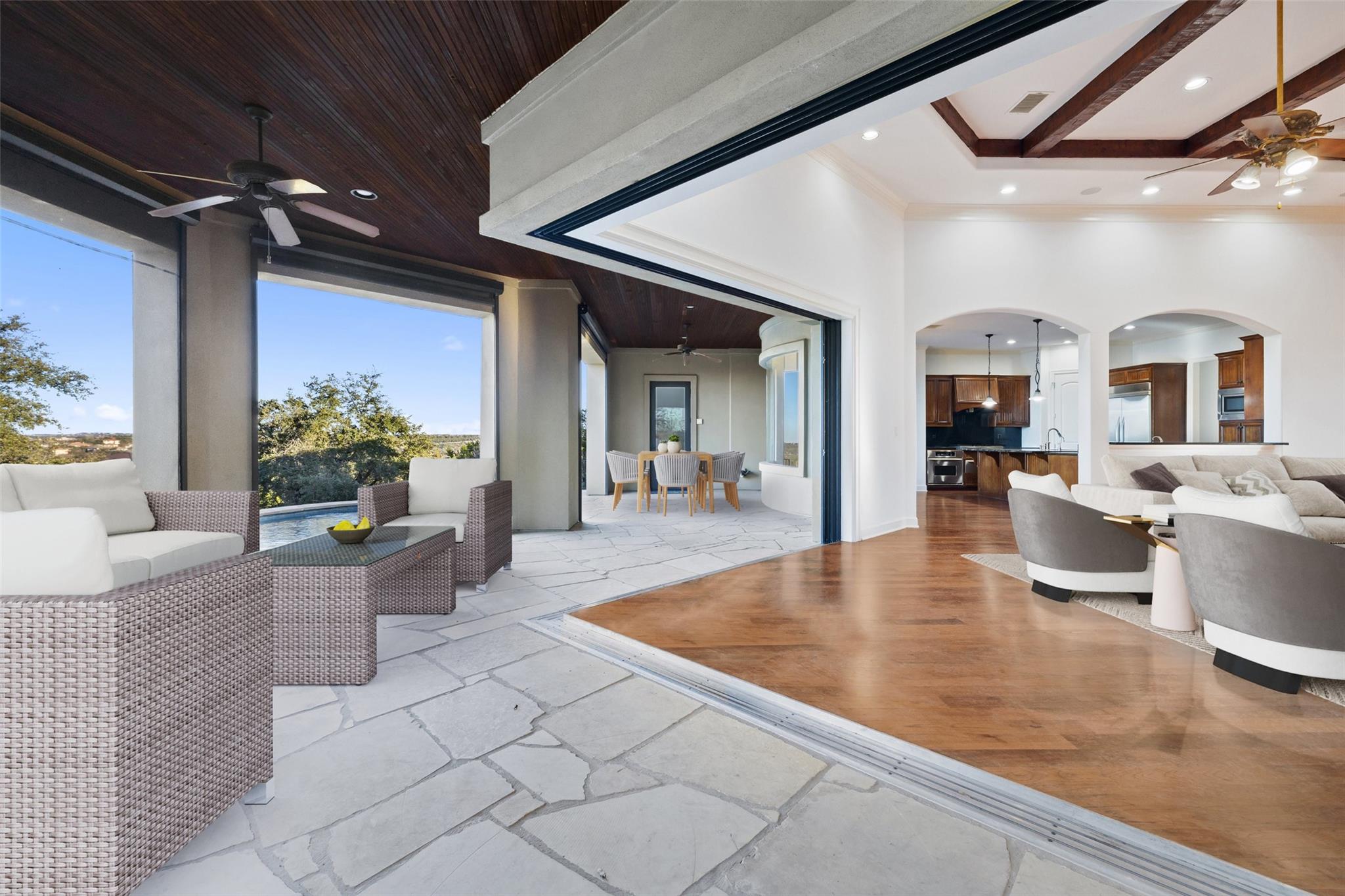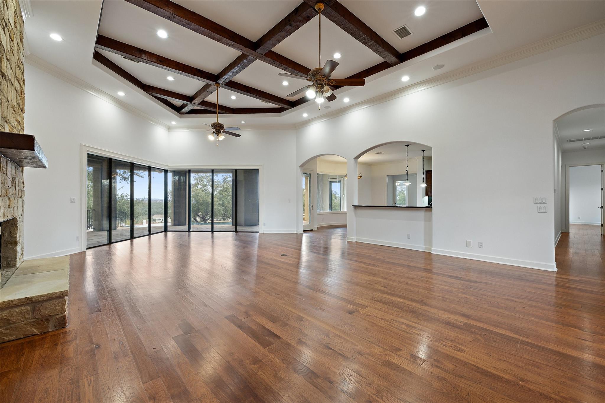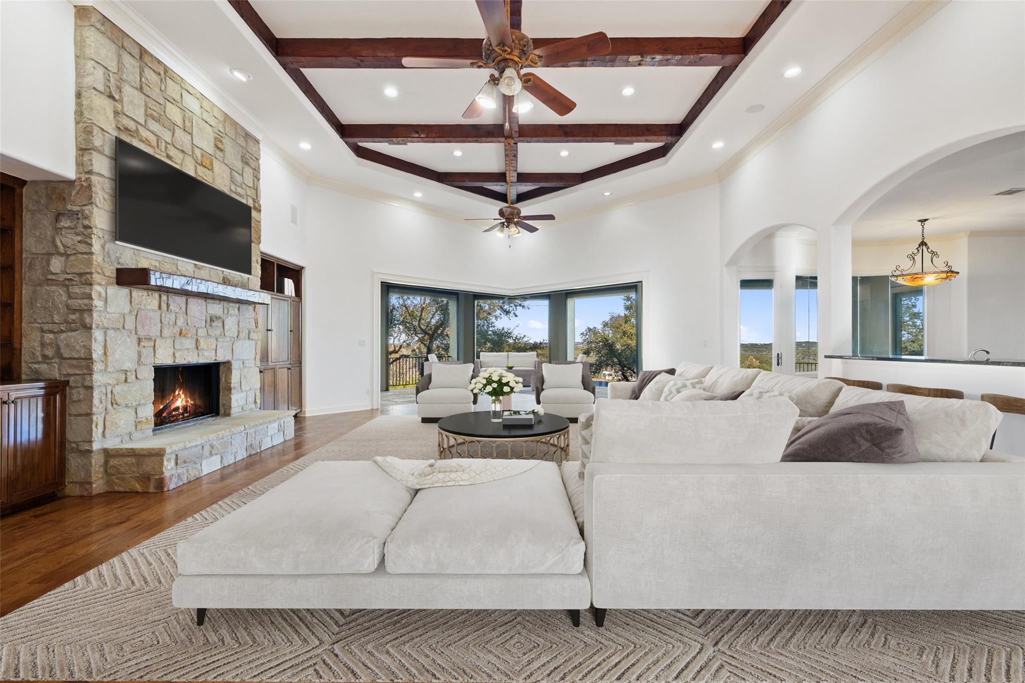Charming one story home sitting on 0.59 acres offers Hill Country views in sought after Spanish Oaks. Upon entering the home you are met with soaring ceilings, 24 feet of glass doors, and abundant natural light. The homes open floorplan includes 4 bedrooms, 4 full bathrooms, an oversized study, flex space/gameroom, covered back patio with a pool and spa that provides some of the views that Spanish Oaks is known for. The Spanish Oaks neighborhood offers 24/7 manned gate Security, Private Spanish Oaks Golf Club/Course, Miles of Hike and Bike Trails, a fully stocked Fish Camp and Community Pool Pavilion. In addition to community amenities, Spanish Oaks is located in the Lake Travis ISD. Several private school options are within 10 miles of the community gates, as well.