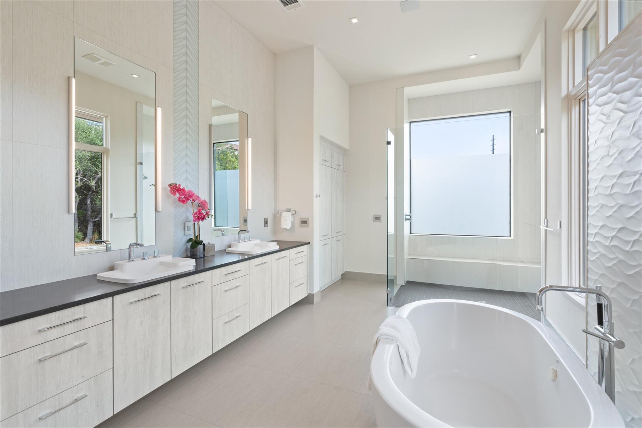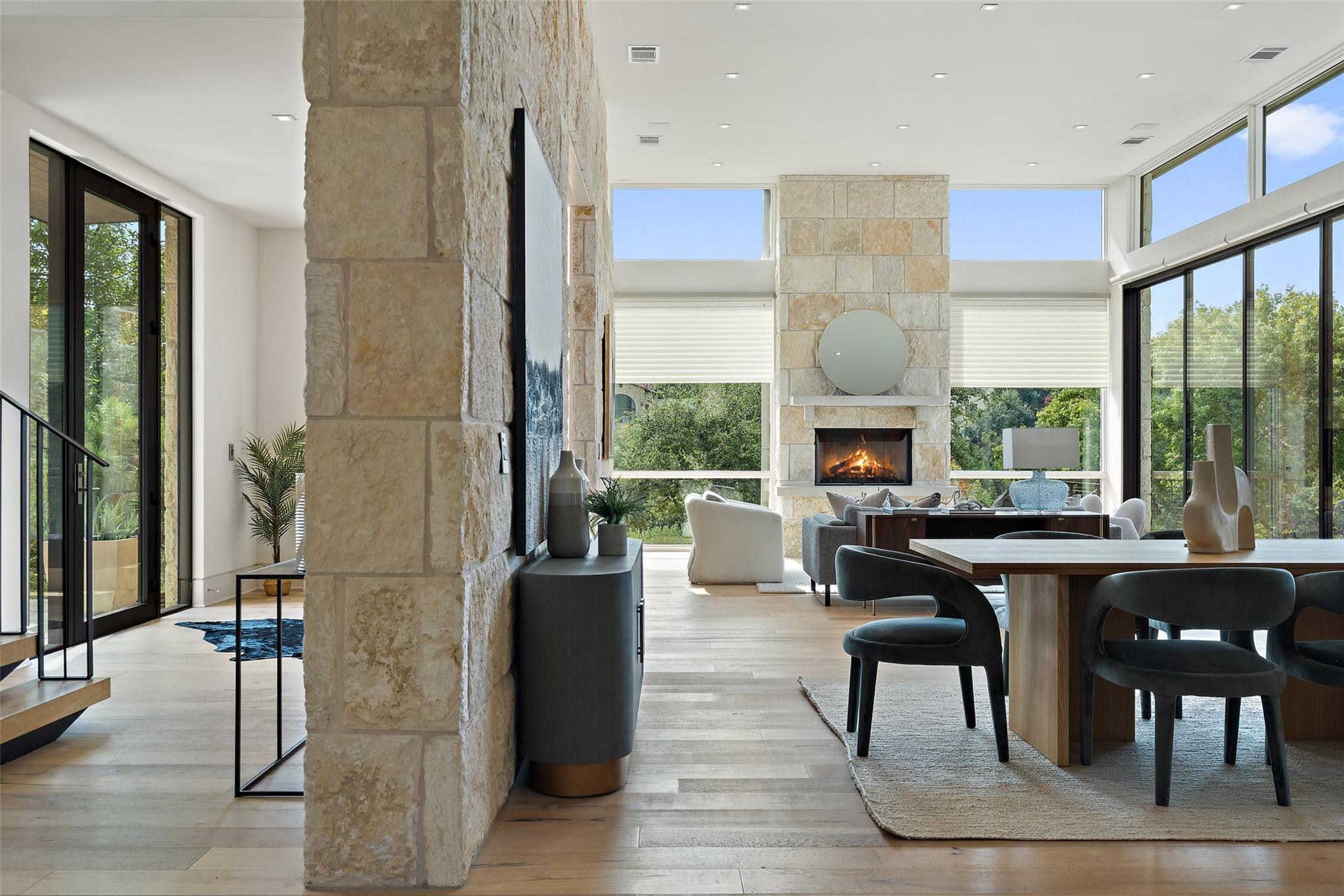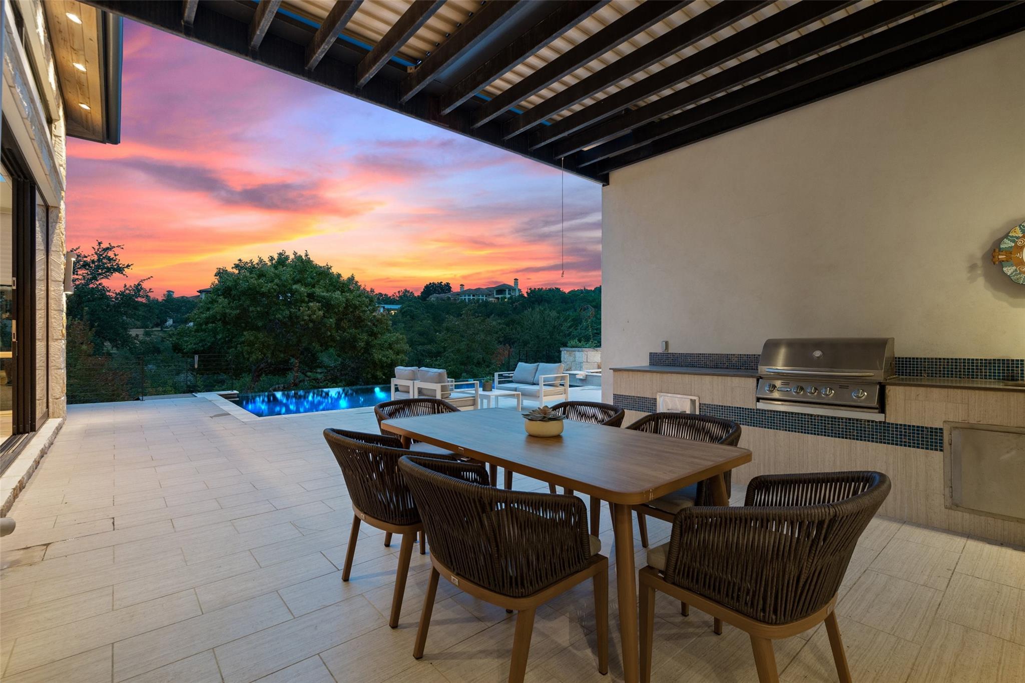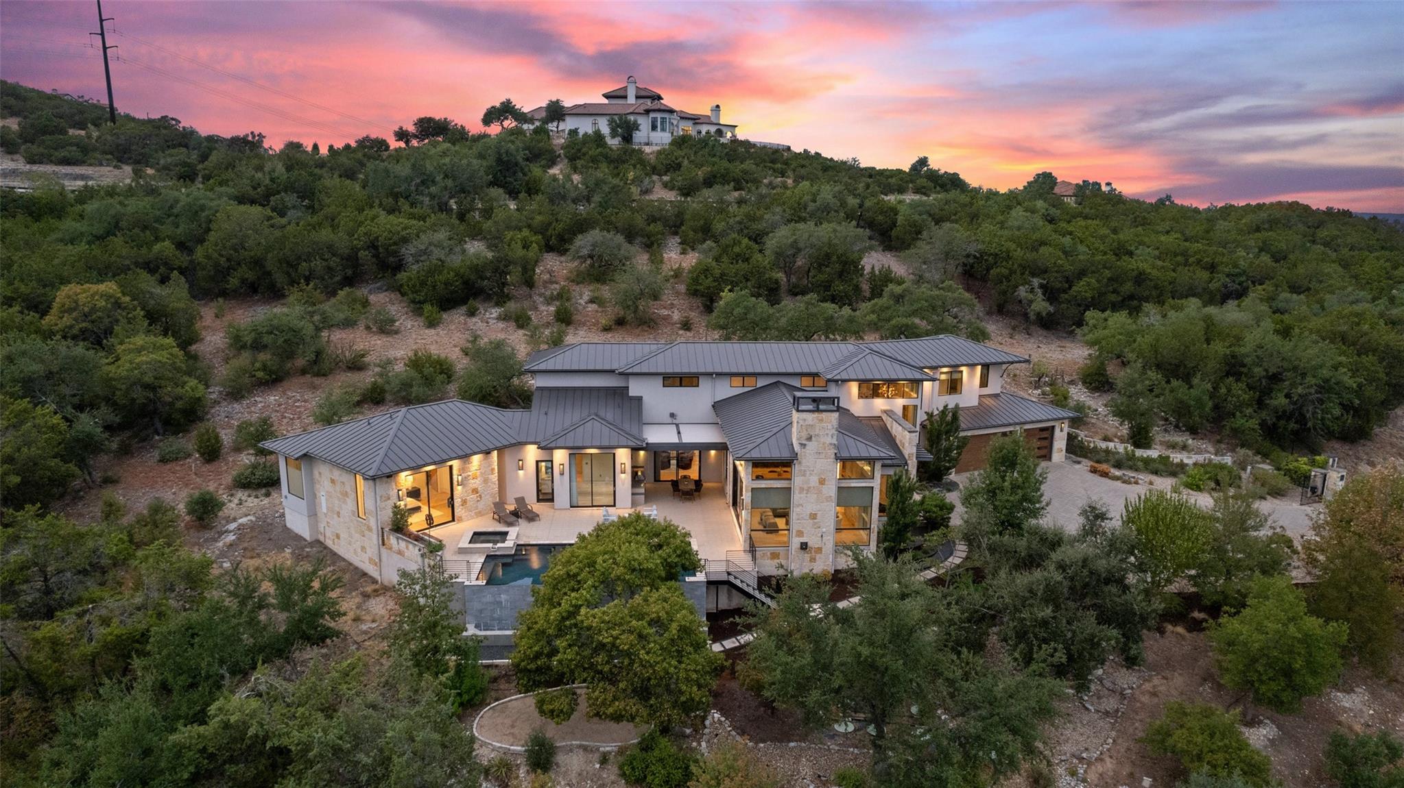 Welcome to this remarkable private, gated estate, nestled at the end of a cul-de-sac with panoramic views that stretch for miles. This property offers a tranquil retreat with its stunning negative edge pool, relaxing spa, and an inviting open concept floorplan. Every inch of this home is adorned with customized, designer details, catering to even the most discerning of tastes. What sets this property apart is its harmonious blend of contemporary design and natural elements. Expansive walls of windows seamlessly integrate the outdoors, flooding the interior with serene views and abundant natural light. The result is a quiet and peaceful sanctuary, perfect for those seeking respite from the hustle and bustle of daily life. The heart of this home is a chef's dream – a well-appointed kitchen featuring top-of-the-line appliances, custom cabinetry, Cesarstone countertops, and a functional layout for both culinary enthusiasts and entertainers alike. Conveniently located on the main floor, the primary suite offers a private getaway for unwinding with a spa-like bath that includes a walk-in shower, stand-alone tub and a closet that will be the envy of your friends. The main level also features a private study and a comfortable guest room which opens to the pool and spa. There are three additional bedrooms upstairs, each with en-suite full baths and walk-in closets along with a third living area providing a versatile space for gathering family and friends. Outside, the landscaping skillfully combines custom design elements with the natural beauty of the Texas hill country. The result is an oasis that feels miles away from the city yet is conveniently close to everything that makes Austin so desirable. Located in the esteemed Eanes ISD and with a low tax rate, this remarkable estate provides the ideal blend of comfort, practicality, tranquility and luxury.