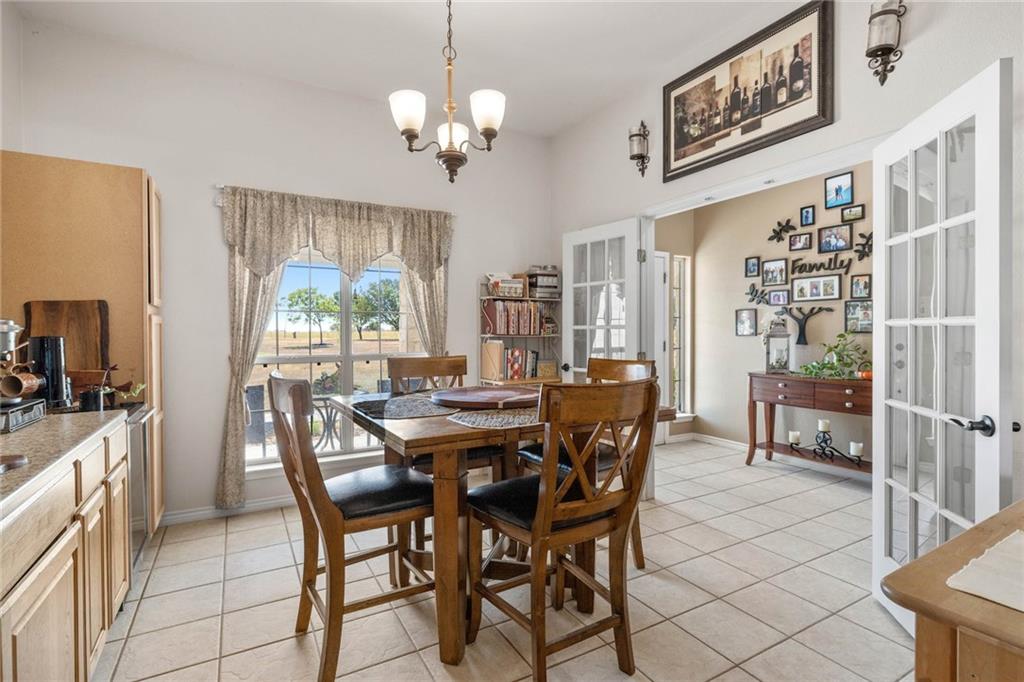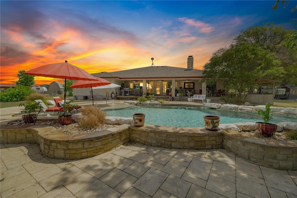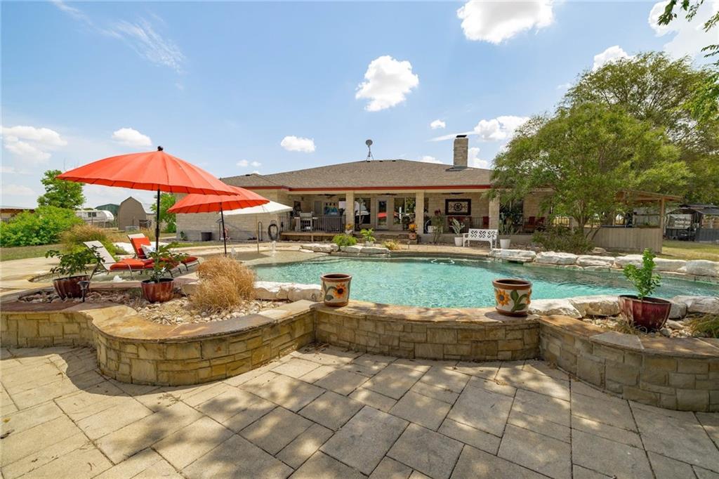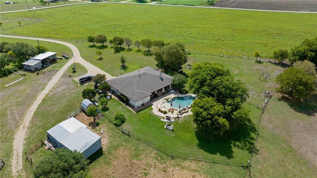 Just 15 minutes from the new Samsung facility, and even fewer from charming Downtown Taylor, Texas, this 30 acre ranch with a beautiful ranch-style home and pool offers peace, privacy, and even potential income! Mustang Creek runs through the back of the property and breathes life into the wild deer, rabbits, and quail that access it. The center acreage creates a perfect landscape for livestock, with 3 water holes, perimeter and cross fencing. An open floor plan welcomes guests with a gorgeous kitchen featuring updated cabinetry, neutral granite counters with tile backsplash, stainless appliances. The living area and study both have light hickory wood flooring, and tile runs throughout the other common areas. A huge primary bedroom suite with two closets sits on the opposite side of the other two bedrooms. There is no carpet in this house, yay! Dining areas include a formal dining area, and a breakfast room, both conveniently located to the kitchen. Laundry room is complete with a sink, storage and folding table. Large, end-to-end patios run across the front and the back of the home, allowing outside living year-round. The gorgeous pool stays cool with fountains and a water fall, and features a large tanning shelf (beach area) with umbrellas. There is a quarter acre parcel with a mobile home (that could stay or be removed) that is to be sold along with this property. That parcel has its own power, propane, water and septic. A backup generator for the main house and pool was installed in 2021. New pool pumps with cellular control added in 2019. Complete HVAC in the main house updated in 2019. Most of the outbuildings have power, some have water. The long driveway, creates privacy from the road. Come enjoy farmhouse living, and do what you please on this no restrictions property, Texas-style! Feeds to Thrall ISD! (Ranked higher than Taylor ISD!)