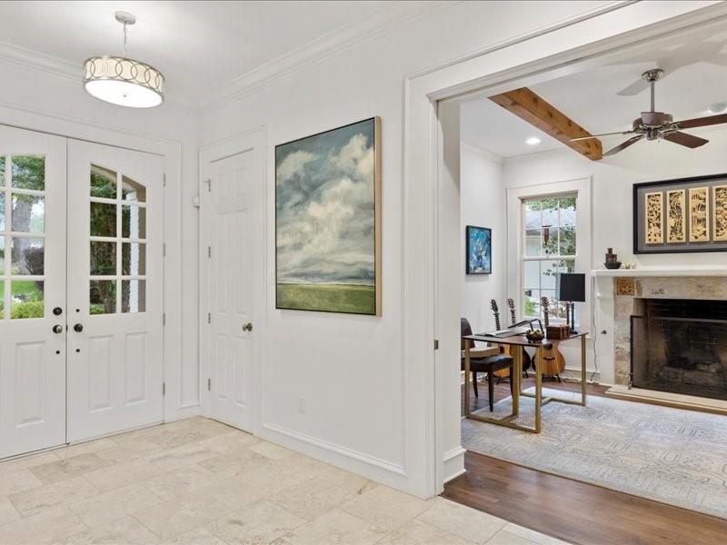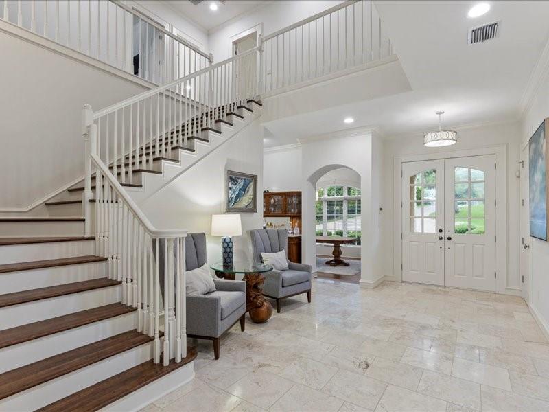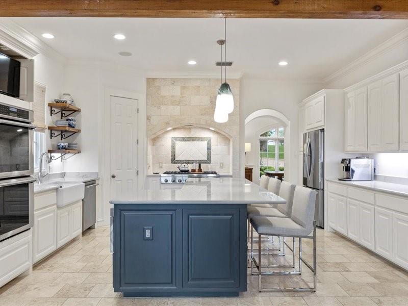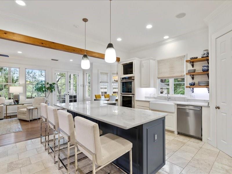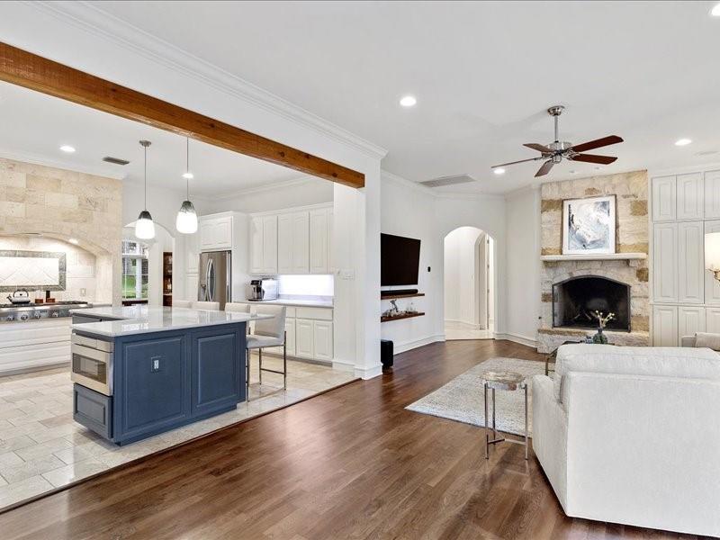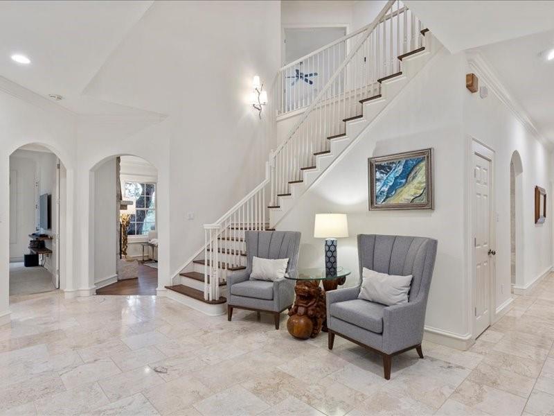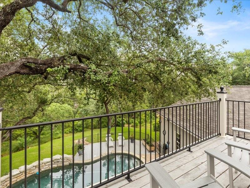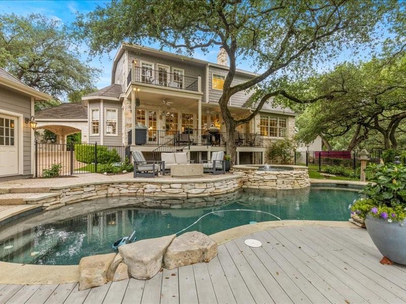 This Westlake Charmer is a contemporary GEM offering the luxury of space and serenity, nestled on a private, sprawling, amazing .81-acre lot at the heart of cul-de-sac. Boasting approximately 4000 sq ft of living area, it's akin to a private treehouse retreat, exuding both elegance and tranquility. From the moment you step inside, the meticulous care, attention to detail & 20 ft ceilings feel very grand. The open floorplan seamlessly connects the great room, dining area, and kitchen, creating inviting space for gatherings & entertainment. Large bedrooms, wide hallways, and ample storage contribute to the sense of spaciousness & functionality. The updated kitchen is a chef's delight, featuring quartzite countertops, top-of-the-line Thermador appliances, & 48” range top. A bonus alcove serves as a versatile space for music and computer use, while a cedar closet adds practicality. The main floor hosts a large office/den with a cozy wood-burning fireplace, perfect for those quiet evenings. Additionally, a flexible bedroom/living area offers the potential for an in-law suite w/private door to patio. Upstairs, a flex bedroom adjacent to primary suite provides endless possibilities--nursery, sitting room, study, crafts room, or exercise area. All bedrooms generously sized ensure comfort. This home boasts numerous extras, including 2 full-sized wood-burning masonry fireplaces, wood windows, & porte-cochere for convenient access to kitchen. A detached three-car garage, fully insulated with epoxy flooring, offers abundant attic storage. Wired for A/V & Cat V internet, with speakers both indoors & outdoors, it's equipped for modern living. Outside, the expansive backyard captivates with lush landscaping, a tranquil dry creek, and an inviting pool and jacuzzi—creating a haven for relaxation. With its thoughtful design, impeccable maintenance, & abundance of amenities, this property offers nurturing environment for a growing family to thrive. Epitome of contemporary living.