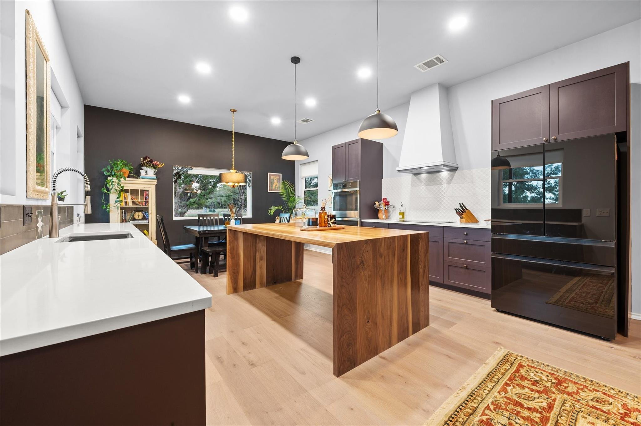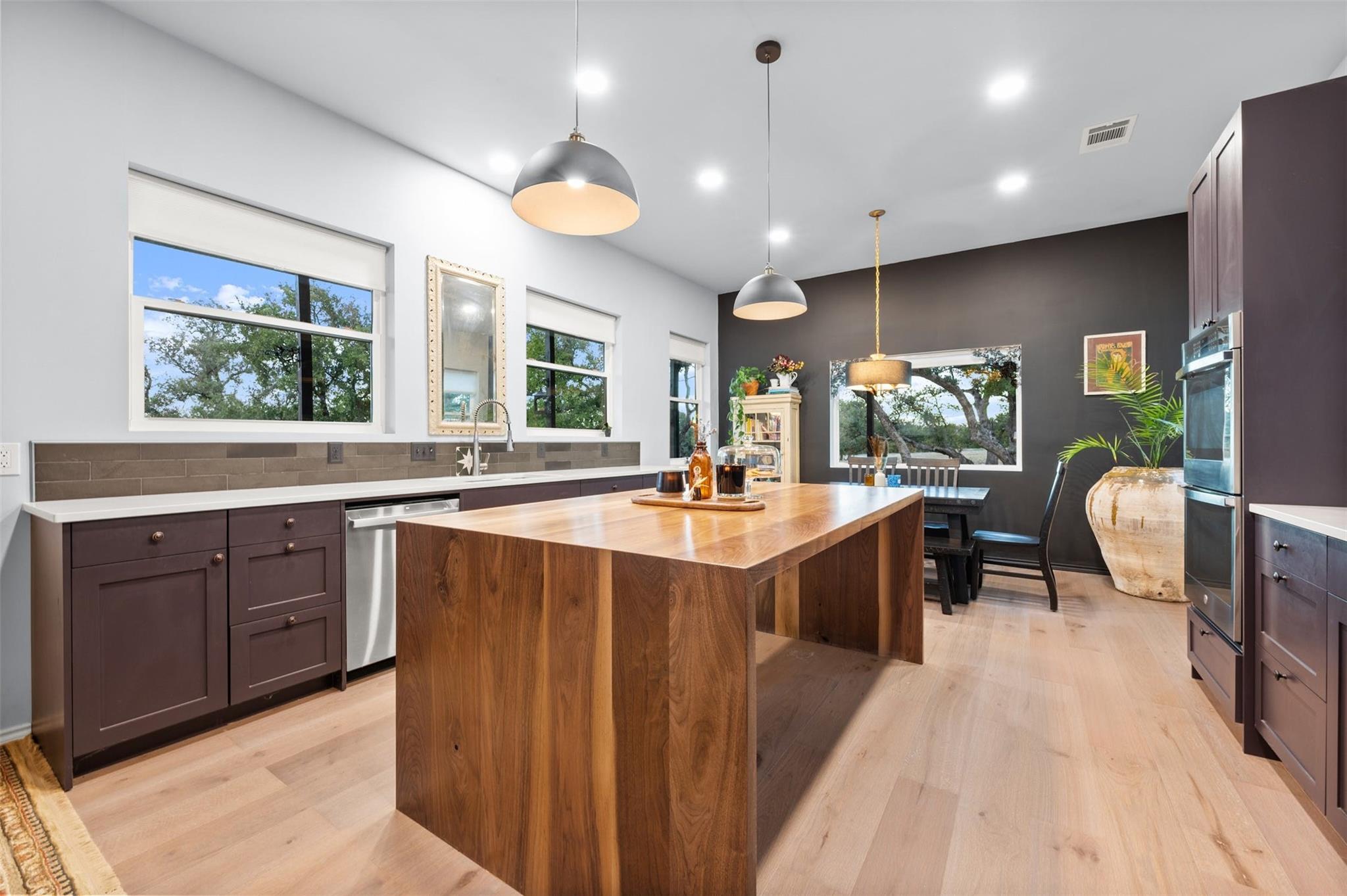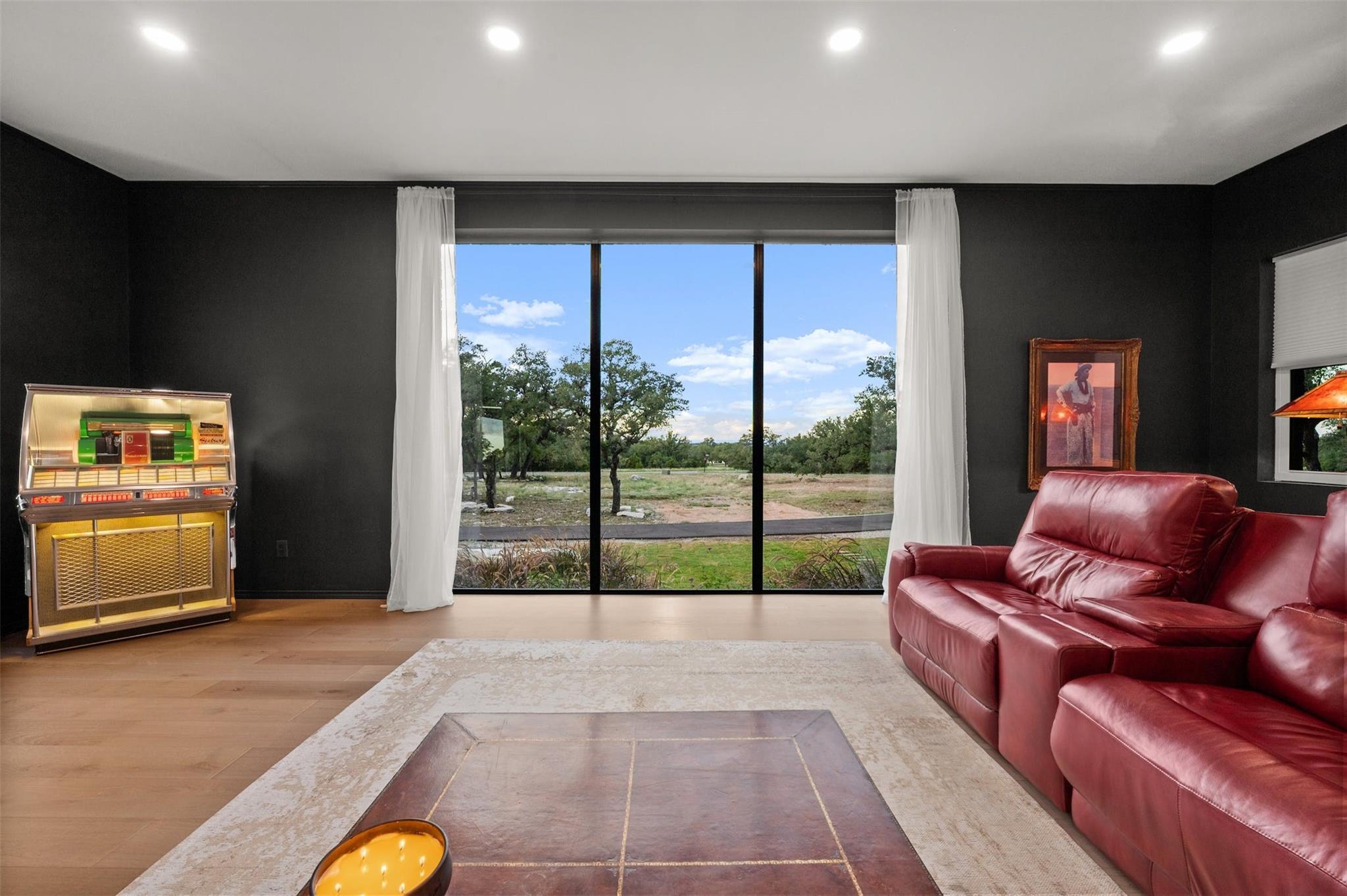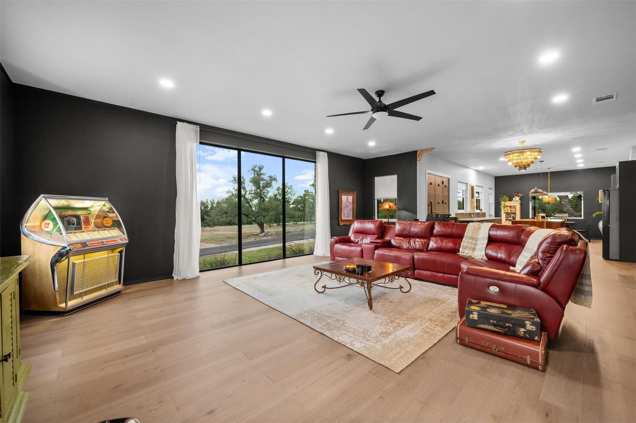 Custom-built dream home nestled on 5.57 breathtaking acres within the coveted Double Horn gated community! Built in 2023 with meticulous attention to detail, this residence embodies the essence of quality craftsmanship & modern design. From the moment you arrive, you'll be captivated by the home's stunning mid-century modern exterior, framed entirely with brick & adorned with enchanting LED landscape lighting & a welcoming covered front porch with Cantera iron doors. The lightly-lived-in interior boasts 3 spacious bedrooms, 2 bathrooms, & a generously sized great room that seamlessly connects the living room with the kitchen, featuring exquisite white oak wood flooring. The gourmet kitchen is a culinary masterpiece, featuring a massive solid walnut kitchen island with a convenient breakfast bar, an abundance of shaker cabinetry enhanced with sleek quartz countertops, & top-of-the line appliances, including an electric cooktop with a stylish wood vent hood. Retreat to the primary suite, a haven of relaxation with recent high-end carpeting, expansive windows that bathe the room in natural light, a walk-in closet, & an opulent en-suite bathroom. The primary bathroom is a spa-like retreat, featuring a modern dual vanity, a deep soaking tub adorned with a quartz surround, & an open walk-in shower that invites you to unwind & rejuvenate. Whether you choose to explore the vast 5.57-acre property or simply relax on the front porch or covered back patio, this home offers a wealth of opportunities to savor the outdoors. 3-car garage with 2 garage doors, a storage closet, & epoxy floors. The TPO roof, double-pane argon gas windows, & spring insulation throughout the home provide substantial energy savings. Exceptional amenities including a pool, playground, sports courts, pond, scenic trails, & an open-air pavilion. Convenient access to nearby Marble Falls, just 15 minutes away, or Bee Cave & Lakeway, a mere 30-minute drive. Schedule a showing today!