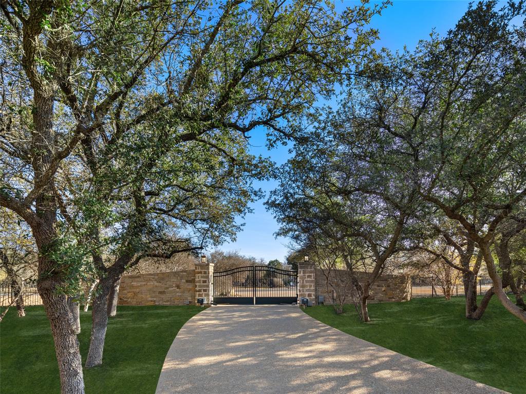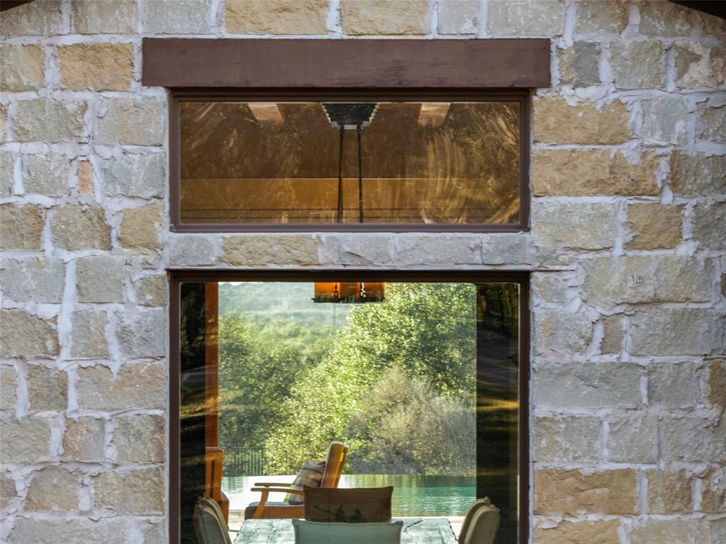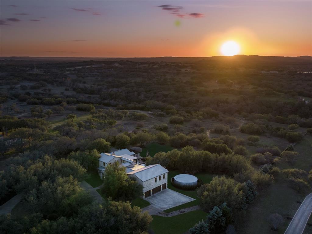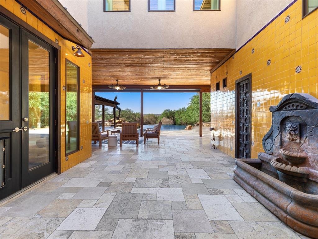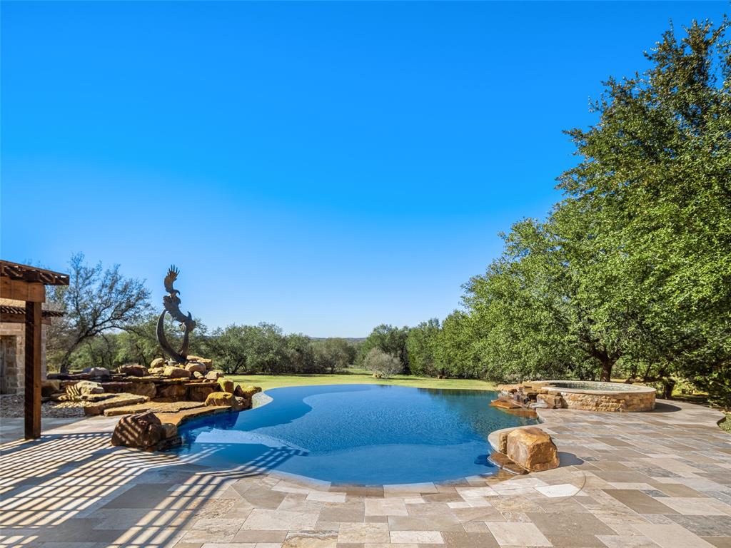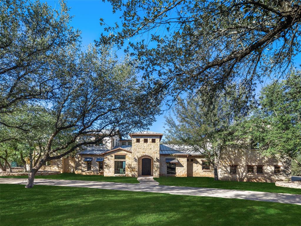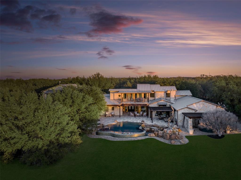 Situated in the heart of the Texas Hill Country on over 7 acres, this home is what Texas dreams are made of. An idyllic setting that immerses you into the nature that surrounds the property, enjoy native wildflower fields in the spring, towering oak trees, a private lookout over the Pedernales, an abundance of wildlife, & the most magical Texas sunsets & starry skies. Located in an exclusive gated community with property gate for extra privacy. Down the winding driveway is canopy of oak trees & a sprawling contemporary estate adorned with beautiful Texas stone. The perfect home to live & entertain graciously in. Upon entry, you are greeted by a gorgeous hand painted tile staircase & a beautiful, light-filled dining area. Across the way, a chic sitting area with reclaimed wood walls & metal tile ceiling. A chef's dream of a kitchen, with a La Cornue French range, large center island all open up to the spacious living space with a stone fireplace at the center, & large windows all around. The privately situated primary suite has its own outdoor seating area overlooking the pool, a serene bathroom, & large dressing room. The home also features a media room, full wet bar & kitchenette. Three additional bedrooms & office, each with their own full bathroom complete the home. Upstairs, a flex space that could be converted into a garage apartment (fully plumbed to add a kitchen), with a huge living space, private patio, bedroom & full bath. Flow seamlessly to the outdoors, through the courtyard adorned with hand-painted clay tiles & water feature overlooking the negative edge pool with rock waterfall feature below & bronze eagle statue. Beyond the pool is the lush green area & never-ending views of the Hill Country. Equipped with a 46,000 gallon rainwater collection tank that provides water for the home & high producing well to service the sprinklers & pool. Close to enough to the city but far enough to enjoy the true magic of the Texas Hill Country.