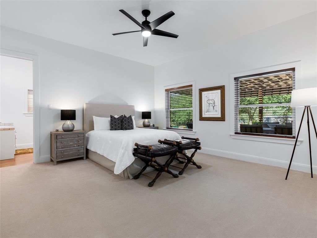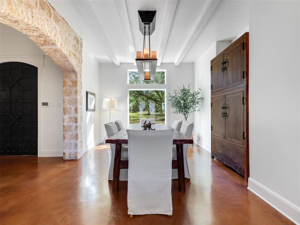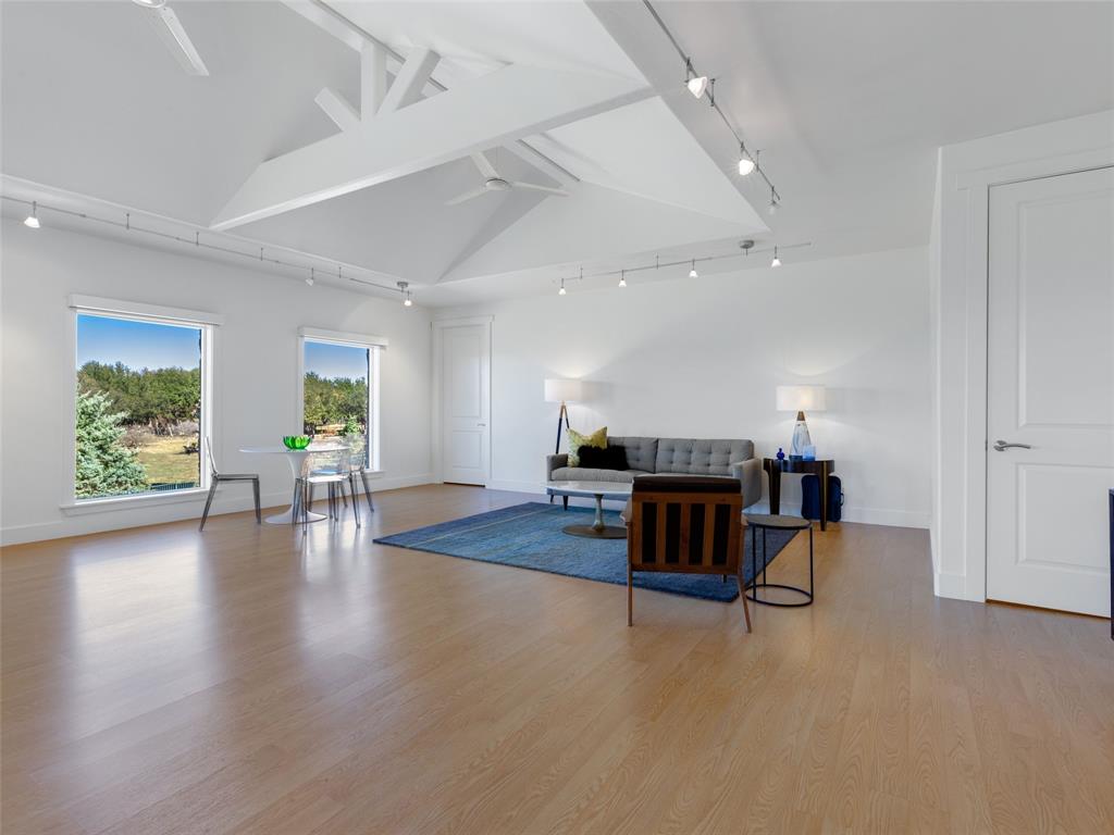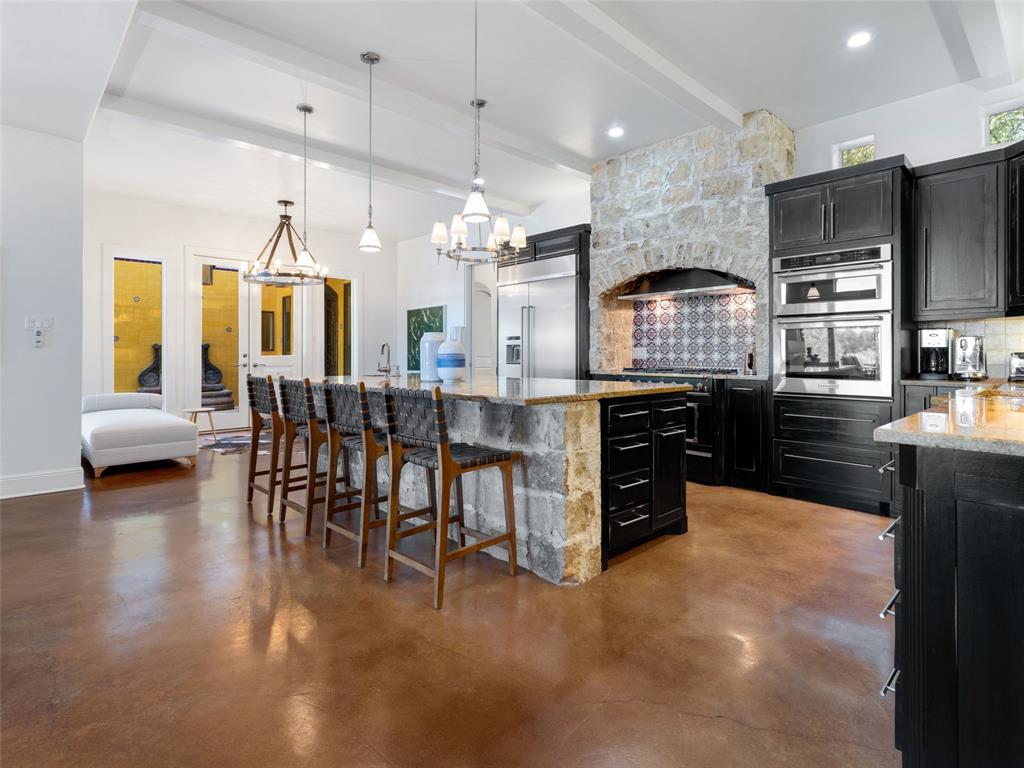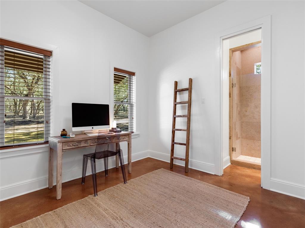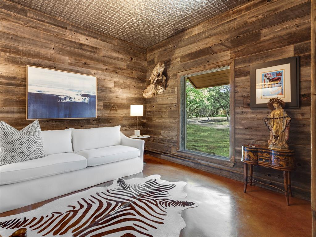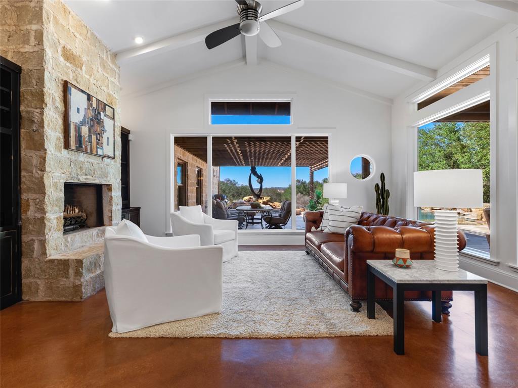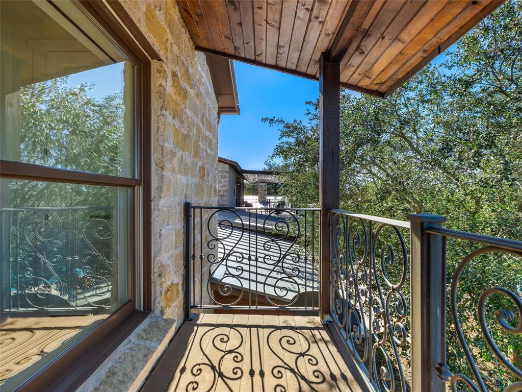 Situated in the heart of the Texas Hill Country on over 7 acres, this home is what Texas dreams are made of. An idyllic setting that immerses you into the nature that surrounds the property, enjoy native wildflower fields in the spring, towering oak trees, a private lookout over the Pedernales, an abundance of wildlife, & the most magical Texas sunsets & starry skies. Located in an exclusive gated community with property gate for extra privacy. Down the winding driveway is canopy of oak trees & a sprawling contemporary estate adorned with beautiful Texas stone. The perfect home to live & entertain graciously in. Upon entry, you are greeted by a gorgeous hand painted tile staircase & a beautiful, light-filled dining area. Across the way, a chic sitting area with reclaimed wood walls & metal tile ceiling. A chef's dream of a kitchen, with a La Cornue French range, large center island all open up to the spacious living space with a stone fireplace at the center, & large windows all around. The privately situated primary suite has its own outdoor seating area overlooking the pool, a serene bathroom, & large dressing room. The home also features a media room, full wet bar & kitchenette. Three additional bedrooms & office, each with their own full bathroom complete the home. Upstairs, a flex space that could be converted into a garage apartment (fully plumbed to add a kitchen), with a huge living space, private patio, bedroom & full bath. Flow seamlessly to the outdoors, through the courtyard adorned with hand-painted clay tiles & water feature overlooking the negative edge pool with rock waterfall feature below & bronze eagle statue. Beyond the pool is the lush green area & never-ending views of the Hill Country. Equipped with a 46,000 gallon rainwater collection tank that provides water for the home & high producing well to service the sprinklers & pool. Close to enough to the city but far enough to enjoy the true magic of the Texas Hill Country.