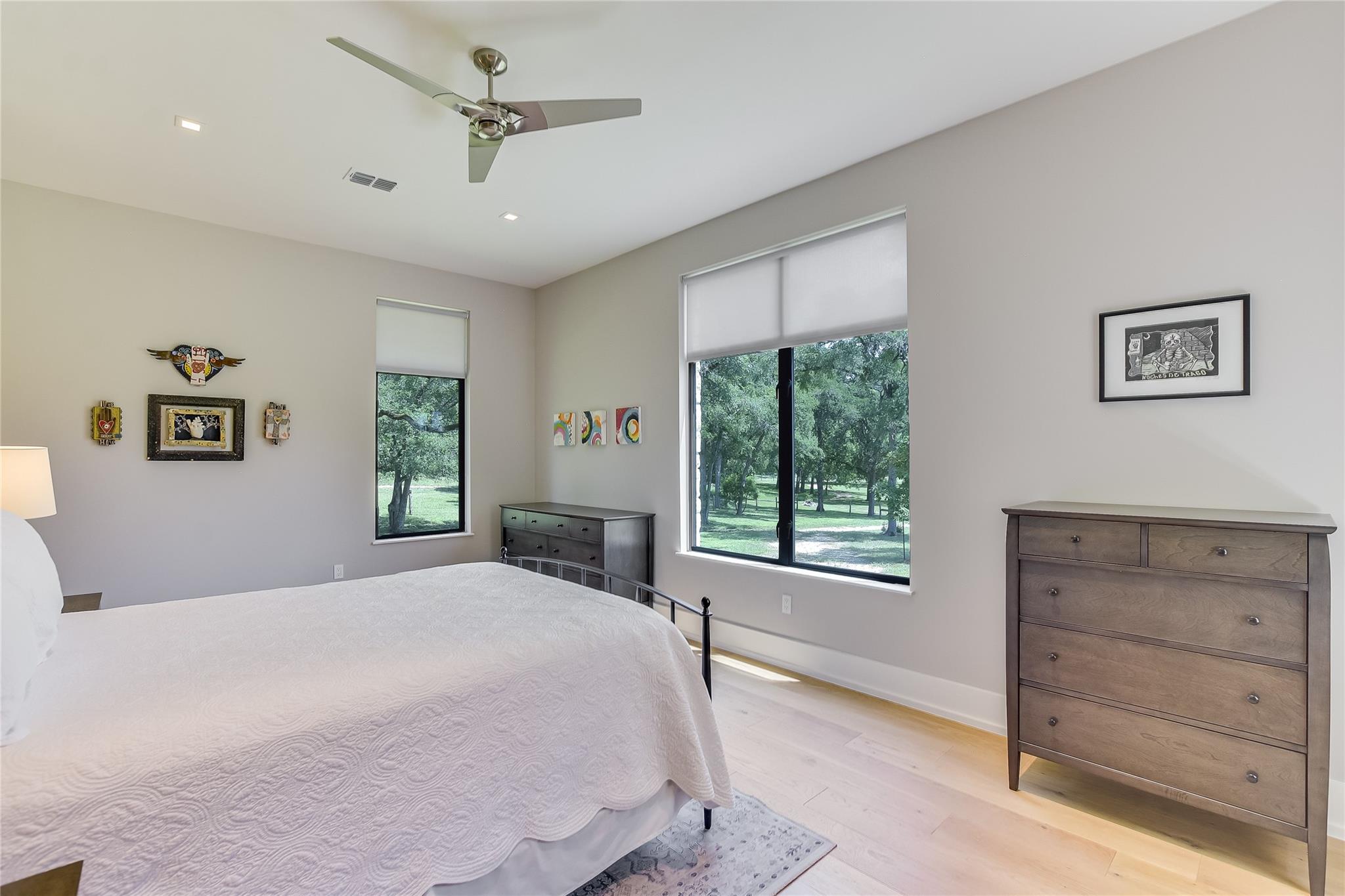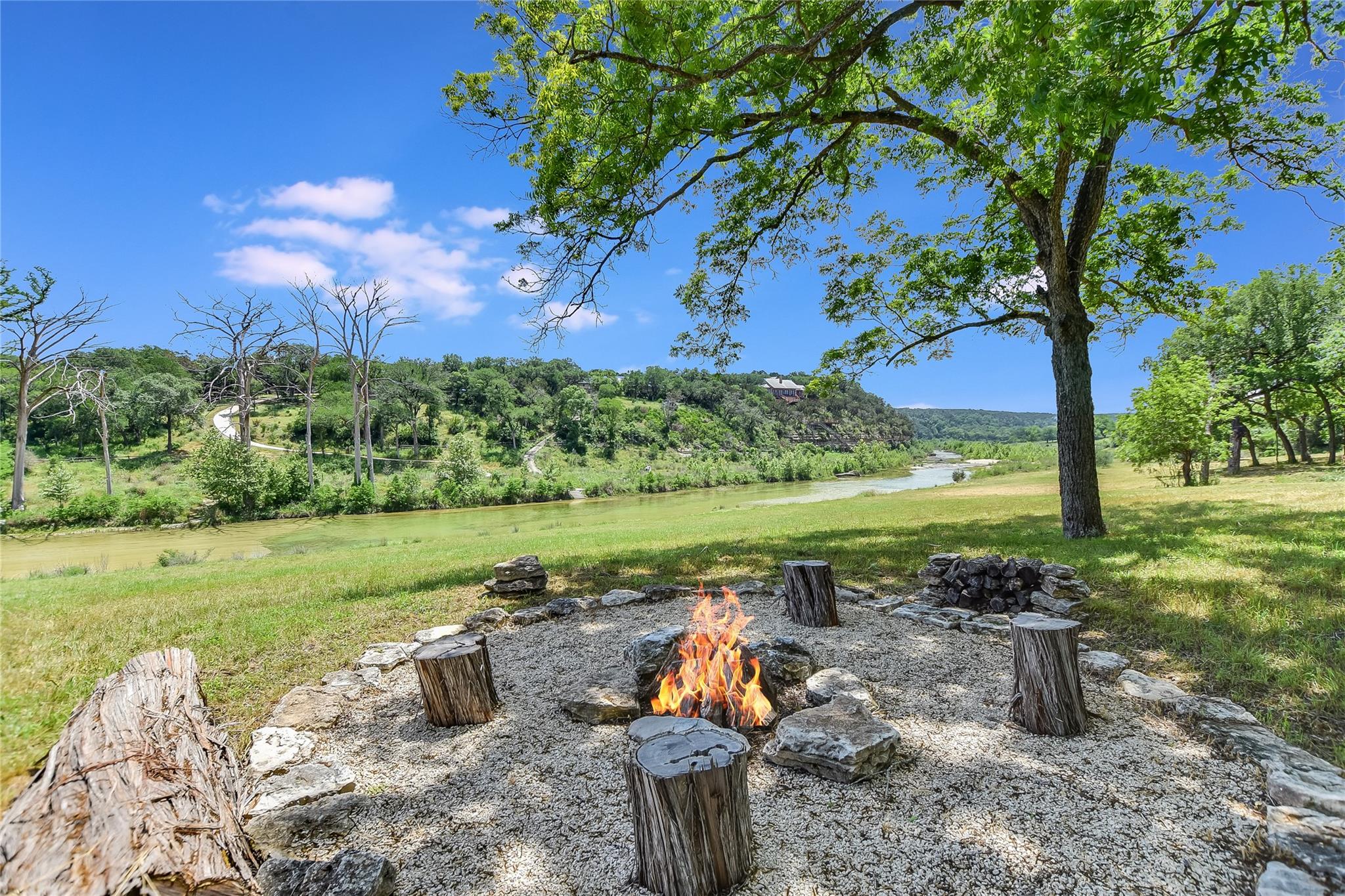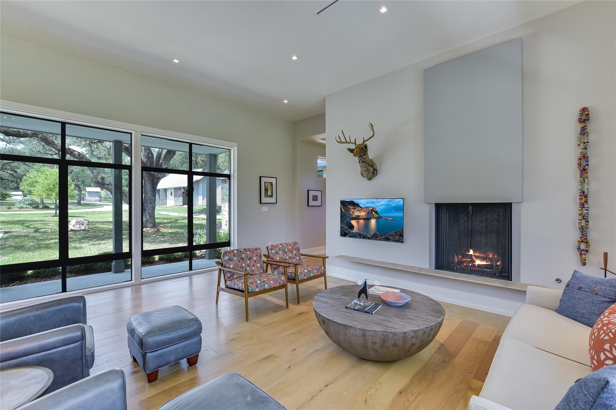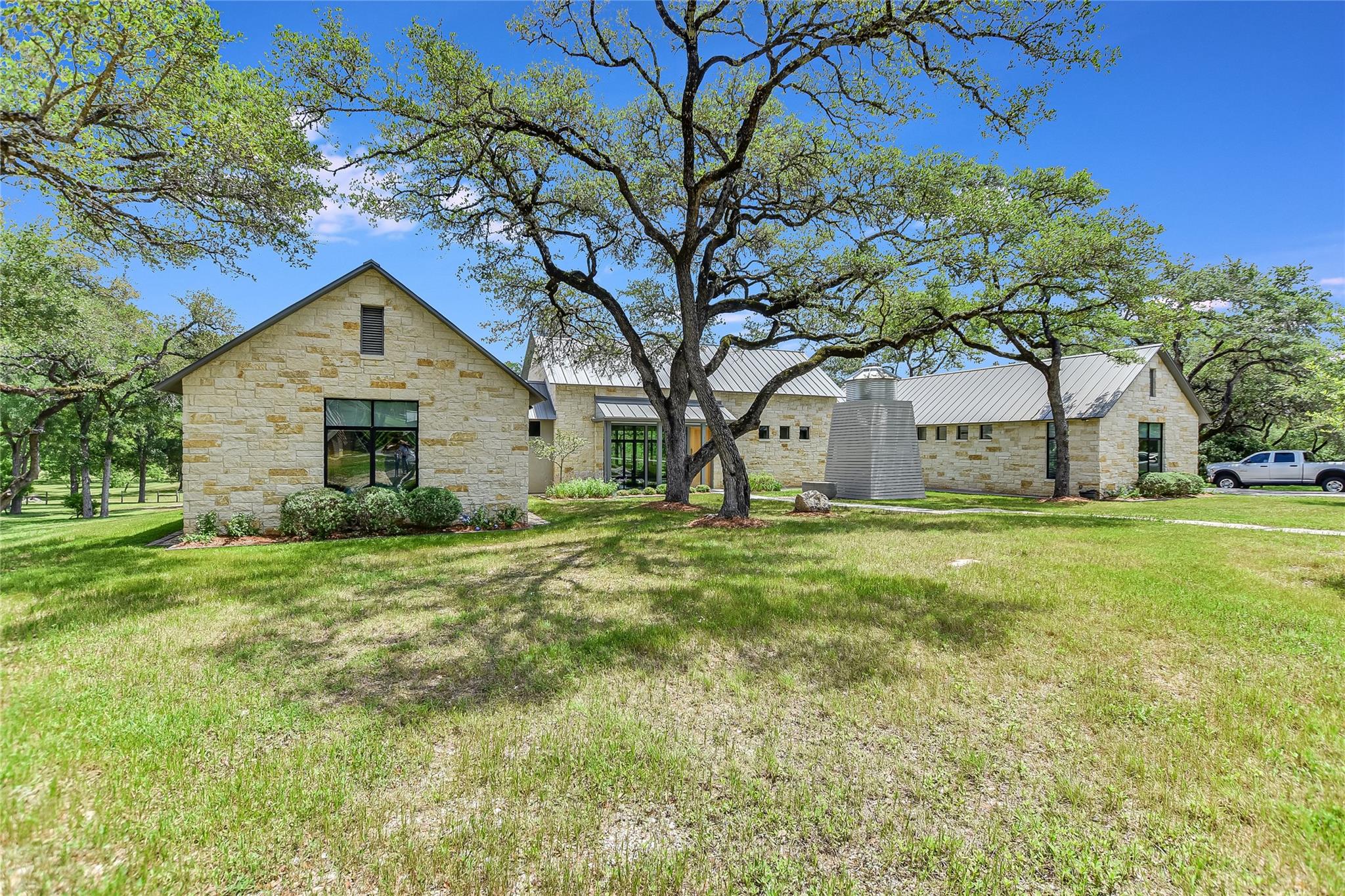 Escape to tranquility with this stunning modern custom home nestled along the serene Blanco River. From the moment you step inside, you're greeted by the clean lines of the living room fireplace, setting the tone for contemporary elegance. Floor-to-ceiling windows frame picturesque views of the landscaped backyard and sprawling meadow and the hills beyond, inviting nature indoors. The open concept floor plan seamlessly integrates the living area with a gourmet kitchen and dining room, featuring stainless steel appliances, quartz countertops, and a central island perfect for culinary creations. Adjacent to the kitchen, a screened porch offers an idyllic spot for savoring a morning coffee or enjoying a peaceful dinner. Retreat to the primary bedroom, where panoramic views of the backyard create a tranquil ambiance. Indulge in the spa-like ensuite bath, complete with a double vanity, luxurious soaking slipper tub, spacious shower, and his and her closets, ensuring a sanctuary for relaxation. The second bedroom boasts its own ensuite bath, providing comfort and privacy for guests. Convenience meets luxury with a dedicated laundry room and a dog washing station, catering to both practical needs and furry companions. Embrace outdoor living with easy access to the Blanco River, where cooling waters beckon for a refreshing dip. Sit around the firepit under a starlit sky. For hobbyists and adventurers, a workshop and parking for utility vehicles are just a short stroll from the front door. Benefiting from an agricultural exemption, this property not only offers a serene escape but also ensures favorable property taxes. Experience the epitome of riverside living and make this sanctuary on the Blanco River your own.