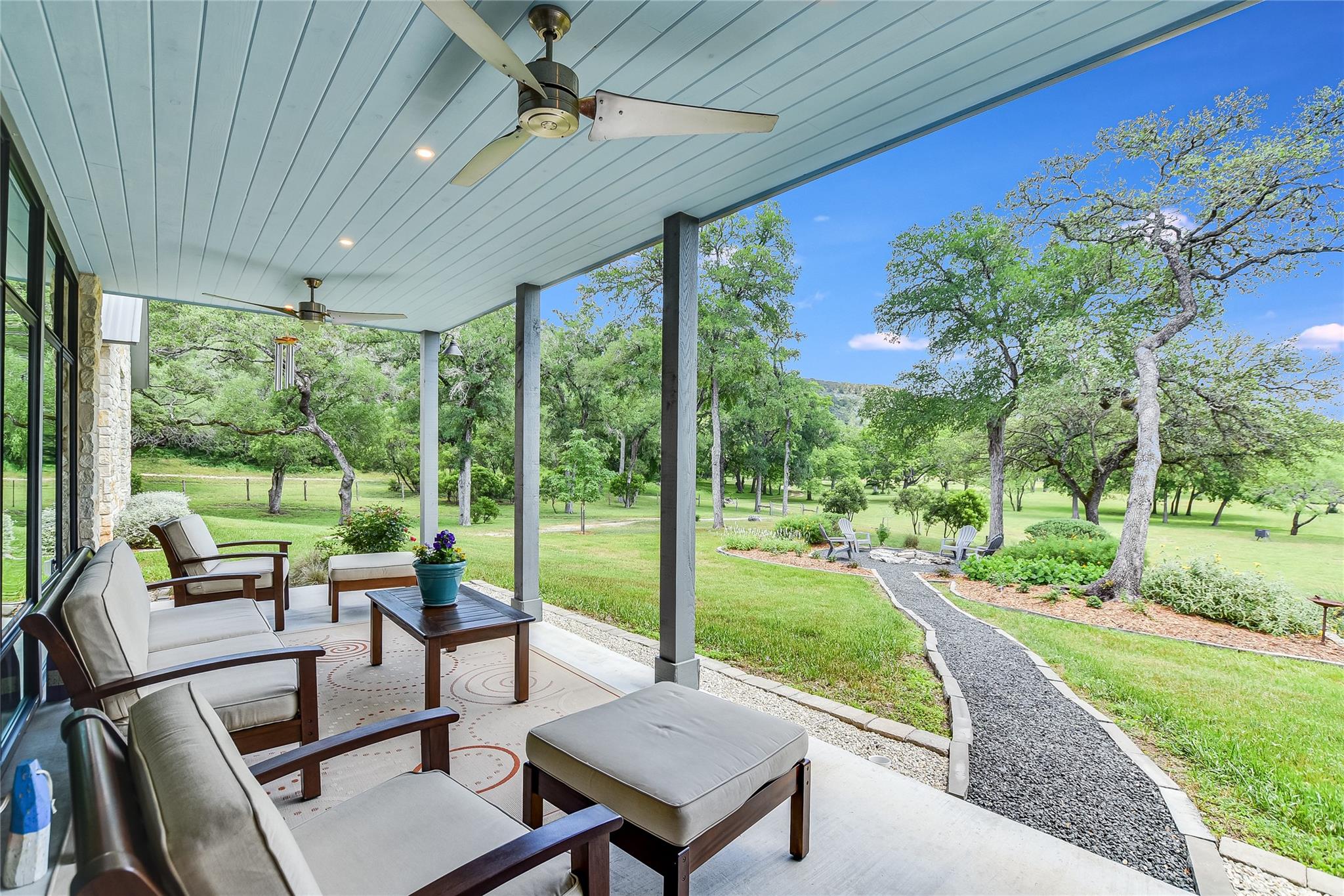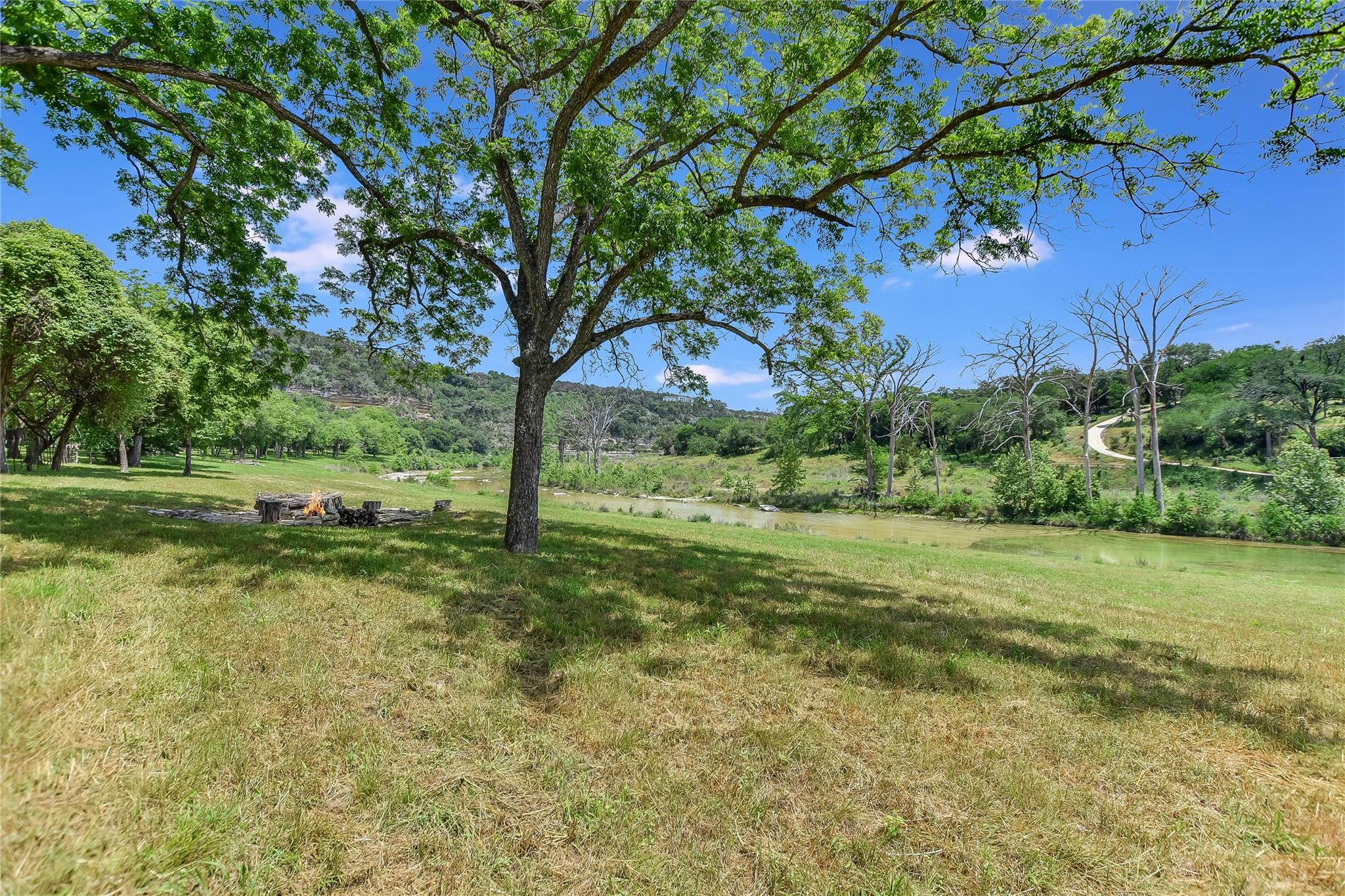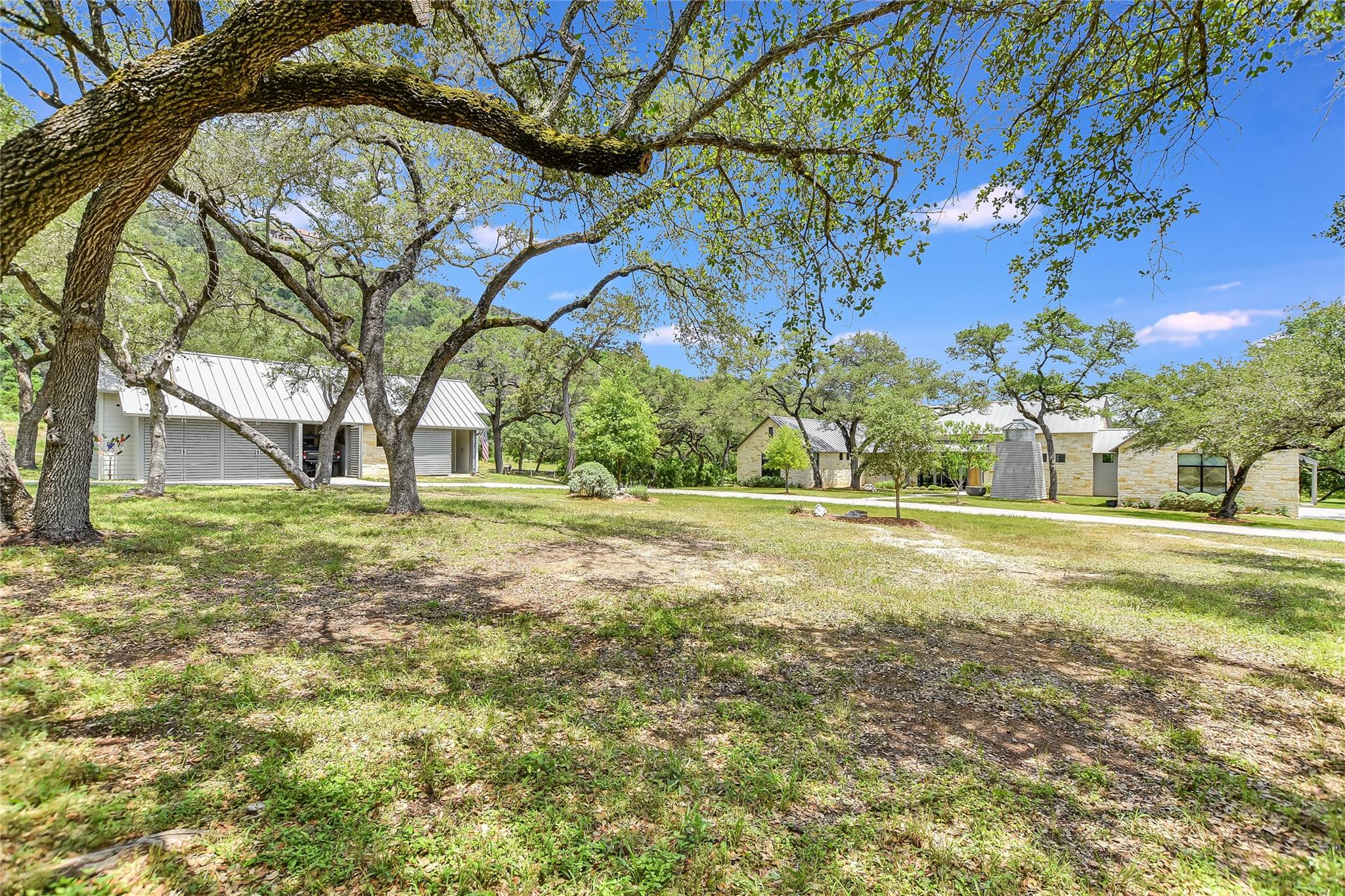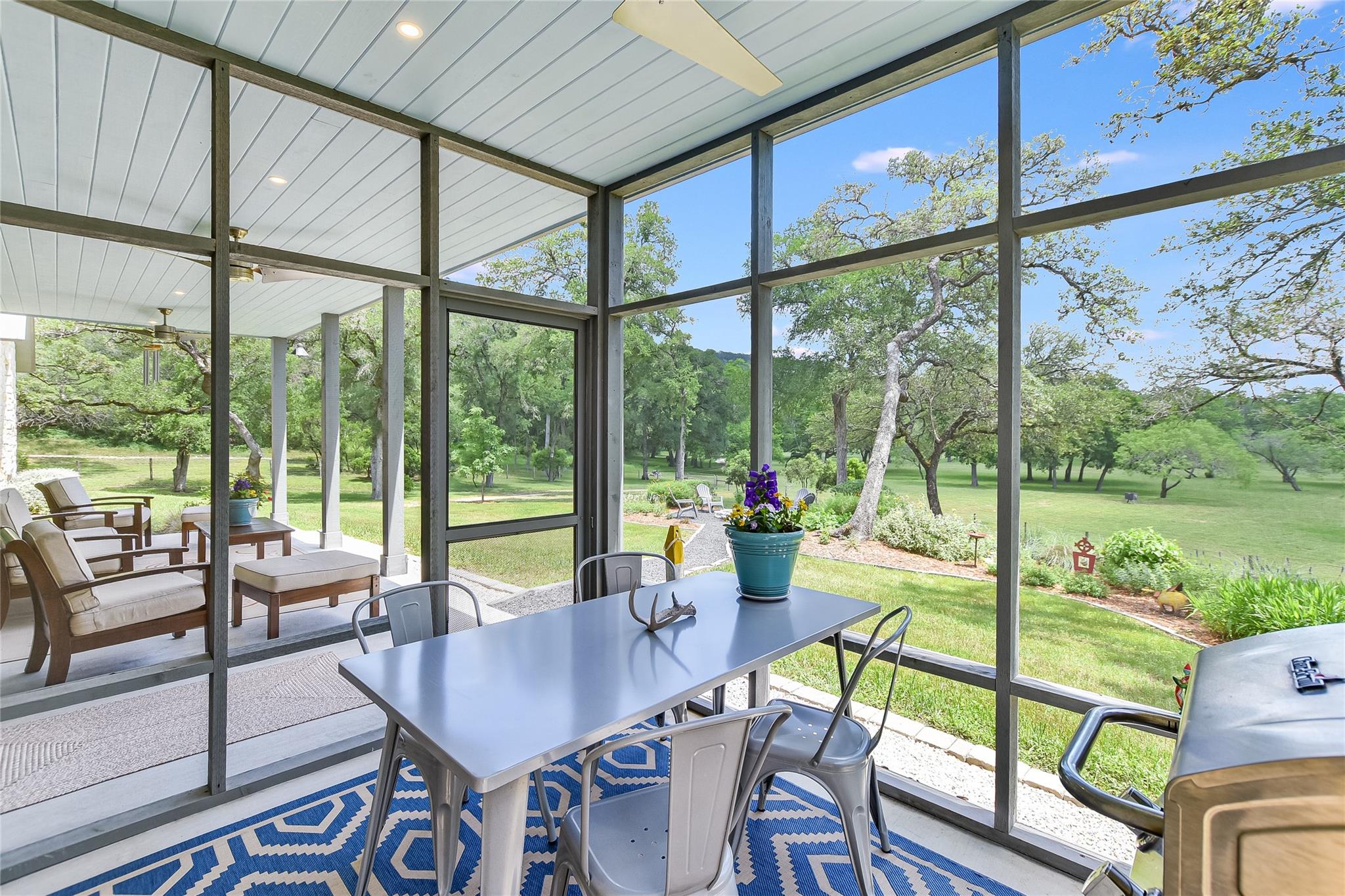 Escape to tranquility with this stunning modern custom home nestled along the serene Blanco River. From the moment you step inside, you're greeted by the clean lines of the living room fireplace, setting the tone for contemporary elegance. Floor-to-ceiling windows frame picturesque views of the landscaped backyard and sprawling meadow and the hills beyond, inviting nature indoors. The open concept floor plan seamlessly integrates the living area with a gourmet kitchen and dining room, featuring stainless steel appliances, quartz countertops, and a central island perfect for culinary creations. Adjacent to the kitchen, a screened porch offers an idyllic spot for savoring a morning coffee or enjoying a peaceful dinner. Retreat to the primary bedroom, where panoramic views of the backyard create a tranquil ambiance. Indulge in the spa-like ensuite bath, complete with a double vanity, luxurious soaking slipper tub, spacious shower, and his and her closets, ensuring a sanctuary for relaxation. The second bedroom boasts its own ensuite bath, providing comfort and privacy for guests. Convenience meets luxury with a dedicated laundry room and a dog washing station, catering to both practical needs and furry companions. Embrace outdoor living with easy access to the Blanco River, where cooling waters beckon for a refreshing dip. Sit around the firepit under a starlit sky. For hobbyists and adventurers, a workshop and parking for utility vehicles are just a short stroll from the front door. Benefiting from an agricultural exemption, this property not only offers a serene escape but also ensures favorable property taxes. Experience the epitome of riverside living and make this sanctuary on the Blanco River your own.