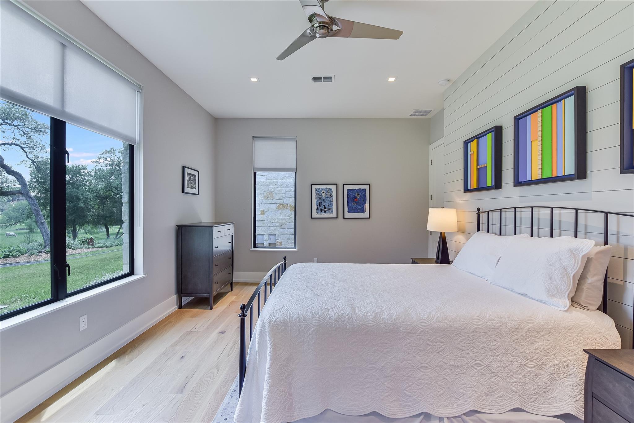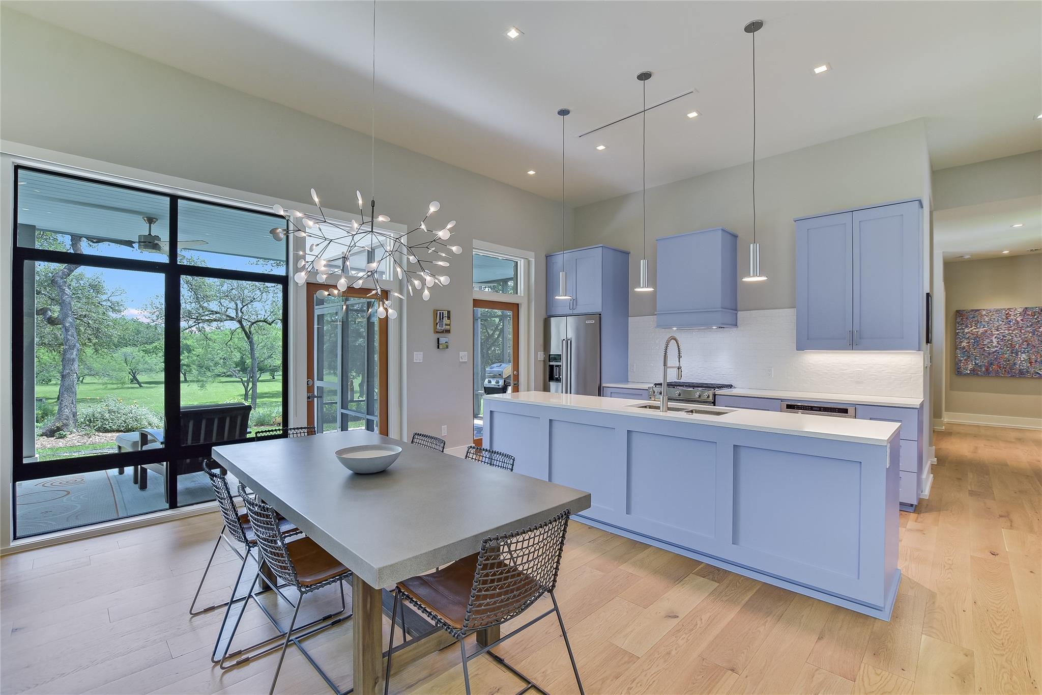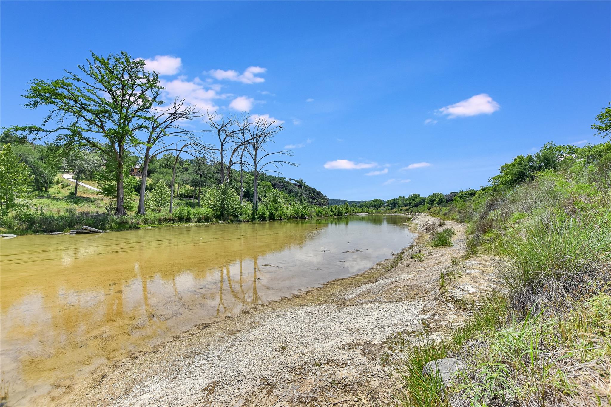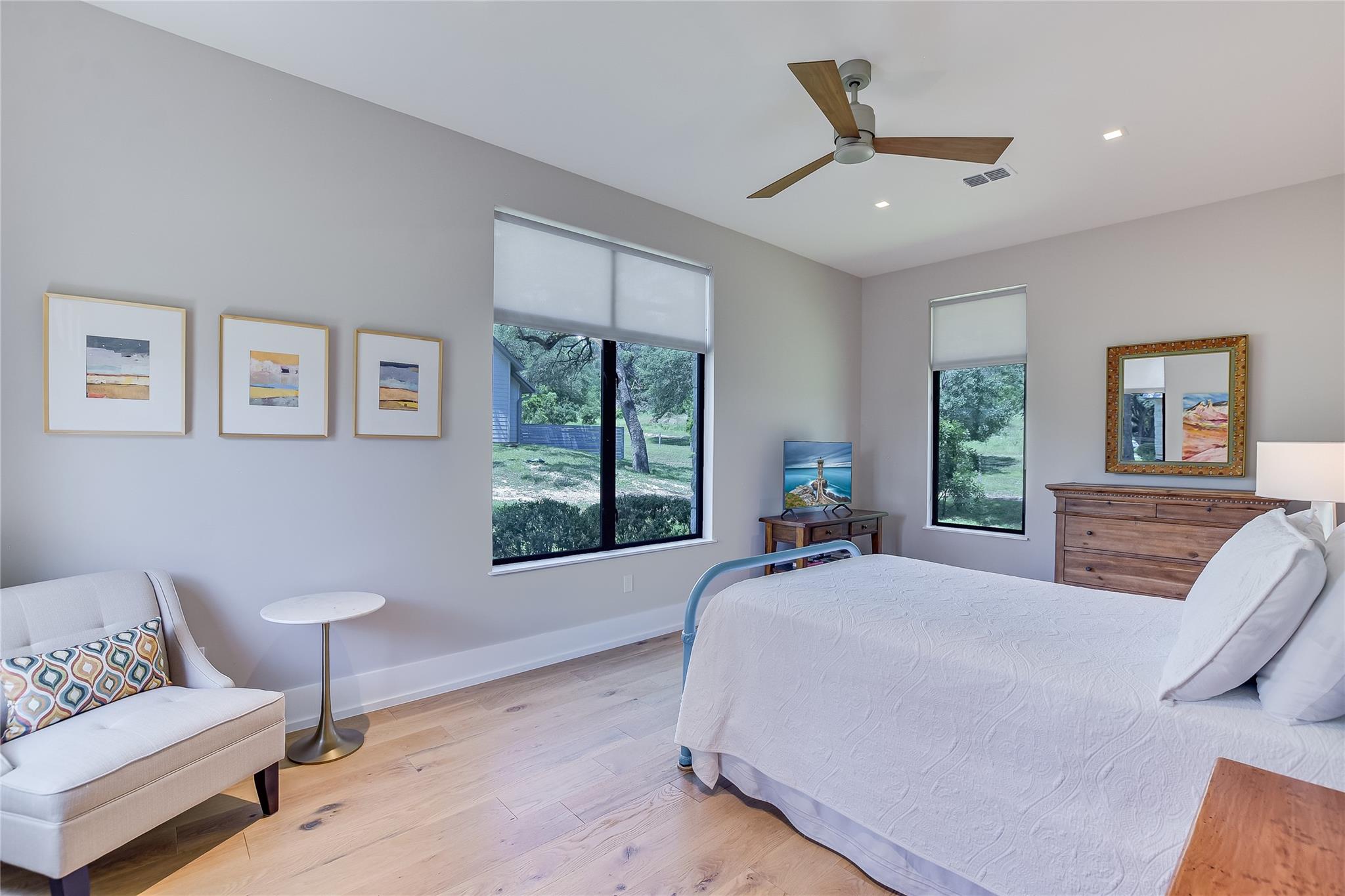 Escape to tranquility with this stunning modern custom home nestled along the serene Blanco River. From the moment you step inside, you're greeted by the clean lines of the living room fireplace, setting the tone for contemporary elegance. Floor-to-ceiling windows frame picturesque views of the landscaped backyard and sprawling meadow and the hills beyond, inviting nature indoors. The open concept floor plan seamlessly integrates the living area with a gourmet kitchen and dining room, featuring stainless steel appliances, quartz countertops, and a central island perfect for culinary creations. Adjacent to the kitchen, a screened porch offers an idyllic spot for savoring a morning coffee or enjoying a peaceful dinner. Retreat to the primary bedroom, where panoramic views of the backyard create a tranquil ambiance. Indulge in the spa-like ensuite bath, complete with a double vanity, luxurious soaking slipper tub, spacious shower, and his and her closets, ensuring a sanctuary for relaxation. The second bedroom boasts its own ensuite bath, providing comfort and privacy for guests. Convenience meets luxury with a dedicated laundry room and a dog washing station, catering to both practical needs and furry companions. Embrace outdoor living with easy access to the Blanco River, where cooling waters beckon for a refreshing dip. Sit around the firepit under a starlit sky. For hobbyists and adventurers, a workshop and parking for utility vehicles are just a short stroll from the front door. Benefiting from an agricultural exemption, this property not only offers a serene escape but also ensures favorable property taxes. Experience the epitome of riverside living and make this sanctuary on the Blanco River your own.