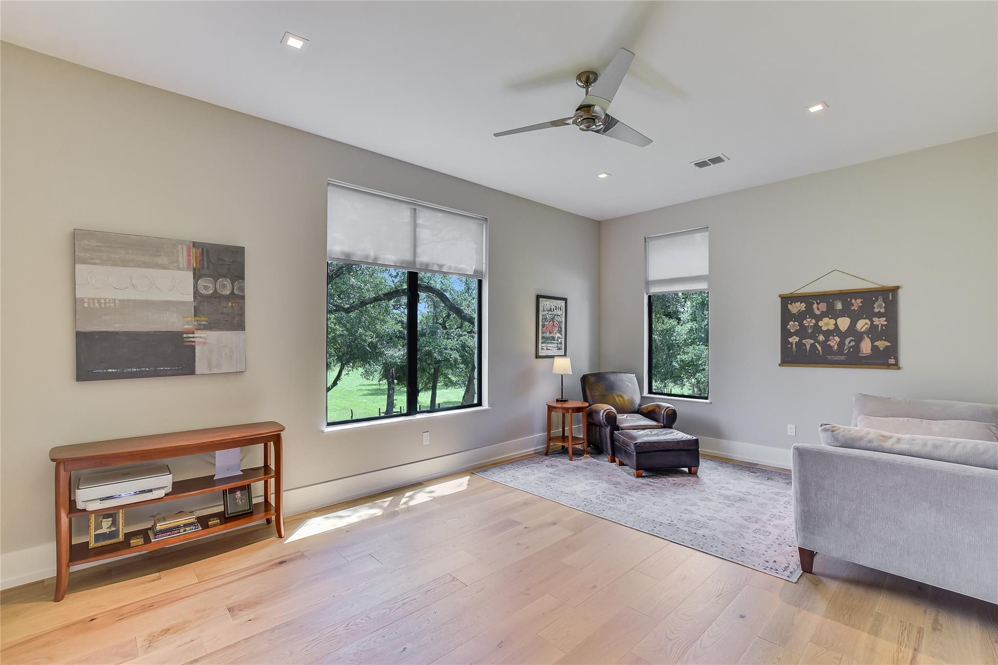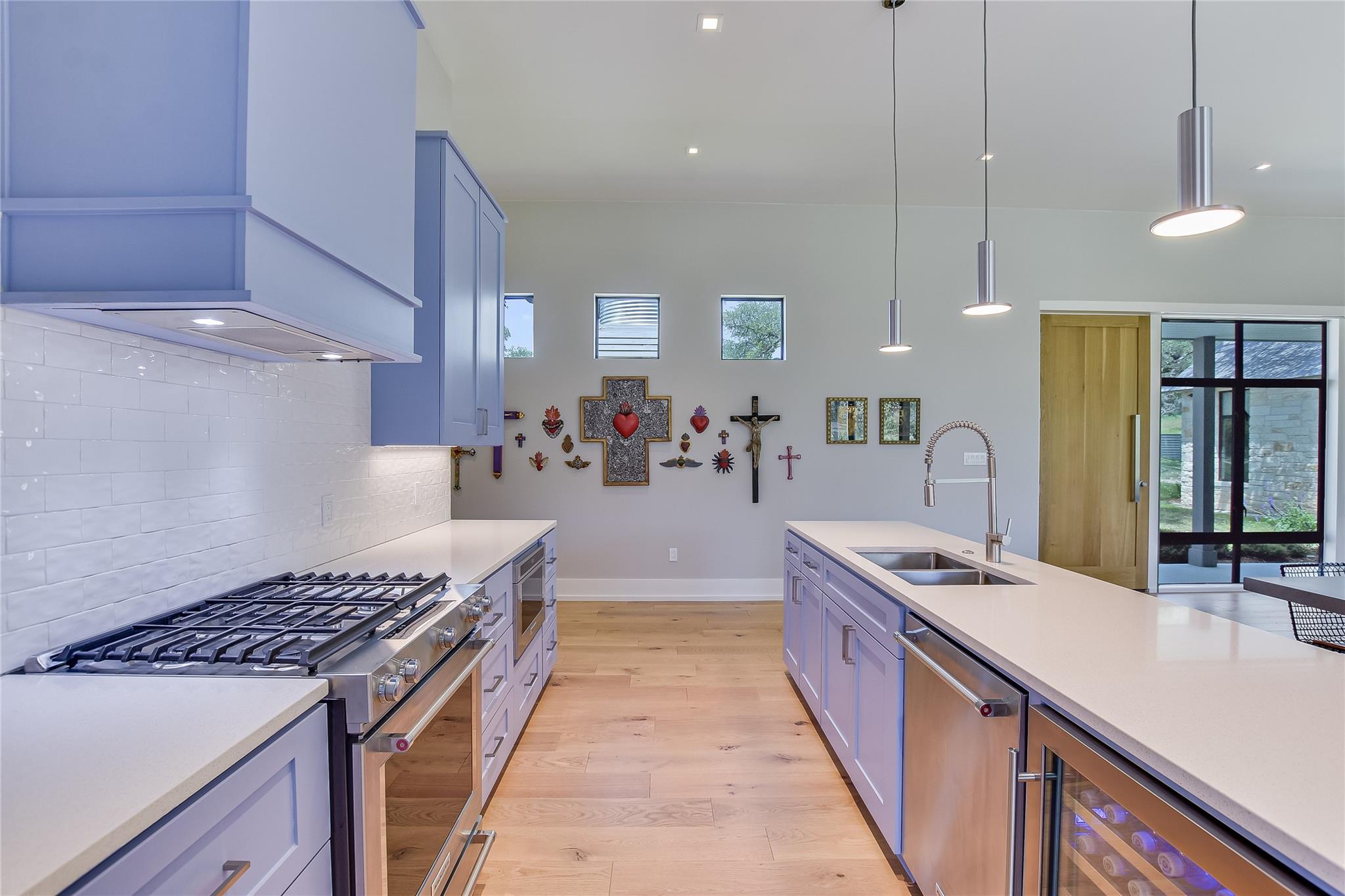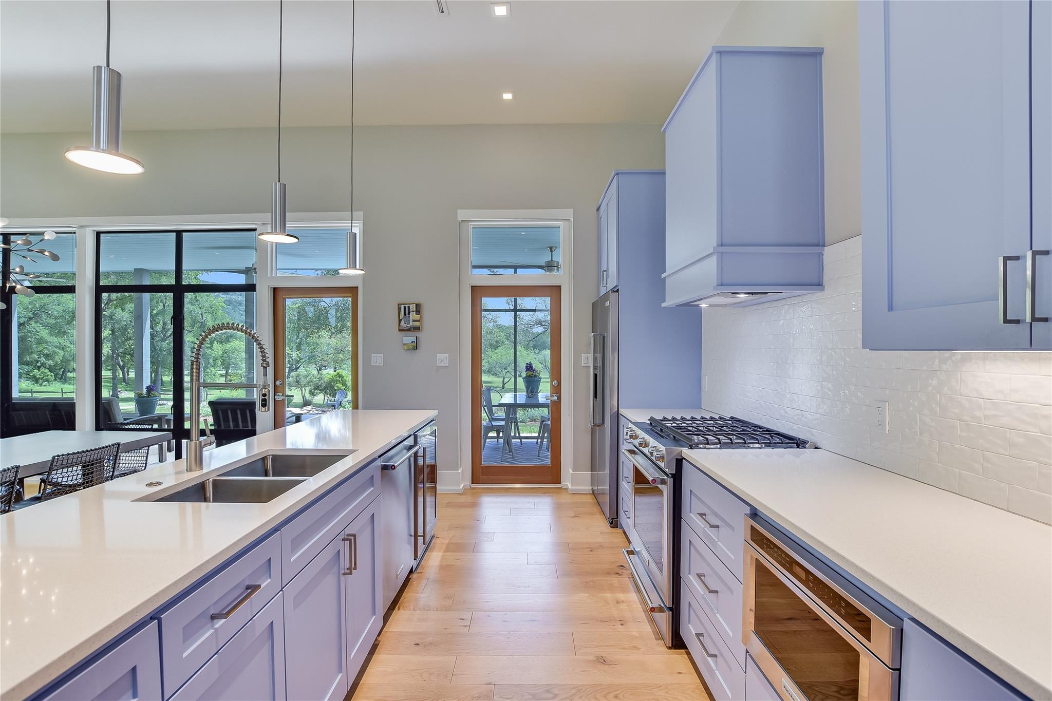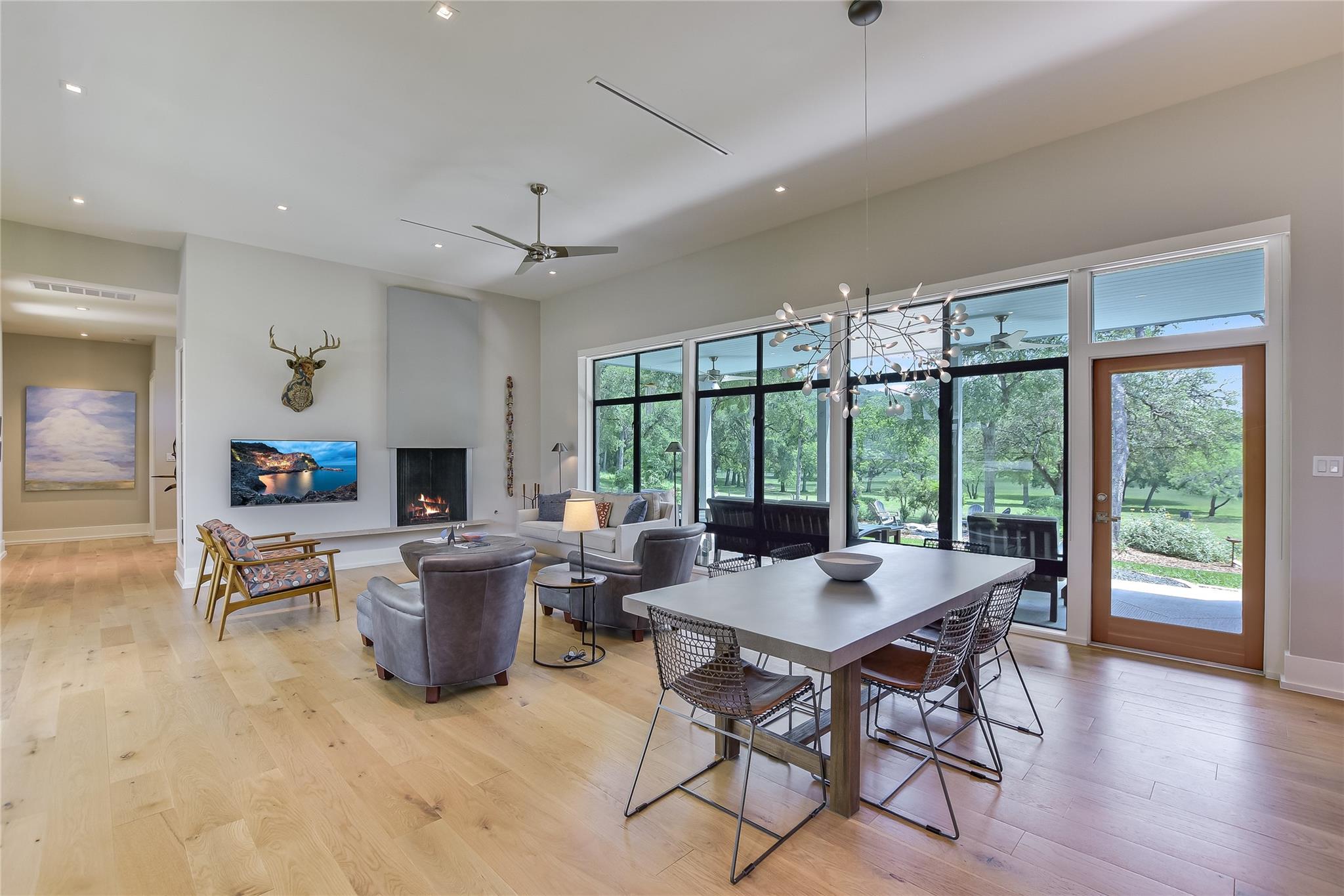 Escape to tranquility with this stunning modern custom home nestled along the serene Blanco River. From the moment you step inside, you're greeted by the clean lines of the living room fireplace, setting the tone for contemporary elegance. Floor-to-ceiling windows frame picturesque views of the landscaped backyard and sprawling meadow and the hills beyond, inviting nature indoors. The open concept floor plan seamlessly integrates the living area with a gourmet kitchen and dining room, featuring stainless steel appliances, quartz countertops, and a central island perfect for culinary creations. Adjacent to the kitchen, a screened porch offers an idyllic spot for savoring a morning coffee or enjoying a peaceful dinner. Retreat to the primary bedroom, where panoramic views of the backyard create a tranquil ambiance. Indulge in the spa-like ensuite bath, complete with a double vanity, luxurious soaking slipper tub, spacious shower, and his and her closets, ensuring a sanctuary for relaxation. The second bedroom boasts its own ensuite bath, providing comfort and privacy for guests. Convenience meets luxury with a dedicated laundry room and a dog washing station, catering to both practical needs and furry companions. Embrace outdoor living with easy access to the Blanco River, where cooling waters beckon for a refreshing dip. Sit around the firepit under a starlit sky. For hobbyists and adventurers, a workshop and parking for utility vehicles are just a short stroll from the front door. Benefiting from an agricultural exemption, this property not only offers a serene escape but also ensures favorable property taxes. Experience the epitome of riverside living and make this sanctuary on the Blanco River your own.