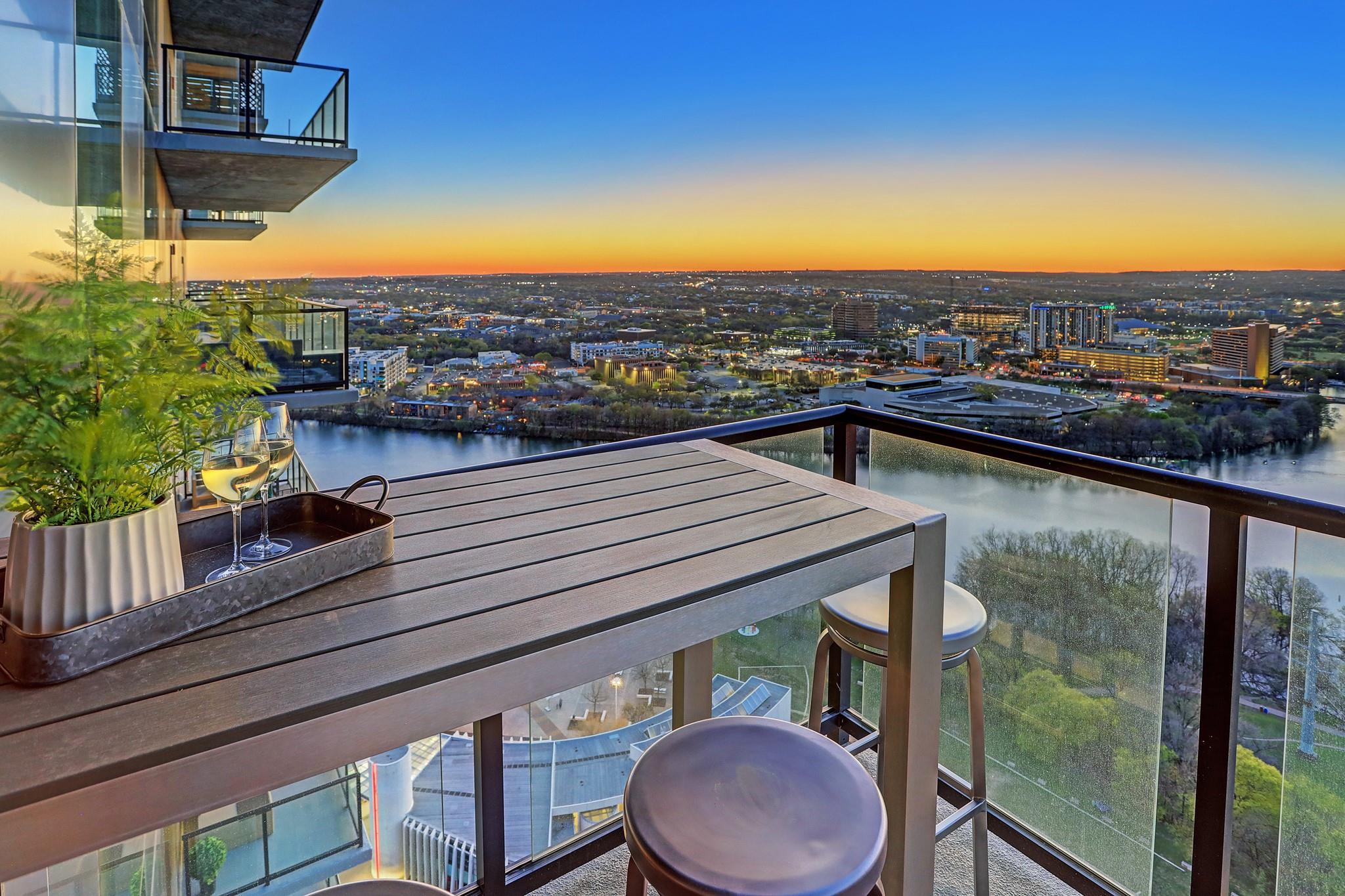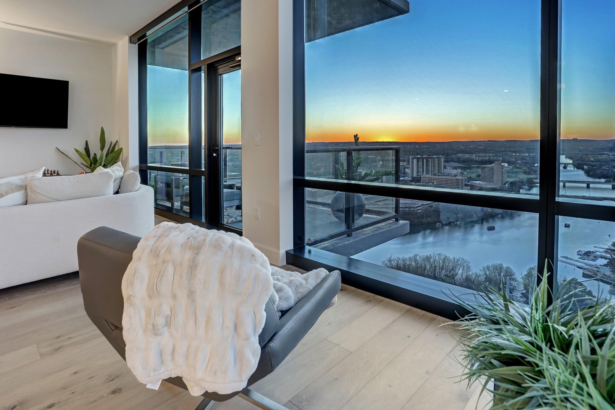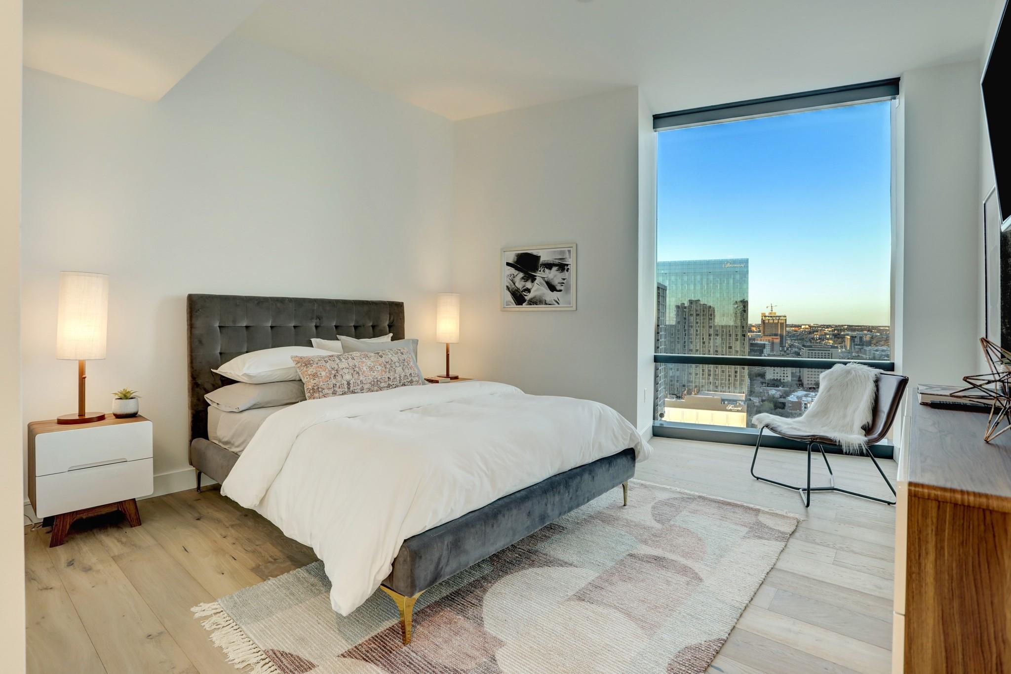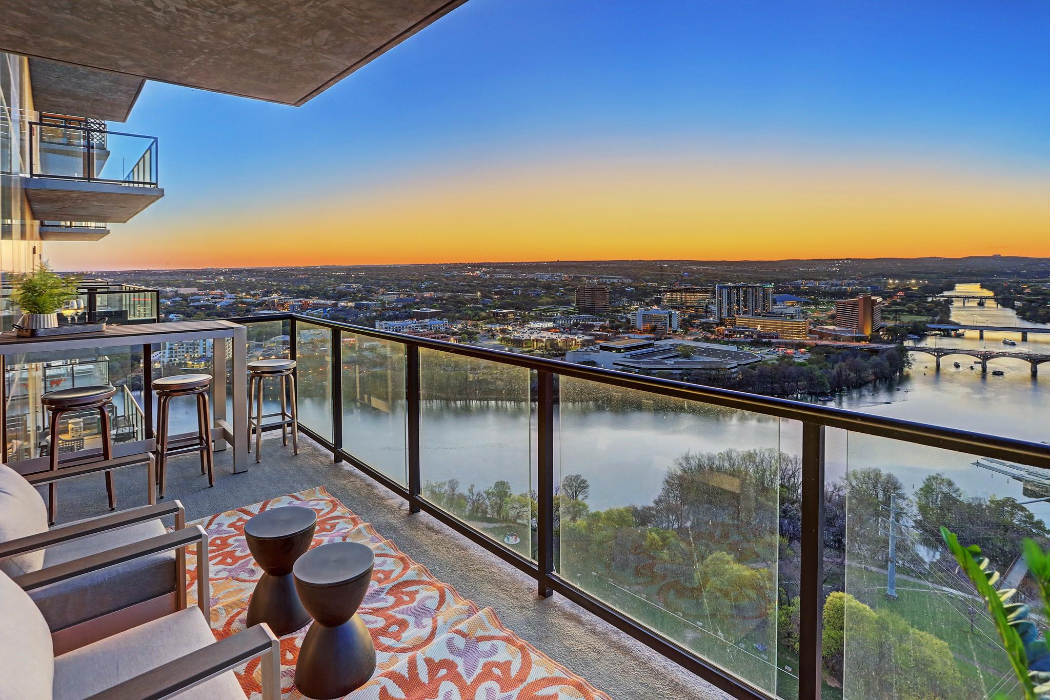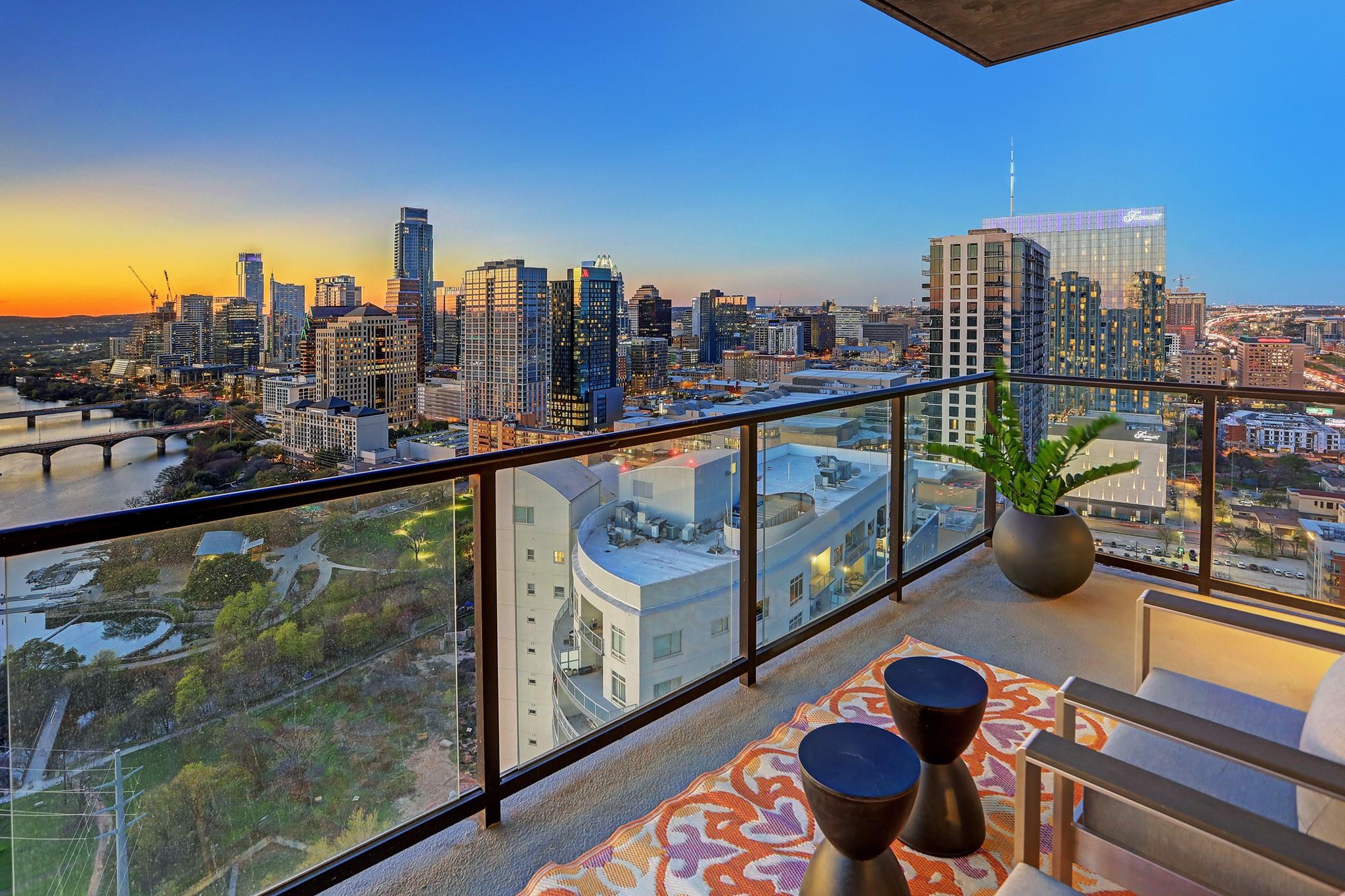 Located in the Rainey Street Historic District, 70 Rainey is the definition of luxury. With dedicated 24/7 Concierge, the building offers over 31,000 sq ft of total amenity space. On the 10th floor, there's a 2,200 sq ft fitness center that rivals premier fitness establishments, boasting a steam shower and dry-heat sauna. In addition to the fitness center, is a 72 ft long infinity pool directly overlooking Lady bird lake and downtown Austin. Imagine bbq social hours at the deck's outdoor lounge that has fire pits, grill-equipped kitchen and pool side cabanas. Situated on the 26th floor with panoramic views of lady bird lake and downtown Austin, the 3 bedroom, 3 bath 2179 sq feet residence with a private balcony, features contemporary high end finishes with clean lines, classic elegance, and organic elements. The condo has great natural light coming through the 'floor to ceiling' windows which are equipped with remote controlled motorized solar shades.