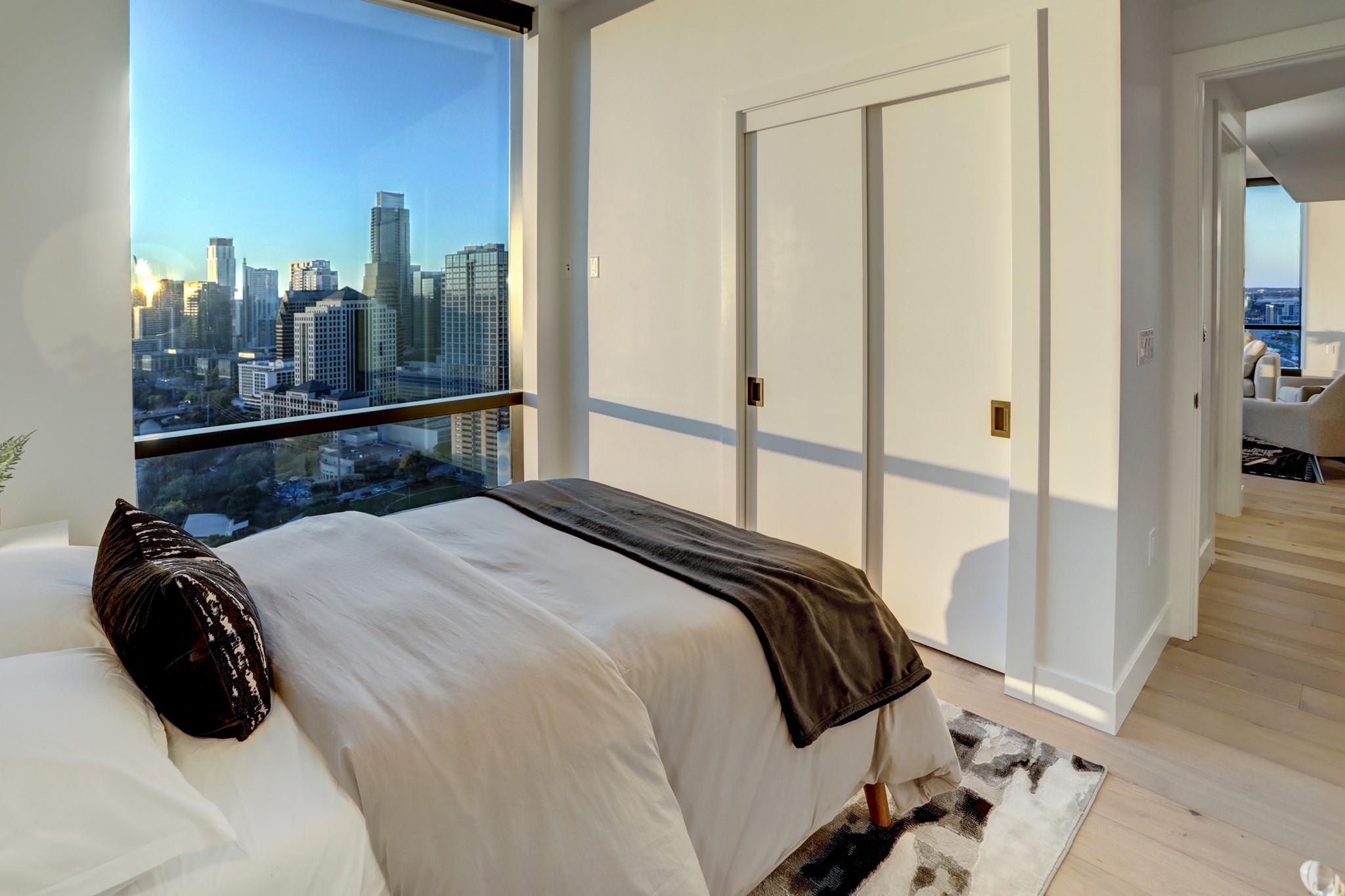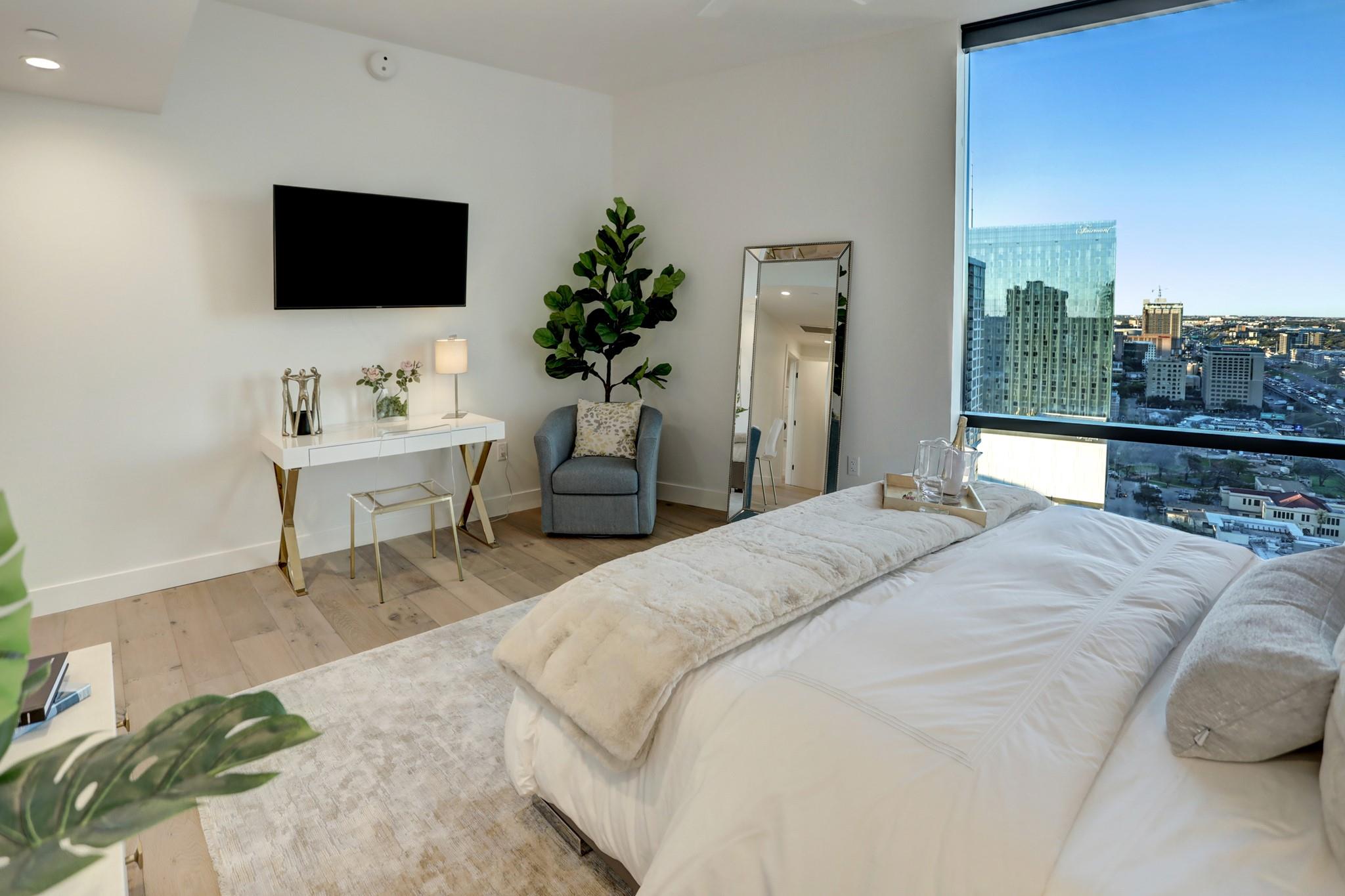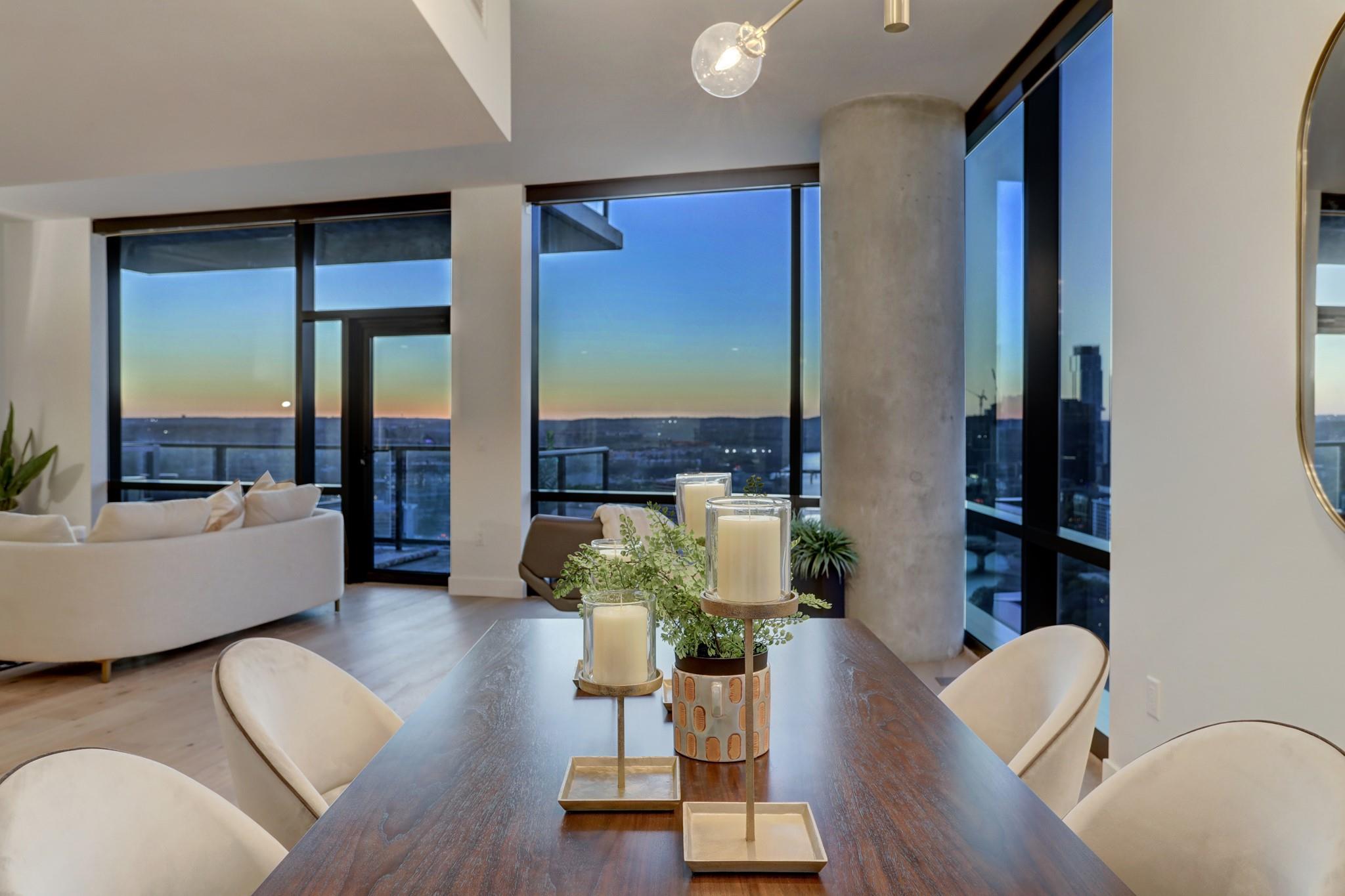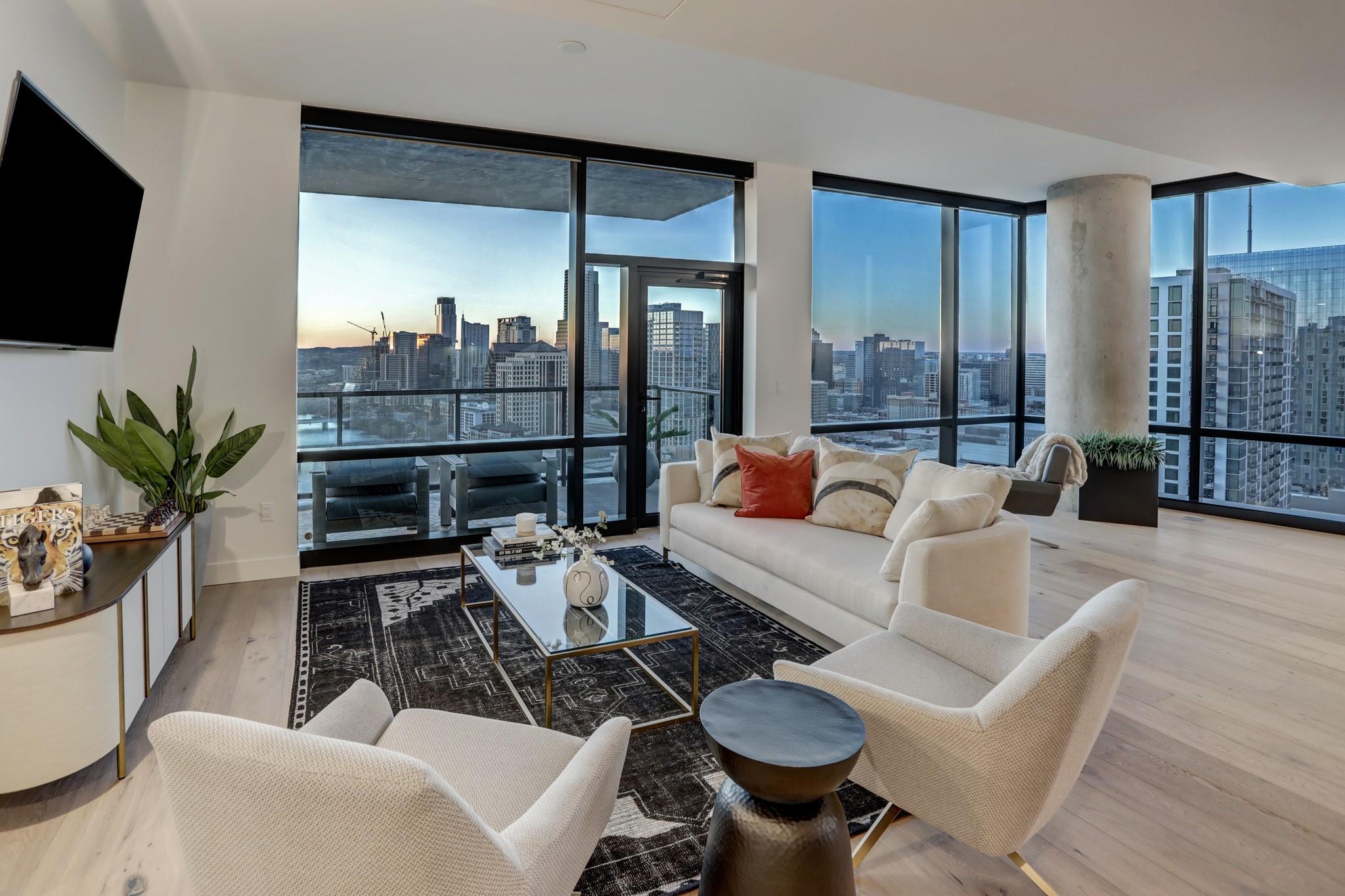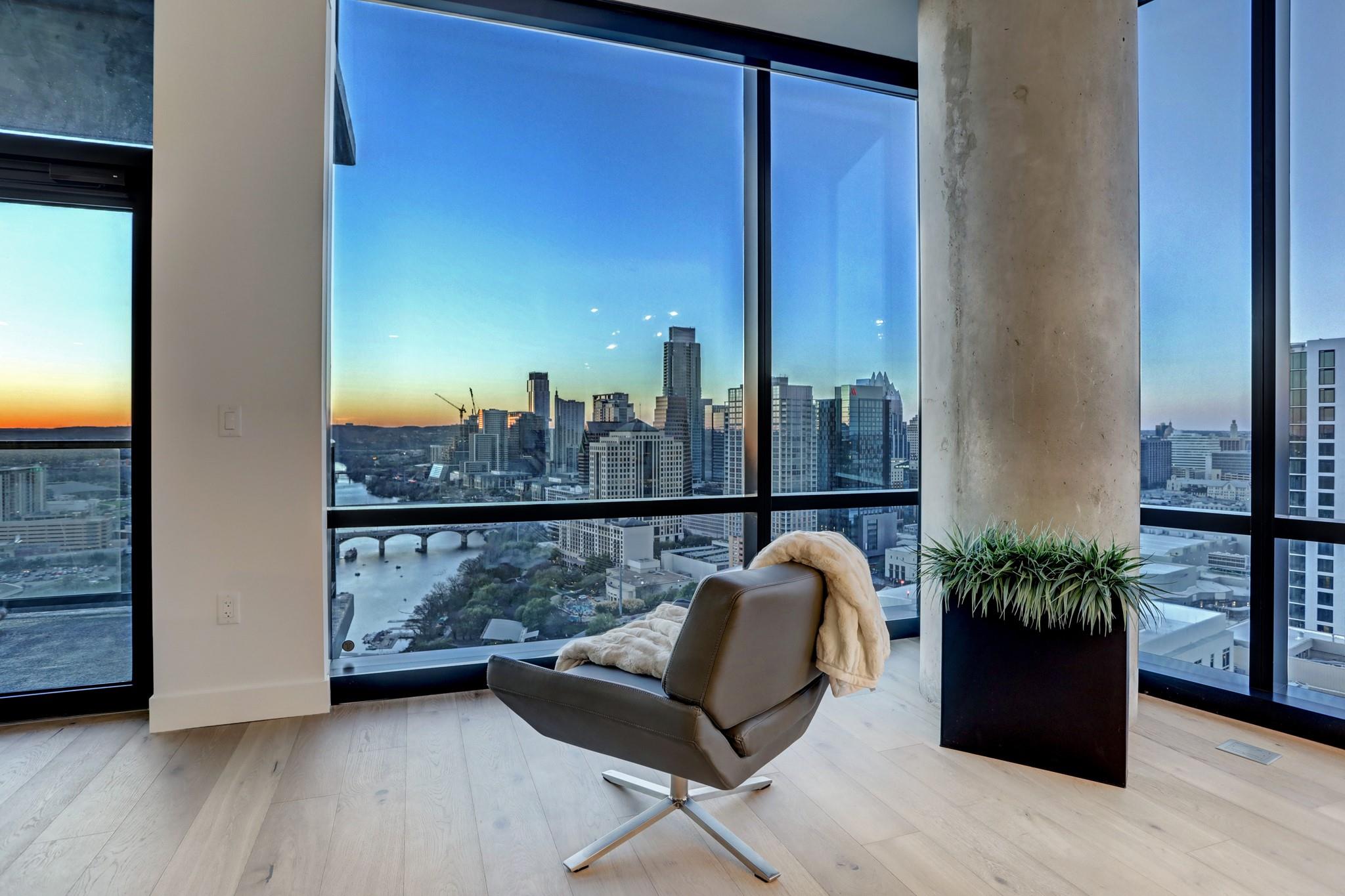 Located in the Rainey Street Historic District, 70 Rainey is the definition of luxury. With dedicated 24/7 Concierge, the building offers over 31,000 sq ft of total amenity space. On the 10th floor, there's a 2,200 sq ft fitness center that rivals premier fitness establishments, boasting a steam shower and dry-heat sauna. In addition to the fitness center, is a 72 ft long infinity pool directly overlooking Lady bird lake and downtown Austin. Imagine bbq social hours at the deck's outdoor lounge that has fire pits, grill-equipped kitchen and pool side cabanas. Situated on the 26th floor with panoramic views of lady bird lake and downtown Austin, the 3 bedroom, 3 bath 2179 sq feet residence with a private balcony, features contemporary high end finishes with clean lines, classic elegance, and organic elements. The condo has great natural light coming through the 'floor to ceiling' windows which are equipped with remote controlled motorized solar shades.