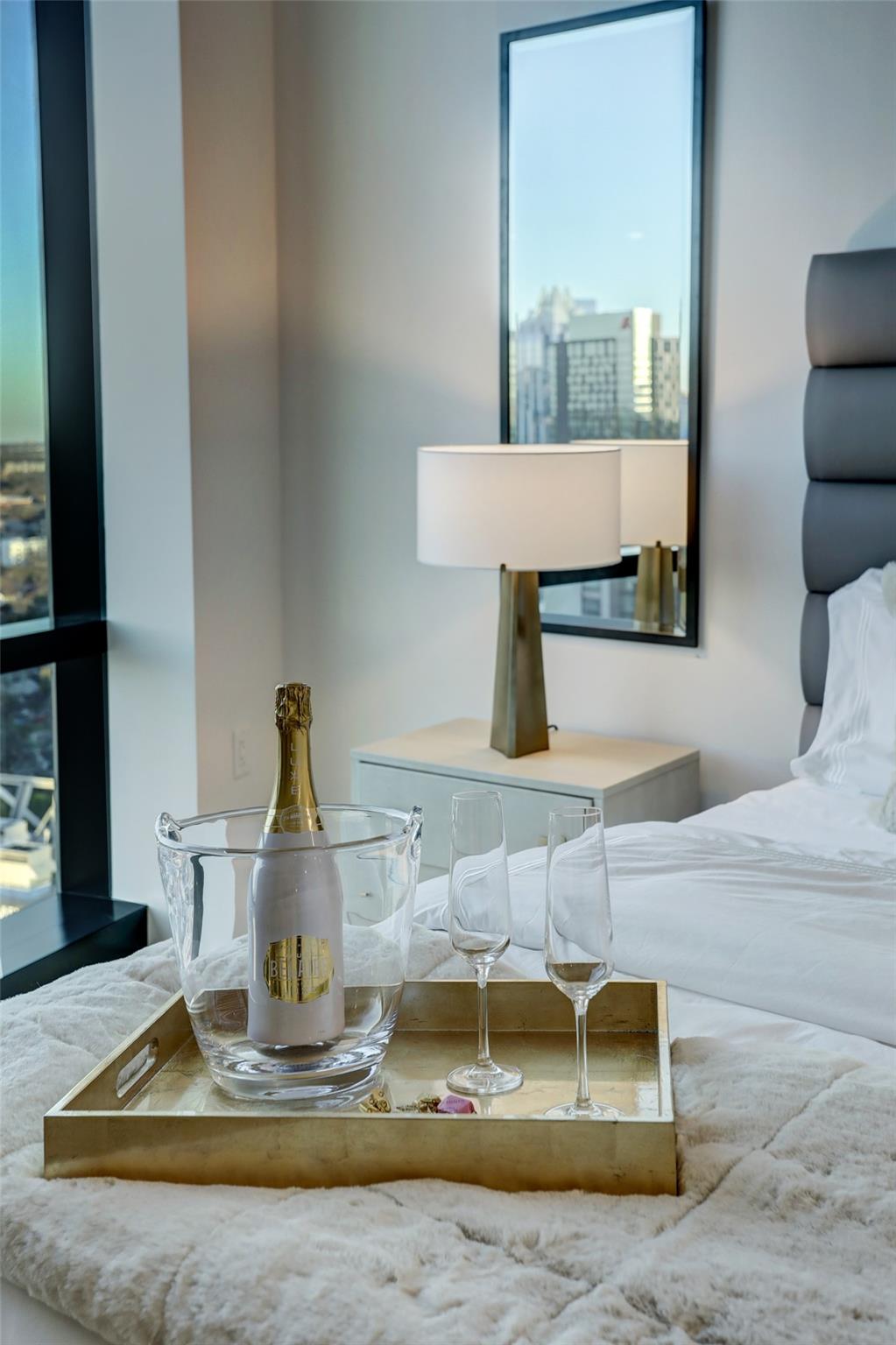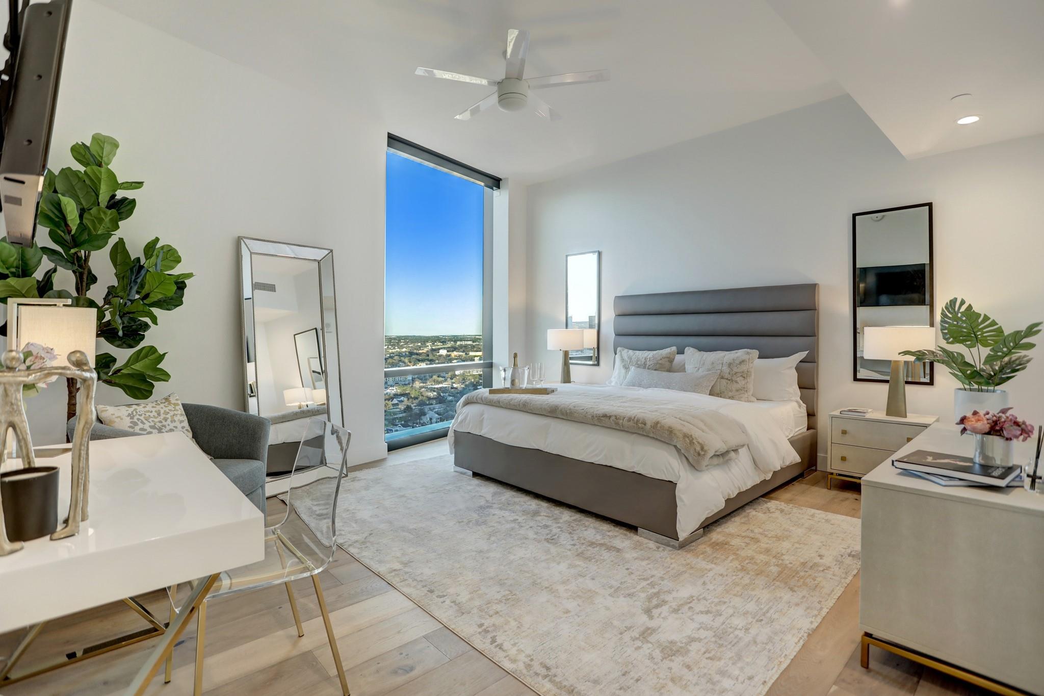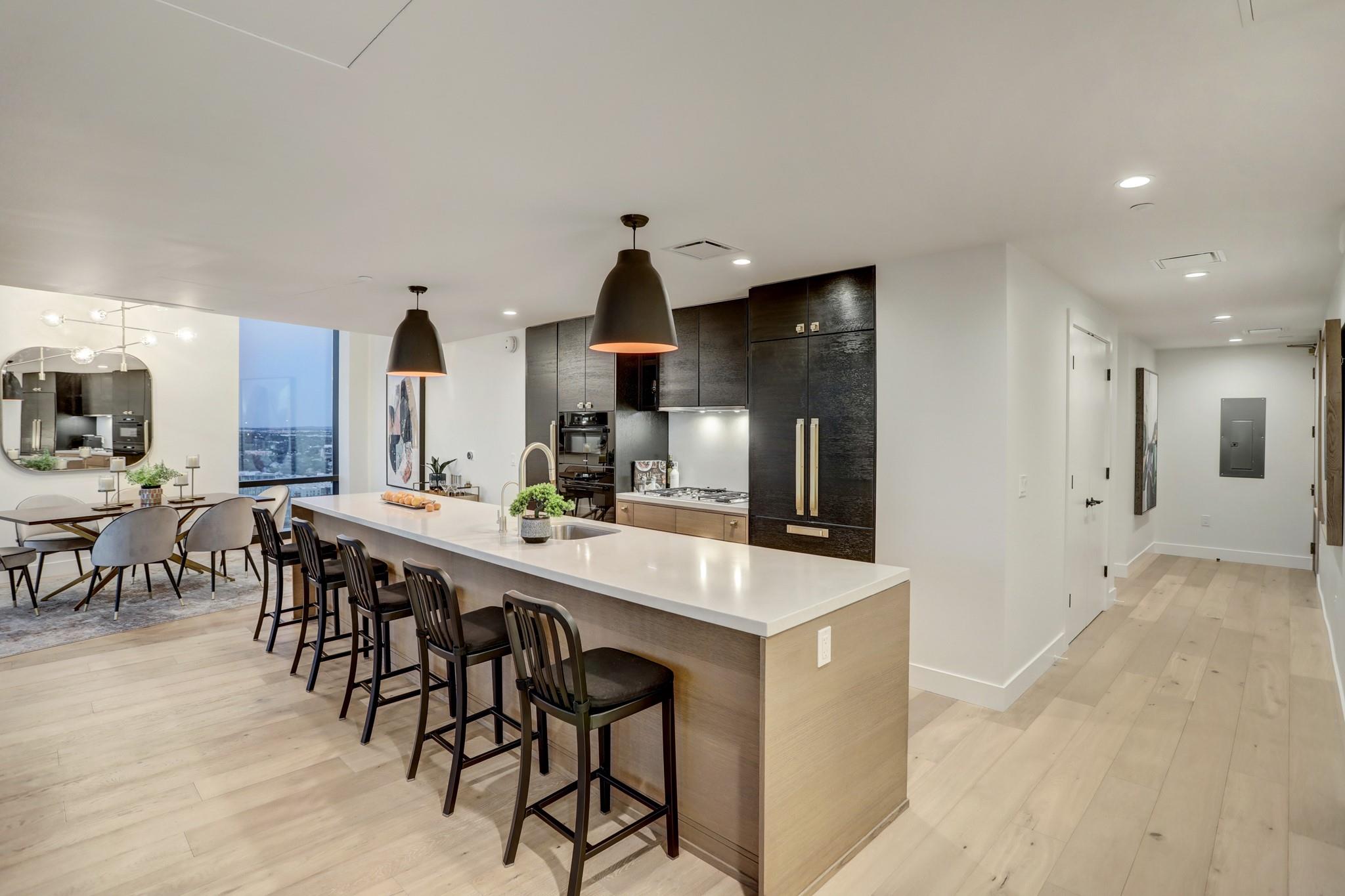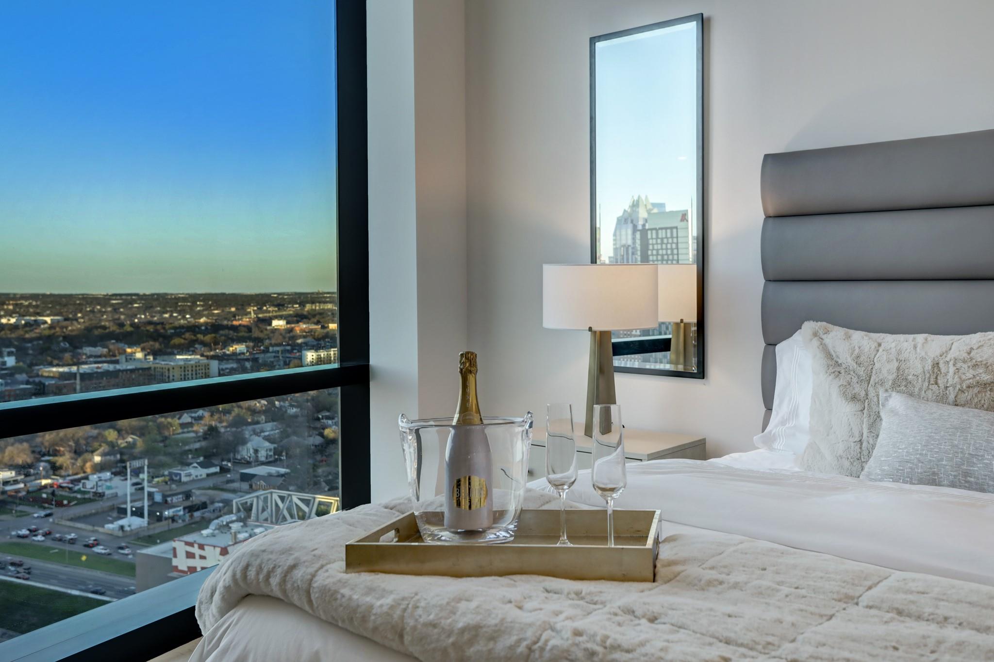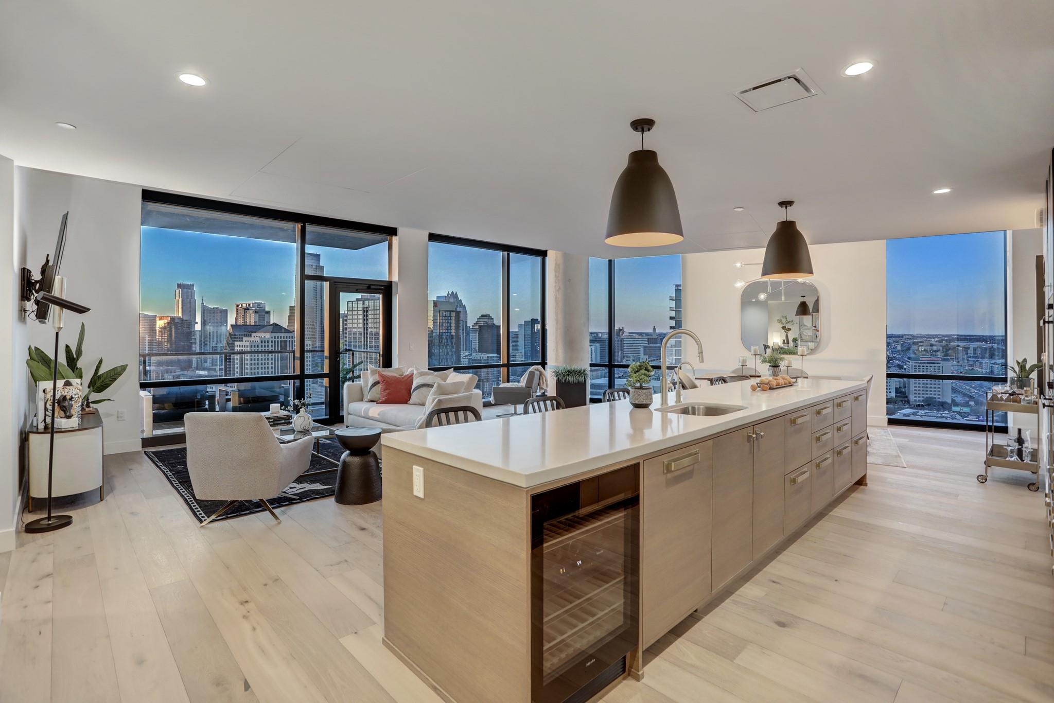 Located in the Rainey Street Historic District, 70 Rainey is the definition of luxury. With dedicated 24/7 Concierge, the building offers over 31,000 sq ft of total amenity space. On the 10th floor, there's a 2,200 sq ft fitness center that rivals premier fitness establishments, boasting a steam shower and dry-heat sauna. In addition to the fitness center, is a 72 ft long infinity pool directly overlooking Lady bird lake and downtown Austin. Imagine bbq social hours at the deck's outdoor lounge that has fire pits, grill-equipped kitchen and pool side cabanas. Situated on the 26th floor with panoramic views of lady bird lake and downtown Austin, the 3 bedroom, 3 bath 2179 sq feet residence with a private balcony, features contemporary high end finishes with clean lines, classic elegance, and organic elements. The condo has great natural light coming through the 'floor to ceiling' windows which are equipped with remote controlled motorized solar shades.