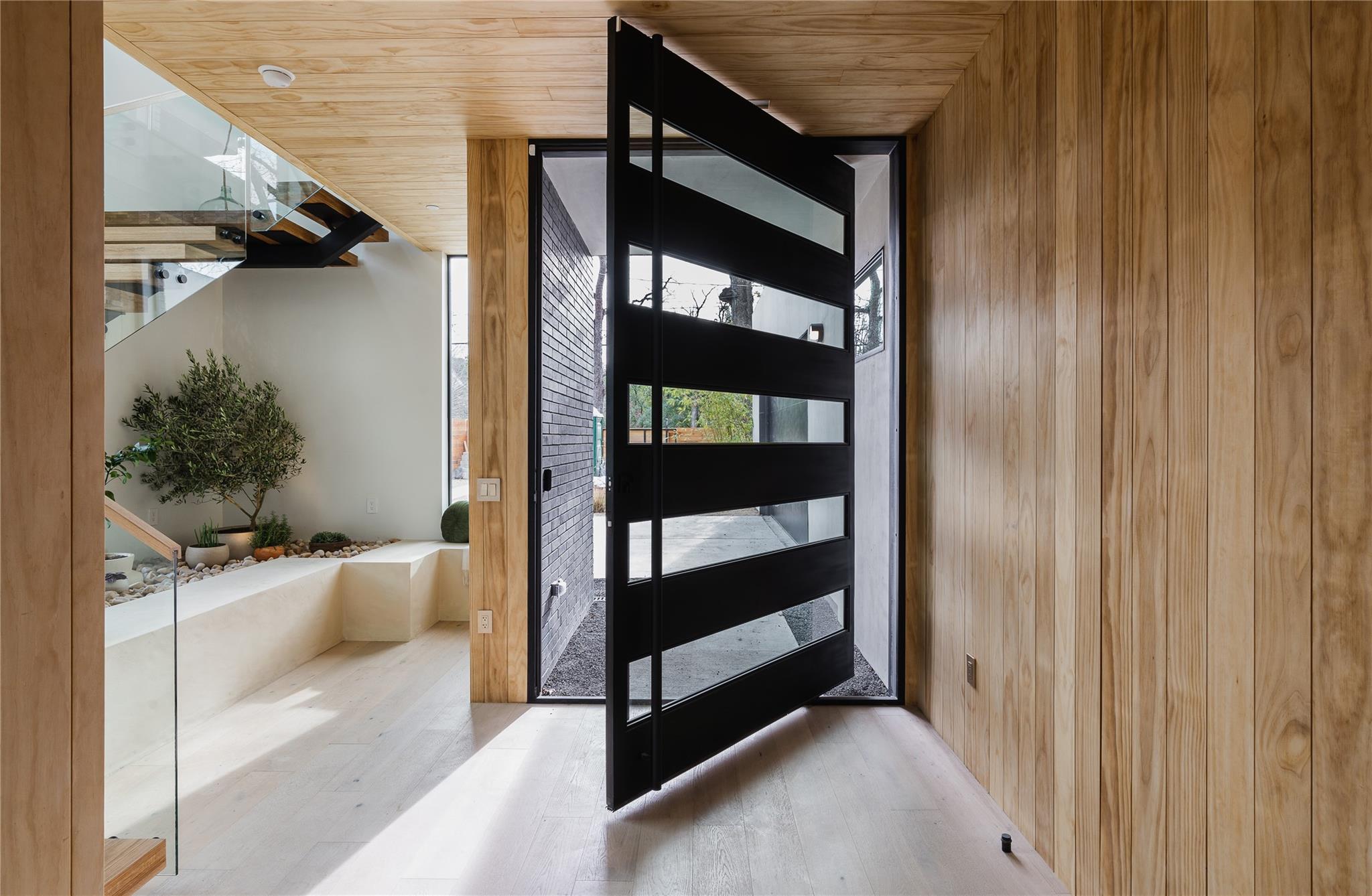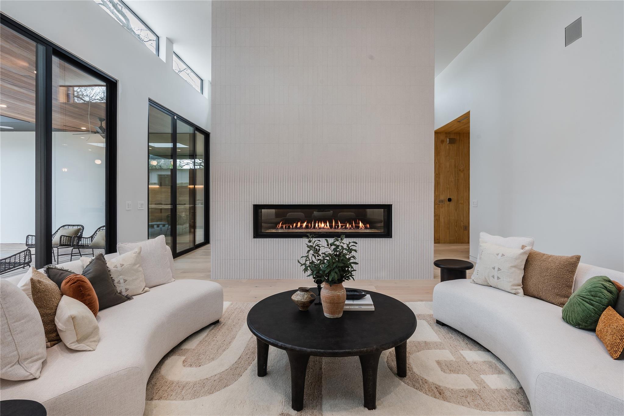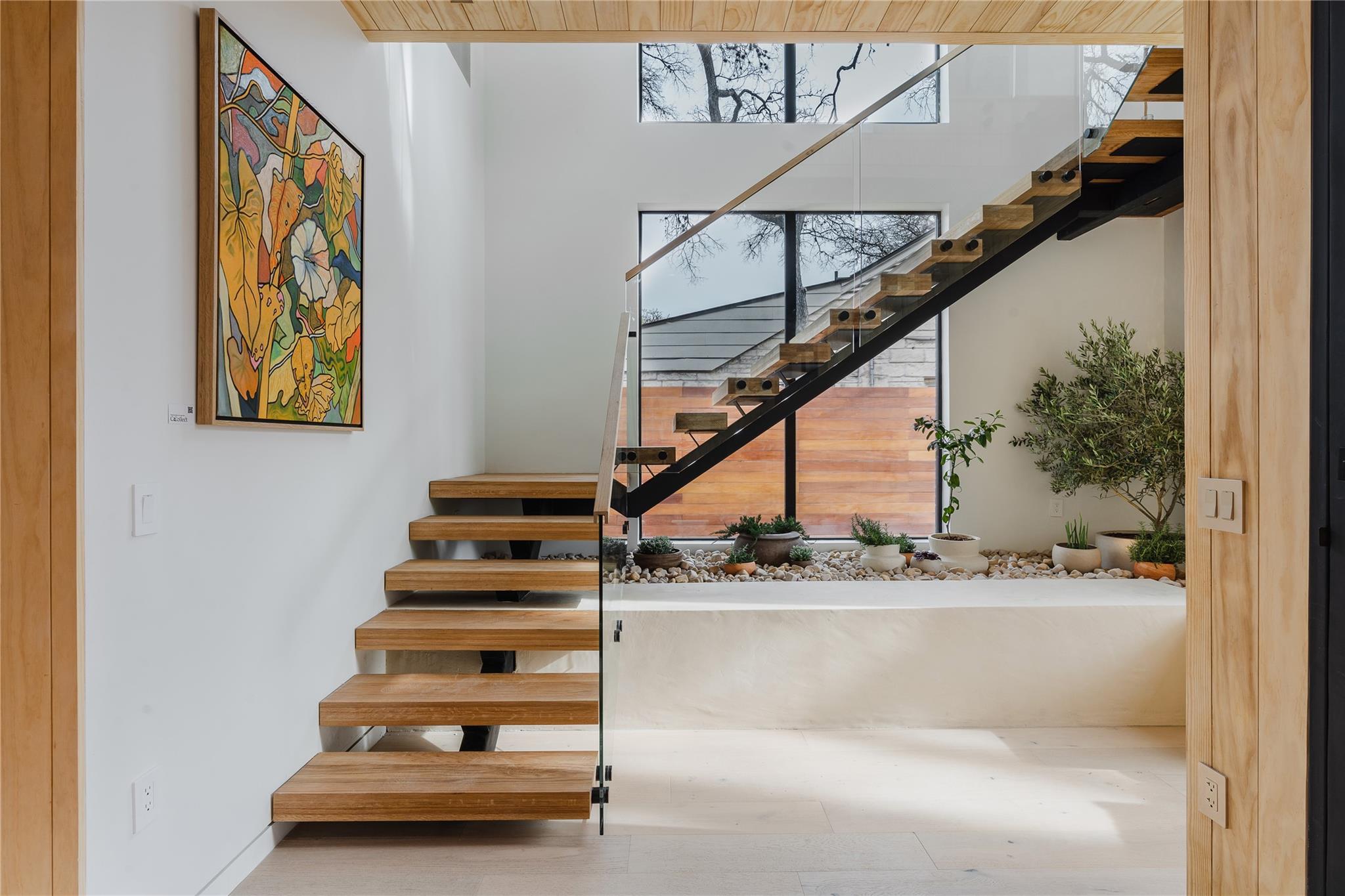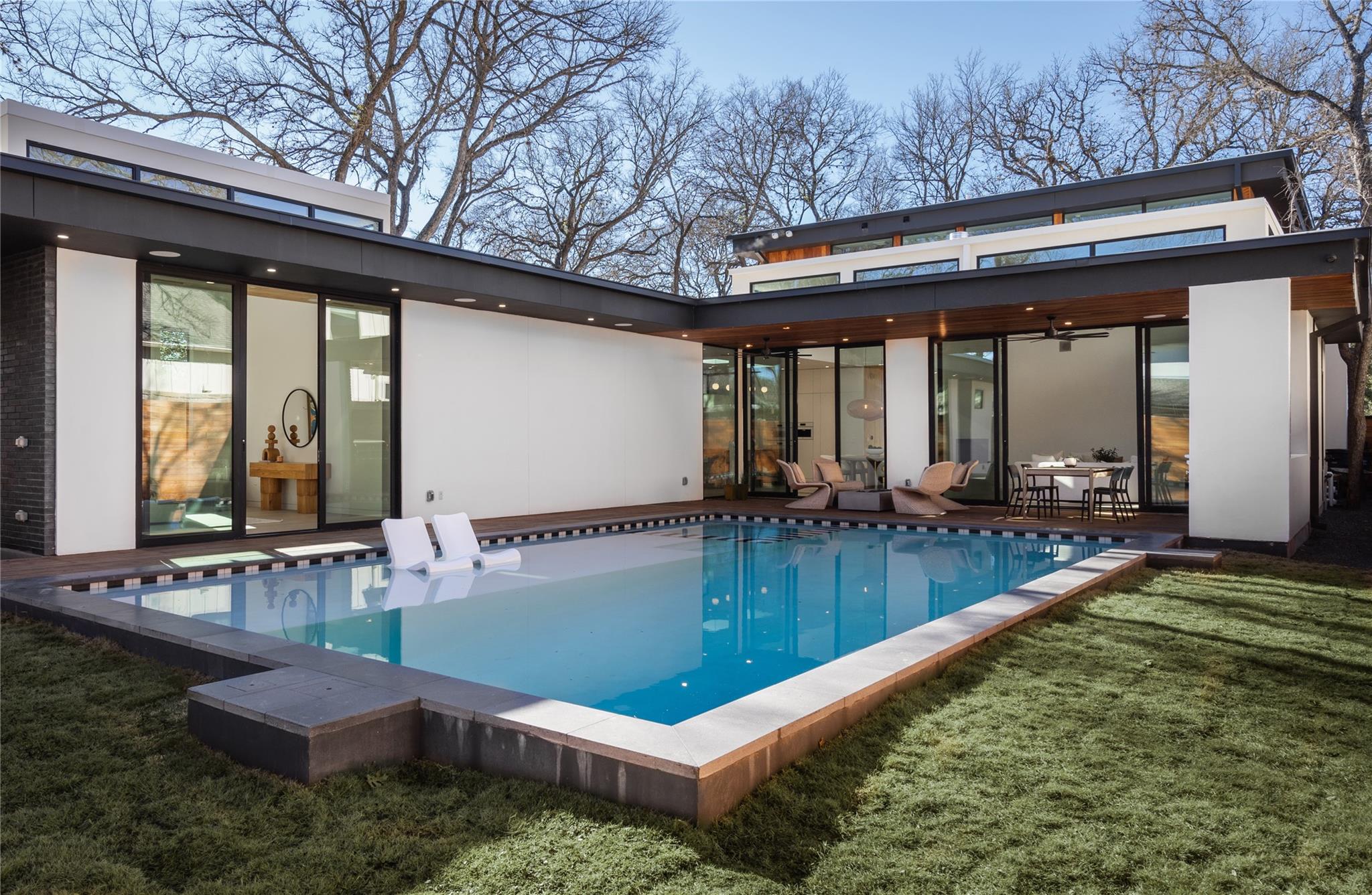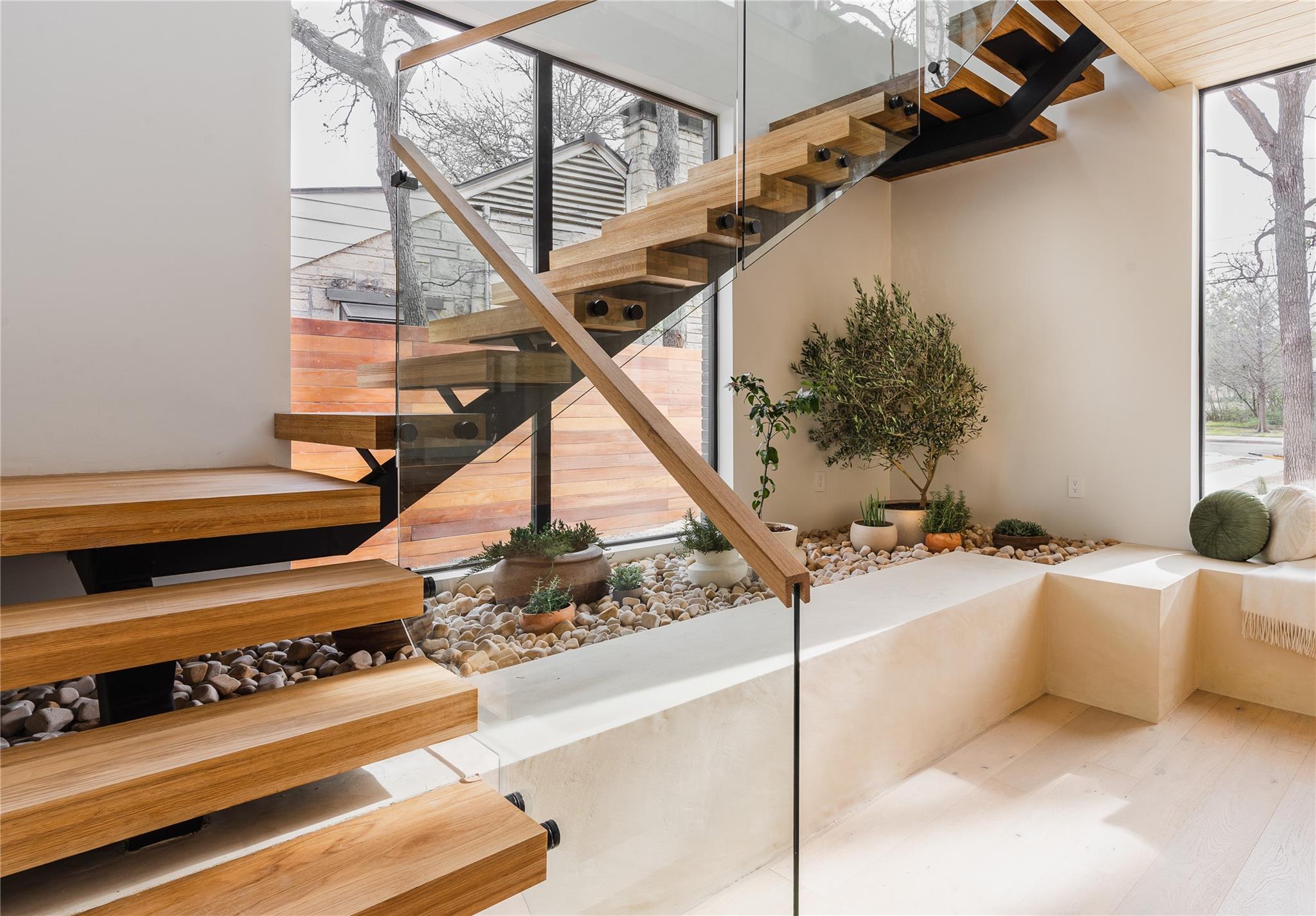 Welcome to 3214 Windsor Road, an architectural masterpiece nestled in Austin's prestigious Tarrytown neighborhood. Crafted by visionary architect Davey McEathron, and brought to life by the reputable LBF Homes, this Mediterranean-inspired gem harmoniously combines elegance and modern comfort. Spread over a generous 0.25-acre lot, this 5-bedroom, 4.5-bathroom residence spans 3,996 sqft of meticulously designed living space. The journey begins at the custom steel and glass single pivot front door, an impressive 10 ft tall, leading you into a world of refinement. Inside, level 5 drywall meets striking Accoya wood accents throughout, creating an atmosphere that exudes luxury and sophistication. The chef's kitchen, equipped with a top-notch Miele appliance package and a 10 ft Brazilian quartzite waterfall island, seamlessly flows into the open-concept layout, enhanced by flush-mounted doors and can lights. Skylights above the kitchen island allow natural light to beam in as you entertain from the kitchen. A double-sided tile wrapped gas fireplace, floor to ceiling, splits the living and dining rooms, offering a warm focal point that ties the spaces together. Ascending the floating staircase with glass railing and white oak treads, you'll find an upper level drenched in natural light as well as an indoor garden below the stairs. The interior design by Begonia Barbancho Design reflects meticulous attention to detail, with hand-selected tile and lighting fixtures that add character. Step outside to the sprawling landscape, featuring a Garapa wood covered deck, perimeter fencing, and a built-in outdoor kitchen and fireplace. Luxuriate in the heated pool and jacuzzi, and enjoy the added convenience of the outdoor shower and bathroom. The exterior's harmonious blend of stucco, brick, metal, and Garapa wood accents completes the Mediterranean allure.