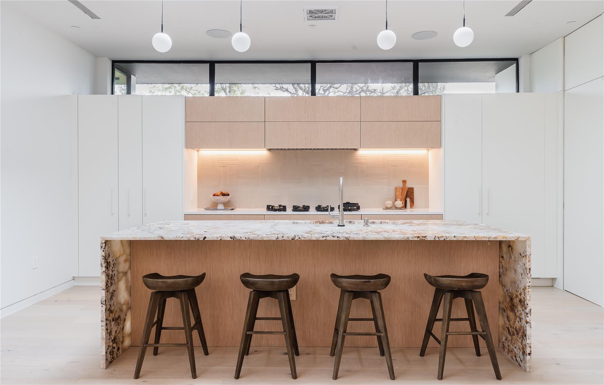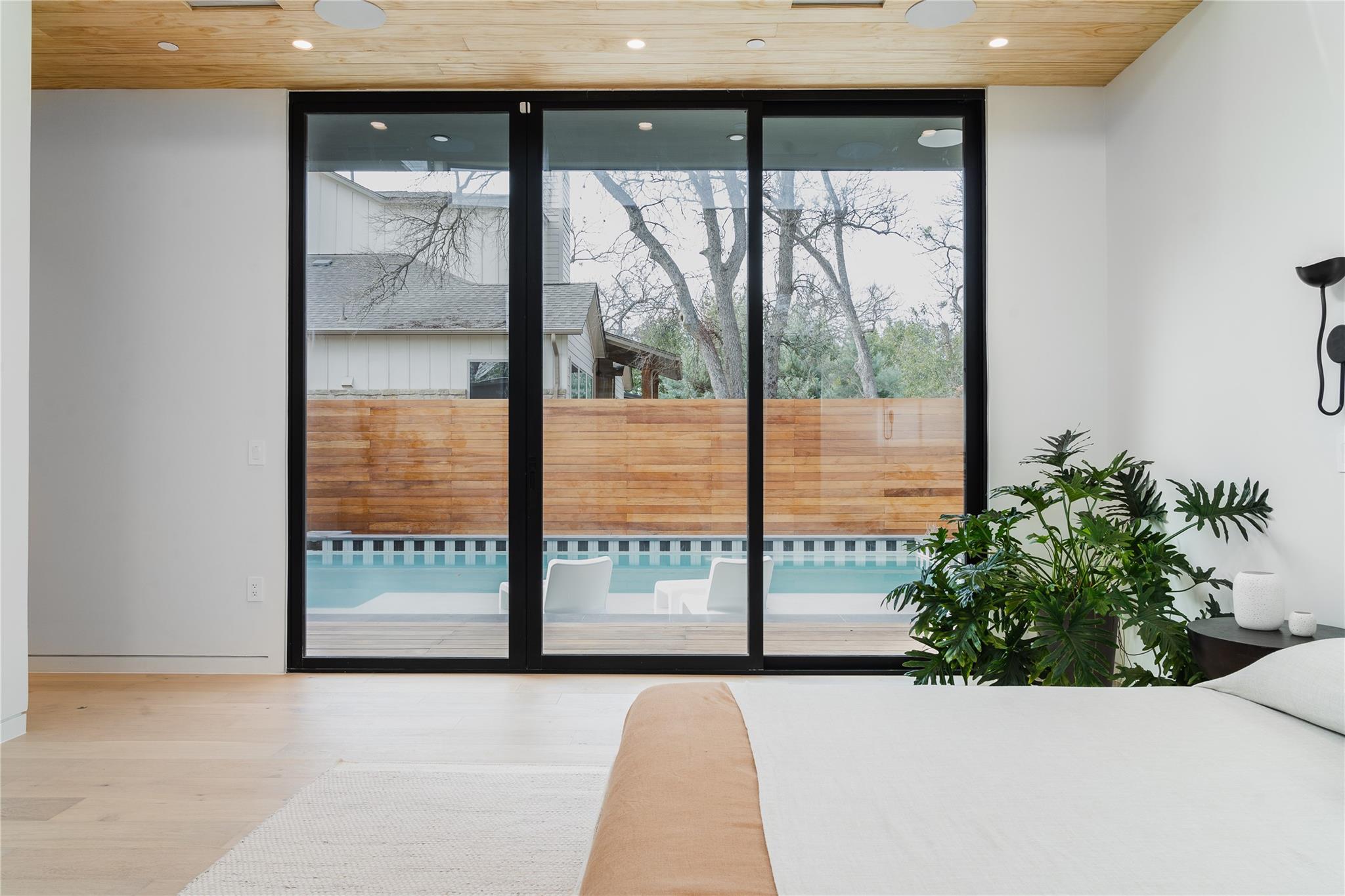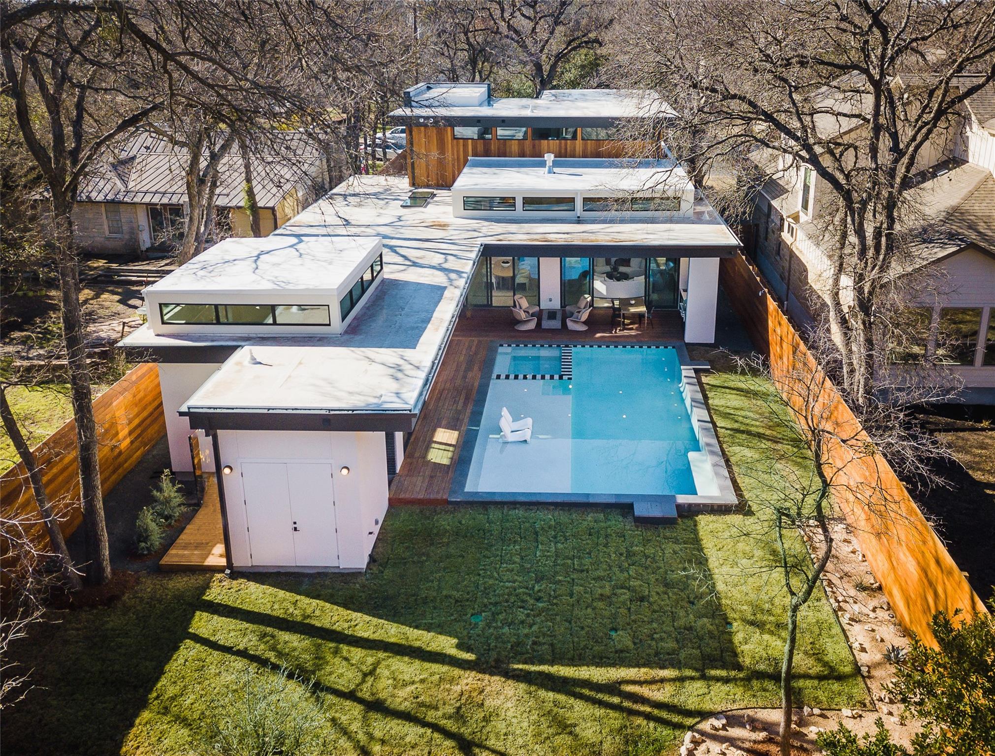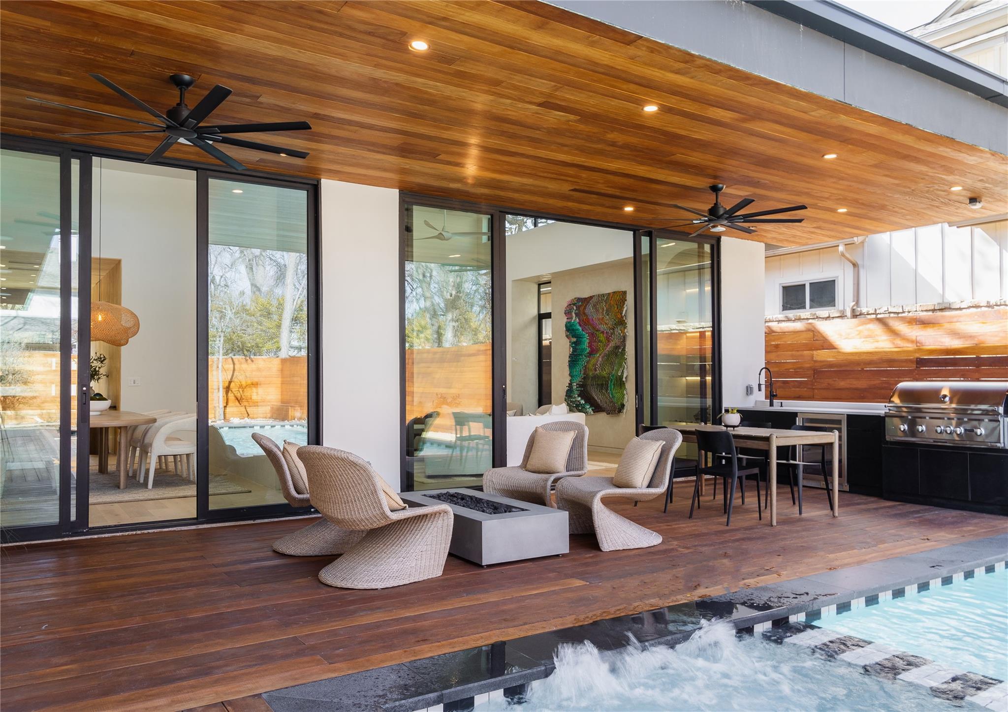 Welcome to 3214 Windsor Road, an architectural masterpiece nestled in Austin's prestigious Tarrytown neighborhood. Crafted by visionary architect Davey McEathron, and brought to life by the reputable LBF Homes, this Mediterranean-inspired gem harmoniously combines elegance and modern comfort. Spread over a generous 0.25-acre lot, this 5-bedroom, 4.5-bathroom residence spans 3,996 sqft of meticulously designed living space. The journey begins at the custom steel and glass single pivot front door, an impressive 10 ft tall, leading you into a world of refinement. Inside, level 5 drywall meets striking Accoya wood accents throughout, creating an atmosphere that exudes luxury and sophistication. The chef's kitchen, equipped with a top-notch Miele appliance package and a 10 ft Brazilian quartzite waterfall island, seamlessly flows into the open-concept layout, enhanced by flush-mounted doors and can lights. Skylights above the kitchen island allow natural light to beam in as you entertain from the kitchen. A double-sided tile wrapped gas fireplace, floor to ceiling, splits the living and dining rooms, offering a warm focal point that ties the spaces together. Ascending the floating staircase with glass railing and white oak treads, you'll find an upper level drenched in natural light as well as an indoor garden below the stairs. The interior design by Begonia Barbancho Design reflects meticulous attention to detail, with hand-selected tile and lighting fixtures that add character. Step outside to the sprawling landscape, featuring a Garapa wood covered deck, perimeter fencing, and a built-in outdoor kitchen and fireplace. Luxuriate in the heated pool and jacuzzi, and enjoy the added convenience of the outdoor shower and bathroom. The exterior's harmonious blend of stucco, brick, metal, and Garapa wood accents completes the Mediterranean allure.