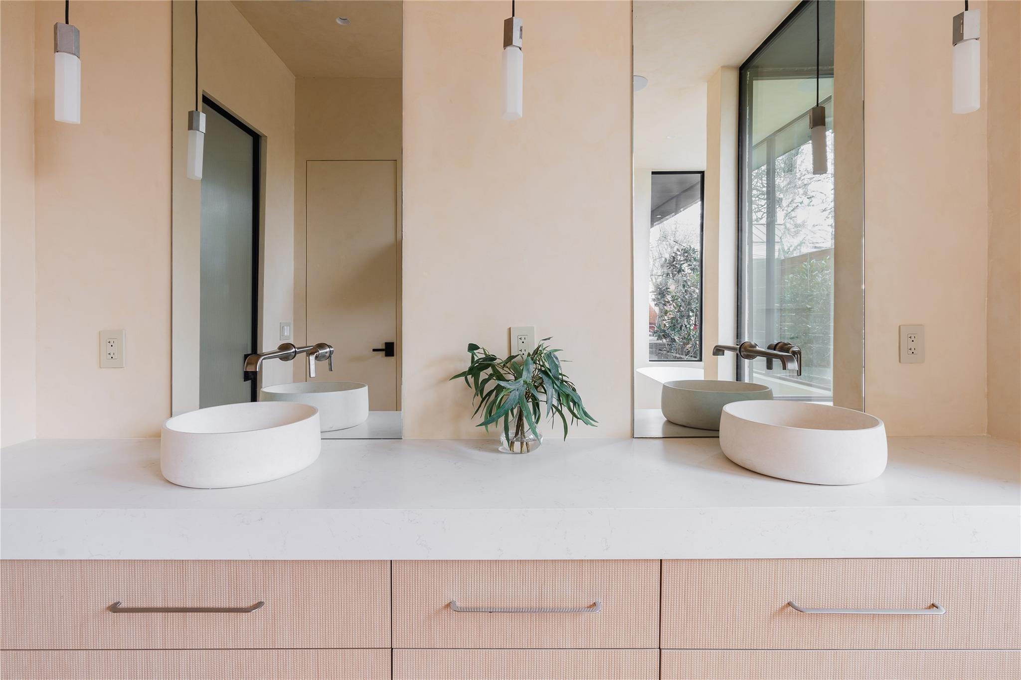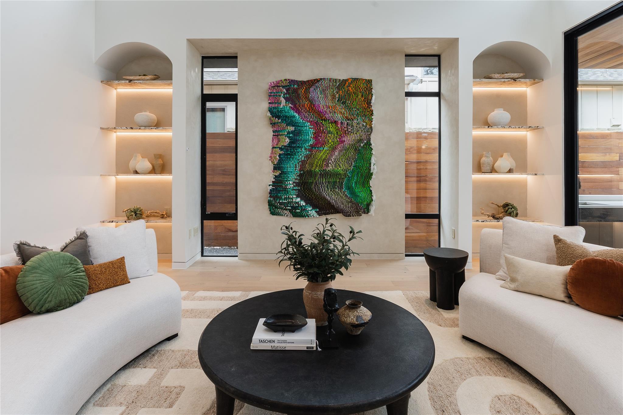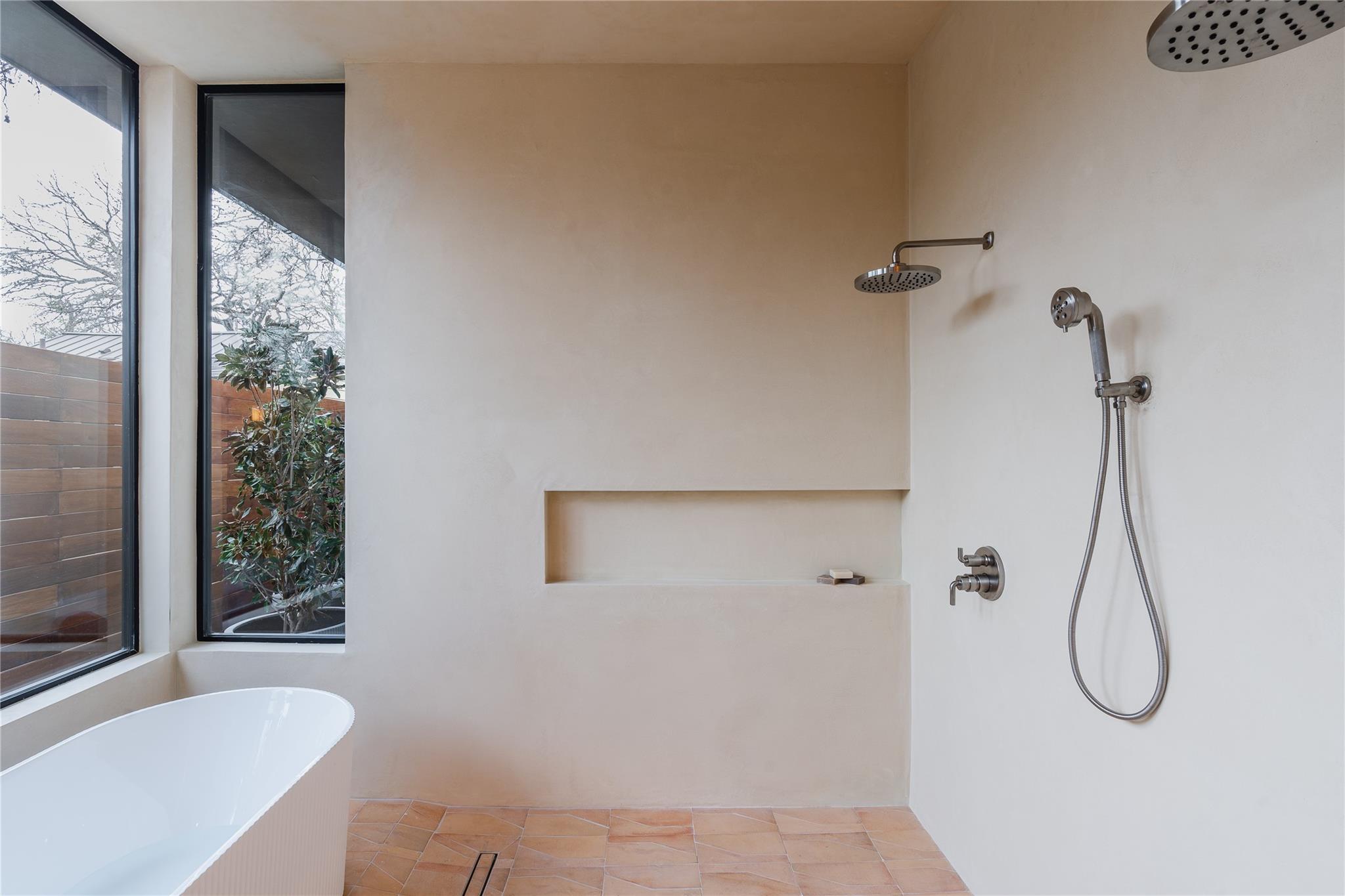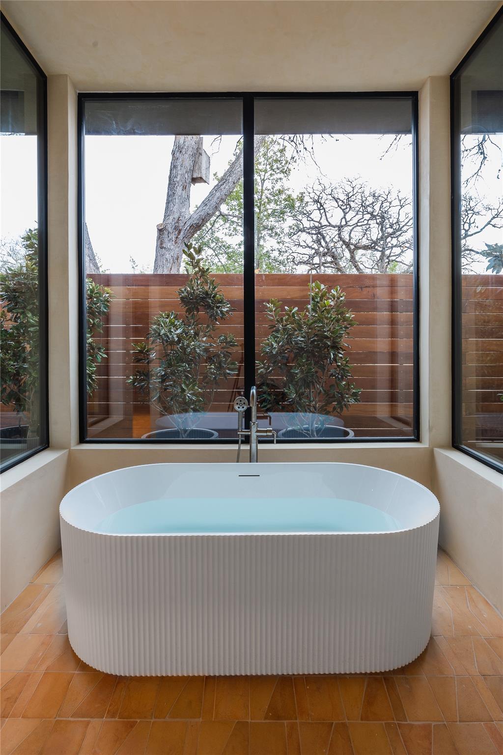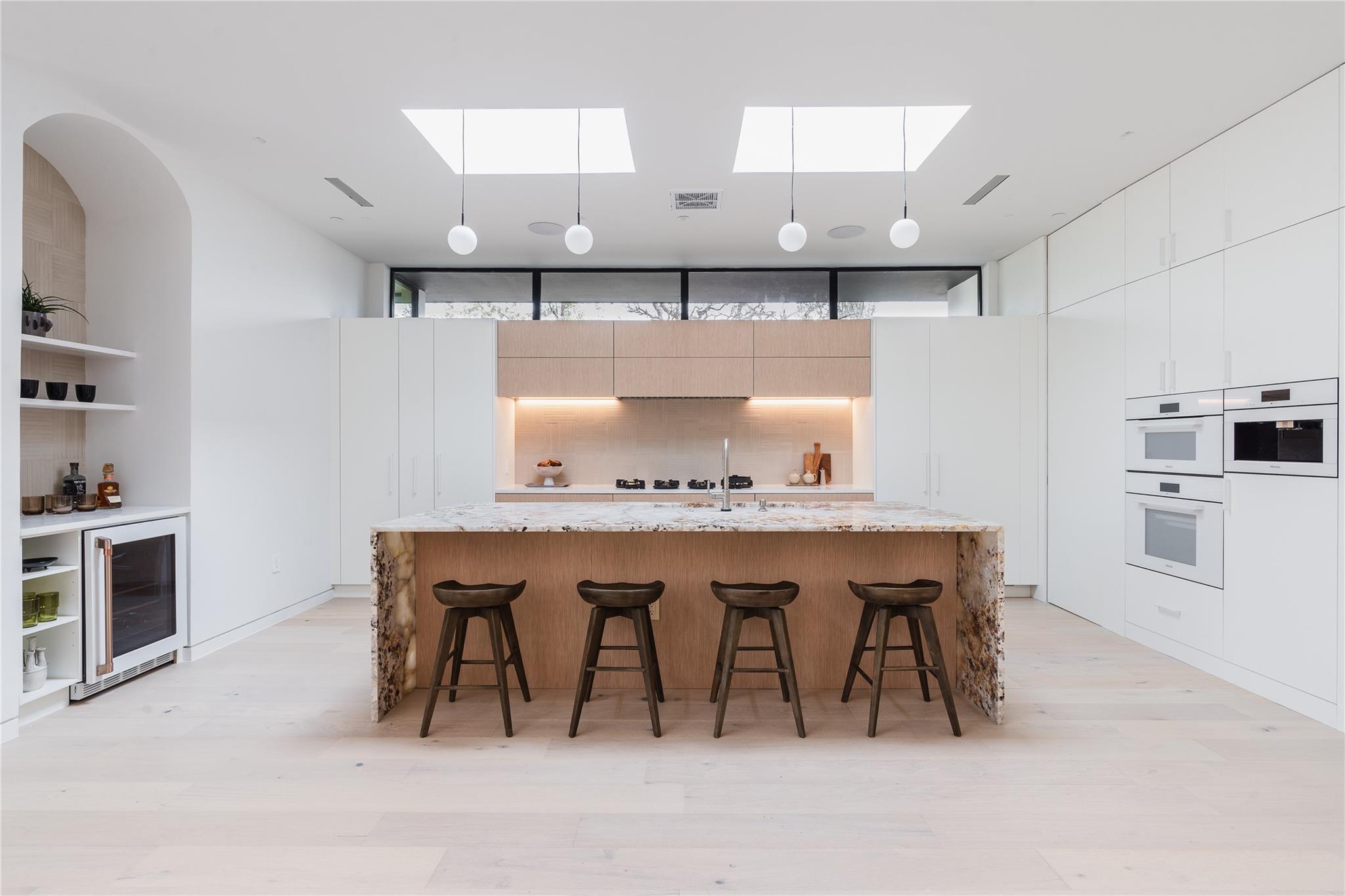 Welcome to 3214 Windsor Road, an architectural masterpiece nestled in Austin's prestigious Tarrytown neighborhood. Crafted by visionary architect Davey McEathron, and brought to life by the reputable LBF Homes, this Mediterranean-inspired gem harmoniously combines elegance and modern comfort. Spread over a generous 0.25-acre lot, this 5-bedroom, 4.5-bathroom residence spans 3,996 sqft of meticulously designed living space. The journey begins at the custom steel and glass single pivot front door, an impressive 10 ft tall, leading you into a world of refinement. Inside, level 5 drywall meets striking Accoya wood accents throughout, creating an atmosphere that exudes luxury and sophistication. The chef's kitchen, equipped with a top-notch Miele appliance package and a 10 ft Brazilian quartzite waterfall island, seamlessly flows into the open-concept layout, enhanced by flush-mounted doors and can lights. Skylights above the kitchen island allow natural light to beam in as you entertain from the kitchen. A double-sided tile wrapped gas fireplace, floor to ceiling, splits the living and dining rooms, offering a warm focal point that ties the spaces together. Ascending the floating staircase with glass railing and white oak treads, you'll find an upper level drenched in natural light as well as an indoor garden below the stairs. The interior design by Begonia Barbancho Design reflects meticulous attention to detail, with hand-selected tile and lighting fixtures that add character. Step outside to the sprawling landscape, featuring a Garapa wood covered deck, perimeter fencing, and a built-in outdoor kitchen and fireplace. Luxuriate in the heated pool and jacuzzi, and enjoy the added convenience of the outdoor shower and bathroom. The exterior's harmonious blend of stucco, brick, metal, and Garapa wood accents completes the Mediterranean allure.
