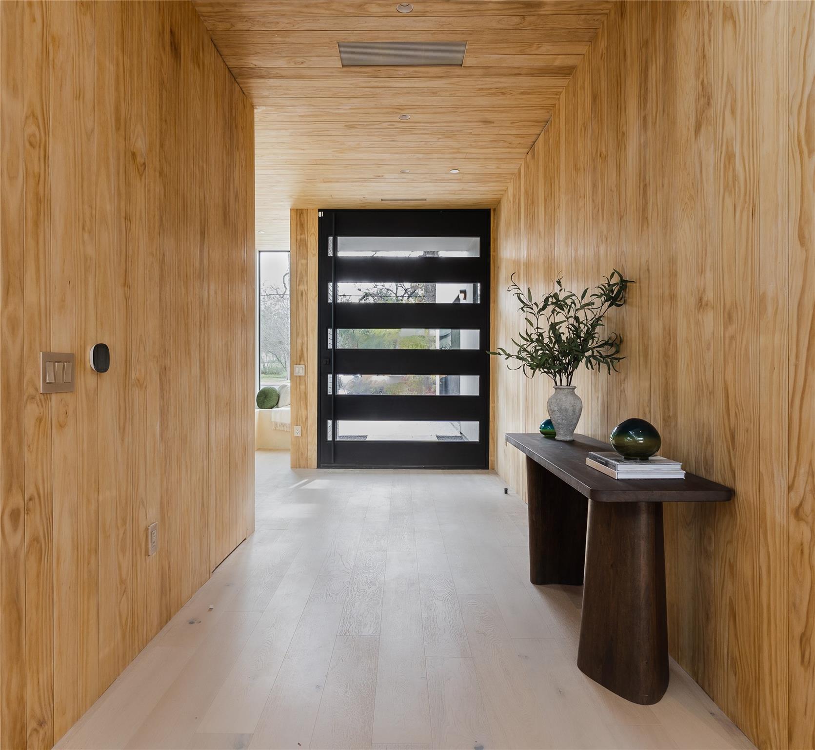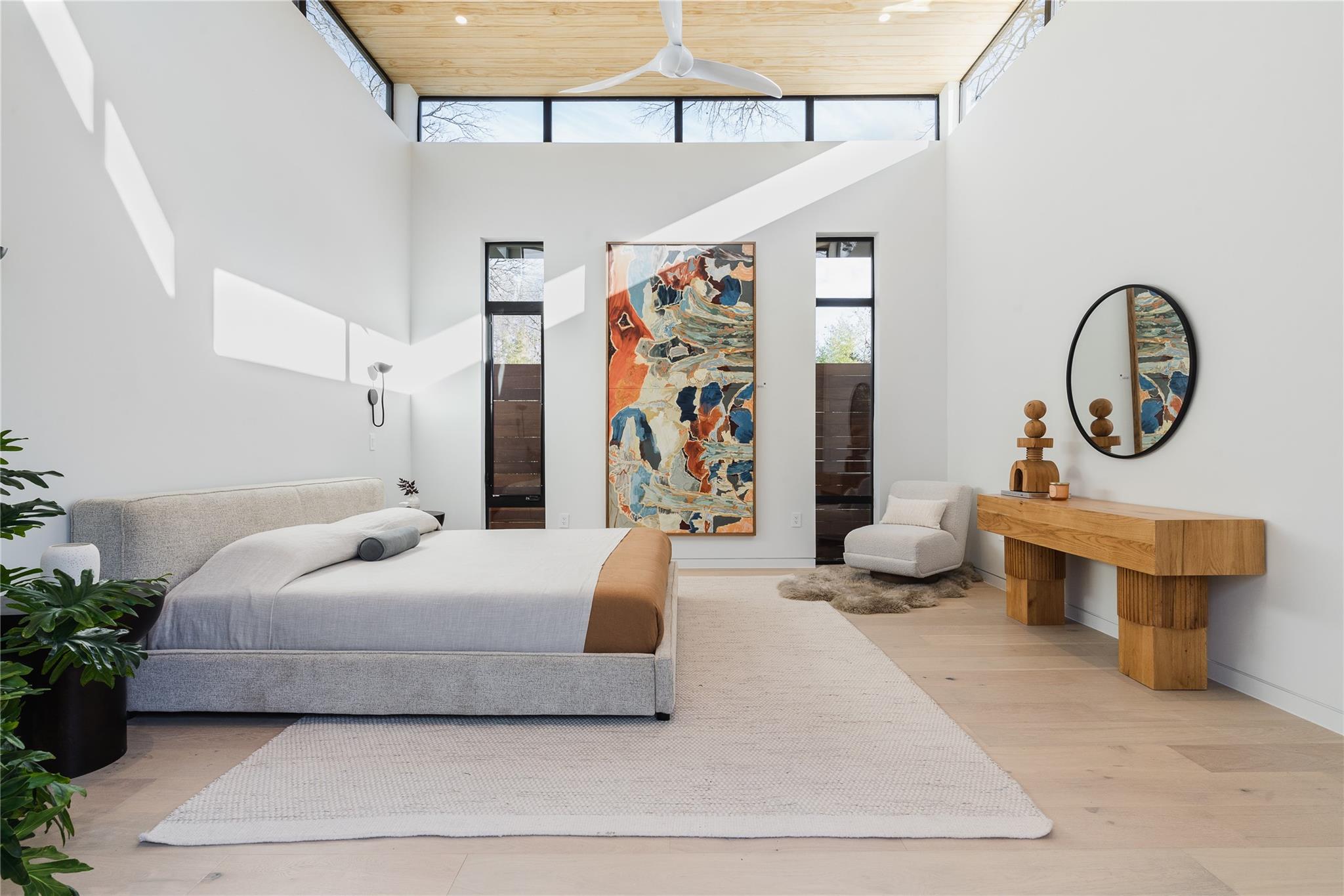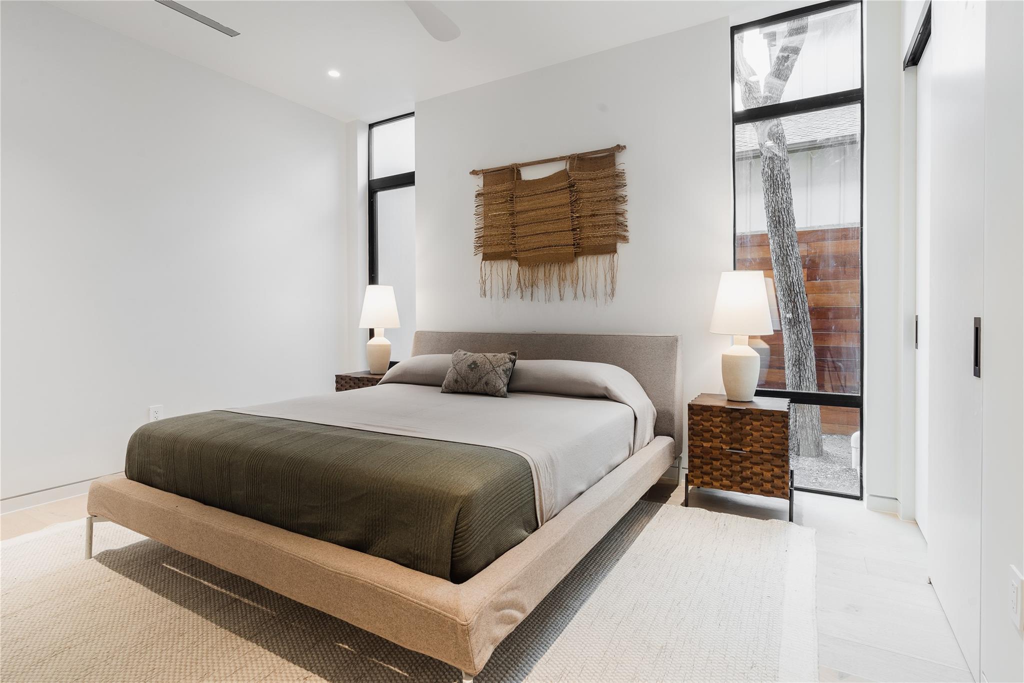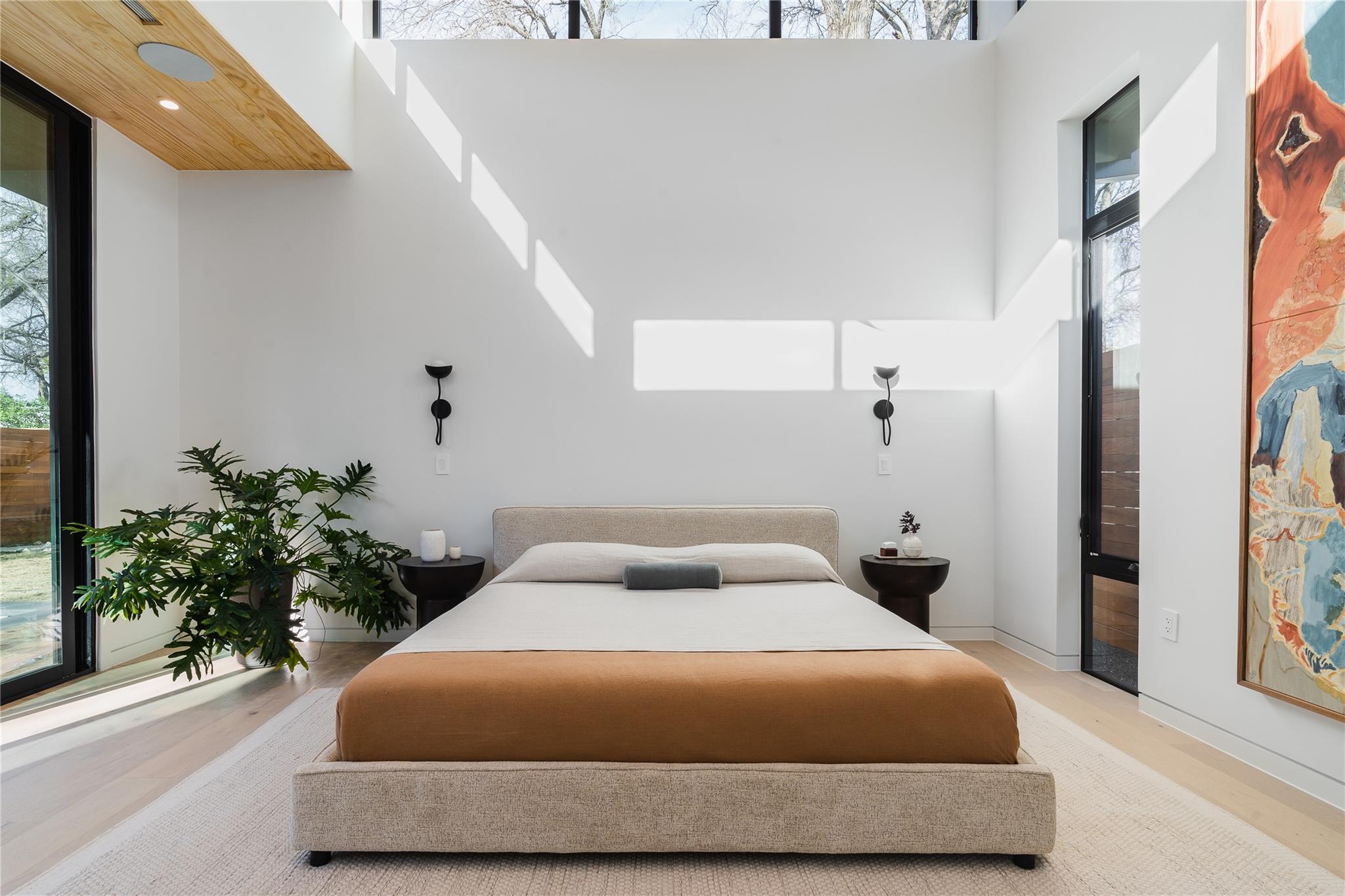 Welcome to 3214 Windsor Road, an architectural masterpiece nestled in Austin's prestigious Tarrytown neighborhood. Crafted by visionary architect Davey McEathron, and brought to life by the reputable LBF Homes, this Mediterranean-inspired gem harmoniously combines elegance and modern comfort. Spread over a generous 0.25-acre lot, this 5-bedroom, 4.5-bathroom residence spans 3,996 sqft of meticulously designed living space. The journey begins at the custom steel and glass single pivot front door, an impressive 10 ft tall, leading you into a world of refinement. Inside, level 5 drywall meets striking Accoya wood accents throughout, creating an atmosphere that exudes luxury and sophistication. The chef's kitchen, equipped with a top-notch Miele appliance package and a 10 ft Brazilian quartzite waterfall island, seamlessly flows into the open-concept layout, enhanced by flush-mounted doors and can lights. Skylights above the kitchen island allow natural light to beam in as you entertain from the kitchen. A double-sided tile wrapped gas fireplace, floor to ceiling, splits the living and dining rooms, offering a warm focal point that ties the spaces together. Ascending the floating staircase with glass railing and white oak treads, you'll find an upper level drenched in natural light as well as an indoor garden below the stairs. The interior design by Begonia Barbancho Design reflects meticulous attention to detail, with hand-selected tile and lighting fixtures that add character. Step outside to the sprawling landscape, featuring a Garapa wood covered deck, perimeter fencing, and a built-in outdoor kitchen and fireplace. Luxuriate in the heated pool and jacuzzi, and enjoy the added convenience of the outdoor shower and bathroom. The exterior's harmonious blend of stucco, brick, metal, and Garapa wood accents completes the Mediterranean allure.