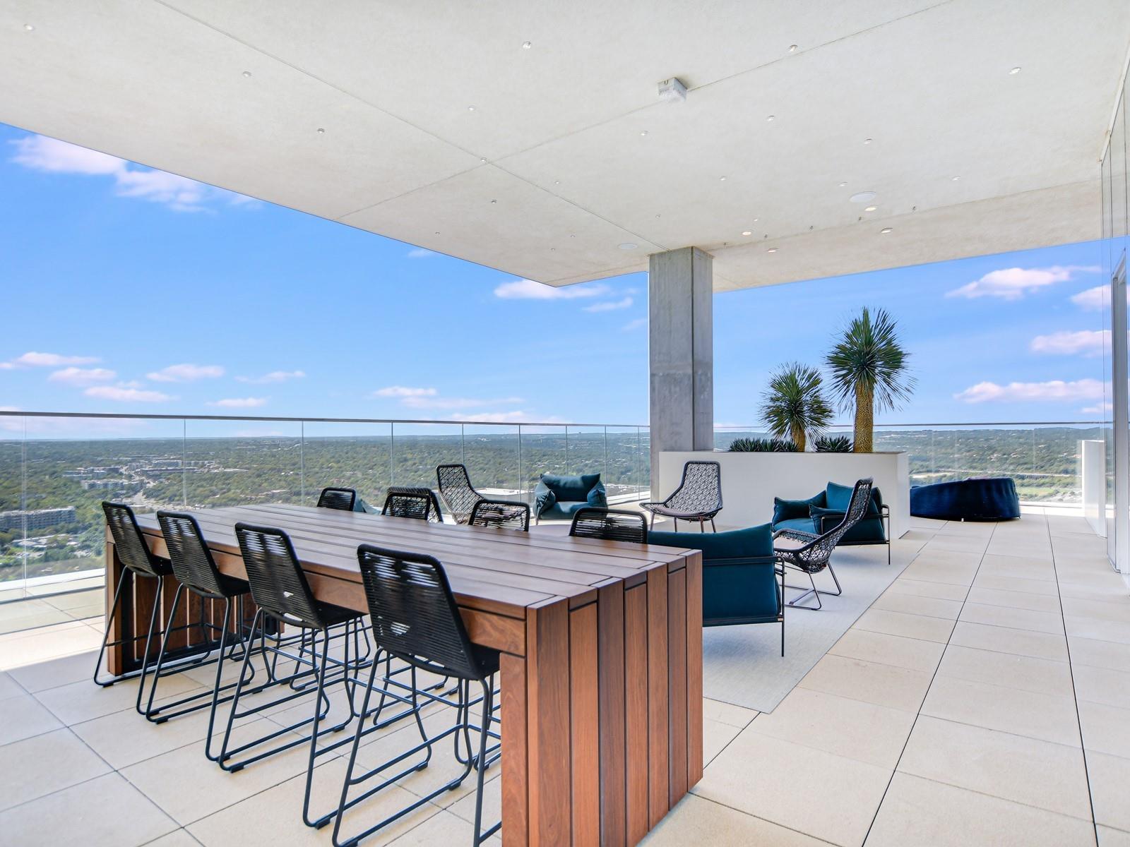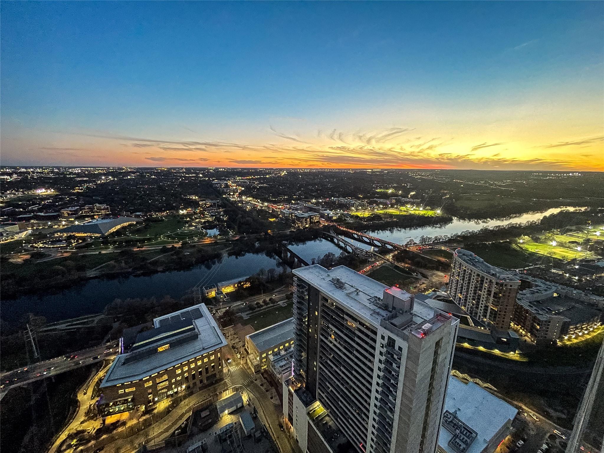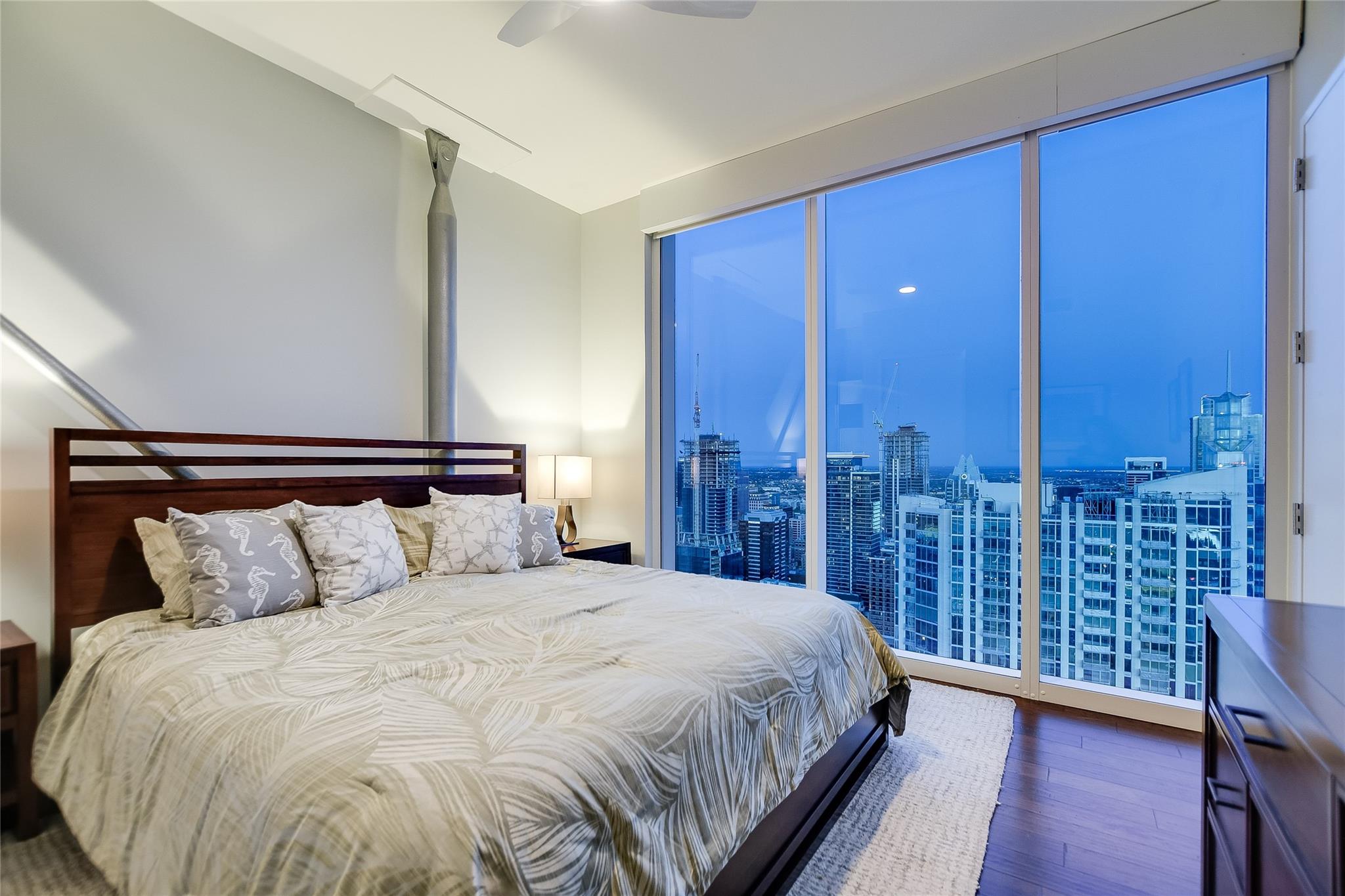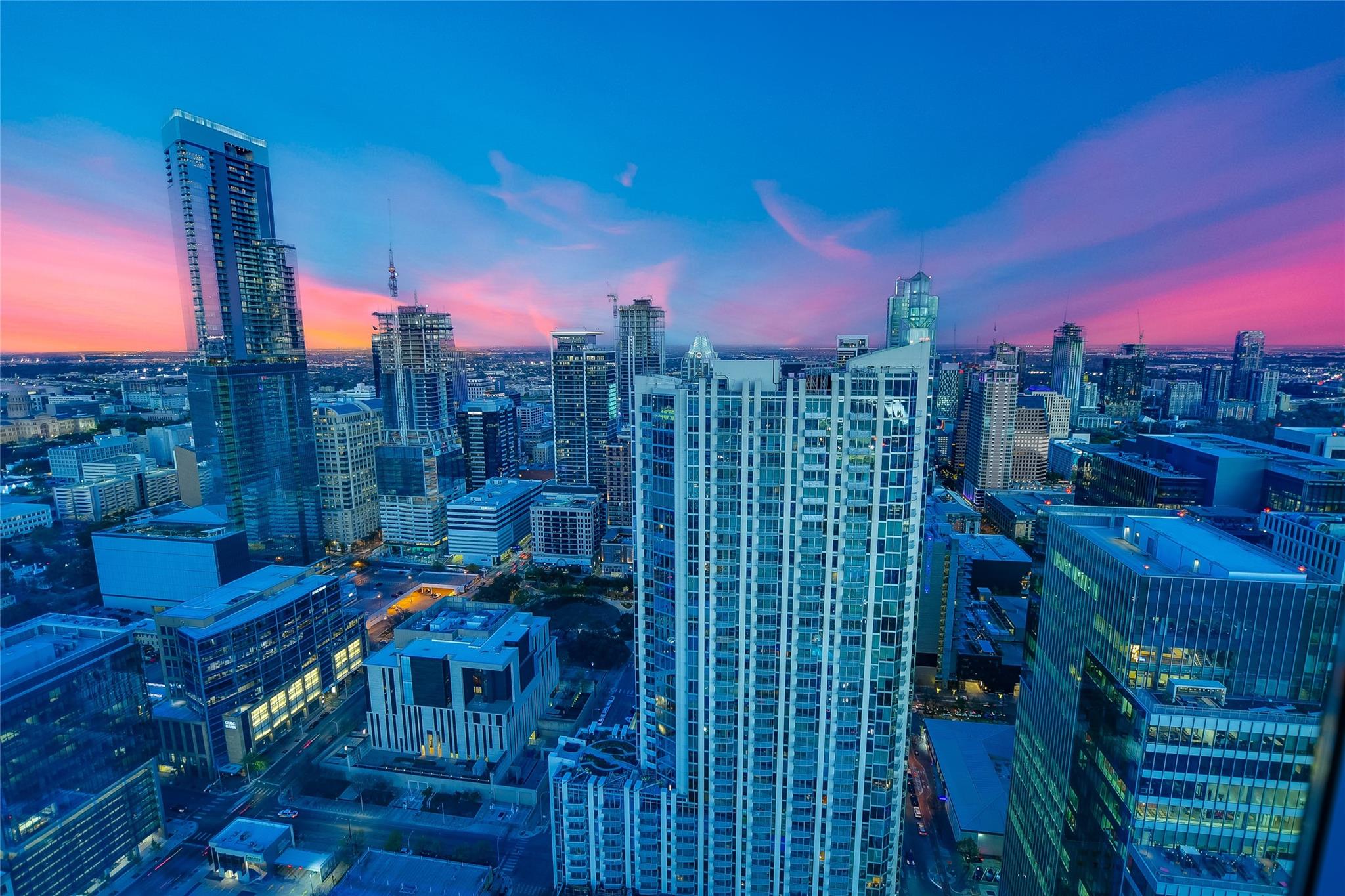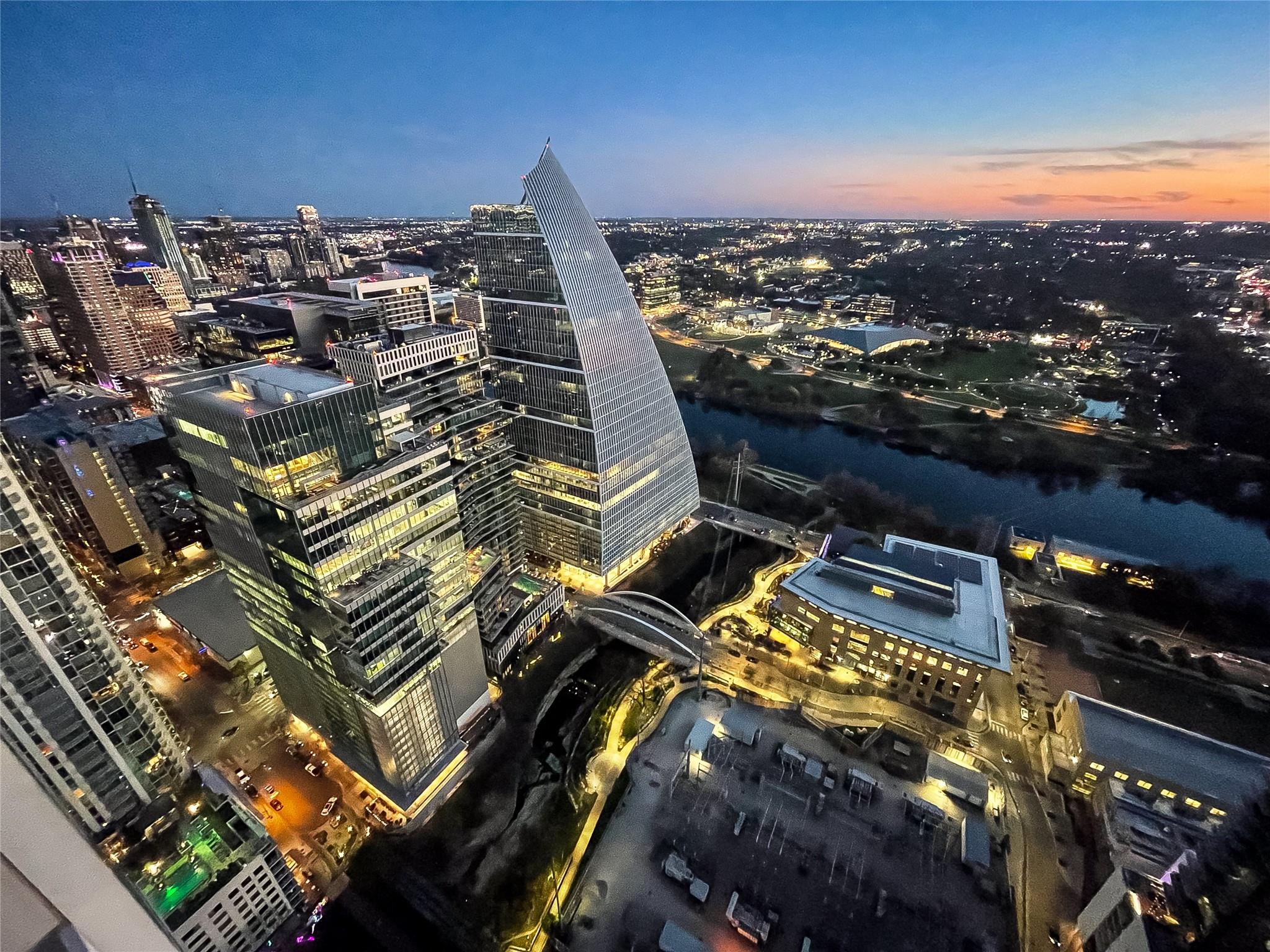 Striking panoramic views await you from this elegantly designed southeast corner residence on the 46th floor of The Independent. Soak in spectacular lake and sunset views from the private covered balcony. Featuring 3 bedrooms, 3 bathrooms + study, there are ample spaces to create your desired urban lifestyle. Easily entertain in the open kitchen-living concept, complete with center island, custom cabinets, quartz countertops, Bosch appliances, and surrounded by floor to ceiling glass revealing the best of lake, hill country and city skyline scenes. The primary bedroom and spa-like bath offer a generous walk-in closet, double vanity with backlit mirrors, and large walk-in shower with separate soaking tub. A guest bedroom with en suite bath offers additional privacy. Other upgrades include automated lighting and solar shades throughout the residence, light fixtures and Haiku ceiling fans, and hardwood + tile floors. Two reserved parking spaces included with an EV charger that accommodates both spaces. Highly desired downtown location along the shores of Lady Bird Lake and Shoal Creek trail, with easy walkability to Trader Joe's, Whole Foods, the Austin Central Library, and numerous dining and nightlife experiences. Enjoy extended living options in the luxurious amenity spaces spanning 20,000 sq ft on levels 9 and 34 featuring a heated pool, outdoor grills, fitness center, yoga studio, conference rooms, owner's lounge, dog park + wash station, movie theatre, children's playroom and 24/7 concierge service.