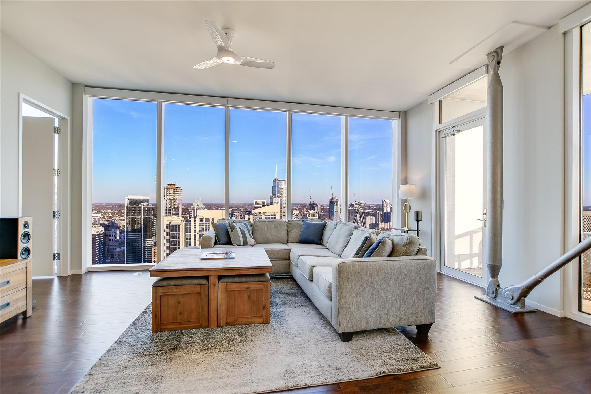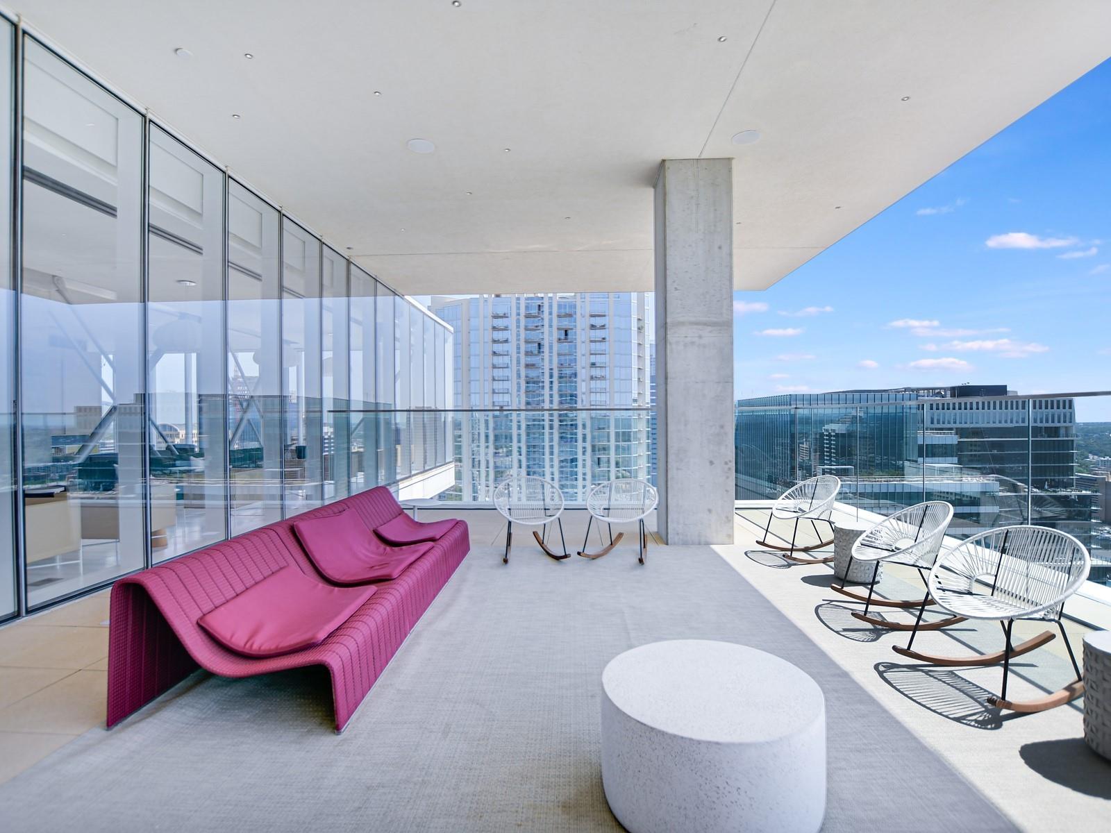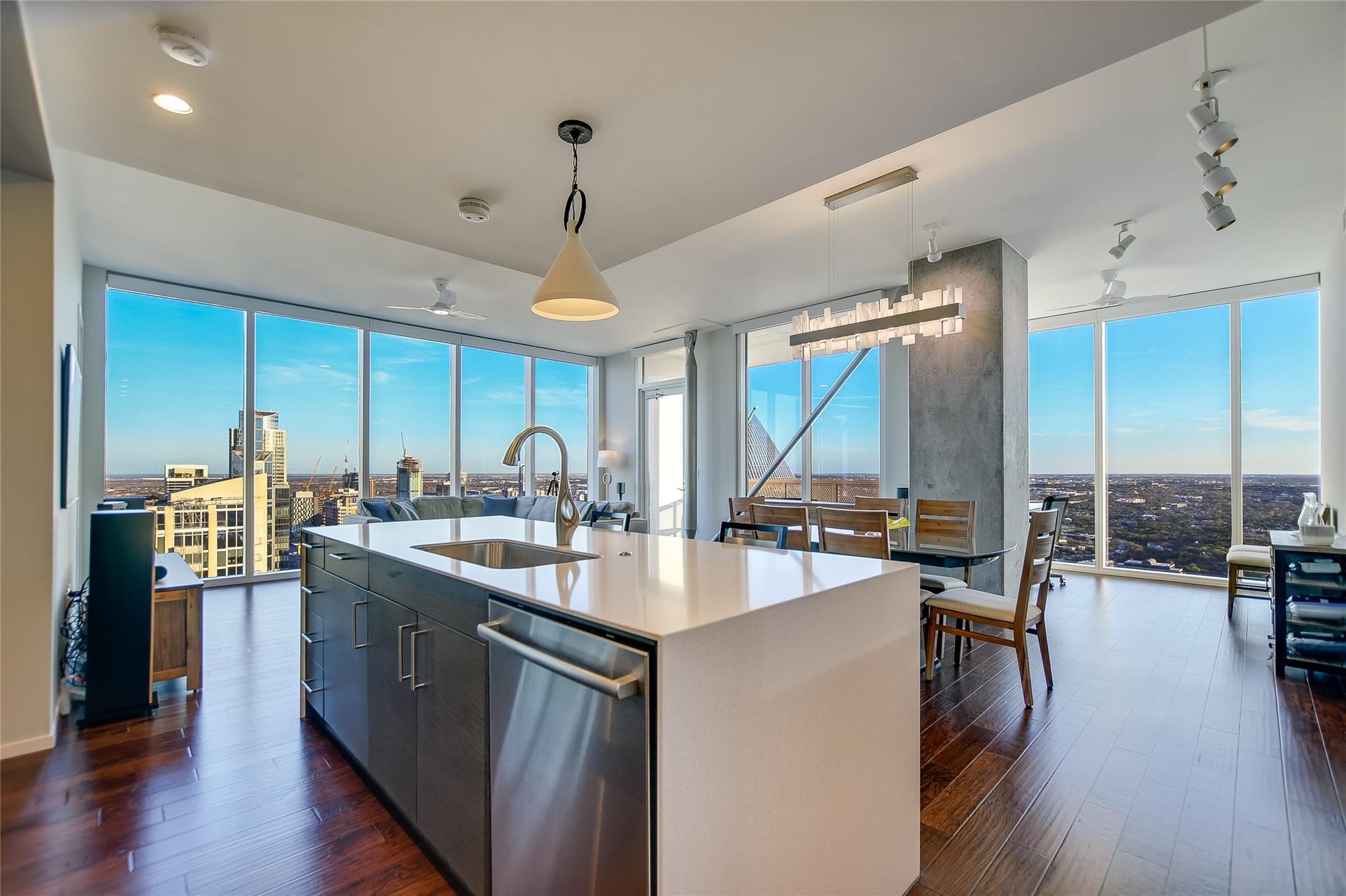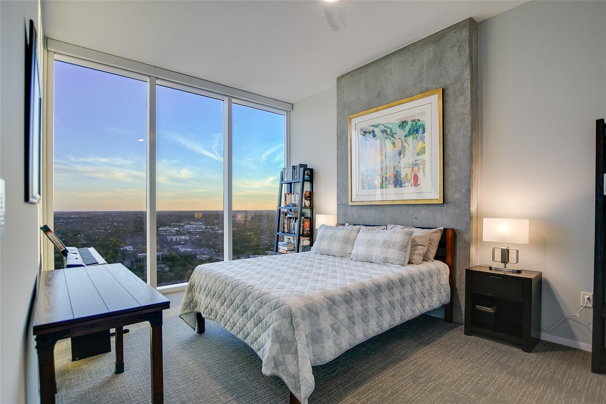 Striking panoramic views await you from this elegantly designed southeast corner residence on the 46th floor of The Independent. Soak in spectacular lake and sunset views from the private covered balcony. Featuring 3 bedrooms, 3 bathrooms + study, there are ample spaces to create your desired urban lifestyle. Easily entertain in the open kitchen-living concept, complete with center island, custom cabinets, quartz countertops, Bosch appliances, and surrounded by floor to ceiling glass revealing the best of lake, hill country and city skyline scenes. The primary bedroom and spa-like bath offer a generous walk-in closet, double vanity with backlit mirrors, and large walk-in shower with separate soaking tub. A guest bedroom with en suite bath offers additional privacy. Other upgrades include automated lighting and solar shades throughout the residence, light fixtures and Haiku ceiling fans, and hardwood + tile floors. Two reserved parking spaces included with an EV charger that accommodates both spaces. Highly desired downtown location along the shores of Lady Bird Lake and Shoal Creek trail, with easy walkability to Trader Joe's, Whole Foods, the Austin Central Library, and numerous dining and nightlife experiences. Enjoy extended living options in the luxurious amenity spaces spanning 20,000 sq ft on levels 9 and 34 featuring a heated pool, outdoor grills, fitness center, yoga studio, conference rooms, owner's lounge, dog park + wash station, movie theatre, children's playroom and 24/7 concierge service.