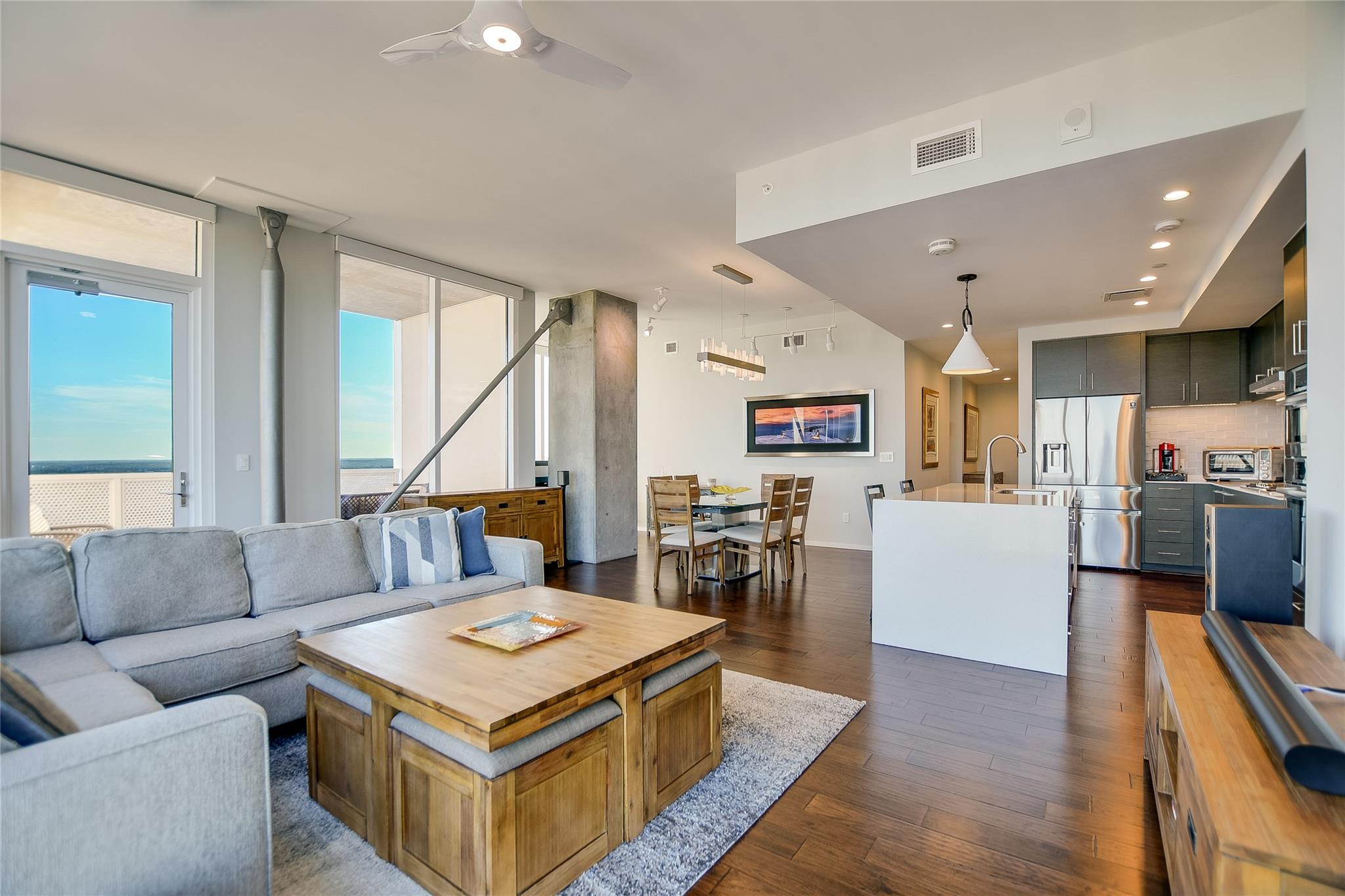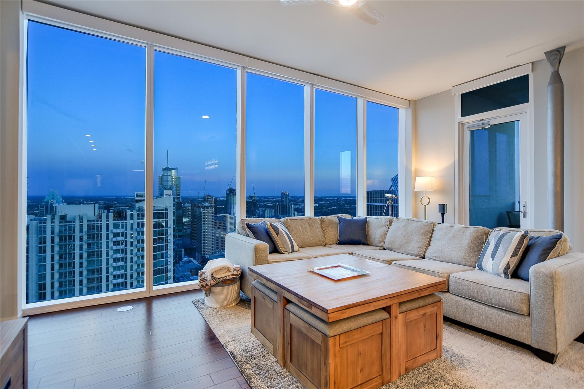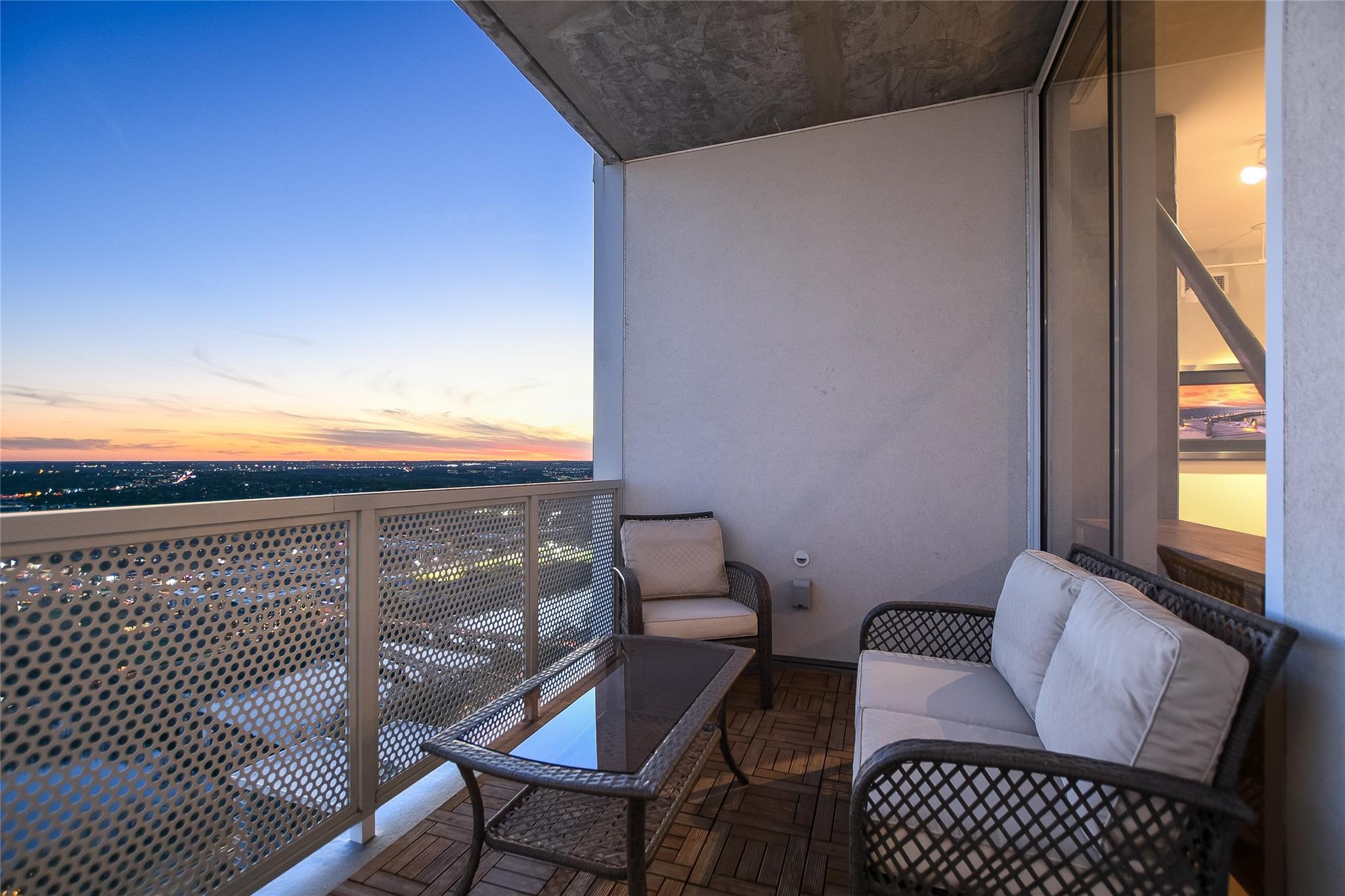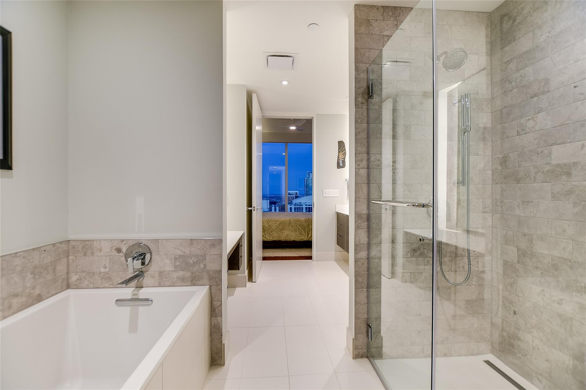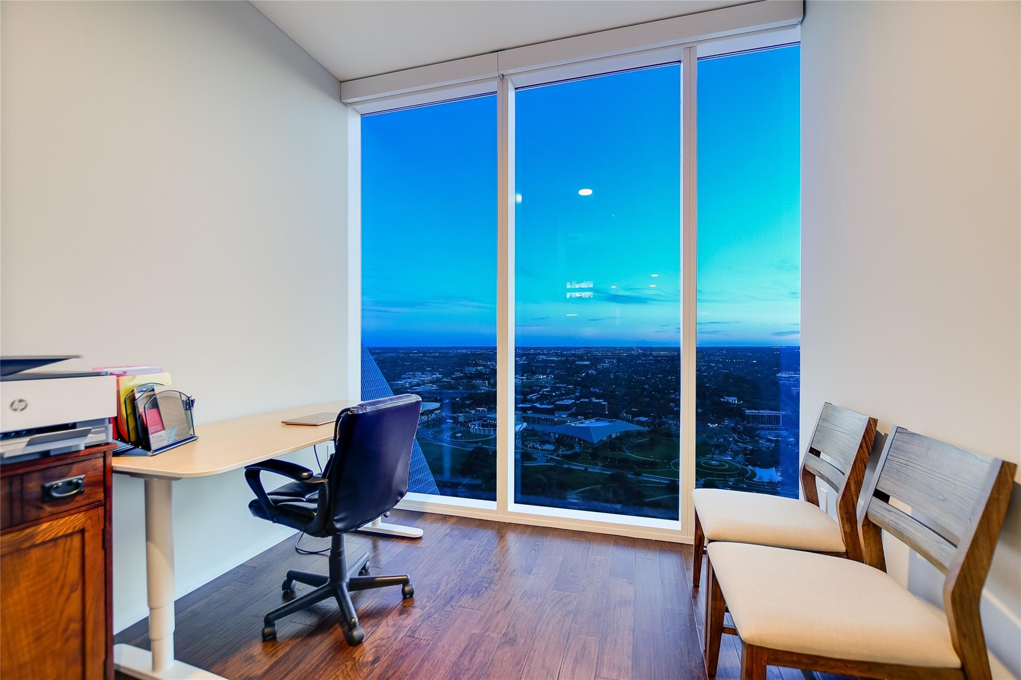 Striking panoramic views await you from this elegantly designed southeast corner residence on the 46th floor of The Independent. Soak in spectacular lake and sunset views from the private covered balcony. Featuring 3 bedrooms, 3 bathrooms + study, there are ample spaces to create your desired urban lifestyle. Easily entertain in the open kitchen-living concept, complete with center island, custom cabinets, quartz countertops, Bosch appliances, and surrounded by floor to ceiling glass revealing the best of lake, hill country and city skyline scenes. The primary bedroom and spa-like bath offer a generous walk-in closet, double vanity with backlit mirrors, and large walk-in shower with separate soaking tub. A guest bedroom with en suite bath offers additional privacy. Other upgrades include automated lighting and solar shades throughout the residence, light fixtures and Haiku ceiling fans, and hardwood + tile floors. Two reserved parking spaces included with an EV charger that accommodates both spaces. Highly desired downtown location along the shores of Lady Bird Lake and Shoal Creek trail, with easy walkability to Trader Joe's, Whole Foods, the Austin Central Library, and numerous dining and nightlife experiences. Enjoy extended living options in the luxurious amenity spaces spanning 20,000 sq ft on levels 9 and 34 featuring a heated pool, outdoor grills, fitness center, yoga studio, conference rooms, owner's lounge, dog park + wash station, movie theatre, children's playroom and 24/7 concierge service.