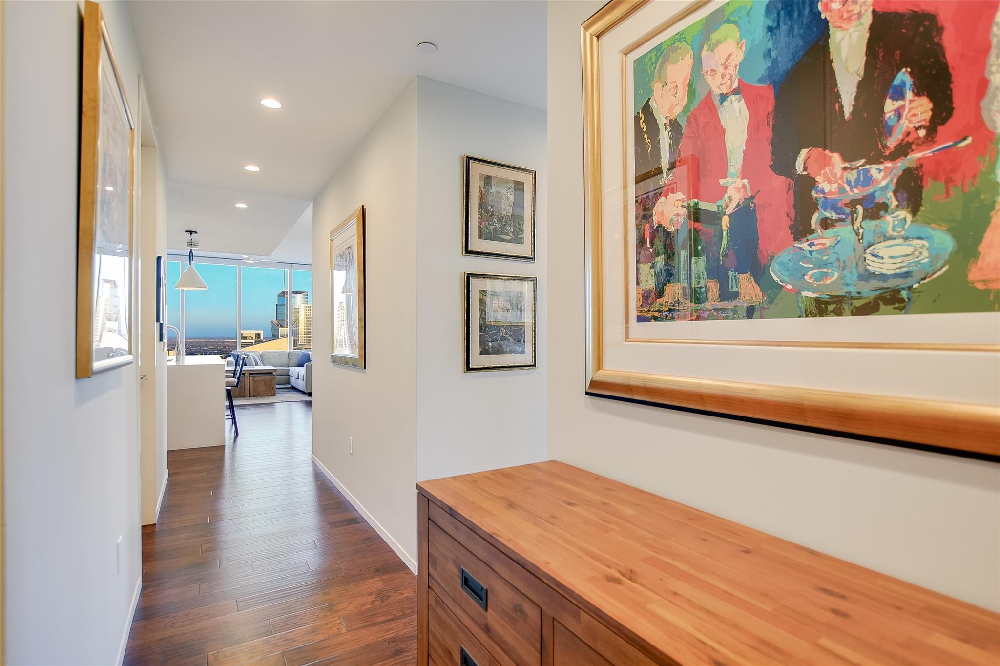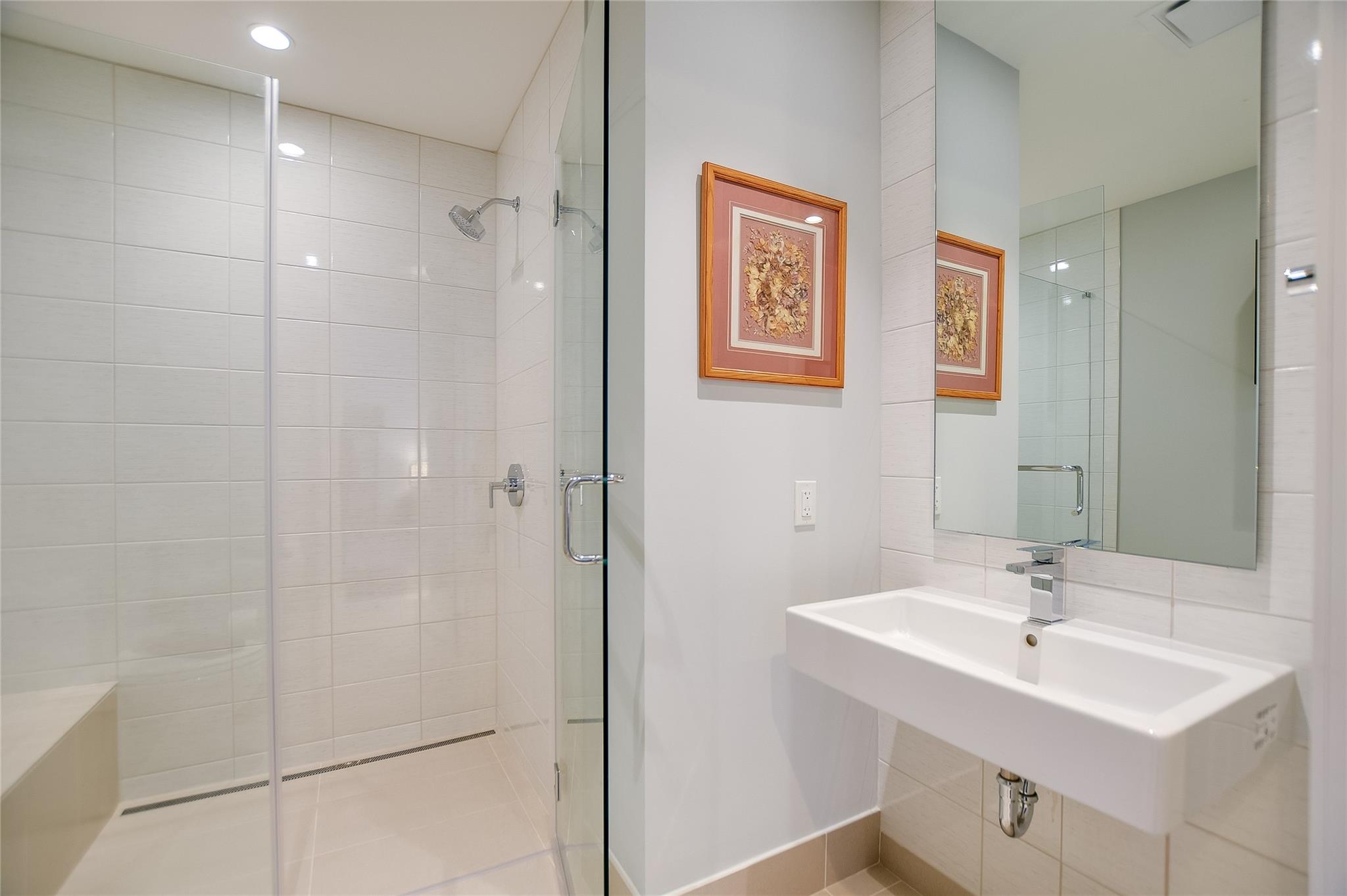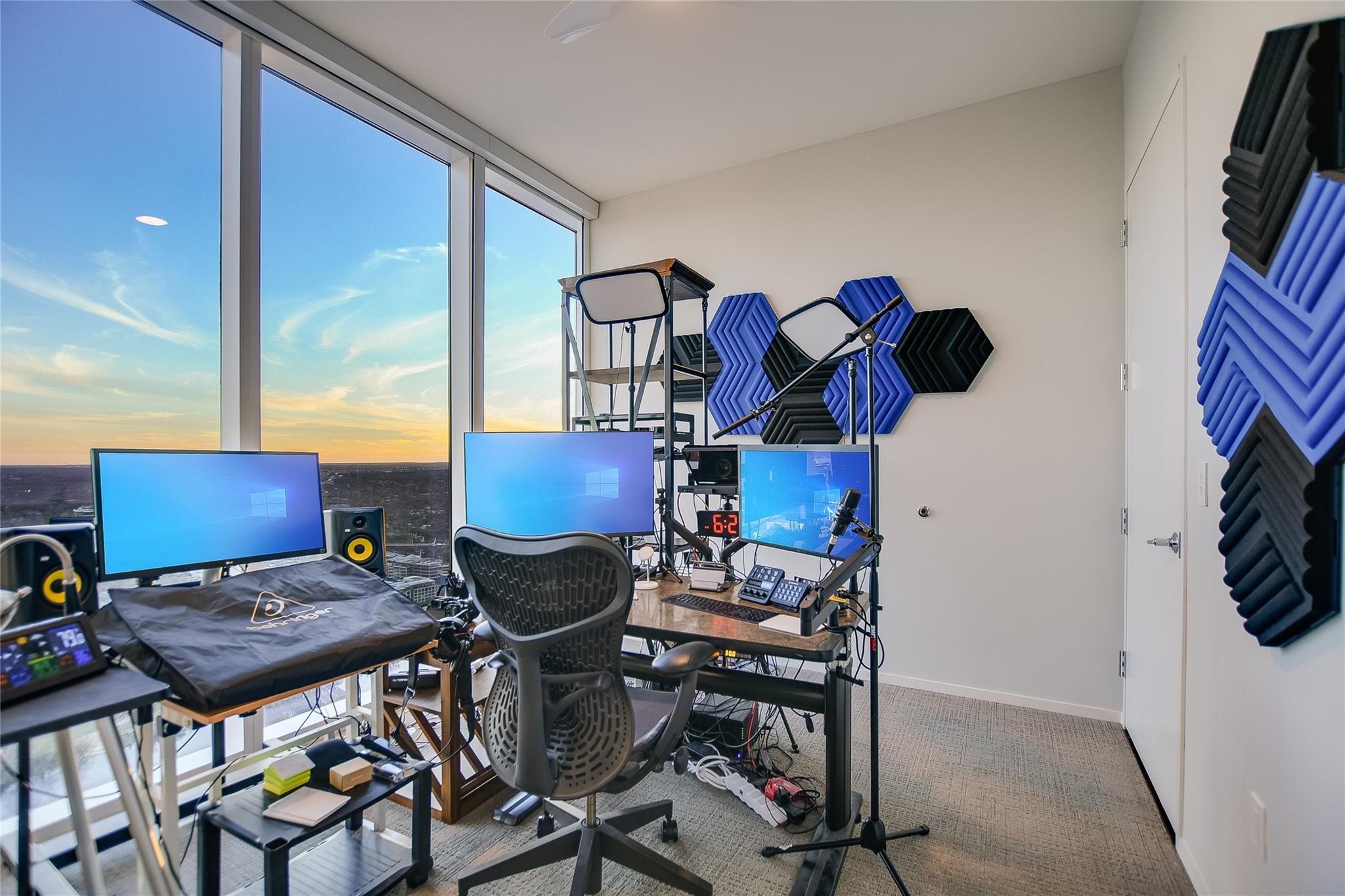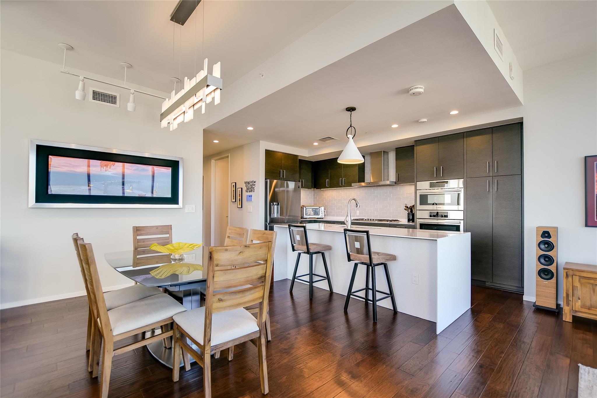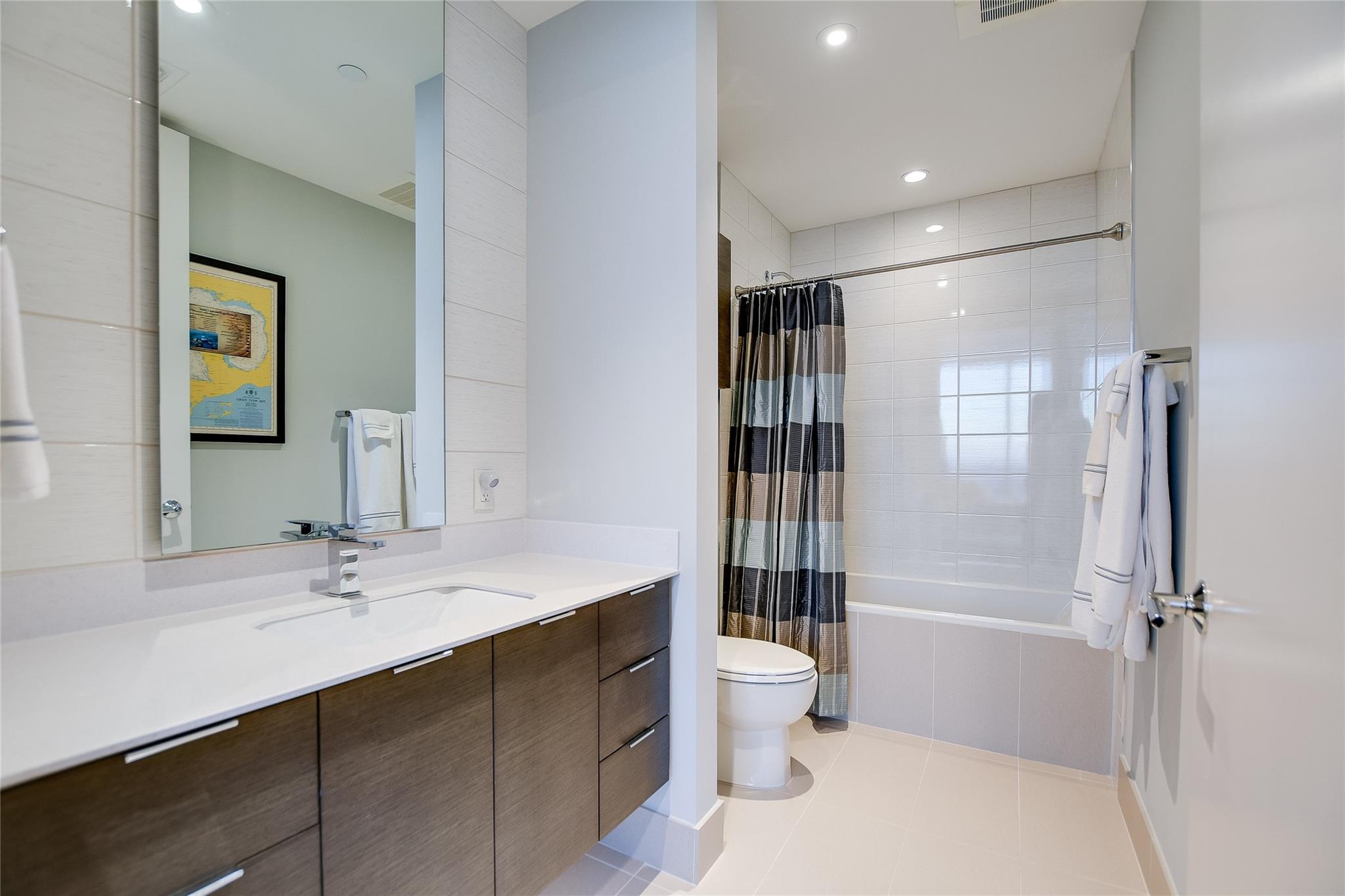 Striking panoramic views await you from this elegantly designed southeast corner residence on the 46th floor of The Independent. Soak in spectacular lake and sunset views from the private covered balcony. Featuring 3 bedrooms, 3 bathrooms + study, there are ample spaces to create your desired urban lifestyle. Easily entertain in the open kitchen-living concept, complete with center island, custom cabinets, quartz countertops, Bosch appliances, and surrounded by floor to ceiling glass revealing the best of lake, hill country and city skyline scenes. The primary bedroom and spa-like bath offer a generous walk-in closet, double vanity with backlit mirrors, and large walk-in shower with separate soaking tub. A guest bedroom with en suite bath offers additional privacy. Other upgrades include automated lighting and solar shades throughout the residence, light fixtures and Haiku ceiling fans, and hardwood + tile floors. Two reserved parking spaces included with an EV charger that accommodates both spaces. Highly desired downtown location along the shores of Lady Bird Lake and Shoal Creek trail, with easy walkability to Trader Joe's, Whole Foods, the Austin Central Library, and numerous dining and nightlife experiences. Enjoy extended living options in the luxurious amenity spaces spanning 20,000 sq ft on levels 9 and 34 featuring a heated pool, outdoor grills, fitness center, yoga studio, conference rooms, owner's lounge, dog park + wash station, movie theatre, children's playroom and 24/7 concierge service.
