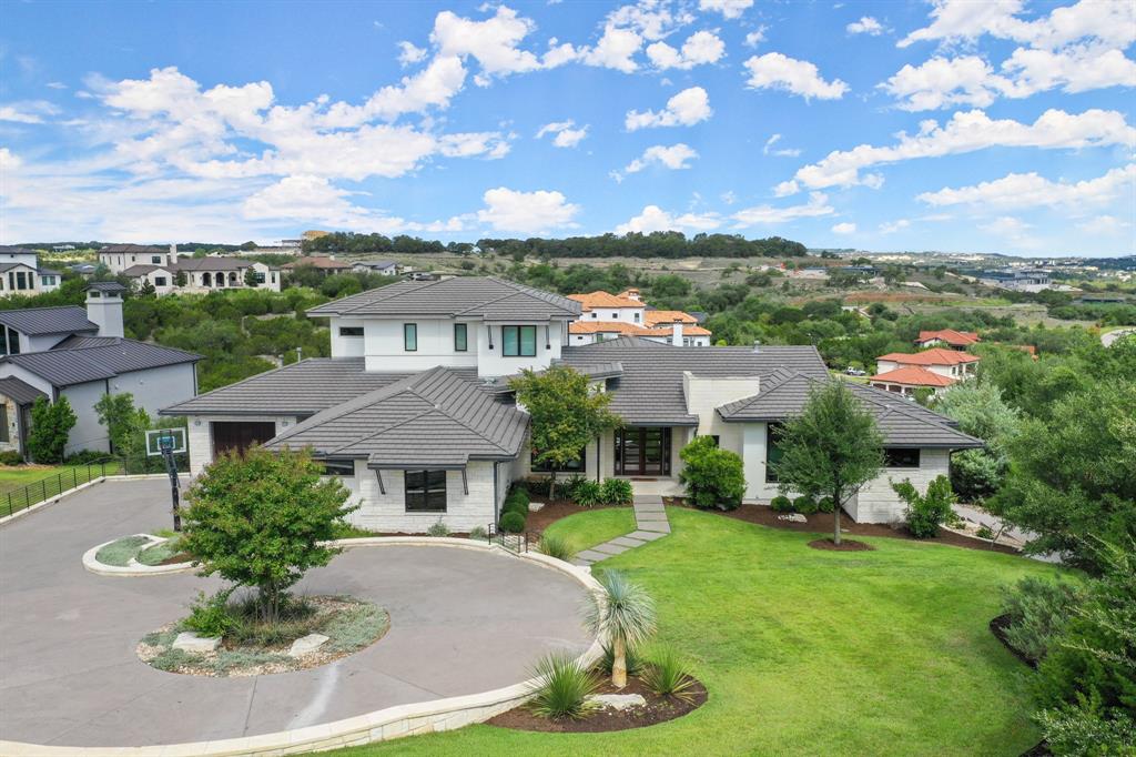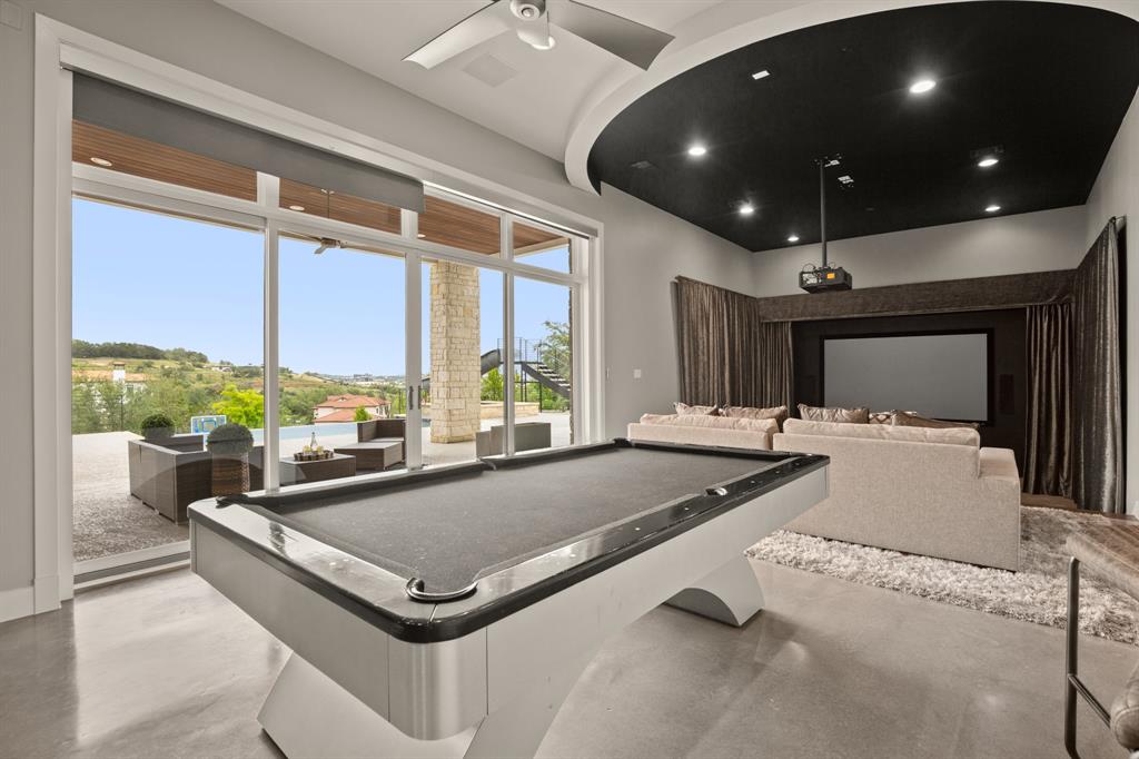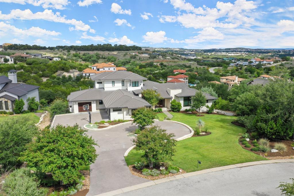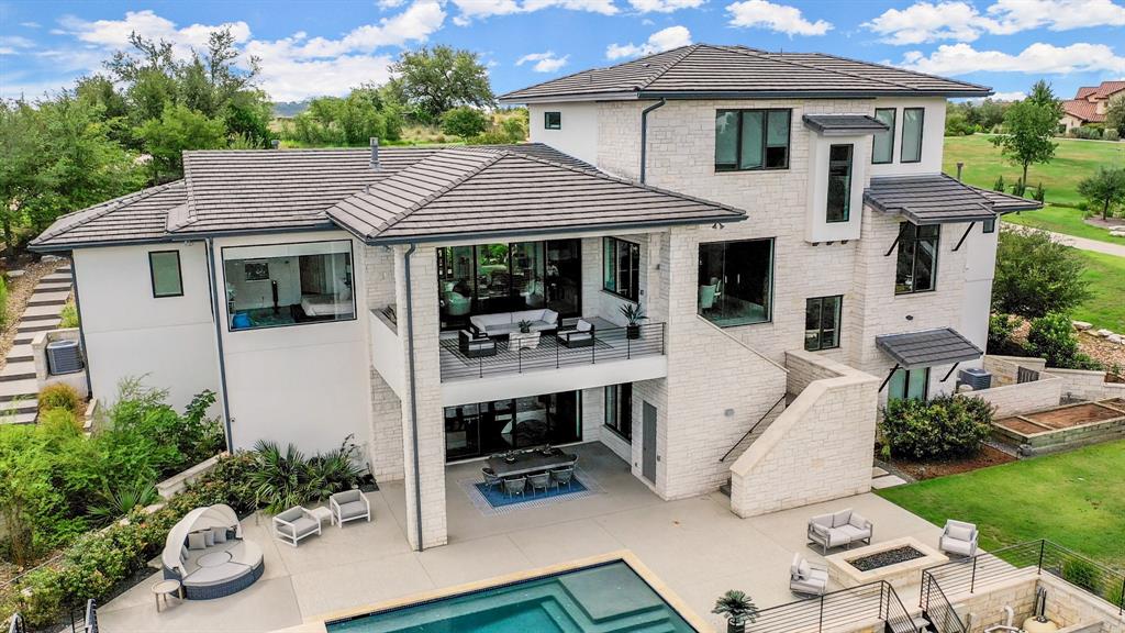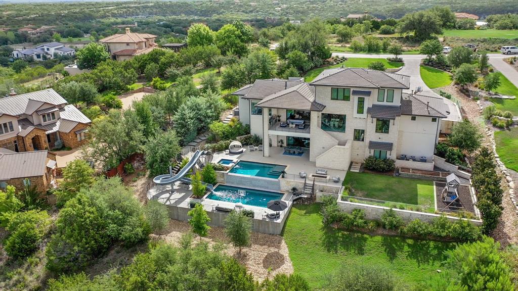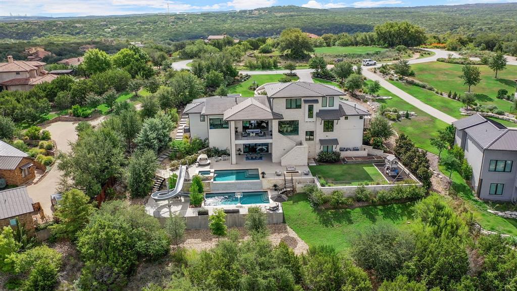 Stunning 5-bed, 4.5-bath estate on 1.5+ acres with breathtaking hill country views. Open floor plan, chef's kitchen with large center island, breakfast bar plus ample cabinet and counter space. Wall of windows throughout bathe the home in natural sunlight and provide spectacular views. Spacious primary suite. Media room featuring a kitchenette and home gym. Outside, the covered patio, balcony and nice size backyard provide plenty of space for outdoor living and entertaining. Whether you're enjoying a morning cup of coffee or hosting a summer barbecue, this backyard has everything you need to make lasting memories. Enjoy two pools, including a main level pool with spa and a slide flowing into the lower level pool. Perfect for luxurious living and entertaining. Don't miss out on the opportunity to make this amazing home yours. Schedule your showing today and start living the dream!
