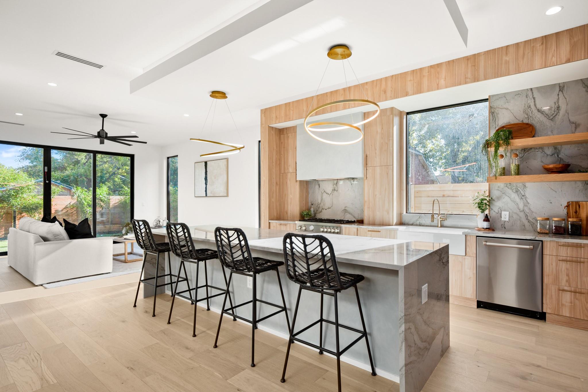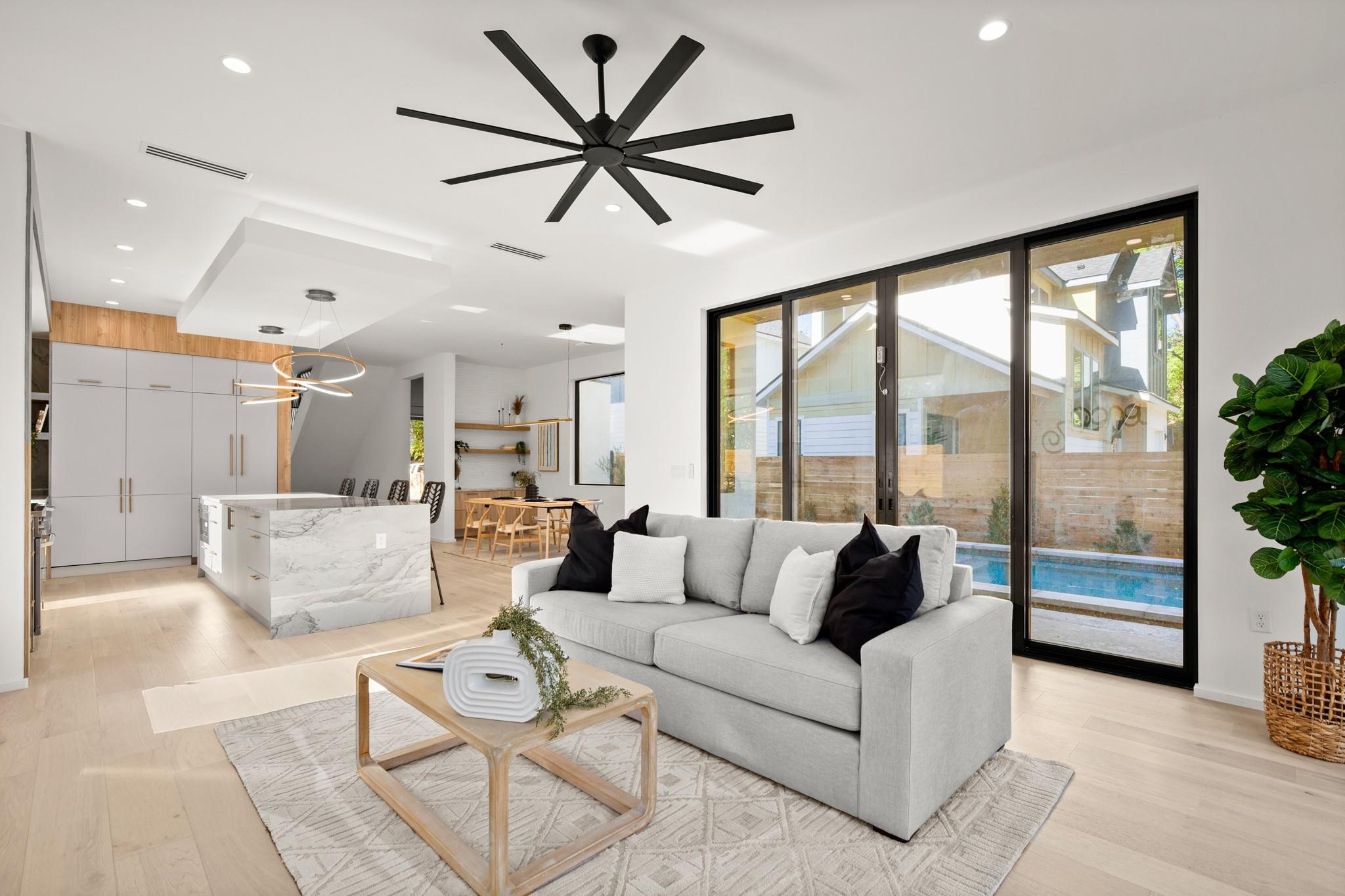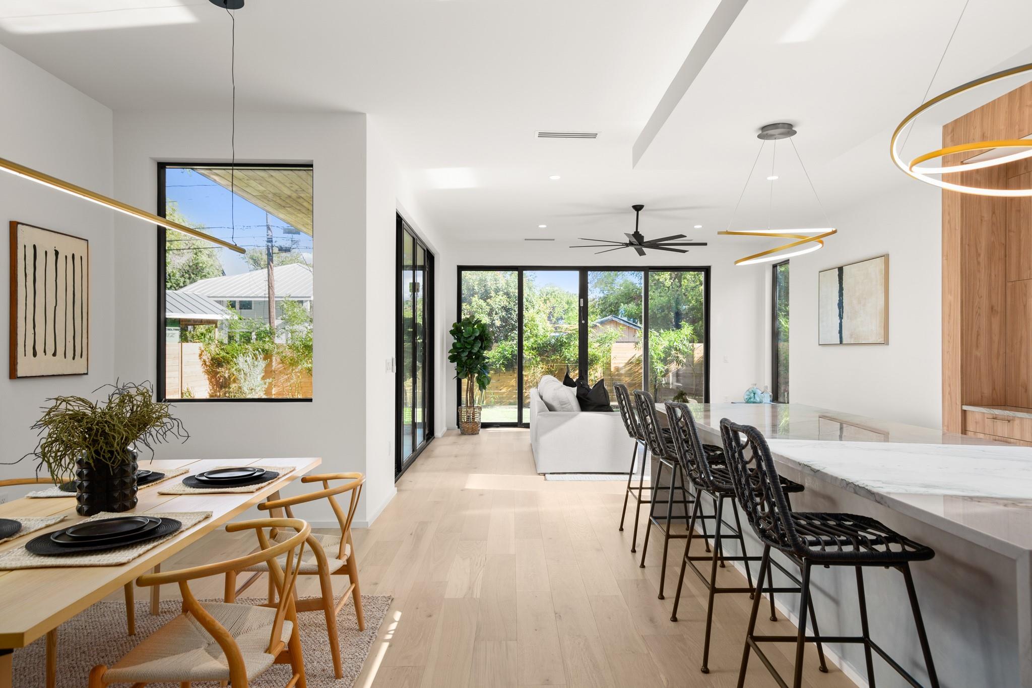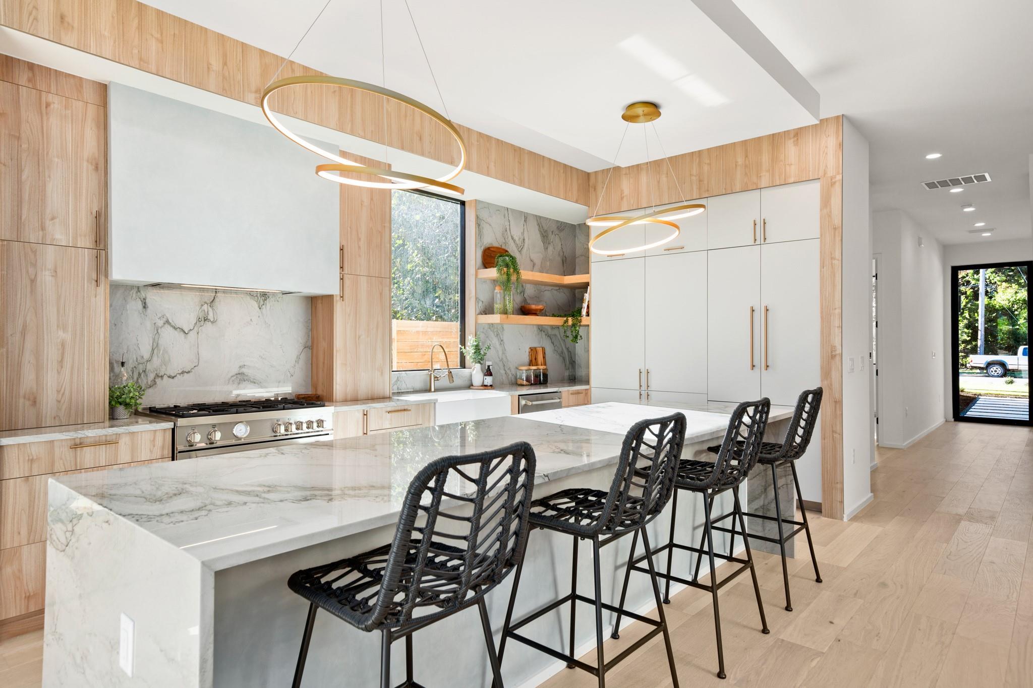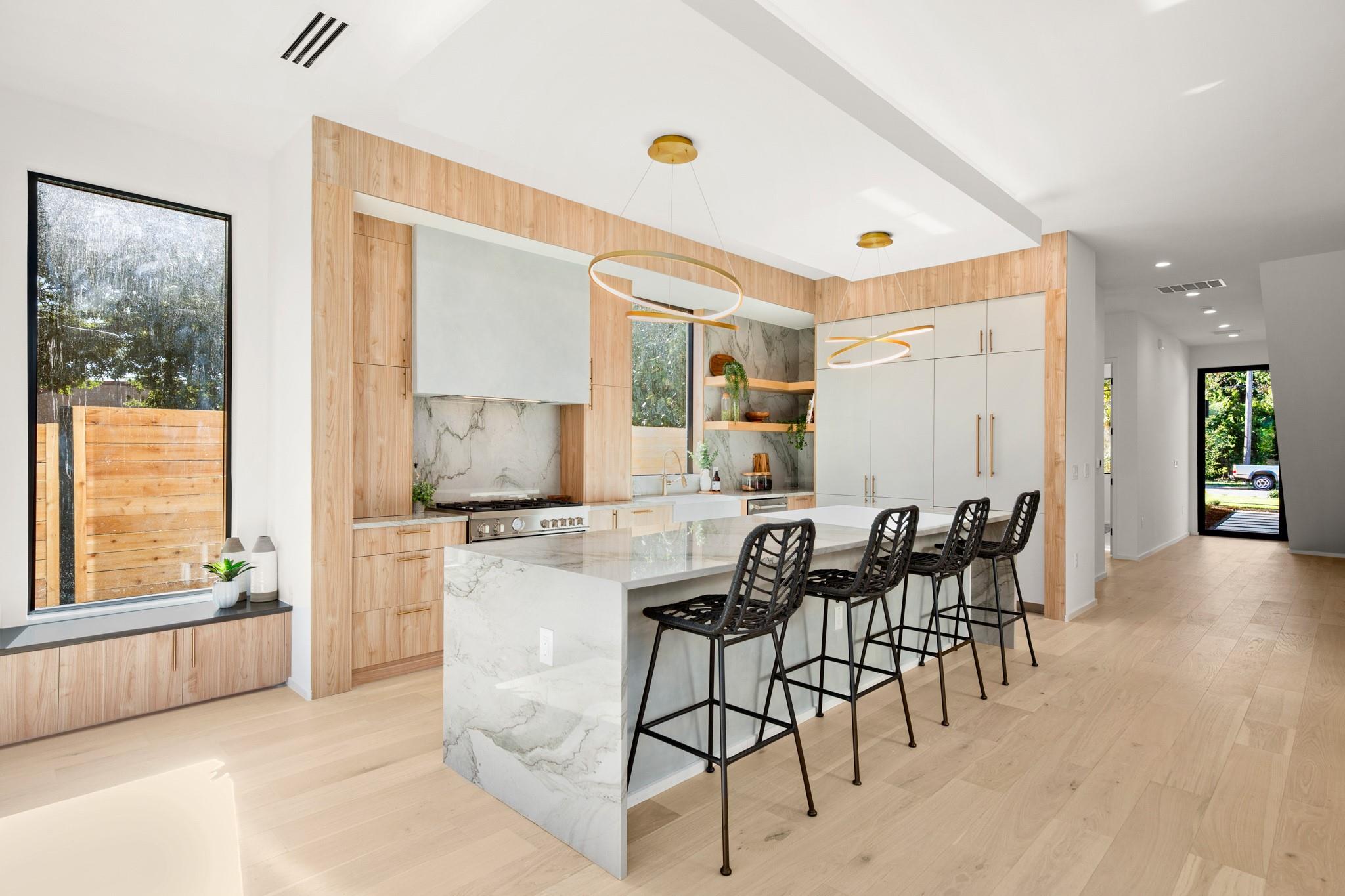 Impeccable modern architecture located in the highly walkable Holly neighborhood in the heart of 78702! Masterfully built by McCarley Construction this home embodies both functionality and effortless design. Sleek contemporary lines mixed with warm, natural elements invite you in with an abundance of natural light during the day and a cool, entertainers’ atmosphere at night. This well thought out and strategically designed open floor plan is perfect for hosting and entertaining. Enjoy indoor/outdoor living year-round with massive floor to ceiling sliding glass doors, private fenced front and back yard with a stunning private pool. The exquisite kitchen features a jaw dropping waterfall island with quartz countertops, state-of-the-art stainless steel appliances package and sophisticated custom cabinetry. Allow yourself to indulge in luxury and relaxation in the spacious primary suite and gorgeous spa like primary bathroom. Carefully curated tile and fixture selections throughout the home truly make for an impressive place of residence. This home is in one of Austin’s most coveted and convenient zip codes, with walkability to multiple different shopping districts, restaurants, coffee shops and more. Easy access to I- 35, and literally just minutes to everything East Austin has to offer. Unmatched location, unbeatable design.