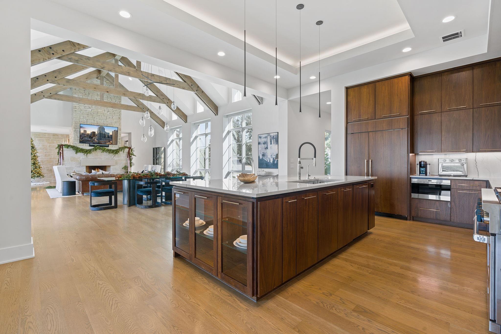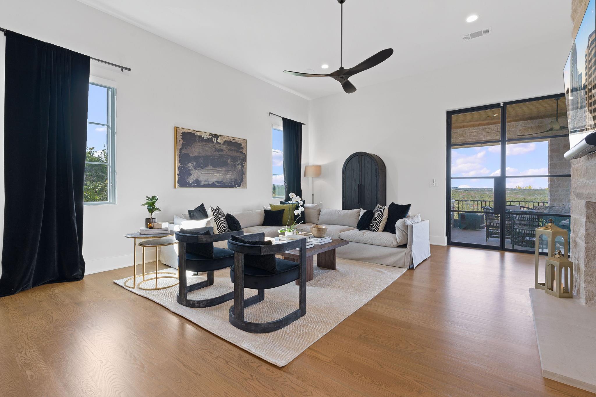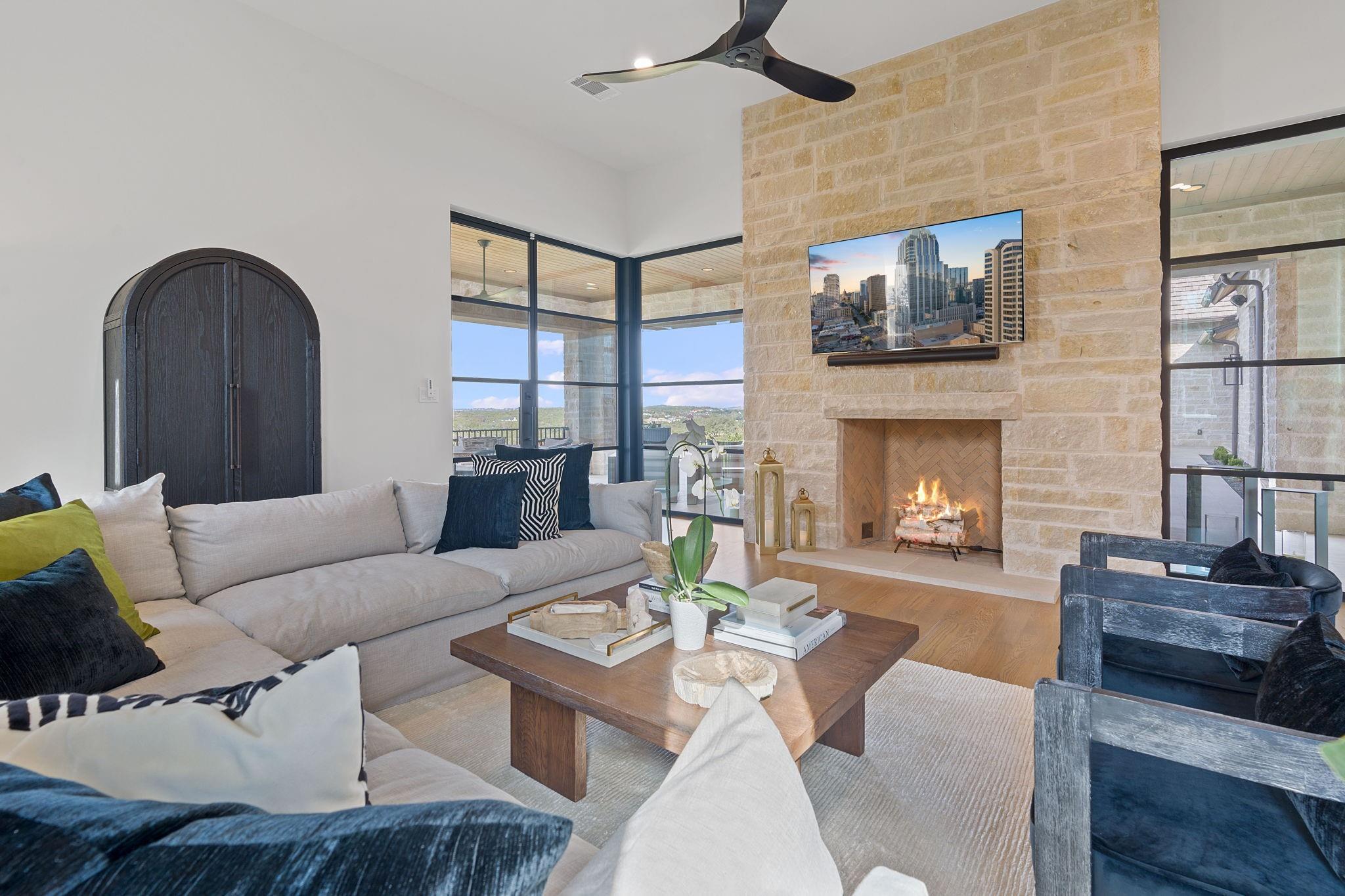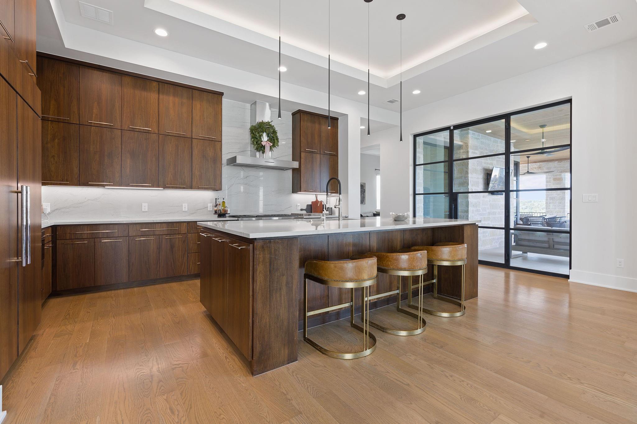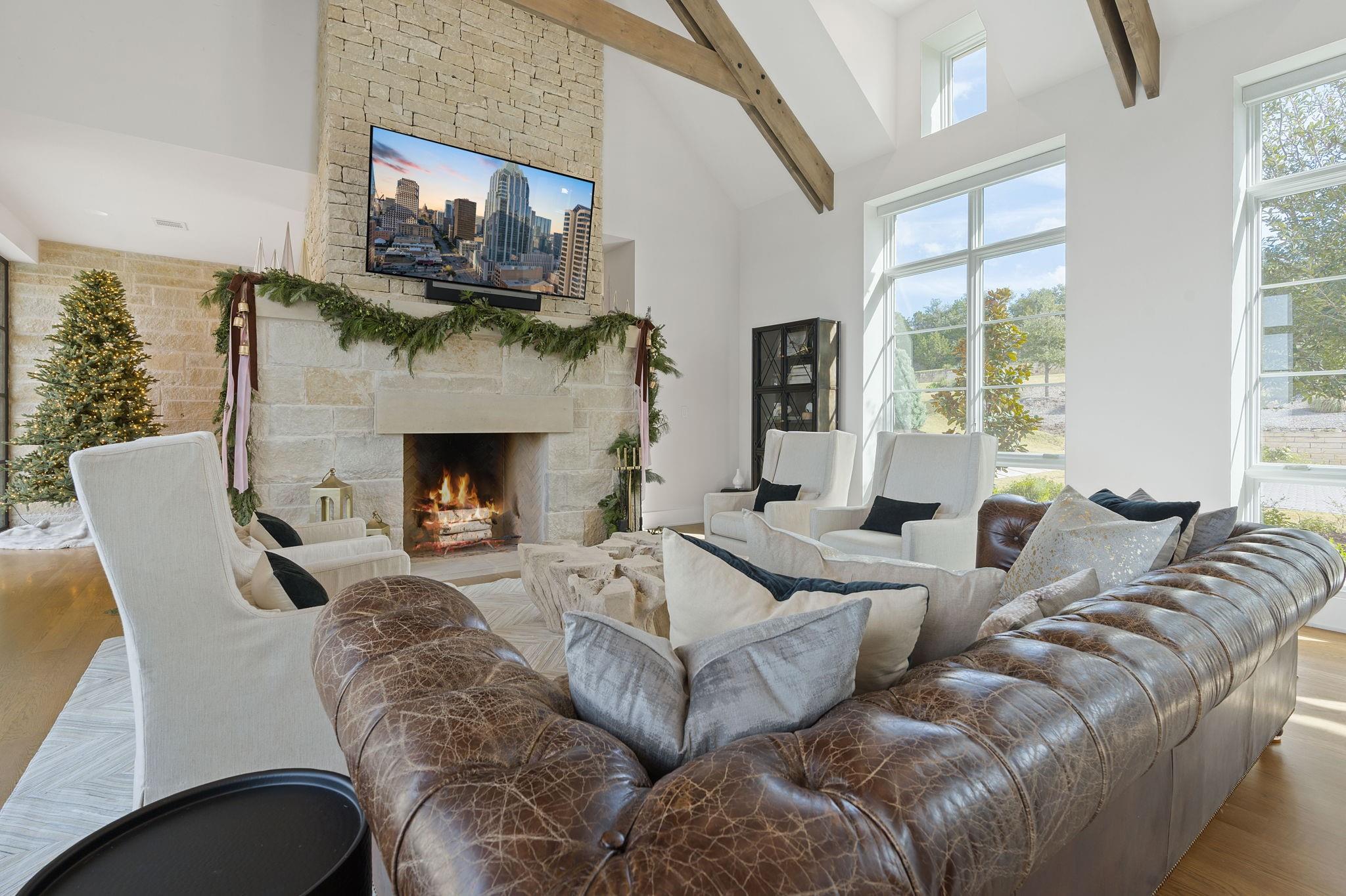 Perched above the 16th hole of Barton Creek’s Fazio Canyons Golf Course, sitting on nearly 3 acres with miles of unobstructed, protected green belt views, sits a Heyl Homes Showcase Property just 2 years young. Sprawling over 5,100 sqft, without a single interior stair, is a beautifully laid out 4 bedroom (all with en-suite baths) floor plan. Capping off the rooms is a large, private office next to the primary suite and powder half bath between the kitchen and pool. Throughout this former model home (Sept '20-June '21), you will find ceiling heights ranging from 12 to 20 feet. The dramatic, wood-beamed great room connected to the kitchen allows for a central, connected living space that easily entertains 30+ people. Walls of windows throughout connects you with some of the best hill country views in Travis County. The 20x36’ pool directly off the kitchen with 1200 sqft of covered patio space keeps you shaded in the summer and warm in the winter. The entire home is finished with hand-finished hardwood floors, white quartz, and high-end appliances. No detail was missed in this exclusive Amarra Estate.