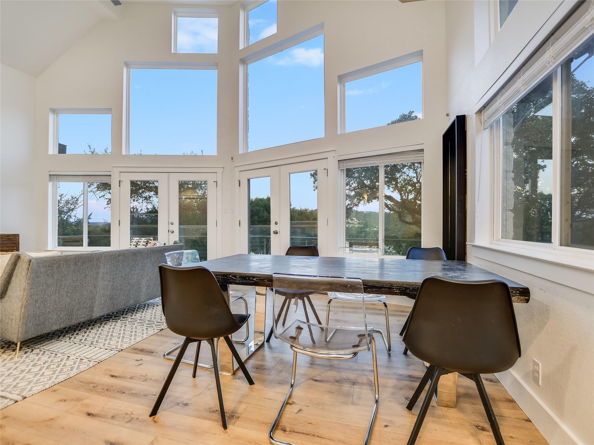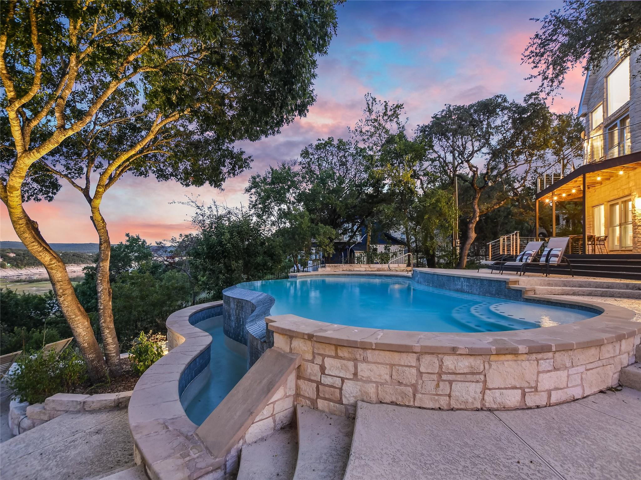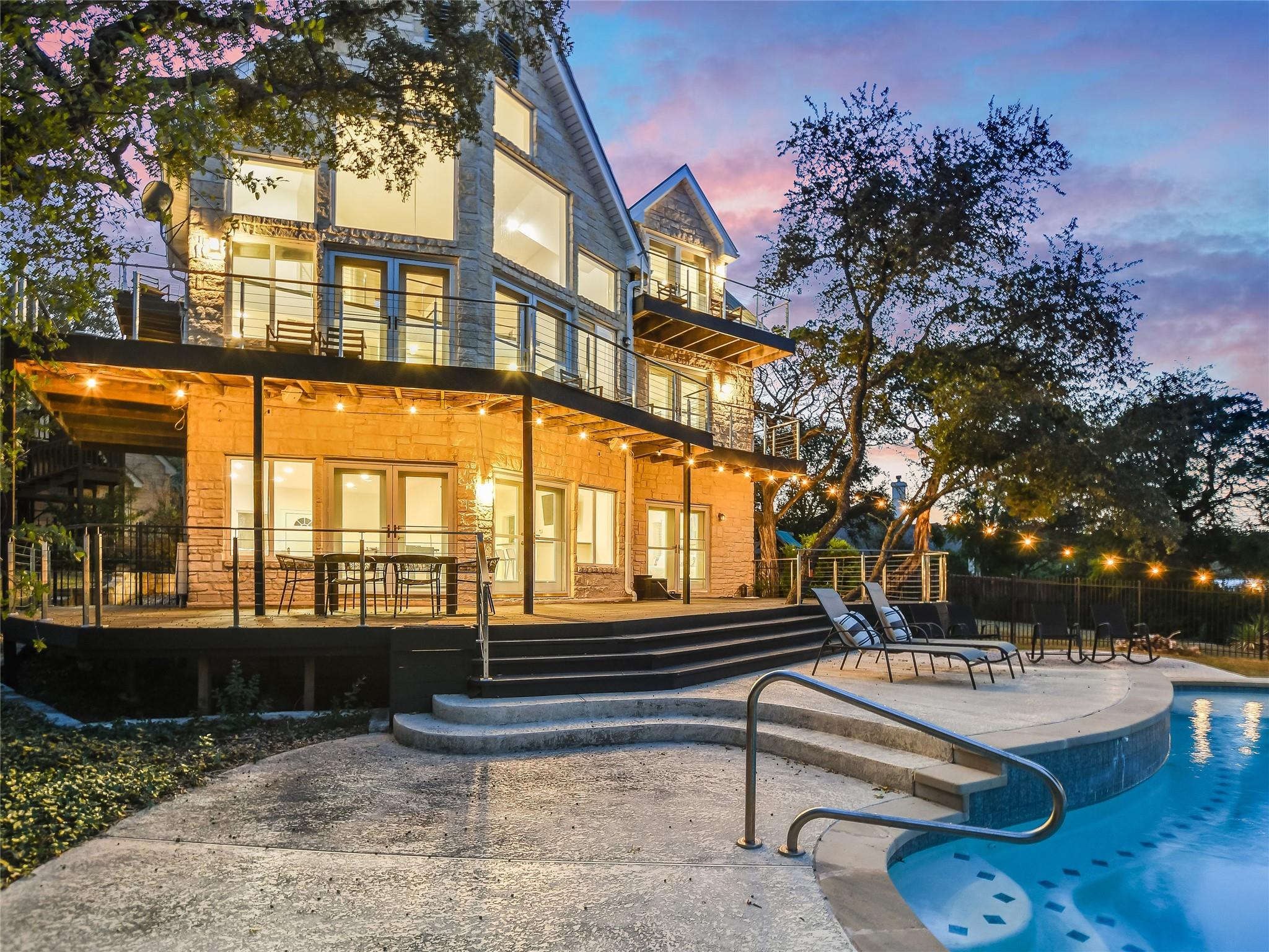 Magnificent Lake Travis estate situated on a sprawling 1 acre bluff lot above Lake Travis. Income producing or private to share with family and friends, with main estate and 2 separate units. Captivating views, this home offers a seamless blend of indoor-outdoor living. Inviting layout, where the living, dining, and kitchen areas flow effortlessly together. French doors adorn the perimeter, bathing the interior in natural light and offering panoramic views of the surrounding landscape and lake. Shared Path to lake per an agreement with waterfront owner This versatile space, along with an elevated daylight and walkout basement, which includes a large living/game and wet bar area sets the stage for unforgettable moments. Step outside onto the expansive decks; relax, dine, swim or soak in the breathtaking scenery. Primary suite retreat, a sanctuary boasting views, a luxurious ensuite bathroom, and direct access to the outdoor decks. Additional bedrooms provide comfortable accommodations for family and guests, each offering its own blend of comfort and style. Outside, resort-style amenities await, including a sparkling negative edge pool, hot tub, and a pathway leading directly to the lake. Spend leisurely afternoons lounging by the poolside or embark on adventures on the lake; where boating, swimming, and fishing await. Multi-level decks with room for lots of outdoor living. In addition to the main residence, the property features two separate units. The ample studio apartment over the garage feels like a cabin nestled in the trees. Complete with a private bathroom, kitchenette and its own entrance, it offers privacy and convenience for guests or tenants. The guest house 'Condo' further enhances the potential of the property, offering yet another opportunity for rental income or accommodations for visitors. Completed in 2023 with its own 2 bedrooms, full huge kitchen and living area, it provides a cozy and inviting space for guests to enjoy.