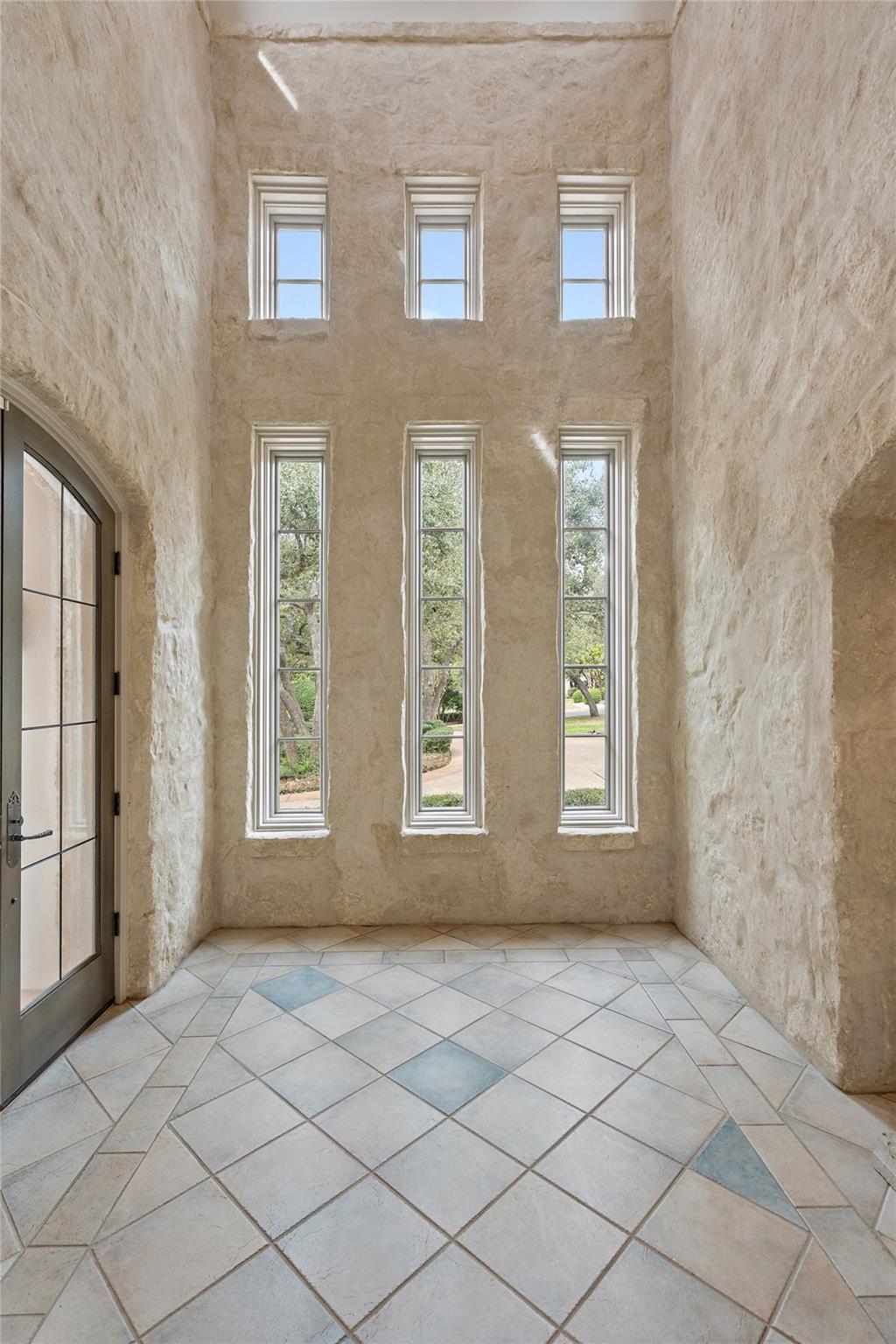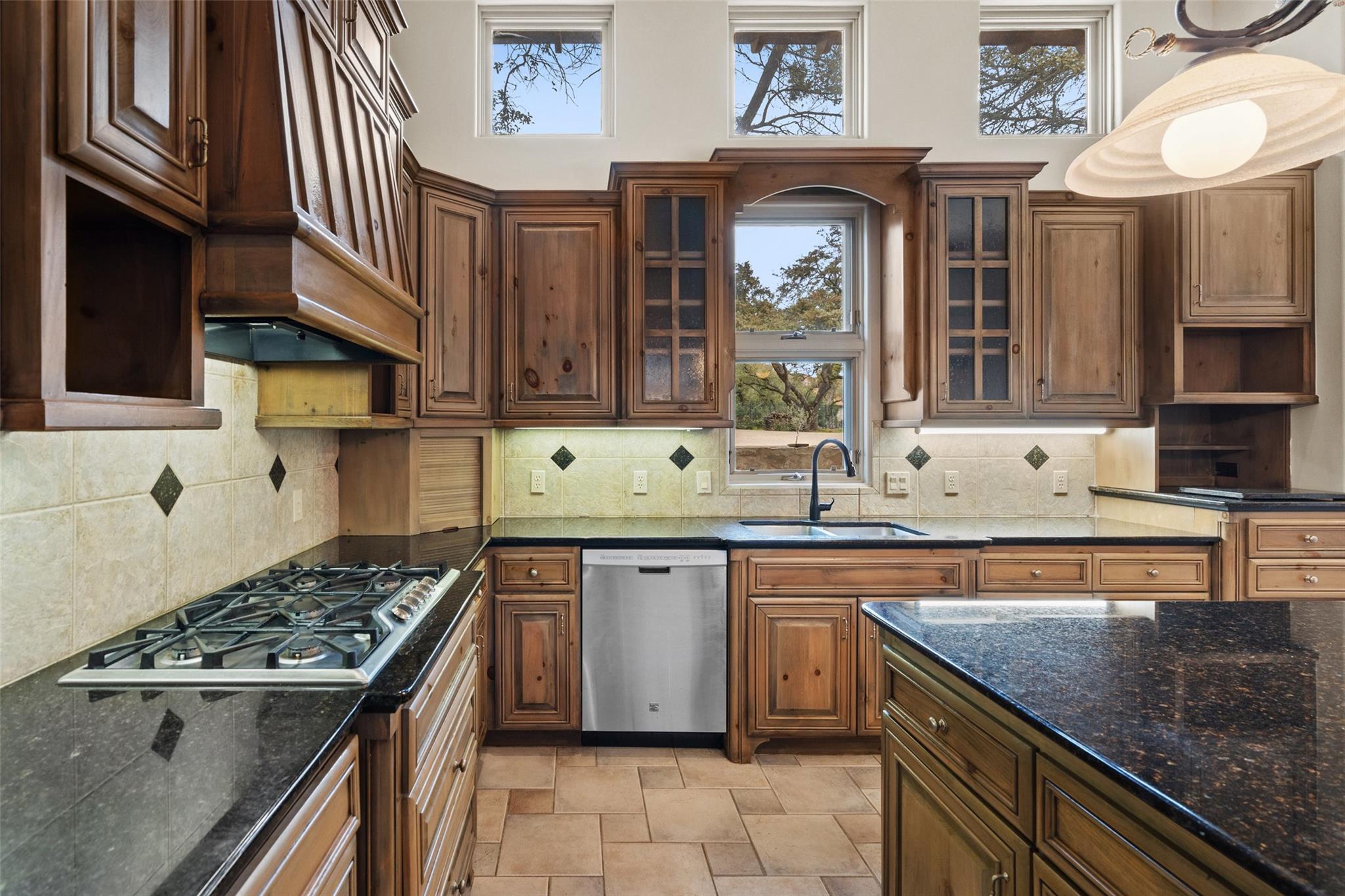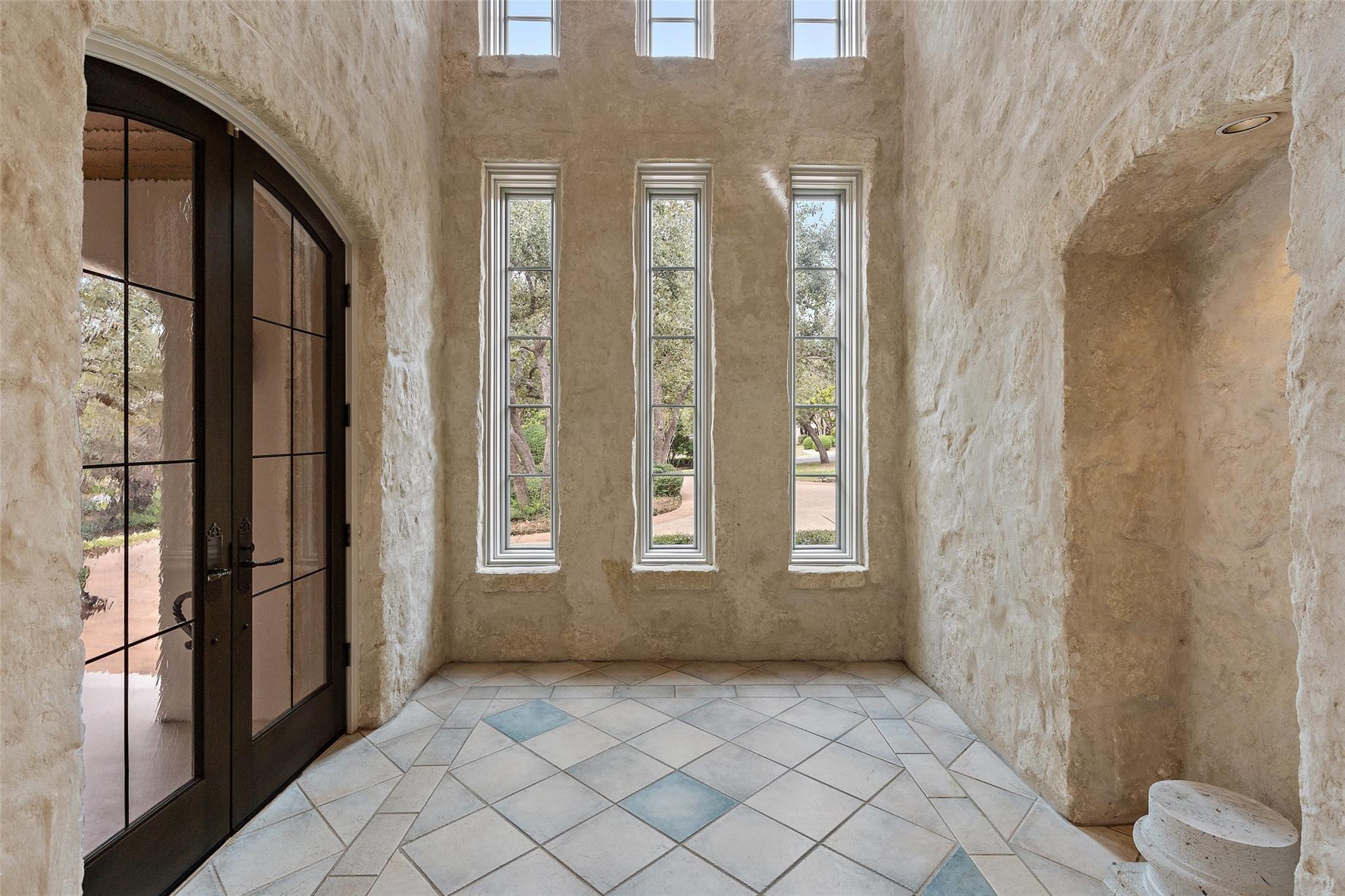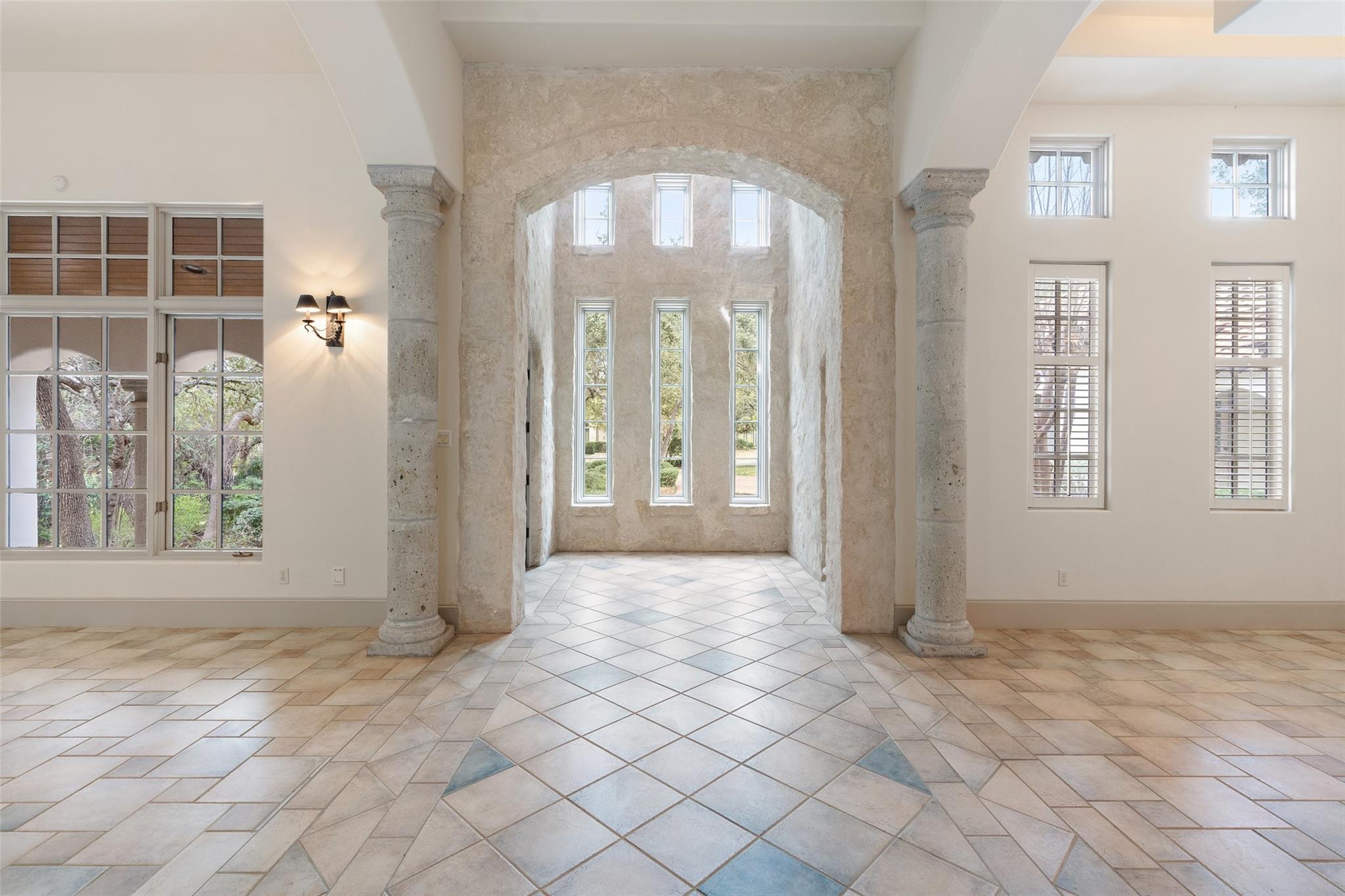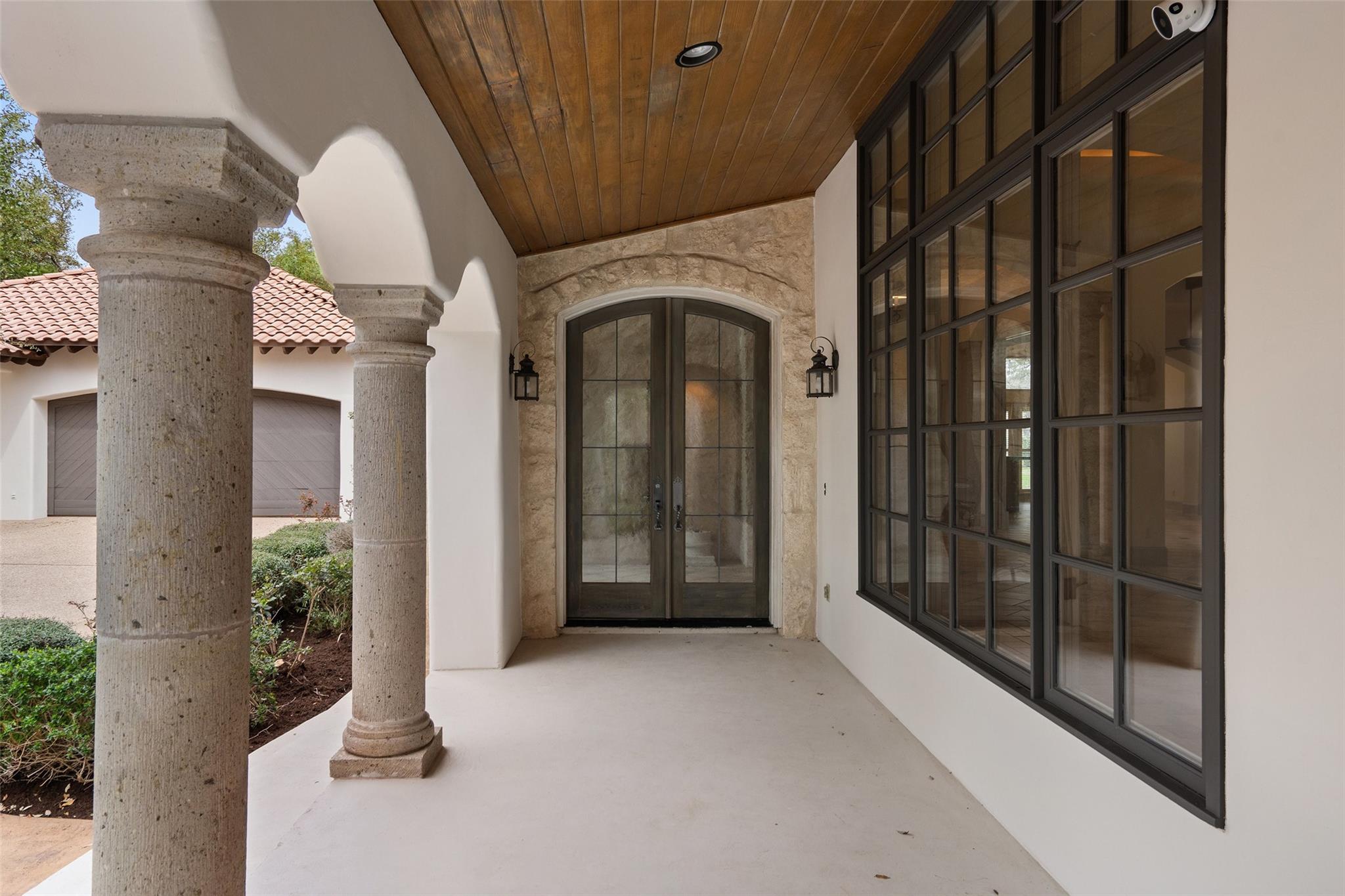 Welcome to your private oasis behind the gates in the prestigious community of Woods I in Barton Creek. Nestled among the towering oak trees, this stunning single-story home boasts an open floor plan flooded with natural light, creating an inviting and serene atmosphere. As you step inside, you'll be greeted by a 25-foot entry tower with native limestone walls and wood beamed ceiling. Thirteen-foot ceilings with gorgeous architectural details are found throughout all living areas, accentuating the spaciousness and grandeur of the home. The formal living and dining areas provide an elegant backdrop for entertaining, while the breakfast room offers access to a private patio, perfect for creating an outdoor kitchen. The generously sized primary suite features two walk-in closets, a separate shower, a luxurious whirlpool tub, bidet, and separate sinks, offering a peaceful retreat. Additionally, there are 3 bedrooms, each with private baths and walk-in closets, providing comfort and privacy. The exterior of the home is adorned with a beautiful stone and stucco facade, complemented by a concrete tile roof, exuding timeless elegance and durability. The .77-acre lot is adorned with an abundance of oak trees and Japanese-style gardens, creating a tranquil and picturesque setting. For the culinary enthusiast, the spacious kitchen is equipped with a Sub-Zero refrigerator, ice maker, 5-burner gas stove, single oven, granite counters, and an abundance of custom cabinetry. The sit-up bar and island provide the perfect space for meal preparation and casual entertaining. Additional features include beamed ceilings, a cantera stone fireplace, built-in entertainment center and speakers in the informal living area. Built in 1998 by award-winning Thomas L. Luth, this home exudes quality and craftsmanship at every turn. With a 3-car garage, and a large covered verandah, this home offers the perfect blend of luxury, comfort, and functionality.