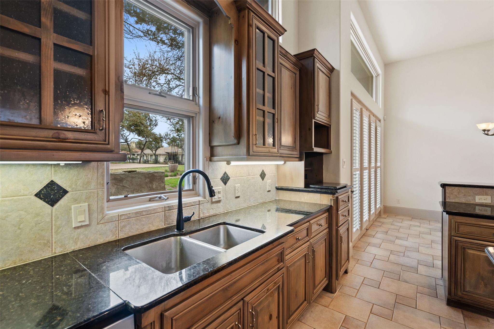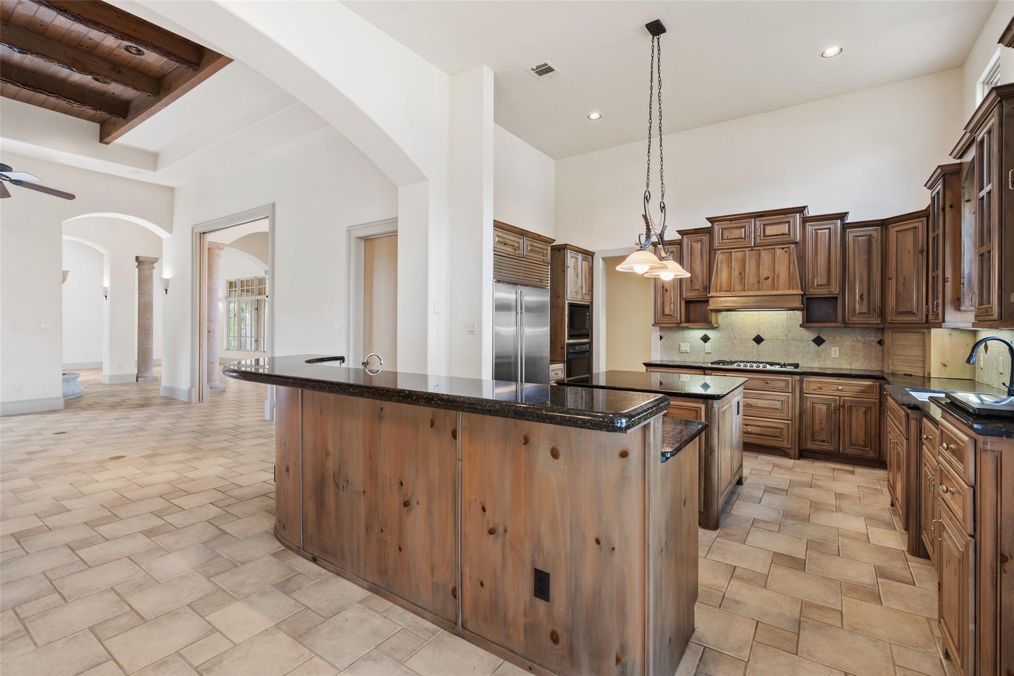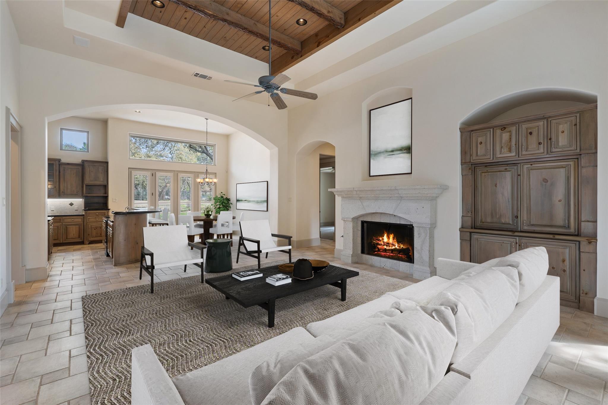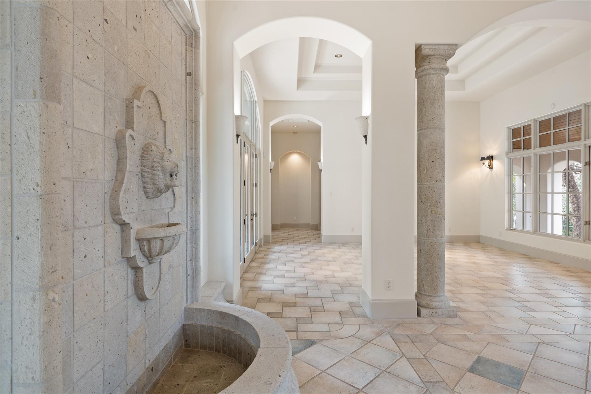 Welcome to your private oasis behind the gates in the prestigious community of Woods I in Barton Creek. Nestled among the towering oak trees, this stunning single-story home boasts an open floor plan flooded with natural light, creating an inviting and serene atmosphere. As you step inside, you'll be greeted by a 25-foot entry tower with native limestone walls and wood beamed ceiling. Thirteen-foot ceilings with gorgeous architectural details are found throughout all living areas, accentuating the spaciousness and grandeur of the home. The formal living and dining areas provide an elegant backdrop for entertaining, while the breakfast room offers access to a private patio, perfect for creating an outdoor kitchen. The generously sized primary suite features two walk-in closets, a separate shower, a luxurious whirlpool tub, bidet, and separate sinks, offering a peaceful retreat. Additionally, there are 3 bedrooms, each with private baths and walk-in closets, providing comfort and privacy. The exterior of the home is adorned with a beautiful stone and stucco facade, complemented by a concrete tile roof, exuding timeless elegance and durability. The .77-acre lot is adorned with an abundance of oak trees and Japanese-style gardens, creating a tranquil and picturesque setting. For the culinary enthusiast, the spacious kitchen is equipped with a Sub-Zero refrigerator, ice maker, 5-burner gas stove, single oven, granite counters, and an abundance of custom cabinetry. The sit-up bar and island provide the perfect space for meal preparation and casual entertaining. Additional features include beamed ceilings, a cantera stone fireplace, built-in entertainment center and speakers in the informal living area. Built in 1998 by award-winning Thomas L. Luth, this home exudes quality and craftsmanship at every turn. With a 3-car garage, and a large covered verandah, this home offers the perfect blend of luxury, comfort, and functionality.